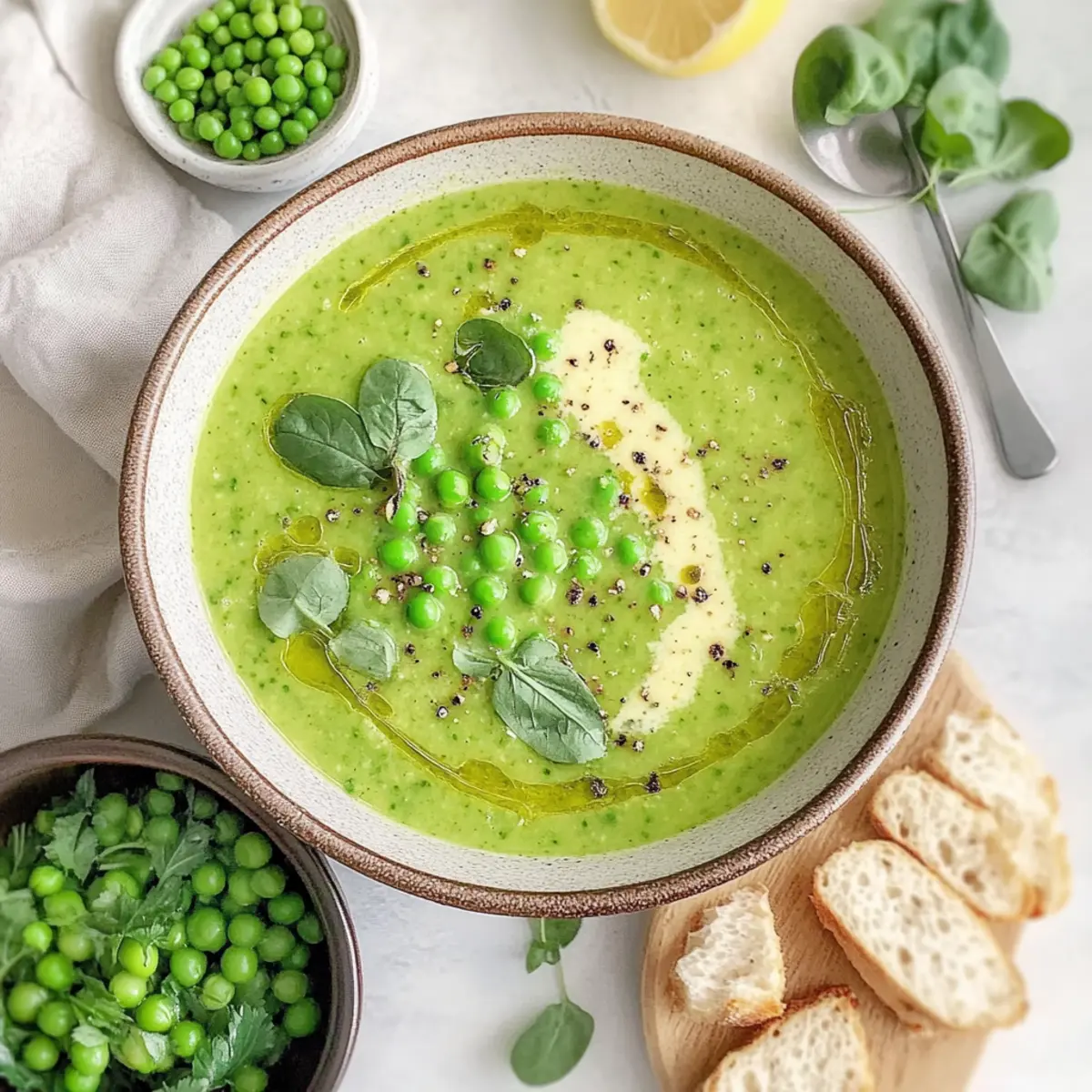 • Roasted Vegetables: Offer roasted seasonal veggies like carrots and asparagus; their caramelized sweetness complements the bright pea flavor and adds depth.