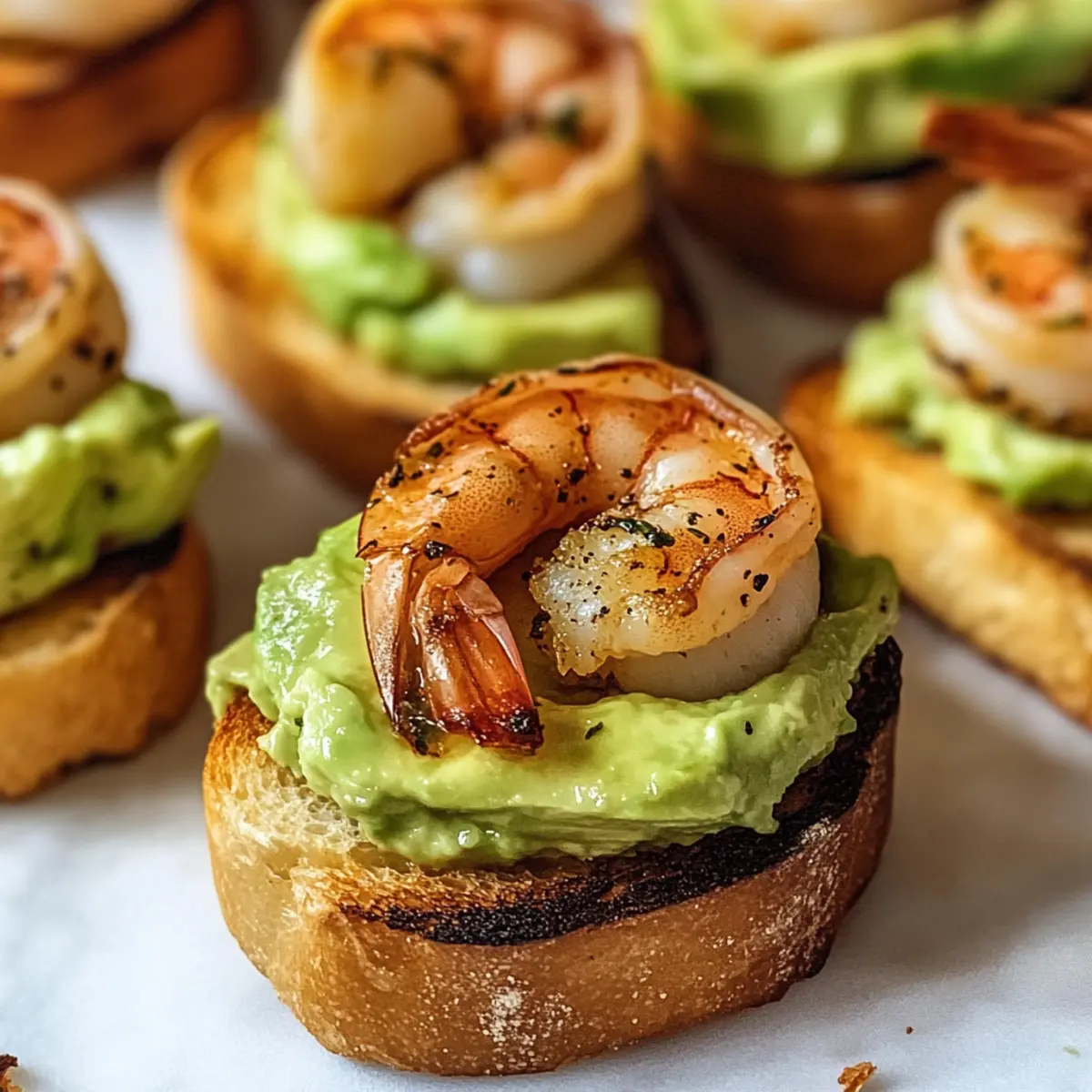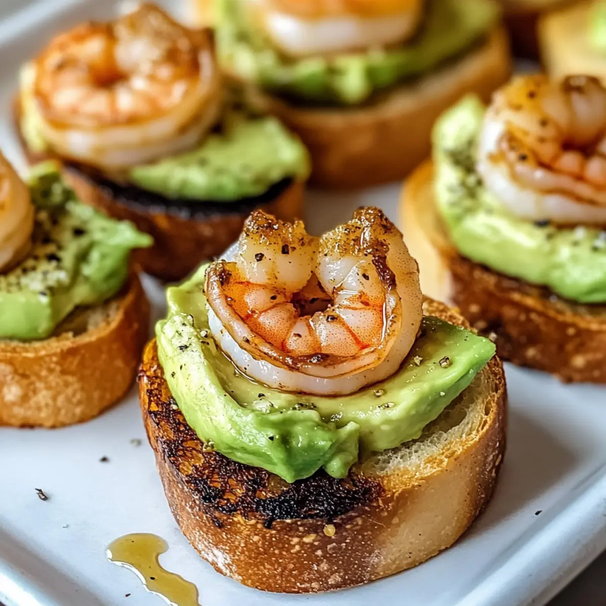 Jump to Recipe Print RecipeAs the sun dips low in the sky, a delightful aroma of garlic and spices drifts through my kitchen, instantly igniting my appetite. I’m making Garlic Shrimp Crostini with Avocado—a dish that effortlessly combines simplicity and elegance. In just 25 minutes, you can transform plump shrimp, seasoned to perfection, and creamy avocado into a stunning appetizer that will impress any guest. Not only is this recipe a crowd-pleaser, but it’s also a fantastic way to indulge your culinary creativity, allowing for tasty variations based on what you have on hand. Whether you’re hosting a gathering or simply craving a tasty snack, this dish promises deliciousness without the fuss. Are you ready to elevate your next meal with this flavorful bite-sized delight? Why Is This Recipe a Must-Try? Simplicity is key: With just a handful of ingredients, you can create a restaurant-quality appetizer in under 25 minutes. Bold Flavors shine through: The smoky garlic shrimp perfectly complements the creamy avocado, making each bite a flavor-packed explosion. Versatile Options await: Feel free to swap the shrimp for grilled chicken or add diced tomatoes for a refreshing twist. Impressive Presentation: This dish looks as good as it tastes, ensuring your table is set for compliments. Great for Any Occasion: Perfect as a light snack or an elegant party appetizer, making it a go-to for all gatherings. For more quick and easy recipes, check out Garlic Shrimp Over Mashed Potatoes or Salmon Shrimp Garlic. Garlic Shrimp Crostini Ingredients For the Garlic Shrimp • Shrimp – use large, peeled, and deveined shrimp for the best texture; fresh or frozen will work. • Garlic – minced for an aromatic kick that enhances the overall dish. • Paprika – adds a smoky depth to the shrimp; smoked paprika is particularly delightful. • Cumin – complements the paprika for a warm, earthy flavor. • Salt – enhances the flavors; feel free to adjust to your taste. • Olive Oil – for cooking the shrimp and adding a healthy fat component; avocado oil can be used as a substitute. For the Crostini • Baguette – the perfect crunchy base; slice it thinly for optimal toasting. • Olive Oil – brush on the baguette slices before toasting for added richness and flavor. For the Avocado Spread • Avocado – mash it for a creamy texture; this is essential for the crostini. • Lime Juice – brightens the dish and adds freshness; lemon juice is a good substitute. Feel free to experiment with these ingredients in your delicious Garlic Shrimp Crostini with Avocado and make it truly your own! Step‑by‑Step Instructions for Garlic Shrimp Crostini with Avocado Step 1: Prep Ingredients Begin by mincing 2-3 cloves of garlic and slicing 1 ripe avocado in half to remove the pit. Scoop the avocado flesh into a bowl and mash it with a fork, adding a splash of lime juice to keep it fresh. Finally, preheat your oven to 400°F (200°C) so it’s ready for toasting the baguette slices. Step 2: Prepare Shrimp In a medium bowl, toss 1 pound of peeled, deveined shrimp with 1 teaspoon of paprika, 1 teaspoon of cumin, and a pinch of salt. Heat 2 tablespoons of olive oil in a skillet over medium heat. Add the seasoned shrimp and cook for about 3-4 minutes, stirring gently until they turn pink and opaque, indicating they are perfectly cooked. Step 3: Toast Crostini While the shrimp are cooking, thinly slice a fresh baguette into ½ inch pieces. Arrange the slices on a baking sheet and lightly brush each side with olive oil for added flavor. Place them in the preheated oven and toast for 5-10 minutes, or until they are golden brown and crispy, keeping an eye on them to prevent burning. Step 4: Assemble Crostini Once the crostini are toasted and golden, spread a generous layer of the mashed avocado on each piece. Top the avocado with the garlic shrimp, ensuring each crostini gets a good portion. For added brightness and flavor, drizzle with a touch more lime juice, enhancing the overall flavor profile of the Garlic Shrimp Crostini with Avocado. How to Store and Freeze Garlic Shrimp Crostini with Avocado Fridge: Store leftover assembled crostini in an airtight container for up to 2 hours. After this time, the crostini may become soggy, so it’s best to keep the components separate. Crostini Storage: Toasted crostini can be stored in an airtight container at room temperature for up to 3 days. To retain their crunchiness, avoid refrigerating them. Avocado Mix: If you make the avocado spread ahead of time, store it in an airtight container with a layer of plastic wrap pressed directly onto the surface to prevent browning. Use within 1 day for optimal freshness. Freezer: While it’s not recommended to freeze the assembled Garlic Shrimp Crostini due to textural changes, you can freeze the shrimp (cooked) for up to 2 months. Thaw in the fridge before reheating. Garlic Shrimp Crostini with Avocado Variations Feel free to let your creativity shine and customize this recipe to suit your taste buds! Grilled Chicken: Swap out shrimp for tender grilled chicken slices for a heartier option that’s equally delicious. Explore the flavor combinations with fresh herbs or a zesty marinade for an extra kick. Vegan Delight: Replace shrimp with marinated tofu or chickpeas and swap avocado for creamy hummus to make it vegan-friendly. This twist keeps the rich texture while introducing unique flavors to the table. Spicy Kick: Add fresh sliced jalapeños or a sprinkle of red pepper flakes on top of the avocado for a fiery touch. The heat pairs beautifully with the cool creaminess of the avocado, creating a balanced bite. Herb Infusion: Mix in fresh herbs like cilantro or basil into the avocado spread for added freshness and flavor depth. This simple addition brightens the dish and complements the shrimp wonderfully. Crunchy Toppings: Finish with toasted pine nuts or sunflower seeds for an unexpected crunch and delightful texture contrast