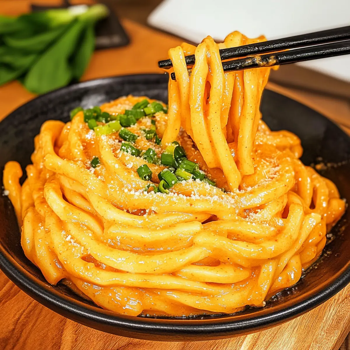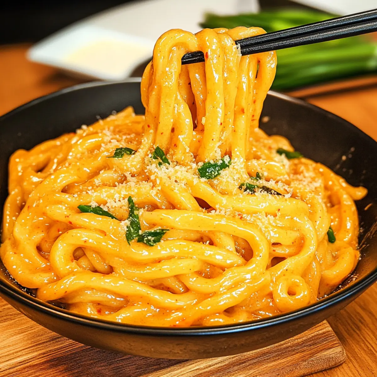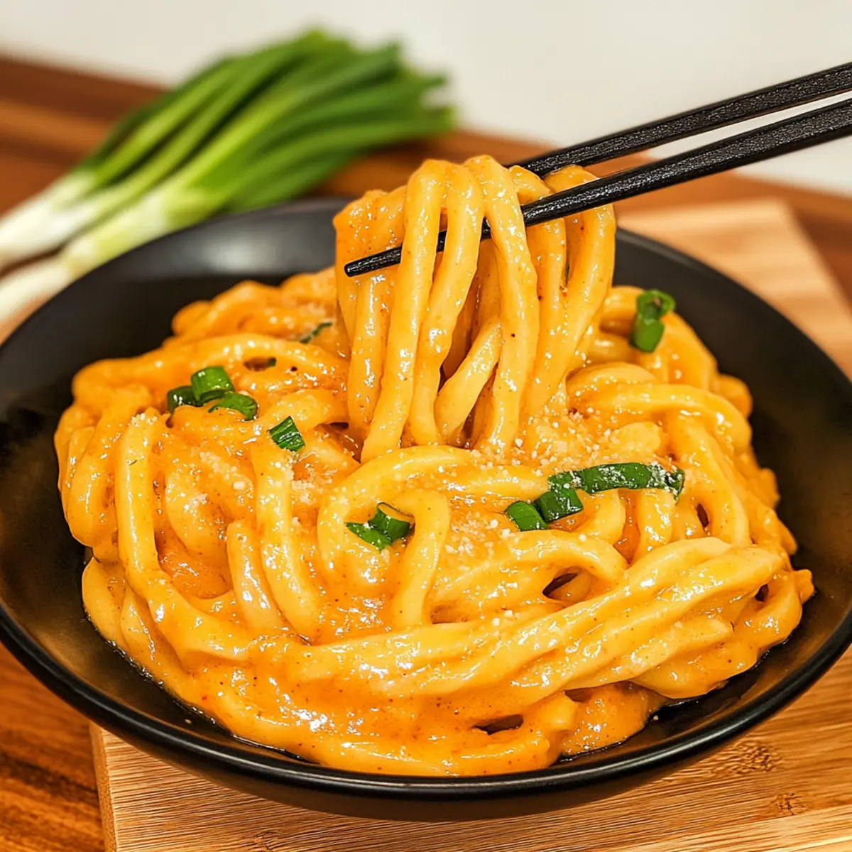 Jump to Recipe Print RecipeAs I mixed the vibrant gochujang with cream, the kitchen filled with a tantalizing aroma that instantly transported me to bustling street markets in Seoul. The star of this adventure? My Creamy Gochujang Udon Noodles! In just 20 minutes, I turned simple ingredients into a bowl of comforting warmth that’s perfect for both busy weeknights and when I crave something a bit adventurous. Not only is this dish quick to whip up, but it also offers the flexibility to go gluten-free with the right udon noodles, making it a delightful option for everyone. Whether you’re diving into a spicy, creamy sauce or adding your favorite veggies for a personal touch, this meal is sure to warm your soul. Ready to spice up your dinner routine? Let’s get cooking! Why Try Gochujang Udon Noodles? Bold flavors and comforting creaminess make these noodles a must-try! In just 20 minutes, you’ll have a satisfying meal that fuses Korean spice with rich textures. Versatile options allow you to customize with proteins or veggies like bell peppers or spinach. Perfect for those busy nights, this dish is not only quick to prepare but also provides a great alternative to takeout. If you’re vegan, try coconut cream to maintain that luscious texture. Elevate your dining experience with side dishes like a refreshing cucumber salad, and enjoy a dinner that pleases every palate! Gochujang Udon Noodles Ingredients For the Udon • Udon Noodles – Use fresh, frozen, or dried based on your pantry; they’re the chewy foundation of the dish. For the Sauce • Gochujang – This spicy-sweet Korean red chili paste imparts deep, bold flavor to your sauce. • Butter – Used for sautéing; feel free to substitute with olive oil for a dairy-free version. • Garlic – Fresh minced is preferred to enhance the robust flavor profile. • Shallots – Their mild sweetness complements the spicy sauce beautifully; yellow onion is a good substitute. • Heavy Cream – Adds that creamy richness; coconut cream can be used for a dairy-free alternative. • Soy Sauce – Enhances umami and salty notes; consider tamari for a gluten-free option. • Gochugaru – A Korean chili powder that provides extra heat; adjust to taste for your spice level. Garnishes • Parmesan Cheese – Optional for a rich flavor; omit for a vegan-friendly alternative. • Green Onion – Adds a fresh touch; chives or scallions are good substitutes. • Egg Yolk – For added creaminess; it’s optional if you’re looking for a lighter dish. Feel free to mix in your choice of proteins or vegetables to personalize these Gochujang Udon Noodles even further! Step‑by‑Step Instructions for Creamy Gochujang Udon Noodles Step 1: Cook the Udon Noodles Begin by bringing a large pot of water to a boil over high heat. Add your udon noodles and cook according to package instructions, usually around 8-10 minutes until tender but chewy. Before draining, remember to reserve about ½ cup of the starchy noodle water, then drain and rinse the noodles under cold water to stop the cooking process. Step 2: Sauté Aromatics In a large skillet, melt 2 tablespoons of butter over medium heat. Once the butter is bubbly, add 3 minced garlic cloves and 1 finely chopped shallot. Sauté for about 2-3 minutes, stirring frequently until they become fragrant and translucent, but be careful not to let them brown, as this can lead to bitterness. Step 3: Incorporate Gochujang Stir in 3 tablespoons of gochujang into the sautéed garlic and shallots, mixing well to combine. Continue cooking for an additional 30 seconds to 1 minute, allowing the gochujang to bloom and coat the aromatics with its rich, spicy flavor. This step is essential to ensure the gochujang infuses the sauce with its signature depth. Step 4: Create the Creamy Sauce Pour in 1 cup of heavy cream along with the reserved noodle water, then add 2 tablespoons of soy sauce and 1 teaspoon of gochugaru for added heat. Bring the sauce to a simmer over medium heat for about 2-3 minutes, stirring constantly until it thickens slightly and develops a velvety texture. Step 5: Combine Udon Noodles Add the cooked udon noodles directly to the creamy gochujang sauce. Using tongs or a spatula, gently toss the noodles in the sauce for about 1-2 minutes until they’re thoroughly coated and heated through, ensuring each strand has absorbed that delightful flavor. Step 6: Serve and Garnish Transfer your Creamy Gochujang Udon Noodles into serving bowls. For an extra layer of richness, top with freshly grated parmesan cheese and sprinkle with sliced green onions. If desired, add a raw egg yolk on top for additional creaminess. Serve immediately while it’s still warm and comforting. Make Ahead Options These Creamy Gochujang Udon Noodles are excellent for meal prep, allowing you to enjoy a delicious, spicy meal without the rush. You can prepare the sauce (using heavy cream, gochujang, garlic, shallots, and seasonings) up to 3 days in advance; simply refrigerate it in an airtight container. To maintain quality, store the cooked udon noodles separately to prevent them from soaking up too much sauce and becoming mushy. When you’re ready to enjoy your noodles, heat the sauce in a skillet, add the cooked udon, and toss until heated through. This convenient method means you can savor your flavorful noodles on busy weeknights with minimal effort! Expert Tips for Creamy Gochujang Udon Noodles Reserve Noodle Water: Always save about ½ cup of the starchy noodle water before draining; it helps achieve the perfect sauce consistency. Sauté Carefully: Avoid bitterness by not overcooking your garlic and shallots. Cook until they’re fragrant and translucent, but not browned. Simmer for Flavor: For a richer taste, let your sauce simmer a bit longer, but watch it closely to prevent burning. Spice It Up: Adjust the heat according to your preference by modifying the amounts of gochujang and gochugaru. Taste as you go! Customize Your D