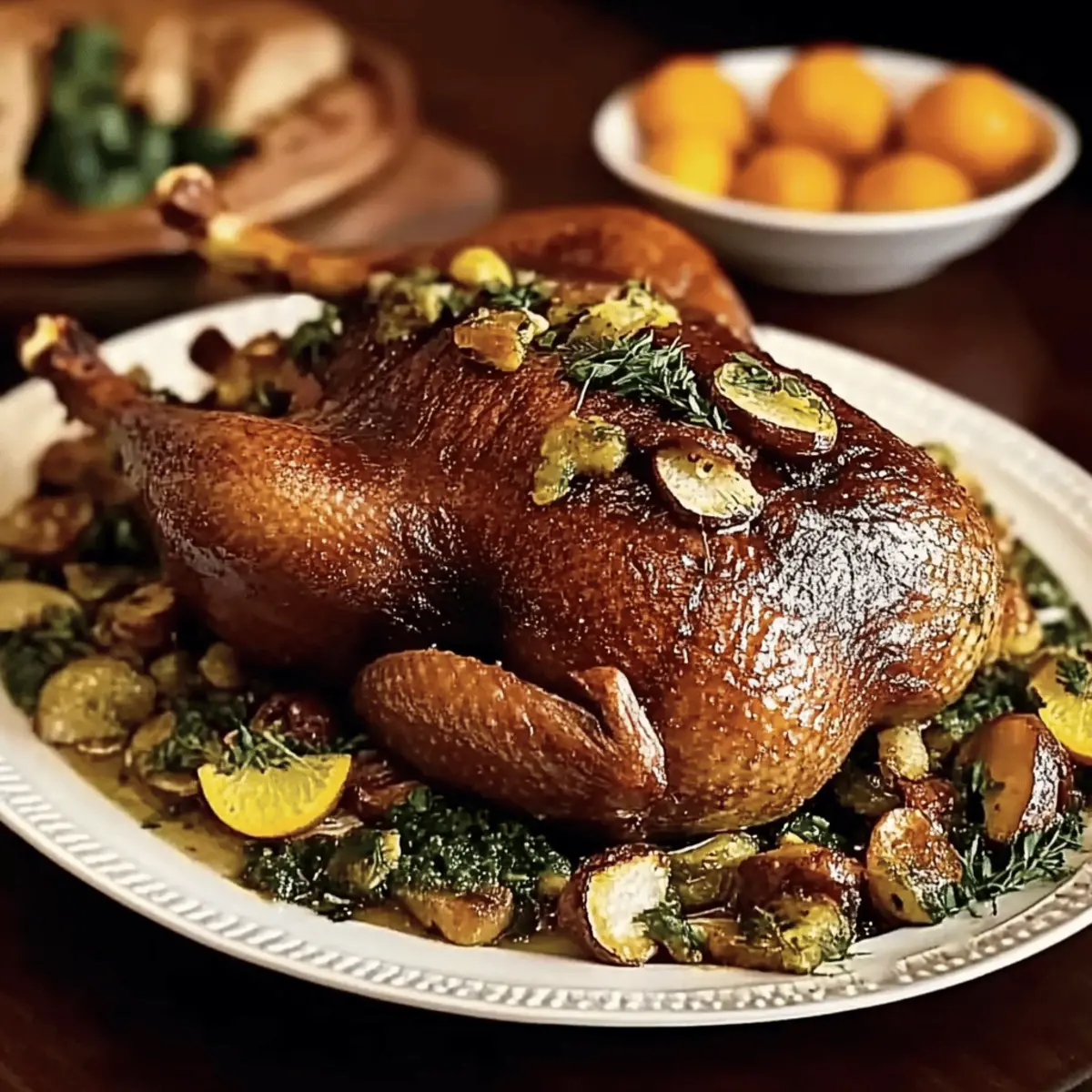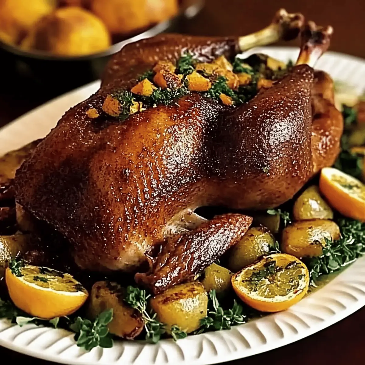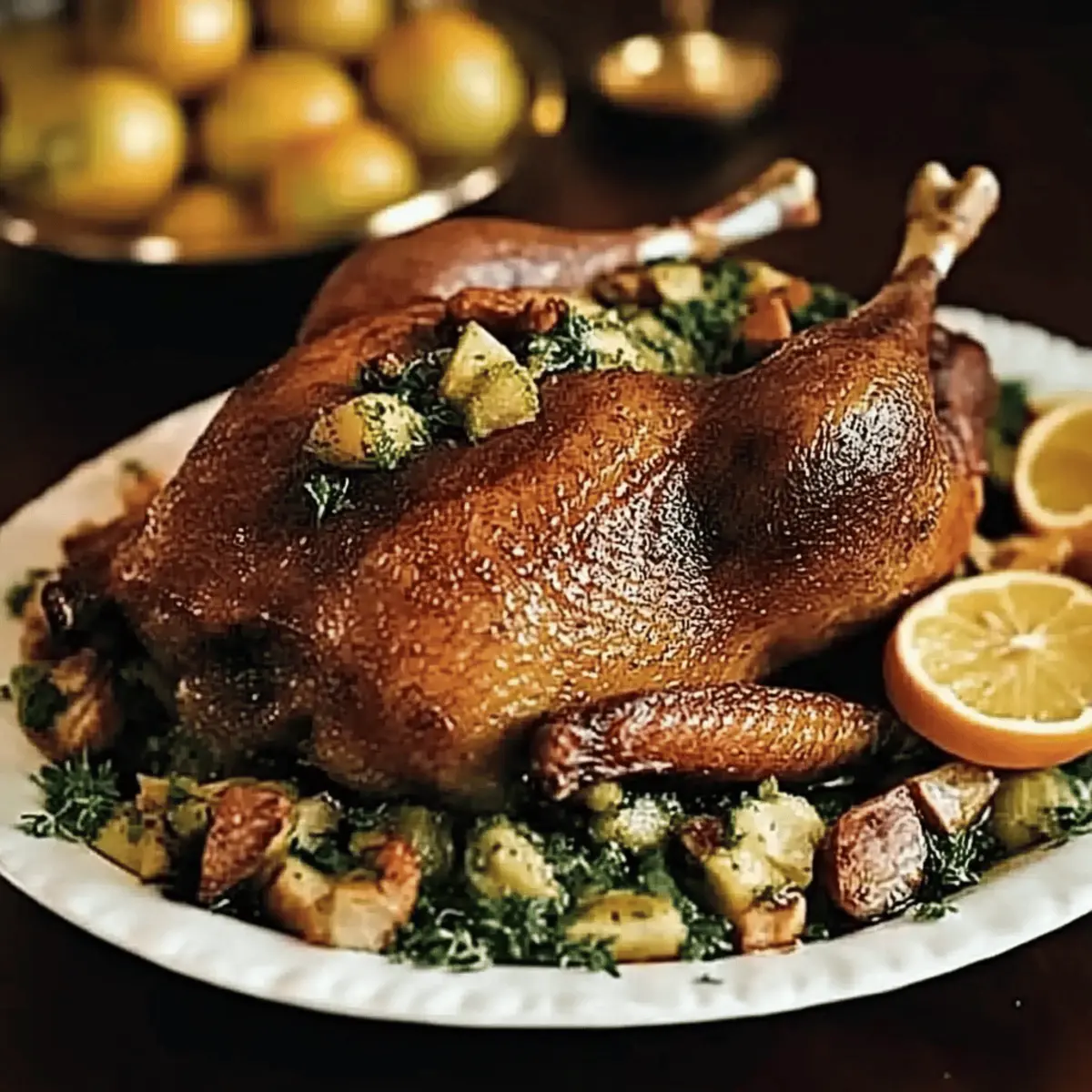 Jump to Recipe Print RecipeAs I wandered through the bustling Christmas market, the air was thick with mouthwatering aromas of festive delicacies. Among them, a roast goose glistening under twinkling lights caught my eye—Gordon’s Christmas Roast Goose, to be exact. This show-stopping dish is not just an alternative to turkey; it brings a sumptuous twist to your holiday feast that will have everyone raving. Juicy meat kissed by the warmth of citrus and herbs creates a memorable experience that’s both indulgent and surprisingly simple to prepare. With its deliciously crispy skin and rich, flavorful meat, it’s a guaranteed crowd-pleaser that will make your Christmas table shine. So, gather your loved ones and let’s dive into this beautiful recipe that will bring warmth, flavor, and unforgettable memories to your holiday season. Curious about how to make it perfectly? Let’s get started! How can Gordon’s Christmas roast goose impress? Unforgettable flavors: Infused with zesty citrus and aromatic herbs, this goose brings a unique taste to your holiday table that will steal the spotlight. Crowd-pleaser: Perfect for family gatherings, it’s an impressive centerpiece that offers a delightful alternative to the traditional turkey. Easy preparation: With clear instructions and expert tips, even novice home cooks can create a standout dish that looks gourmet without overcomplication. Versatile side pairings: Serve it alongside roasted potatoes, Brussels sprouts, or a rich gravy, making it a complete festive meal everyone will adore. Make-ahead option: Prep the goose a day in advance and enjoy less stress on the big day—this recipe is the perfect blend of convenience and deliciousness. Explore more delectable holiday dishes like our Roasted Carrot Salad to elevate your festive menu! Gordon’s Christmas Roast Goose Ingredients For the Goose • Fresh Goose – A rich protein choice, best sourced from reputable suppliers like the British Goose Producers Association. • Olive Oil – Use a small amount to help achieve a crispy skin; can be skipped if preferred. For the Citrus Mix • Lemons (4) – Adds acidity and brightness to the dish; substitute with limes for a tangy flavor twist. • Limes (3) – Enhances aroma and zest; feel free to use more lemons or mix other citrus types. For the Seasoning • Chinese Five-Spice Powder (1 tsp) – Provides a depth of flavor; can be replaced with a mix of cinnamon, cloves, and star anise if needed. • Clear Honey (3 tbsp) – Brings sweetness and aids in caramelizing the skin; maple syrup is a suitable alternative. For the Stuffing • Parsley Sprigs (small handful) – Offers freshness inside the goose; try mixing in thyme and sage for additional flavors. • Thyme Leaves (1 tbsp) – Complements the goose’s earthy flavor; you may opt to add rosemary for a rich herbal mix. Feeling inspired to create a festive masterpiece? Let’s move on to cooking Gordon’s Christmas roast goose! Step‑by‑Step Instructions for Gordon’s Christmas Roast Goose Step 1: Preheat the Oven Begin by preheating your oven to 240°C (fan 220°C/gas 9). This high initial temperature will ensure a beautifully crisp skin for Gordon’s Christmas roast goose. Calculate approximately 10 minutes of cooking time for every kilogram of goose, and remember that you’ll reduce the temperature to 190°C (fan 170°C/gas 5) once you achieve a golden color. Step 2: Prepare the Goose Carefully prepare your fresh goose by loosening the trussing and removing the giblets from the cavity. Using a sharp knife, score the skin across the breast and legs; this allows the fat to render effectively during roasting. Place the goose breast side up in a roasting tin, ready for seasoning. Step 3: Mix Citrus Seasoning In a small bowl, combine zests from the lemons and limes with salt, Chinese five-spice powder, and freshly ground pepper. Generously season the entire body of the goose, ensuring to rub the citrus mixture into both the skin and cavity. This infusion of flavors will elevate your Gordon’s Christmas roast goose to new heights. Step 4: Stuff the Goose Stuff the cavity of the seasoned goose with the zested citrus along with a mix of parsley sprigs, thyme leaves, and any additional herbs you desire. Allow the goose to rest for at least 15 minutes after stuffing; this resting period lets the flavors meld beautifully, enhancing the overall taste of your festive dish. Step 5: Optional Browning If you desire an extra crispy skin, heat a small amount of olive oil in a frying pan over medium heat. Carefully place the goose in the pan and sear it for just a few minutes until the skin is golden brown. This step will enhance the beautiful crust that makes Gordon’s Christmas roast goose so appealing. Step 6: Roast the Goose Transfer the goose back to the roasting tin, drizzling it generously with clear honey and sprinkling thyme leaves over the top. Place it in the preheated oven, monitoring closely. Baste with the fat every 30 minutes, ensuring an even browning. Roast until the juices run clear and the internal temperature reaches 75°C (165°F). Step 7: Let it Rest Once cooked to perfection, remove the roast goose from the oven and cover it loosely with foil. Allow it to rest for at least 30 minutes; this crucial step helps the juices redistribute, making each slice of Gordon’s Christmas roast goose juicy and even more flavorful when it’s time to carve. How to Store and Freeze Gordon’s Christmas Roast Goose Fridge: Store leftovers in an airtight container in the fridge for up to 3 days. The meat will remain juicy and full of flavor for future meals. Freezer: For longer storage, wrap the goose tightly in plastic wrap and aluminum foil before placing it in the freezer. It can last up to 3 months without losing quality. Reheating: To reheat, thaw the goose in the fridge overnight and warm it in the oven at a low temperature (around 150°C/300°F) until heated through, ensuring it s