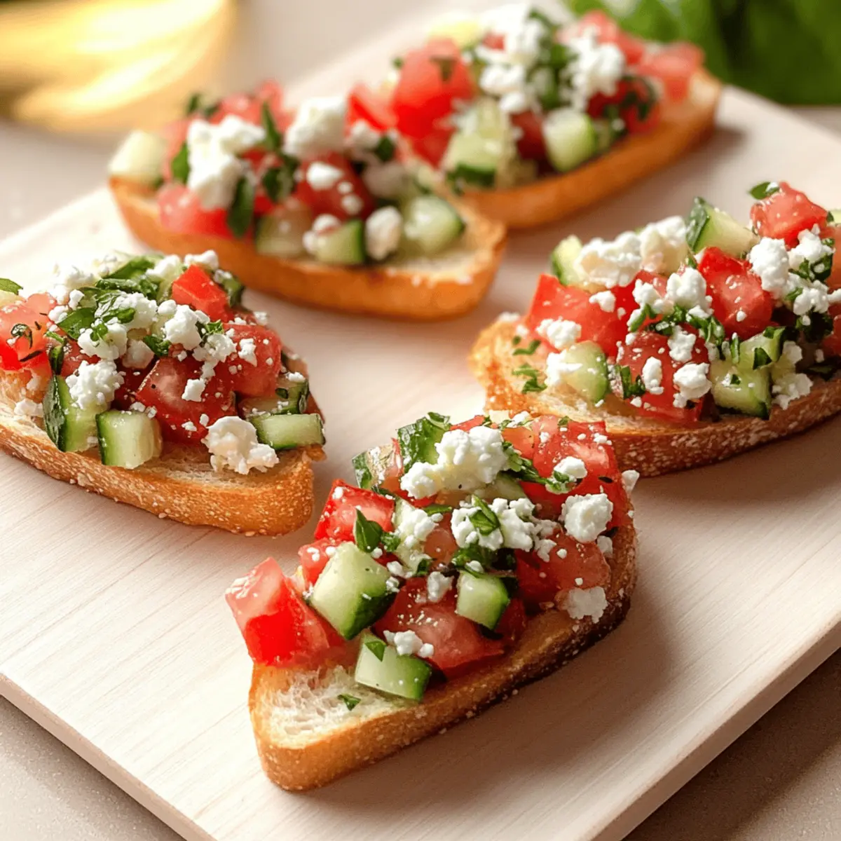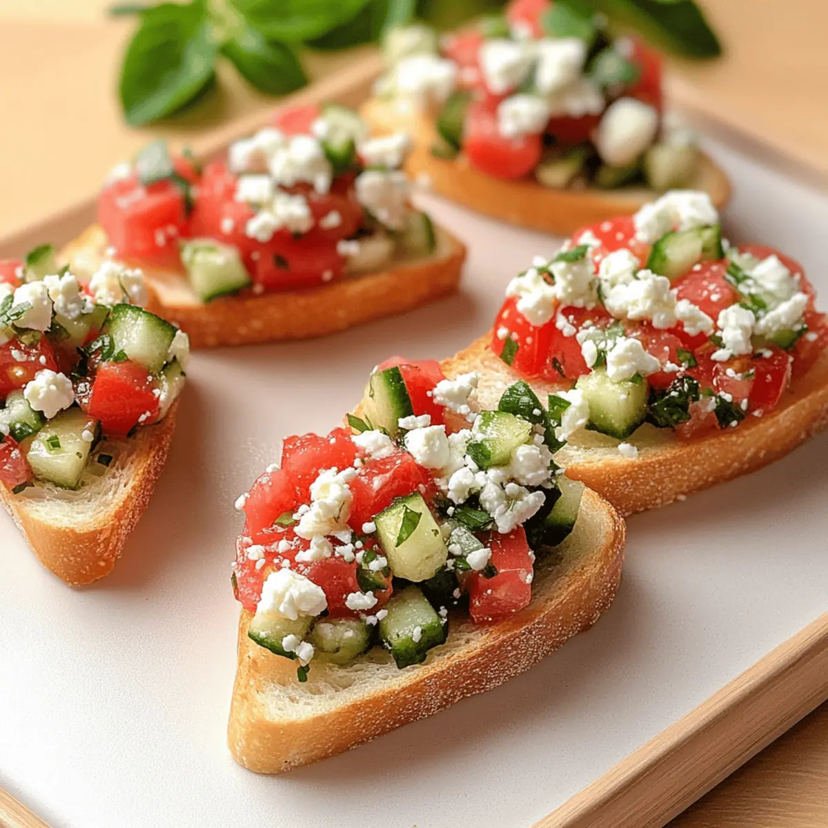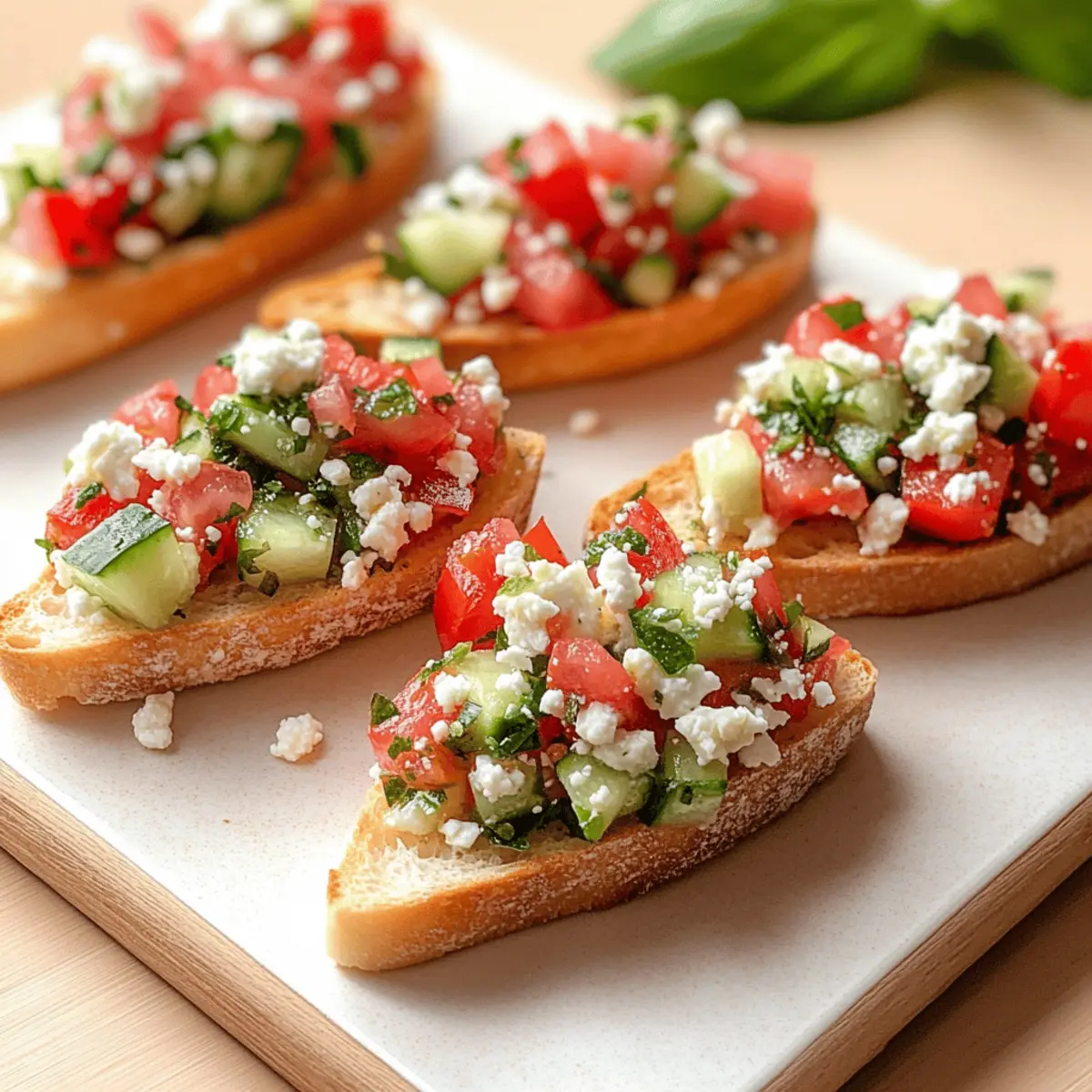 Jump to Recipe Print RecipeThere’s a certain magic that happens when fresh ingredients come together in a simple, satisfying way—and that’s exactly what this Mediterranean Greek Bruschetta delivers. Bursting with the lively flavors of feta, juicy Roma tomatoes, and crunchy cucumbers, this dish stands out as a crowd-pleaser at any gathering. Not only is it quick to whip up, but you can also customize the base using either crostini or fresh baguette slices, making it a versatile treat for everyone craving something delicious and homemade. Whether you’re hosting a party or simply looking to elevate your snacking game, this recipe promises to turn heads and warm hearts. Are you ready to give your taste buds a Mediterranean escape? Why is Greek Bruschetta a Must-Try? Versatile Base: Choose between crispy crostini or soft baguette slices to suit your preference. Fresh Ingredients: The luscious blend of feta, tomatoes, and cucumbers elevates any gathering. Quick Preparation: In just a few minutes, you can create a stunning appetizer that looks as good as it tastes. Crowd-Pleaser: This dish is perfect for parties, game days, or a cozy night in. Plus, if you love easy snacks, check out these Chocolate Oat Cookies for another delightful treat! Light Yet Satisfying: Each serving is around 77 calories, making it guilt-free and perfect for mindful eaters, leaving you craving more without the heaviness. Endless Customization: Add olives or roasted red peppers for extra Mediterranean flair; the options are limitless! Greek Bruschetta Ingredients • Whip up this flavorful dish with fresh ingredients! For the Base Baguette – Choose a bakery-fresh baguette for optimal flavor and texture; you can also use crostini for an added crunch. For the Topping Roma Tomatoes – These juicy tomatoes are the heart of the dish; try heirloom tomatoes for a unique twist. Seedless English Cucumber – Adds a crisp, refreshing crunch; substitute with Persian cucumbers if preferred. Fresh Crumbled Feta – This tangy cheese gives a creamy texture; goat cheese works as a delightful alternative. Chopped Green Onion – Offers a mild onion flavor; shallots or red onion can give a sharper kick instead. Lemon Juice – Essential for brightening flavors and adding acidity; no substitutes are recommended here. Extra Virgin Olive Oil – A quality oil enhances the richness of the dish; choose high-quality for the best taste. Red Wine Vinegar – Adds a nice tangy kick; balsamic vinegar can sweeten the profile if desired. Garlic Powder – Provides a subtle garlicky note; fresh garlic can be used for a stronger flavor if you wish. Salt and Pepper – Key seasonings to elevate the dish’s overall flavor; adjust based on your taste preferences. Dried Oregano Leaves – A classic herb for Mediterranean dishes; fresh oregano can amp up the flavor if available. Dried Dill and Basil – These herbs enhance depth; fresh herbs are preferred for vibrancy—use about 1 tablespoon of each. The aromatic blend of flavors in this Greek Bruschetta will transport your taste buds straight to the Mediterranean! Step‑by‑Step Instructions for Greek Bruschetta Step 1: Prepare the Crostini Preheat your oven to 375°F (190°C). Slice your fresh baguette into ¼-inch rounds or halve it lengthwise, then cut into 3-inch pieces. Arrange the slices on a baking sheet, brush them generously with extra virgin olive oil, and bake for 5 minutes. Afterward, flip the slices and bake an additional 5-7 minutes until they are golden brown and toasty, creating the perfect base for your Greek Bruschetta. Step 2: Make the Topping While the crostini is baking, finely dice your Roma tomatoes and seedless English cucumber, then chop the green onions. In a large mixing bowl, whisk together lemon juice, olive oil, red wine vinegar, garlic powder, salt, pepper, dried oregano, dill, and basil. Once well combined, add the diced tomatoes, cucumber, crumbled feta, and green onions, mixing gently to let the flavors meld together beautifully. Step 3: Assemble and Serve Once the crostini are perfectly toasted, remove them from the oven and let them cool slightly. Generously spoon the vibrant topping onto each piece, ensuring you get a satisfying amount of the refreshing Greek Bruschetta mixture on each crostini. Serve immediately for the best experience, allowing your guests to indulge in this delightful blend of Mediterranean flavors that will surely impress. What to Serve with Greek Bruschetta Enhance your Mediterranean gathering with delightful side dishes and refreshing pairings that complement every bite of Greek Bruschetta. Creamy Hummus: Silky smooth and rich, it provides a perfect contrast to the crunchy bruschetta, allowing for a Mediterranean-inspired dip experience. Crisp Garden Salad: A simple mix of arugula, cherry tomatoes, and cucumbers dressed with lemon vinaigrette adds freshness and balances the rich feta flavor. Stuffed Grape Leaves: These savory bites filled with rice and herbs echo the Mediterranean theme, creating a harmonious dining experience. Roasted Red Peppers: Sweet and smoky, they provide a burst of flavor that complements the tangy feta and tomatoes beautifully. Olive Tapenade: This robust spread enriches the flavor profile while also adding a delightful salty bite, perfect alongside the bruschetta. Chilled White Wine Spritzer: Light and refreshing, it pairs wonderfully with the vibrant flavors of your bruschetta, enhancing the overall taste adventure. Each option brings its own unique texture and flavor, creating an inviting spread that blends seamlessly with your Greek Bruschetta! Make Ahead Options These Greek Bruschetta are perfect for meal prep enthusiasts! You can prepare the topping up to 3 days in advance, allowing the flavors to deepen while staying fresh. Simply finely dice the tomatoes, cucumber, and chop the green onions, then mix them with the feta and other dressing ingredients in a bowl. Store the mixture in an airtight conta