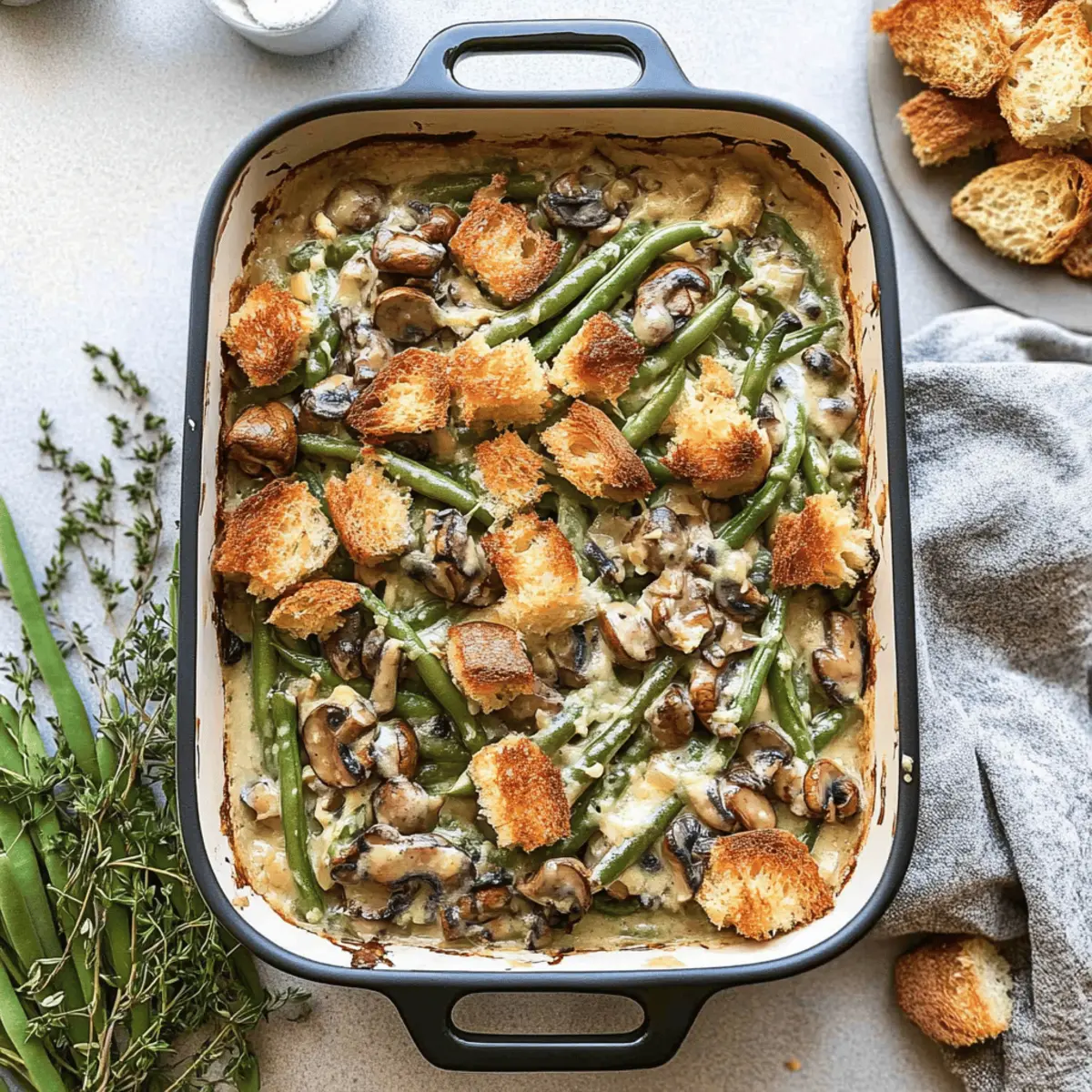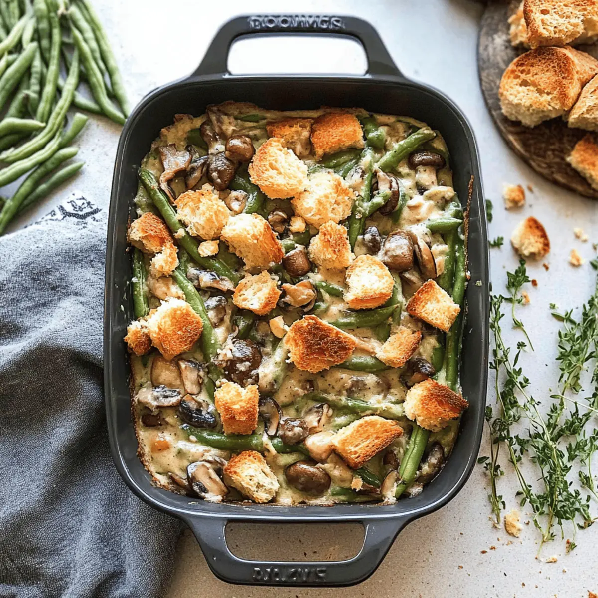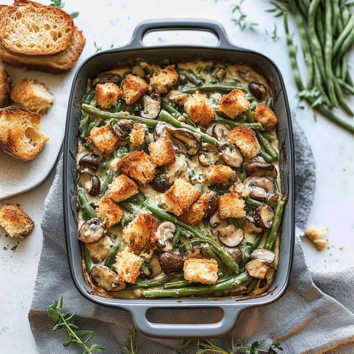 Jump to Recipe Print RecipeAs the aroma of comfort food wafts through the kitchen, I can’t help but feel a sense of nostalgia. This Vegan Green Bean Casserole with Cashew Cream takes a classic holiday favorite and transforms it into a delightful dairy-free dish that will impress everyone at your table. Unlike traditional concoctions, this version features tender green beans enveloped in a rich, creamy cashew-based sauce, making it a healthier and equally delicious alternative. With quick prep and a crunchy sourdough topping, it’s not only a crowd-pleaser but also perfect for those looking to enjoy homemade goodness without the guilt. Are you ready to elevate your holiday meals with this stunning casserole? Why is this casserole a must-try? Comforting, Creamy Bliss: This Vegan Green Bean Casserole with Cashew Cream redefines comfort food with its luscious, creamy texture and fresh ingredients. Nutritious & Wholesome: Packed with green beans and nutrient-dense cashews, it’s a healthy twist on a classic that everyone can enjoy. Easy Preparation: With straightforward steps and minimal fuss, you can whip this up in no time, making it perfect for busy holiday gatherings. Impressive Flavors: The unique blend of savory mushrooms and aromatic spices elevates the dish, leaving everyone guessing it’s dairy-free! Crowd-Pleasing Appeal: As a delightful centerpiece on your holiday table, it caters to both vegans and non-vegans alike, ensuring everyone savors each bite. Make-Ahead Convenience: Assemble this beauty in advance and simply bake it when you’re ready to impress your guests—easy peasy! Don’t forget to serve it alongside other favorites like Moist Strawberry Shortcake for a complete meal experience. Green Bean Casserole Ingredients • For a truly delightful Vegan Green Bean Casserole with Cashew Cream, gather these essentials! For the Cashew Cream Vegetable Broth – Base liquid for the cashew cream; substitute chicken or turkey broth for a non-vegan version. Raw Cashews – Creates the creamy base; soaked cashews enhance creaminess for a better texture. Dried Bay Leaves – Adds depth of flavor; remove before blending for a smooth sauce. Sherry Vinegar – Brightens the dish with acidity; white wine vinegar can be an alternative. For the Mushroom Mixture Extra-Virgin Olive Oil – Provides richness for sautéing; feel free to use any neutral oil instead. Cremini Mushrooms – Adds umami flavor and texture; can substitute with regular button mushrooms. Yellow Onion – Offers sweetness; shallots work harmoniously as a substitute too. Garlic Cloves – Essential for flavoring; adjust amount based on your taste preference. Fresh Thyme Leaves – Provides lovely herbal notes; dried thyme can replace fresh, but use less. Kosher Salt – Enhances flavors; monitor to fit your dietary needs and taste. Black Pepper – Adds warmth; adjust according to your spice preference. Ground Nutmeg – Offers a warm, nutty flavor; it’s optional but highly recommended. For the Casserole Fresh Green Beans – The star ingredient; snapped in half for perfect cooking; frozen beans work too. Sourdough Bread – Creates a crunchy topping; using day-old bread yields optimal texture. With these ingredients, you’re well on your way to creating a Vegan Green Bean Casserole that brings comfort and joy to your holiday table! Step‑by‑Step Instructions for Vegan Green Bean Casserole with Cashew Cream Step 1: Soak the Cashews In a small saucepan, combine vegetable broth and dried bay leaves, bringing the mixture to a boil over medium-high heat. Once boiling, add raw cashews and remove the saucepan from heat, allowing them to soak for 30 minutes. This step ensures your cashew cream is decadently creamy, setting a rich foundation for the green bean casserole. Step 2: Preheat the Oven While the cashews are soaking, preheat your oven to 425°F (220°C). This temperature will ensure the casserole bakes evenly, resulting in a deliciously golden and bubbling topping. Prepare your baking dish by lightly greasing it with a bit of olive oil to prevent sticking, setting the stage for a perfect casserole finish. Step 3: Sauté the Vegetables In a large skillet, heat 2 tablespoons of extra-virgin olive oil over medium-high heat. Add chopped cremini mushrooms and diced yellow onion, cooking them for about 10-12 minutes until softened and slightly golden. This step builds flavor and texture, essential for the savory depth of your green bean casserole. Step 4: Combine the Spice Mixture Stir in sherry vinegar, minced garlic cloves, fresh thyme leaves, kosher salt, and black pepper to the sautéed mushroom mixture. Cook for an additional 3-5 minutes, allowing the flavors to meld and the garlic to become aromatic. This fragrant spice medley enhances the overall flavor profile of the casserole, making it irresistibly savory. Step 5: Blend the Cashew Mixture Remove the bay leaves from the saucepan and transfer the soaked cashew mixture—broth included—into a high-powered blender. Blend the mixture until smooth and creamy, which should take about 1-2 minutes. This silky cashew cream is the star ingredient, bringing a touch of indulgence to your Vegan Green Bean Casserole. Step 6: Combine Cream and Mushroom Mixture Pour the creamy cashew mixture into the skillet with the sautéed mushrooms, stirring in ground nutmeg for an additional flavor layer. Mix everything thoroughly over medium heat until well combined, allowing it to warm up and blend beautifully. This creamy base envelops the green beans perfectly, crafting a luscious texture that everyone will love. Step 7: Prepare the Green Beans In your prepared baking dish, combine the fresh green beans—snapped in half for even cooking—with the creamy mushroom mixture. Gently toss to coat the beans thoroughly, ensuring every piece is enveloped in that rich cashew cream. This step melds the flavors and textures before baking, creating an irresistible casserole. Step 8: Make 