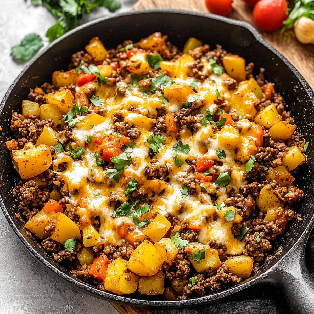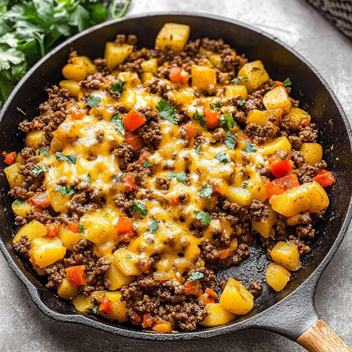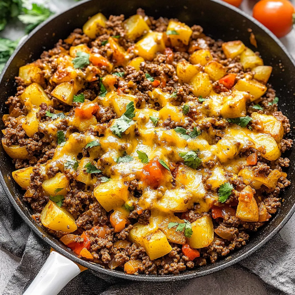Jump to Recipe Print RecipeAs I was preparing dinner the other night, a delightful aroma wafted through the kitchen, instantly turning my mundane cooking session into a mini celebration. What was the star of the show? My beloved Cheesy Mexican Ground Beef and Potato Skillet. This one-pan meal comes together in just 35 minutes, ensuring that even on the busiest nights, I can still whip up something delicious and satisfying. Not only is it a family-friendly option that everyone will love, but it’s also perfect for meal prep—making busy weekdays a whole lot easier. If you’re tired of fast food and craving something hearty and fulfilling, join me on a culinary adventure to savor every bite of this comfort dish. What twists might you bring to this recipe? Why is this Skillet a Must-Try? Simplicity: One-pan meals save you time and effort, making cleanup a breeze. Flavorful: The combination of spices turns simple ingredients into a fiesta for your taste buds! Family-Friendly: This dish is a guaranteed crowd-pleaser that appeals to all ages. Versatile: Feel free to tweak the recipe with your favorite veggies or spices, just like in my Ground Turkey Stuffed peppers! Quick Cooking: Ready in just 35 minutes, which means more time for family and fun! Meal Prep Hero: Perfect for prepping ahead of time; leftovers are also great for quick lunches throughout the week. Say goodbye to fast food and discover the joy of homemade meals that everyone will rave about! Ground Beef and Potato Skillet Ingredients For the Skillet Avocado oil – Provides a cooking fat; you can use any neutral oil if unavailable. Potatoes – The base of the dish; Yukon gold is preferred for its creamy texture, but russets work too. Lean ground beef – The main protein source; opt for a 90/10% blend to keep it leaner. Diced yellow onion – Adds sweetness and depth; feel free to substitute with any onion variety available. Red bell pepper – Brings sweetness and vibrant color; green or yellow bell peppers can be used if preferred. For Flavoring Kosher salt and black pepper – Essential for bringing out the flavors; adjust to your taste. Diced green chiles – Provides mellow heat and flavor; swap for hotter chiles if you like it spicy! Chili powder – Adds heat and depth; you can also use taco seasoning as a substitute. Ground cumin – Adds that essential earthiness for an authentic Mexican flavor; no substitute necessary. Smoked paprika – Imparts a delightful smoky flavor; use regular paprika if you want a milder taste. For Garnishing Cilantro – Fresh and flavorful; feel free to omit if you’re not a fan. Shredded cheese – Melts beautifully on top, adding creaminess; cheddar, colby jack, or pepper jack are fantastic choices. Ready to dive in? Gather these simple yet amazing ingredients, and let’s create a delicious Ground Beef and Potato Skillet the whole family will adore! Step‑by‑Step Instructions for Cheesy Mexican Ground Beef and Potato Skillet Step 1: Heat the Oil Begin by heating 2 tablespoons of avocado oil in a 12-inch cast iron skillet over medium-high heat. Allow the oil to shimmer and become hot, which should take about 1-2 minutes. This will create a perfect base for the potatoes, ensuring they get a nice golden color as they sauté. Step 2: Sauté the Potatoes Add 2 cups of cubed Yukon gold potatoes to the skillet, spreading them out evenly. Sauté the potatoes for 5-6 minutes, stirring occasionally until they become golden and slightly tender. You want to see a little browning forming on the edges, indicating they are cooking properly before moving forward. Step 3: Brown the Ground Beef Push the sautéed potatoes to one side of the skillet and add 1 pound of lean ground beef. Using a spatula, crumble the beef as you cook it, letting it brown for about 6-8 minutes. The beef should be cooked through and no longer pink, blending beautifully with the sautéed potatoes once fully combined. Step 4: Mix in the Vegetables Stir in 1 cup of diced yellow onion and 1 cup of chopped red bell pepper into the skillet. Season with kosher salt and black pepper to taste, and continue to cook for an additional 3-4 minutes. You’ll know it’s done when the onion is translucent and fragrant, adding depth and a wonderful aroma to the Ground Beef and Potato Skillet. Step 5: Add the Spices and Chiles Incorporate 1 can of diced green chiles, 1 tablespoon of chili powder, 1 teaspoon of ground cumin, and 1 teaspoon of smoked paprika into the mixture. Stir everything together for about 2-3 minutes, allowing the spices to warm and meld with the other ingredients, creating a delightful flavor profile. Step 6: Cook Until Tender Continue cooking the mixture for an additional 6-8 minutes, so the potatoes become fully tender and the beef is thoroughly cooked. Stir occasionally and adjust the seasoning as needed. You want everything to be well combined and bursting with flavor, embodying the essence of a comforting Cheesy Mexican Ground Beef and Potato Skillet. Step 7: Top with Cheese Once everything is cooked to perfection, sprinkle 1 cup of shredded cheese evenly over the top. Cover the skillet with a lid, letting it sit for 2-3 minutes over low heat. This will allow the cheese to melt beautifully, creating a creamy topping that adds so much flavor to your skillet dish. Step 8: Garnish and Serve Finally, if desired, garnish the skillet with fresh cilantro for an added touch of color and flavor. Serve the cheesy Mexican ground beef and potato skillet directly from the pan to your plates while hot, savoring each delicious bite. Enjoy a meal that combines comfort and joy for the whole family! Expert Tips for Ground Beef and Potato Skillet Uniform Cuts: Ensure all potato cubes are cut to the same size. This ensures even cooking and prevents some pieces from becoming mushy while others remain undercooked. Avoid Overcrowding: When browning the ground beef, avoid crowding the skillet. Cook in batches if necessary to achieve a nice
