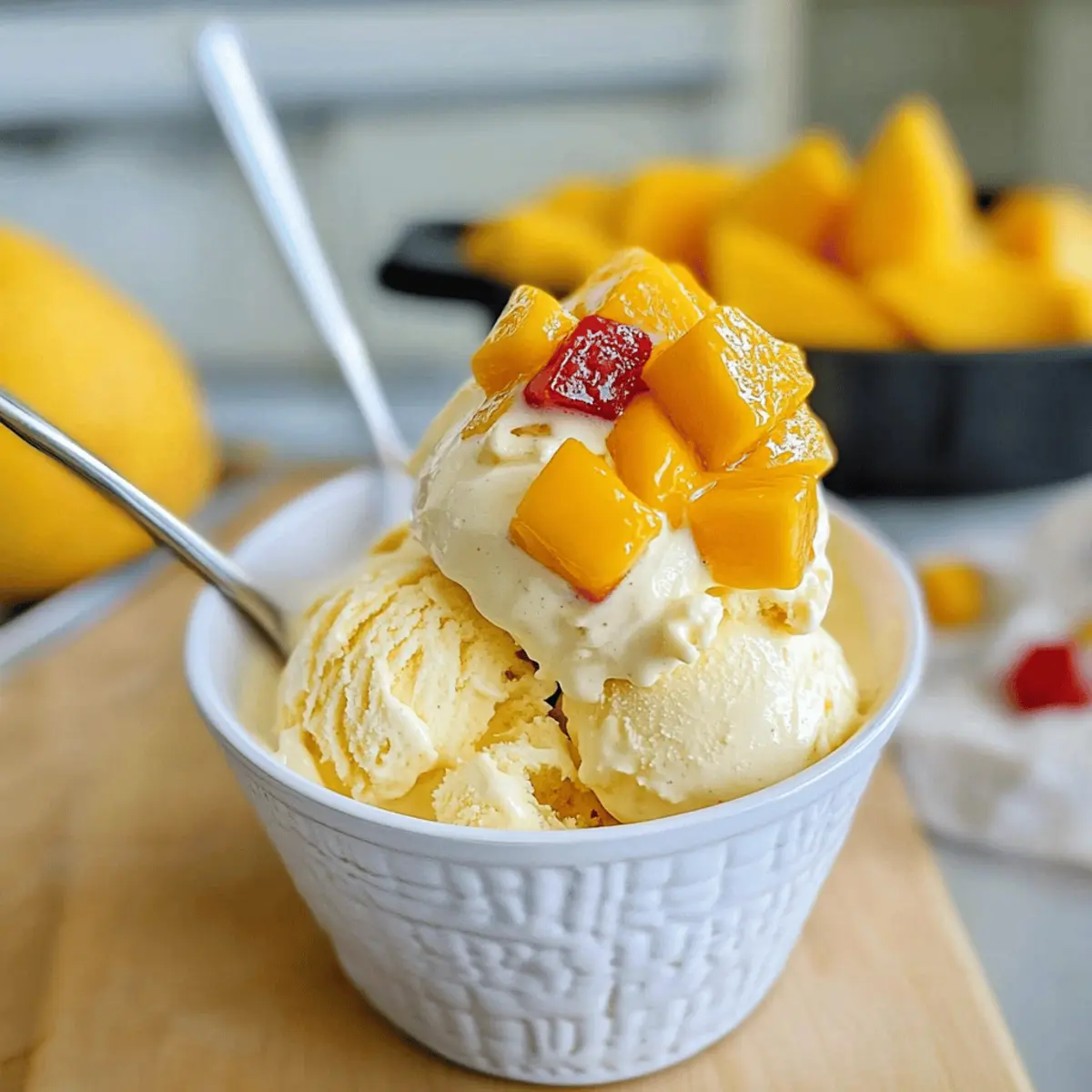 Jump to Recipe Print RecipeOn a sweltering summer afternoon, nothing beats the cool satisfaction of homemade mango ice cream. This no-churn delight, with its creamy texture and vibrant chunks of ripe mango, transports me straight to a tropical paradise. Not only is this easy no-churn mango ice cream a breeze to whip up, but it’s also the perfect way to satisfy that sweet craving without the heaviness of store-bought options. With just a handful of ingredients, you’ll have a refreshing dessert that feels indulgent but isn’t overly rich. Plus, it’s the ideal treat to share with friends and family, whether lounging by the pool or enjoying a garden picnic. Are you ready to bring a burst of sunshine to your dessert table? Why is This Mango Ice Cream a Must-Try? Simplicity at its finest: This no-churn recipe doesn’t require an ice cream maker, making it accessible for everyone, even novice cooks. Tropical paradise in a bowl: Bursting with fresh mango chunks, each bite is a delicious escape to summer. Quick preparation: With just five ingredients and minimal effort, you’ll have a delightful treat ready to freeze in a flash. Customizable flavors: Feel free to experiment with tropical combinations, or try variations like adding creamy coconut for a unique twist. Perfect for sharing: Impress your guests at barbecues or gatherings; this mango ice cream is sure to be the star of the dessert table. Try pairing it with a slice of Blueberry Cream Cheese pie for a delightful ending to any meal! Homemade Mango Ice Cream Ingredients • Get ready to dive into a refreshing treat with these simple ingredients! For the Ice Cream Base Sweetened Condensed Milk – Adds sweetness and creaminess to the ice cream base; swap in unsweetened coconut milk for a dairy-free option. Vanilla Extract – Enhances flavor complexity; opt for pure vanilla extract for a richer taste. Fine Sea Salt – Balances sweetness and enhances overall flavor in your homemade mango ice cream. Heavy Cream (Cold) – Provides that rich, creamy texture; avoid substituting with light cream or milk for the best results. For the Fruit Mangos (Chopped) – This is the main flavor star; fresh mango is best for optimal flavor, but feel free to mix in alternate fruits for a fun twist! Step‑by‑Step Instructions for Homemade Mango Ice Cream Step 1: Combine the Base In a large mixing bowl, whisk together 1 can of sweetened condensed milk, 1 teaspoon of vanilla extract, and a pinch of fine sea salt until smooth and well combined. This mixture should be creamy and have a slight sheen. Set it aside while you prepare the whipped cream, allowing the flavors to meld beautifully. Step 2: Whip the Cream Using a stand mixer or an electric hand mixer, whip 2 cups of cold heavy cream on medium speed for about 2-3 minutes, or until stiff peaks form. The cream should hold its shape and look fluffy. Avoid overwhipping to keep the texture light and airy, ensuring your homemade mango ice cream has the perfect creamy consistency. Step 3: Incorporate the Cream Gently fold one-third of the whipped cream into the sweetened condensed milk mixture using a spatula. This will lighten the base. Gradually add in the remaining whipped cream in two more batches, folding carefully to maintain the airy texture. The goal is to achieve a homogenous mixture without deflating the cream. Step 4: Add the Mango Next, fold in 1 cup of chopped ripe mango, reserving a few pieces for topping later. Ensure the mango is evenly distributed throughout the mixture by using gentle folding motions. This step not only incorporates a burst of flavor into your homemade mango ice cream but also adds delightful tropical chunks for texture. Step 5: Freeze the Mixture pour the creamy mango mixture into a 9x5x3 inch loaf pan, smoothing the top with a spatula. Place the pan in the freezer uncovered for about 2 hours. During this time, it will start to firm up but should remain soft and creamy, making it easier to scoop later on. Step 6: Final Touch and Freeze After 2 hours, remove the pan from the freezer and gently press the reserved mango pieces into the top of the ice cream. Cover the pan tightly with foil, then return it to the freezer to set for an additional 8-12 hours. This will solidify the mixture, transforming it into a luscious homemade mango ice cream that’s ready to be enjoyed. Step 7: Serve and Enjoy Once fully set, remove the homemade mango ice cream from the freezer and allow it to sit for a few minutes at room temperature before scooping. Use a warm ice cream scoop for easy serving. Ladle it into bowls or cones, and indulge in the refreshing tropical flavors of your homemade delight! Storage Tips for Homemade Mango Ice Cream Freezer: Store your homemade mango ice cream in an airtight container with parchment paper pressed against the surface to prevent ice crystals. It will maintain its best quality for up to 3 months. Thawing: When ready to enjoy, transfer the ice cream from the freezer to the fridge for about 20-30 minutes before serving for easier scooping without losing its creamy texture. Re-sealing: If you don’t finish it in one sitting, ensure to seal the container tightly after each serving. Properly stored, your delicious treat will remain flavorful and luscious. Flavor Integrity: For the best experience, consume your homemade mango ice cream within a month or two; this ensures the fresh mango flavor remains vibrant and delightful! Expert Tips for No-Churn Mango Ice Cream Chill the Cream: Ensure your heavy cream is very cold before whipping; this helps achieve maximum volume and a light texture in your homemade mango ice cream. Gentle Folding: When incorporating the whipped cream, be gentle to avoid deflating it. Overmixing can lead to a denser texture, which you want to avoid for this fluffy treat. Ripe Mango: Choose fully ripe, sweet mangoes for the best flavor. Underripe fruit can lead to less sweetness, affecting your delicious no-churn mango ice cream outc