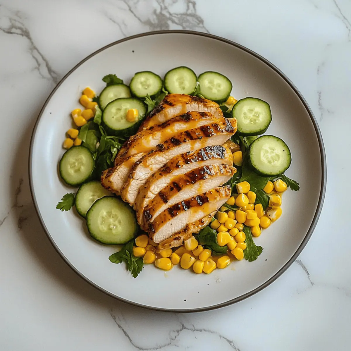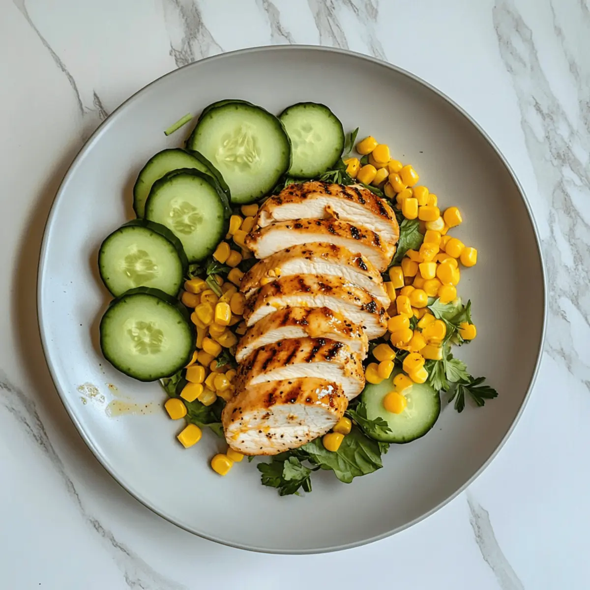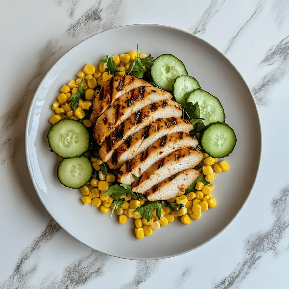Jump to Recipe Print RecipeAs I lounged on my porch, the gentle evening breeze carried the sweet scent of summer into the air, igniting my craving for a fresh, vibrant meal. That’s when I decided it was time to whip up my Honey-Mustard Grilled Chicken & Corn Salad. This dish perfectly marries sweet and tangy flavors, making it an ideal choice for warm weather and those seeking quick, healthy meals. Juicy, grilled chicken meets the crunch of fresh corn and colorful veggies, creating a light yet satisfying feast that instantly lifts my spirits. Whether you’re hosting a gathering or simply looking to enjoy a solo dinner on a balmy evening, this salad has you covered. Ready to dive into the deliciousness? Why is this salad a summer favorite? Light, Fresh Ingredients: This Honey-Mustard Grilled Chicken & Corn Salad is a celebration of seasonal produce, featuring crisp vegetables and juicy chicken, making it a go-to for warm days. Quick Prep Time: With simple preparation steps, this dish comes together in under 30 minutes, perfect for those busy evenings when you crave something healthy without the fuss. Flavorful Balance: The vibrant honey-mustard dressing adds an irresistible sweet and tangy depth that pairs beautifully with the savory grilled chicken, ensuring every bite is packed with flavor. Crowd-Pleasing Appeal: Whether serving at a summer BBQ or a family dinner, this salad is sure to impress guests of all ages, complementing popular dishes like Poblano Chicken Tacos. Versatile Substitutions: Feel free to customize it! Swap in veggies you have on hand or add a protein twist with chickpeas for a vegetarian option, making it your own while keeping it delicious. Honey-Mustard Grilled Chicken & Corn Salad Ingredients For the Chicken Chicken Breast – A perfect protein source that keeps it lean; substitute with turkey or tofu for variety. For the Salad Base Corn (fresh or canned) – Adds sweetness and a lovely texture; frozen corn is a fantastic alternative if fresh isn’t available. Mixed Greens (e.g., spinach, arugula) – Provides a refreshing base for the salad; feel free to swap with lettuce or kale if you prefer. Cucumber – Offers a crunchy texture and hydration; you can try bell pepper for a different flavor. Cherry Tomatoes – They bring acidity and vibrant color to the dish; any small tomatoes will work well in a pinch. Red Onion (optional) – Adds a nice sharpness; if a milder taste is desired, consider switching to green onions instead. For the Dressing Honey-Mustard Dressing – This is what ties the Honey-Mustard Grilled Chicken & Corn Salad together, giving it that delightful sweet and tangy profile; homemade is always best, but store-bought is a quick fix. Now that we have all our ingredients ready, let’s bring this delicious salad to life! 🌼🥗 Step‑by‑Step Instructions for Honey-Mustard Grilled Chicken & Corn Salad Step 1: Marinate the Chicken Begin by marinating the chicken breasts in honey-mustard dressing for at least 30 minutes. This allows the flavors to infuse deeply into the meat. For best results, place the chicken in a resealable plastic bag with the dressing, ensuring it’s well-coated. Set it aside in the refrigerator while you prepare the other ingredients. Step 2: Preheat the Grill While the chicken marinates, preheat your grill to medium-high heat, around 375°F (190°C). Make sure the grill grates are clean for optimal results. You’ll know it’s ready when you can hold your hand above the grill for only 2 seconds before feeling the heat. This step is crucial for achieving that beautifully charred exterior on the chicken. Step 3: Grill the Chicken Place your marinated chicken on the grill and cook for about 6–7 minutes per side. Keep an eye on the chicken until its internal temperature registers 165°F (75°C) when checked with a meat thermometer. The juices should run clear, and the outside will develop a lovely golden brown color. Once grilled, remove the chicken and let it rest for about 5 minutes to ensure juiciness. Step 4: Prepare the Salad Base While your chicken is resting, wash and chop your mixed greens, cucumber, cherry tomatoes, and red onion if using. Aim for vibrant, crunchy pieces that will add texture to your Honey-Mustard Grilled Chicken & Corn Salad. Place all these ingredients in a large bowl, and be sure to keep them fresh and crisp for the best flavor presentation. Step 5: Slice the Chicken After resting, slice the grilled chicken into strips. The beautiful grill marks and juicy interior should be visible, adding appeal to your salad. Arrange the chicken slices on a cutting board for easy handling, making sure each piece is tender and ready to complement the fresh salad ingredients. Step 6: Assemble the Salad In your large bowl of washed greens and veggies, carefully layer the sliced chicken on top. Drizzle additional honey-mustard dressing over the salad according to your taste preference, and then toss everything gently to combine. This Honey-Mustard Grilled Chicken & Corn Salad will now be bursting with flavor from the sweet and tangy dressing. Step 7: Serve and Enjoy Once everything is nicely mixed, transfer your salad to serving plates or a large platter. The vibrant colors of the salad should shine through, creating an enticing display. You may want to serve it alongside a chilled white wine or refreshing sparkling water for an extra touch. This delightful Honey-Mustard Grilled Chicken & Corn Salad is now ready to brighten your dinner table! How to Store and Freeze Honey-Mustard Grilled Chicken & Corn Salad Fridge: Store leftovers in an airtight container for up to 3 days. This keeps the flavors fresh while preventing spoilage. Freezer: For longer storage, freeze the grilled chicken separately in a sealed bag for up to 3 months. Thaw overnight in the fridge before adding it back to the salad. Reheating: When reheating the chicken, ensure it reaches an internal temperature of 165°F (75°C) to maintain safety