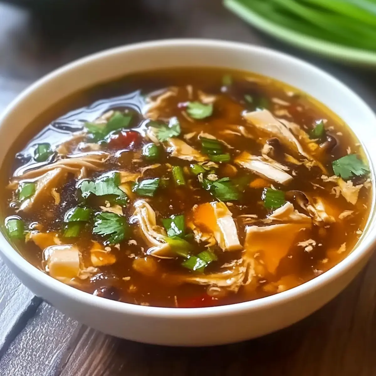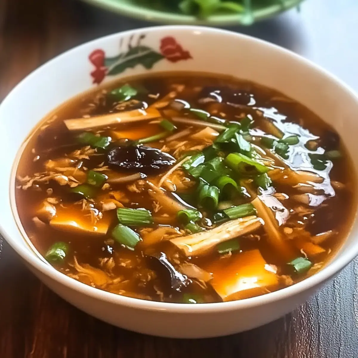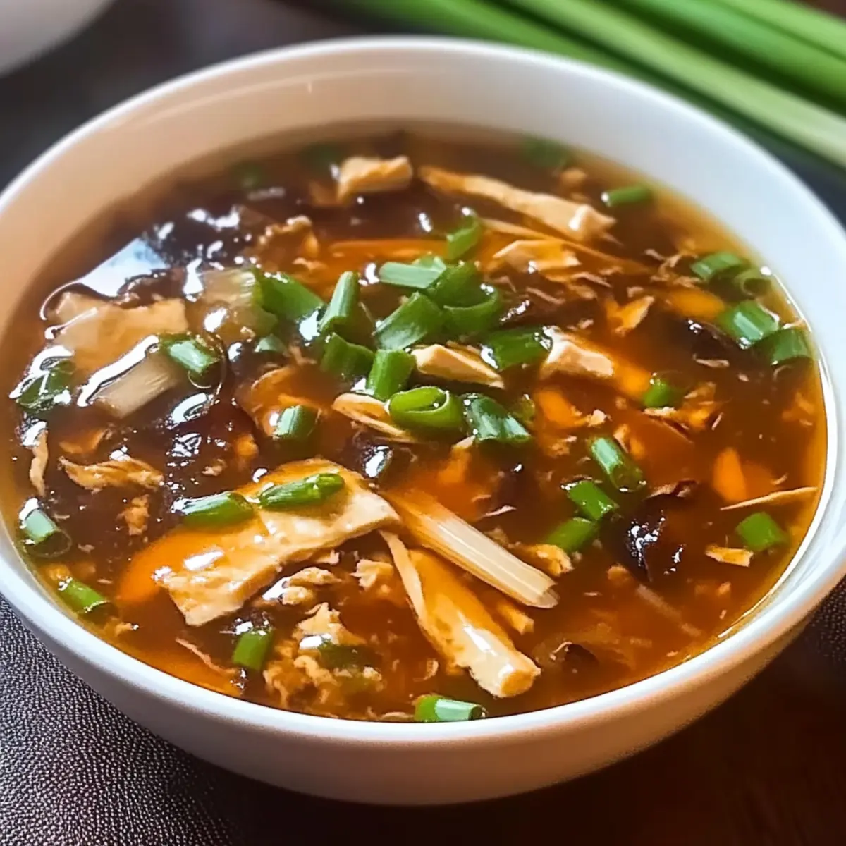 Jump to Recipe Print RecipeAs I walked through the bustling streets of a nearby Chinatown, the enticing aroma of steaming dumplings and spices wafted through the air, drawing me into a cozy restaurant. That’s when I first savored the comforting embrace of Hot and Sour Soup, a dish that transformed my understanding of soup forever. This Authentic Chinese Hot and Sour Soup recipe is not only a quick way to bring warmth to chilly evenings, but it also caters to various dietary preferences with simple swaps, making it a versatile option for everyone at the table. With fresh ingredients and bold flavors, you can whip up this delightful bowl of comfort in just 25 minutes—a perfect antidote to fast food cravings! Are you ready to dive into a world of soothing flavors? Let’s get cooking! Why make Hot and Sour Soup at home? Quick Preparation: In just 25 minutes, you’ll have a flavorful soup without the wait! Versatile Options: Easily adapt this dish for gluten-free or vegetarian diets, ensuring everyone can enjoy it. Rich Flavors: This soup brings together a delightful balance of spicy, tangy, and savory notes that will tantalize your taste buds. Comfort in a Bowl: The creamy tofu and crunchy bamboo shoots offer a satisfying texture that warms you from the inside out. Crowd-Pleasing: Perfect for gatherings, this soup complements other favorites like crispy spring rolls or a side of Crock Pot Soup. Dive into this heartwarming experience, and you may find it becomes a staple in your kitchen! Hot and Sour Soup Ingredients For the Broth • Chicken Broth – The base for the soup providing depth and flavor; Use vegetable broth for the vegetarian version. • Soy Sauce – Adds umami and salty depth; Use tamari for a gluten-free option. • Black Vinegar – Delivers unique tanginess; Use rice vinegar for a milder flavor if needed. For the Veggies • Shiitake Mushrooms – Provides rich umami flavor; Cremini or button mushrooms can be used if shiitakes are unavailable. • Bamboo Shoots – Contribute texture and crunch; Water chestnuts work well for a similar crunch. • Green Onions – A fresh garnish that adds color and brightness to the dish. For the Protein • Tofu – Adds protein and a creamy texture; Choose firm or silken tofu based on your preference. • Eggs – Whisked and drizzled for silky ribbons throughout the soup. For Thickening and Spice • Cornstarch – Thickens the soup to create a luscious broth. • White Pepper – Adds warmth and spice; Adjust to your taste preference. • Chili Paste/Dried Chili – Adds customizable heat for those who like it spicy. Finishing Touches • Sesame Oil – Essential for enhancing flavor and aroma; Drizzle just before serving for the best effect. With these ingredients on hand, your homemade Hot and Sour Soup is just a simmer away from delighting your palate! Step‑by‑Step Instructions for Authentic Chinese Hot and Sour Soup Step 1: Prepare the Broth In a large pot, heat 6 cups of chicken broth over medium-high heat until it comes to a rolling boil. This forms the flavorful base of your Hot and Sour Soup. Pay attention to the bubbles; once they are vigorous, you are ready for the next step. Step 2: Add Vegetables Stir in the sliced shiitake mushrooms and bamboo shoots into the boiling broth. Let them simmer for about 5 minutes, keeping an eye on the timer. The mushrooms should soften and release their umami flavor, while the bamboo shoots maintain a slight crunch for texture. Step 3: Season the Soup Now, add in 3 tablespoons of soy sauce, 2 tablespoons of black vinegar, a teaspoon of white pepper, and your desired amount of chili paste. Stir well to incorporate everything, and take a quick taste. Adjust the seasoning if needed; you want a perfect balance of spicy and tangy for your Hot and Sour Soup. Step 4: Thicken the Broth Prepare a cornstarch slurry by mixing 2 tablespoons of cornstarch with 3 tablespoons of cold water in a small bowl. Gradually stir this mixture into the simmering soup, allowing it to thicken. You’ll notice the broth changing to a luscious consistency—continue to stir for about a minute. Step 5: Create Silky Egg Ribbons Lower the heat to medium and slowly drizzle in 2 beaten eggs while stirring gently with a whisk or fork. This will create delicate ribbons as the eggs cook almost instantly in the hot broth. Keep stirring to achieve that beautiful silky effect in your Hot and Sour Soup. Step 6: Incorporate Tofu Fold in 1 cup of cubed tofu and let the soup simmer on low for another 2 minutes. This will warm the tofu through, making it a comforting addition to your soup. Watch as the tofu absorbs the flavors, enhancing the overall dish. Step 7: Finish with Aromatics Remove the soup from heat and drizzle in 1 teaspoon of sesame oil for that nutty finish. Stir in the sliced green onions for a burst of freshness. Take a moment to appreciate the inviting aroma as you prepare to serve this delightful Hot and Sour Soup right away! Hot and Sour Soup Variations Feel free to get creative with this comforting dish, tailoring it to your taste and dietary needs. Gluten-Free: Swap soy sauce with tamari and skip the cornstarch if you prefer a lighter soup. Vegetarian: Replace chicken broth with vegetable broth and use mushrooms for a hearty backbone of flavor. Mushroom Medley: Mix different mushrooms like oyster and cremini for a delightful umami explosion. Extra Spicy: Add fresh sliced jalapeños or increase the chili paste for an added kick that ignites your taste buds. Citrus Twist: A squeeze of lime juice before serving brightens the soup, adding a zesty burst that complements the existing flavors. Protein Pack: For a heartier meal, toss in diced chicken or shrimp during the vegetable simmer phase. Creamy Dream: To create a richer experience, blend in a splash of coconut milk, integrating tropical notes to your Hot and Sour Soup. Crunch Factor: Top with crispy fried onions or crushed peanuts for an irresistible textur