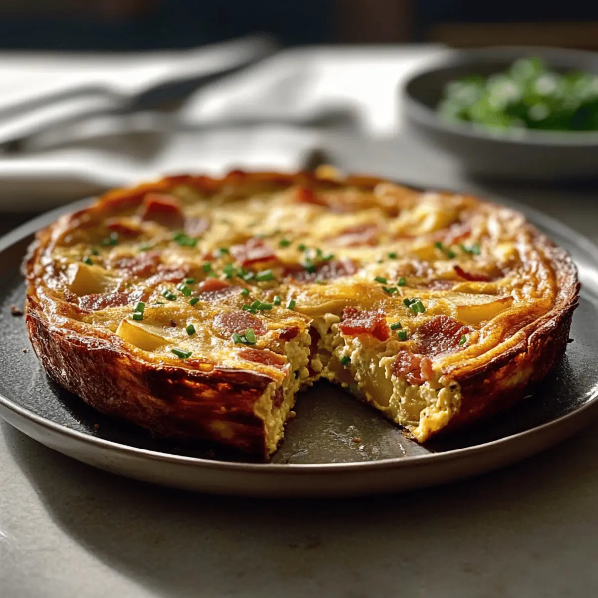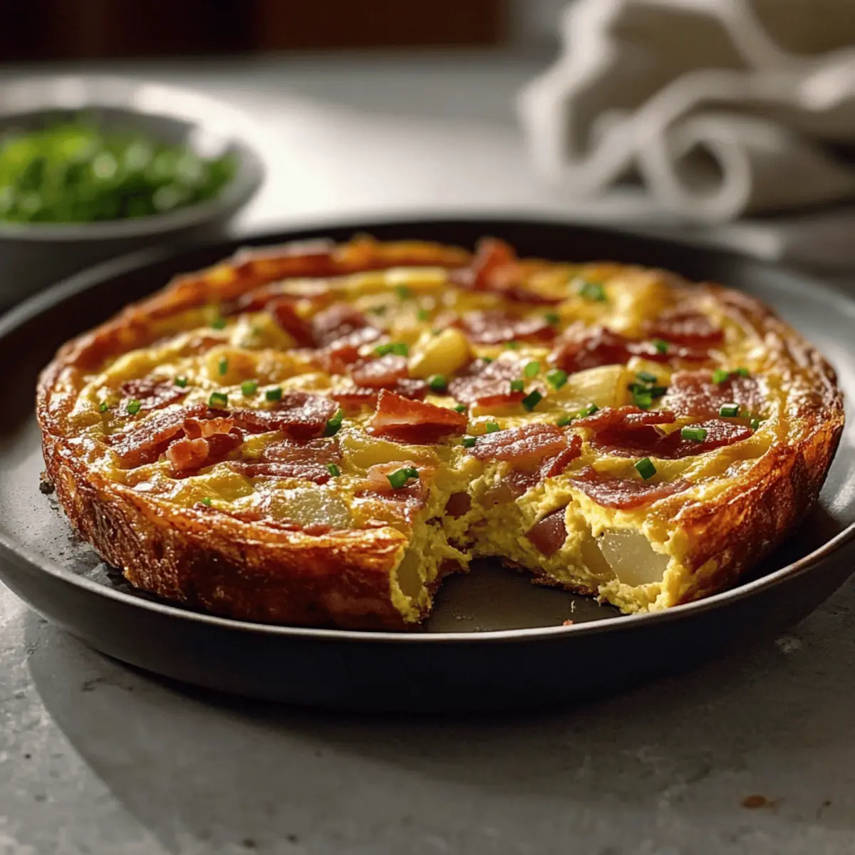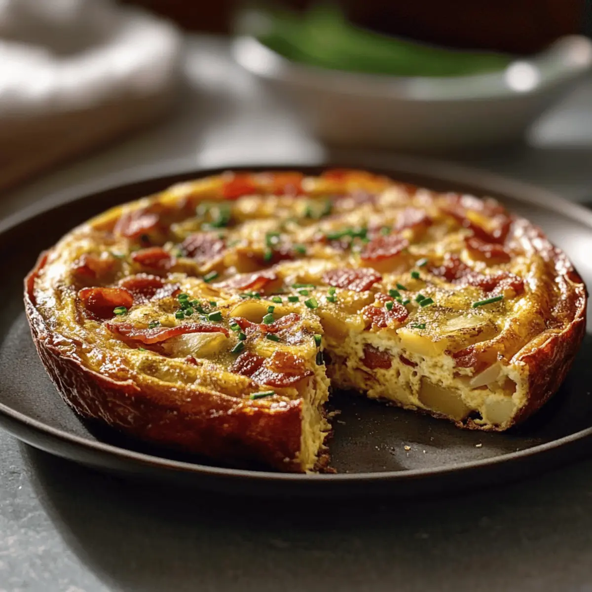 Jump to Recipe Print Recipe“Oh, brunch is just not brunch without a frittata!” I overheard my friend say last weekend as we gathered around the table, plates piled high with deliciousness. It’s true—nothing quite captures the essence of a leisurely morning like Ina Garten’s Bacon Potato Frittata. This comforting dish blends crispy bacon and tender potatoes into a fluffy egg masterpiece that’s simple enough for any home cook to master. Not only does it promise minimal prep time, making it a perfect fit for those busy weekends, but it’s also a hearty crowd-pleaser that your family will ask for time and again. Plus, you can customize it with fresh herbs or your favorite cheese for an extra kick! Ready to whip up something delightful? Let’s dive into this comforting recipe that’ll surely become a fixture on your brunch table! Why is this frittata a must-try? Comforting and Hearty: Packed with crispy bacon and tender potatoes, this frittata is a warm hug on a plate—perfect for brunch or a quick weeknight dinner. Easy to Make: This straightforward recipe requires minimal skills, making it accessible for both novice cooks and seasoned chefs. Customizable Flavor: Feel free to get creative! Swap in your favorite cheese or toss in fresh veggies like spinach to suit your taste. Impressive Appearance: With its fluffy texture and vibrant colors, this frittata will impress your family and guests, making it a go-to for gatherings. Quick Prep: The easy prep means you can enjoy more time at the table, allowing you to savor moments with loved ones. For additional flavor inspiration, consider pairing this dish with a rich Garlic Herb Potato soup or some crispy Bacon Brown Sugar chicken tenders for a deliciously filling meal! Ina Garten Bacon Potato Frittata Ingredients For the Frittata • 8 large eggs – Use room temperature for better mixing results. • 6 strips bacon (chopped) – Adds smoky flavor and richness; turkey bacon can be used for a lighter option. • 2 medium potatoes (diced) – Provides texture; ensure they’re cooked to a golden brown for optimal flavor. • 1/2 cup heavy cream – Adds richness; feel free to substitute with half-and-half for a lighter version. • 1/4 cup fresh chives (chopped) – Enhances flavor; green onions can be used if chives aren’t available. • 1/2 cup cheddar cheese (grated) – Offers a savory flavor; try Gruyère for a different twist. • Salt and pepper (to taste) – Essential for seasoning; adjust according to your preference. • 2 tablespoons olive oil – Ideal for cooking the bacon and potatoes; butter can be used for a richer flavor. With these fantastic ingredients, you’ll create a delightful Ina Garten Bacon Potato Frittata that’s sure to impress your family and friends! Step‑by‑Step Instructions for Ina Garten Bacon Potato Frittata Step 1: Preheat the Oven Begin by preheating your oven to 375°F (190°C) to ensure it’s hot and ready for baking your delicious Ina Garten Bacon Potato Frittata. This temperature will help set the frittata perfectly, allowing it to rise beautifully as it cooks. Step 2: Cook the Bacon In a large oven-safe skillet, heat 2 tablespoons of olive oil over medium heat. Add the chopped bacon and cook for about 6-8 minutes, stirring occasionally, until it’s crispy and golden. Once done, transfer the bacon to a plate lined with paper towels to absorb excess grease while keeping the flavorful drippings in the skillet. Step 3: Sauté the Potatoes With the same skillet still on medium heat, add the diced potatoes to the remaining bacon fat. Cook them for 10-12 minutes, stirring frequently, until they are golden brown and tender. You want them to achieve a satisfying crispness while absorbing that delicious bacon flavor, which makes the frittata even more savory. Step 4: Prepare the Egg Mixture In a mixing bowl, whisk together the 8 large eggs, 1/2 cup of heavy cream, and a sprinkle of salt and pepper until everything is well combined. Aim for a light and airy mixture that will create a fluffy texture in your Ina Garten Bacon Potato Frittata. Step 5: Combine Ingredients Pour the egg mixture over the golden potatoes in the skillet, ensuring even coverage. Then, sprinkle the crispy bacon and 1/2 cup of grated cheddar cheese over the top. Use a spatula to gently stir the mixture for a few seconds, helping to distribute the ingredients evenly while still keeping the texture intact. Step 6: Cook on the Stovetop Place the skillet back on the stovetop over medium heat and cook for about 3 minutes. Watch for the edges of the frittata to begin setting while keeping the center slightly wobbly. This step allows you to build a nice crust at the edges, enhancing the overall texture as it bakes in the oven. Step 7: Bake the Frittata Carefully transfer the skillet to the preheated oven. Bake the frittata for 15-20 minutes or until it is puffed up and set in the center. To check for doneness, insert a toothpick in the middle; it should come out clean, indicating your delicious Ina Garten Bacon Potato Frittata is ready to be enjoyed! Step 8: Garnish and Serve Once baked, remove the skillet from the oven and let it rest for about 5 minutes. This will help the frittata firm up a bit more and make slicing easier. Finally, garnish with chopped fresh chives for a pop of color and freshness before serving warm to your family! Storage Tips for Ina Garten Bacon Potato Frittata Room Temperature: The frittata can be left at room temperature for up to 2 hours, but it’s best to refrigerate leftovers to maintain freshness. Fridge: Store any leftovers in an airtight container in the refrigerator for up to 3 days. This will help retain the flavors of the Ina Garten Bacon Potato Frittata. Freezer: If you want to store it longer, wrap individual slices tightly in plastic wrap and then in aluminum foil. Store in the freezer for up to 2 months. Reheating: To enjoy, reheat slices in the microwave for about 1-2 minutes, or place t