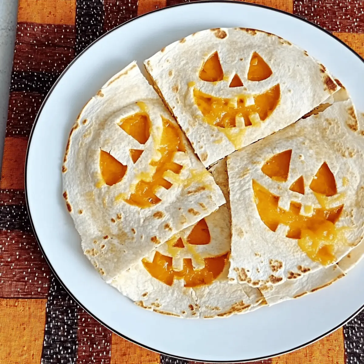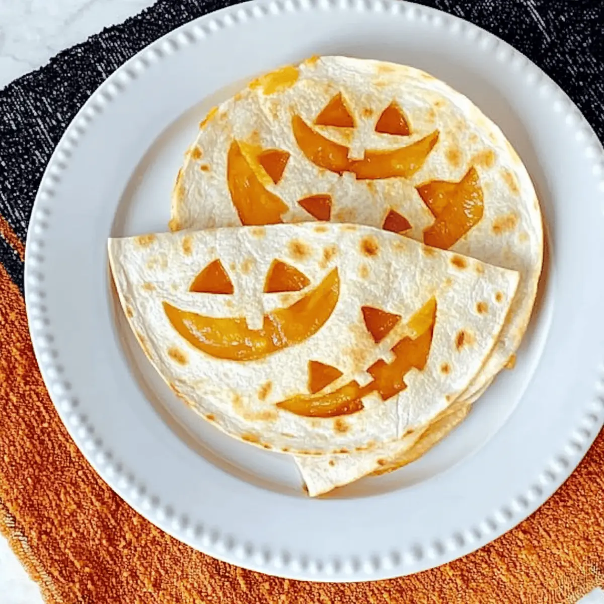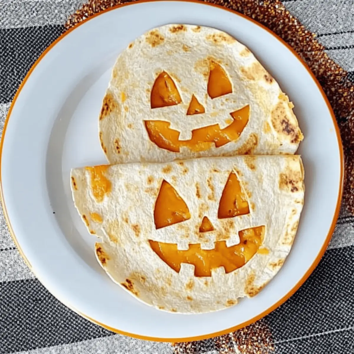 Jump to Recipe Print RecipeAs I turned the corner of my kitchen, the scent of melting cheese pulled me in like a siren song. I couldn’t help but smile at the festive shapes on my cutting board—these Jack o Lantern Quesadillas are just the kind of fun, easy meal that turns ordinary lunch into a Halloween celebration! Perfect for a quick dinner or a playful appetizer, this recipe brings cheer and creativity to the table, delighting both kids and adults alike. With a crispy exterior and gooey cheese filling, these quesadillas are not only delicious but also a fantastic way to make mealtime a holiday treat. Are you ready to get cooking and impress your loved ones with a dish that’s as festive as it is tasty? Why are Jack o Lantern Quesadillas a must-try? Easy and Fun: This recipe brings together simplicity and creativity, making cooking a breeze for all skill levels. Festive Appeal: The delightful pumpkin shapes instantly elevate your Halloween festivities, making meal prep an enjoyable activity. Kid-Friendly: Kids will love both making and eating these cheesy treats, ensuring a joyful dining experience for the whole family. Quick Meal Solution: Ready in just minutes, these quesadillas are perfect for busy weeknights or spontaneous Halloween gatherings. Versatile: Feel free to swap in your favorite cheeses or add a protein to customize them to your taste. Check out my family-friendly meal ideas for more inspiration! Crispy and Gooey: With a perfect crunch on the outside and a melty cheese center, these quesadillas are truly irresistible! Jack o Lantern Quesadilla Ingredients For the Quesadilla • Flour Tortillas – The foundational base for your quesadillas, providing great structure; feel free to use corn tortillas for a gluten-free option. • Shredded Colby Jack Cheese – Offers a deliciously creamy flavor; you can substitute with cheddar or mozzarella for a different taste. For Decorating • Pumpkin Cookie Cutter – Essential for creating those adorable jack-o-lantern shapes; if unavailable, a sharp knife will do the trick for cutting. Optional Fillings • Cooked Vegetables – Sneak in some nutrition with veggies like bell peppers or spinach; these additions also enhance the flavor profile. • Cooked Meat – Add your choice of shredded chicken, ground beef, or turkey for a heartier meal option. These delightful Jack o Lantern Quesadillas make for a fun and easy Halloween meal that will surely impress the entire family! Step‑by‑Step Instructions for Jack o Lantern Quesadillas Step 1: Cut Tortillas Begin by using a pumpkin cookie cutter to cut out two pumpkin shapes from each flour tortilla. If you don’t have a cookie cutter, a sharp knife works well for creating festive designs. Aim for even shapes, as this will enhance the look of your Jack o Lantern Quesadillas. Set aside the tortilla pieces carefully on a cutting board to keep them intact. Step 2: Carve Faces Next, take half of the pumpkin-shaped tortilla pieces and carve playful faces using a sharp knife. Think spooky or silly, depending on your family’s taste! Ensure to navigate the knife carefully to achieve clean cuts for the eyes, nose, and mouth. Once done, lay these carved tortillas aside, as they will be the top layer of your quesadillas. Step 3: Heat the Skillet Place a non-stick skillet on medium heat and allow it to warm for about 2–3 minutes. This step is crucial for achieving that crispy exterior on your Jack o Lantern Quesadillas. Once the skillet is hot, place one uncut pumpkin tortilla in the skillet, allowing it to heat for about 1 minute until it’s slightly toasted. Step 4: Add Cheese Sprinkle a generous layer of shredded Colby Jack cheese evenly over the warm, uncut tortilla in the skillet. Allow the cheese to begin melting, which should take another minute or so. This gooey layer is what makes the quesadilla delicious and ties all the flavors together, creating a perfect blend with the pumpkin shapes. Step 5: Assemble the Quesadilla Carefully place one of the carved pumpkin face tortillas, face down, on top of the melted cheese. Make sure the stumps of the Jack o lanterns are oriented in opposite directions for the best presentation. Gently press down on the tortilla to ensure the cheese begins to adhere, keeping everything in place as it cooks. Step 6: Flip the Quesadilla After about 2–3 minutes, or when you notice the bottom tortilla is golden brown, gently flip the quesadilla using a spatula. Cook the other side for about 2 minutes until it’s crispy and the cheese is fully melted. Keep an eye on the quesadilla during this time to prevent burning and ensure a perfect crunchy texture. Step 7: Repeat and Serve Continue the process with the remaining tortillas and filling, until all the Jack o Lantern Quesadillas are cooked. As you finish each one, slice them into wedges for easy serving. Enjoy these festive treats hot with salsa, guacamole, or your favorite dipping sauce to create an inviting Halloween atmosphere! Expert Tips for Jack o Lantern Quesadillas • Prep Ahead: Make sure to prep the tortillas and fillings in advance to speed up the cooking process. This keeps things fun and stress-free! • Careful Cutting: When carving faces into the tortillas, use a sharp knife with caution to avoid slips. Always cut away from yourself for safety. • Monitor Heat: Adjust your stove heat as necessary, ensuring quesadillas turn a lovely golden brown without burning. The cheese should be thoroughly melted for the best results! • Experiment with Cheese: Feel free to swap out the shredded Colby Jack cheese for others like mozzarella or cheddar for a different flavor profile in your Jack o Lantern Quesadillas. • Add Extra Flavor: Sneak in some cooked vegetables or shredded meats to create a heartier meal that kids will still love. Jack o Lantern Quesadillas Variations Feel free to let your creativity shine with these fun twists on your Jack o Lantern Quesadillas! Cheese Varieties: Experimen