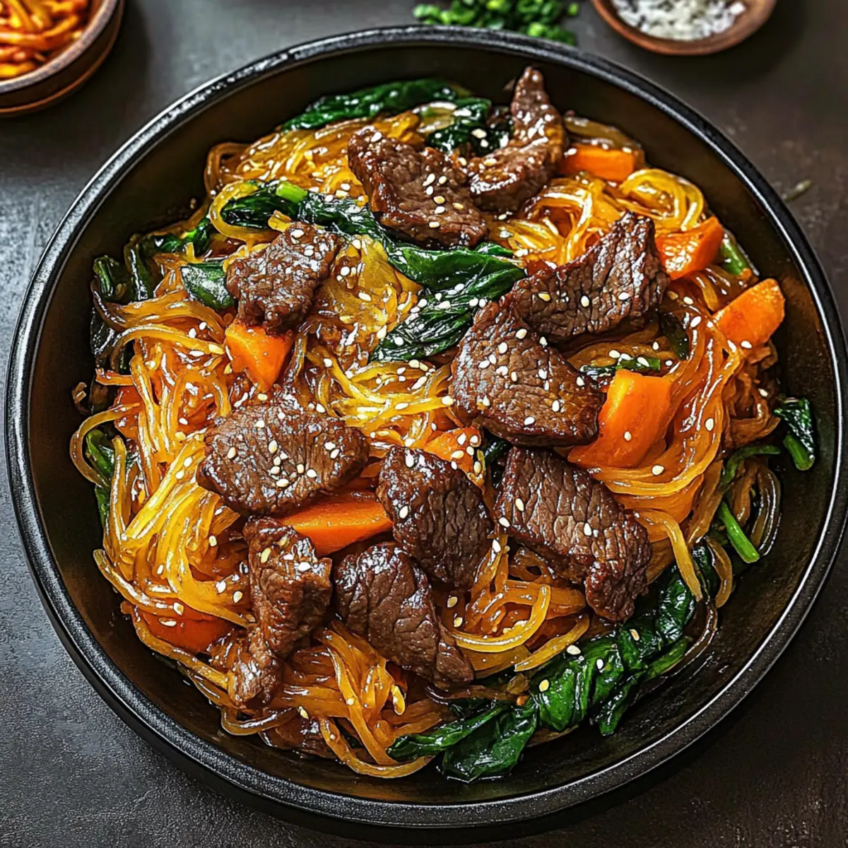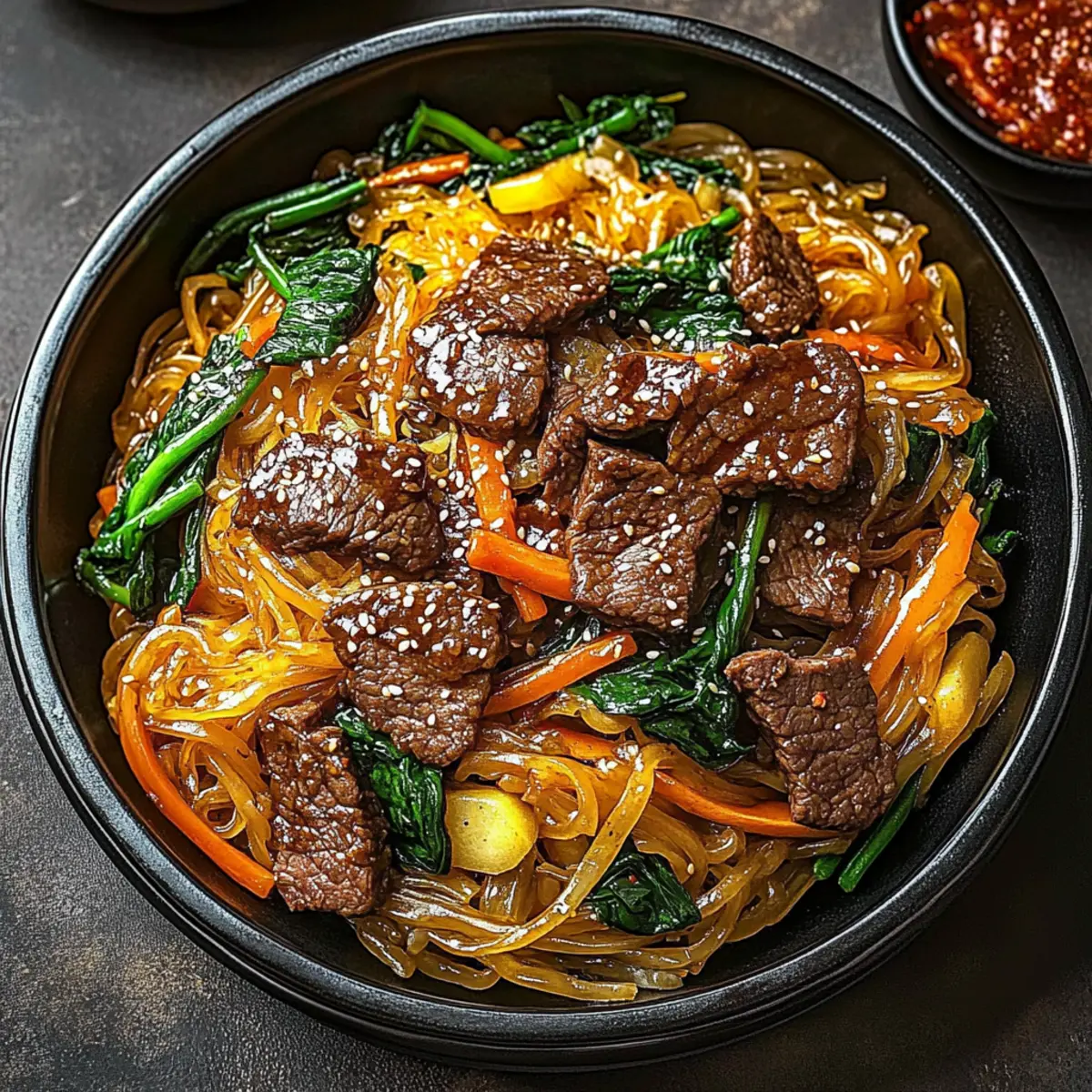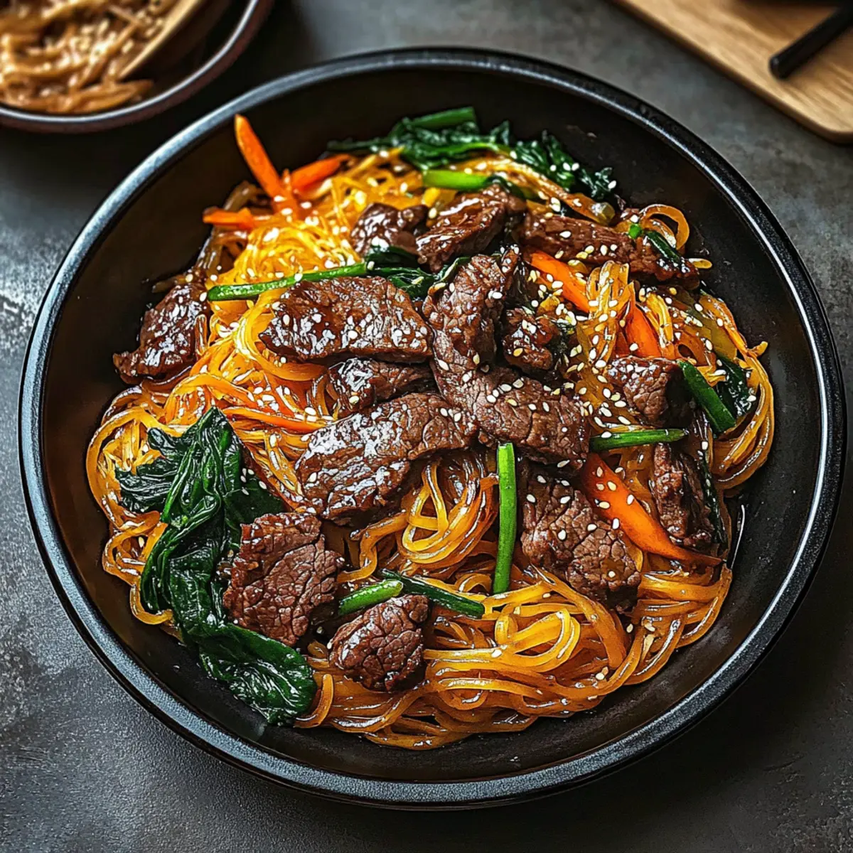 Jump to Recipe Print RecipeThe aroma of sizzling garlic and soy sauce wafting through the kitchen instantly transports me to a bustling market in Seoul, where vibrant colors and flavors collide in every dish. Today, I’m excited to share my take on a beloved classic: Japchae, the traditional Korean stir-fried noodles that bring warmth to any table. This delightful dish features sweet potato glass noodles, renowned for their chewy texture, making Japchae not only a crowd-pleaser but also a gluten-free option that everyone can enjoy. With the versatility to swap proteins such as beef, chicken, or tofu, you can easily tailor it to suit any palate. Plus, it’s quick to whip up, making it perfect for busy weeknights or special occasions alike. Are you ready to dive into the world of savory, stir-fried goodness? Why is Japchae a Must-Try Dish? Rich, Authentic Flavor: This fabulous dish combines the deep umami of soy sauce with the nutty undertones of sesame oil, delivering a taste that transports you straight to Korea. Quick and Easy: With a straightforward cooking method, you’ll have this delicious meal ready in no time—perfect for hectic weeknights! Customizable Delight: With options like beef, chicken, or tofu, Japchae lends itself to various dietary preferences, making it a go-to for family gatherings. Gluten-Free Goodness: Crafted with sweet potato noodles, this recipe ensures those avoiding gluten can enjoy a satisfying, hearty dish. Crowd-Pleasing: Whether it’s a celebration or a casual dinner, Japchae’s vibrant colors and flavors are sure to impress your guests and leave them wanting more. Dare to explore more options? Check out how to customize it further at our Serving Suggestions section! Japchae Ingredients For the Noodles Sweet Potato Noodles – These noodles provide a delightful chewiness and unique texture, perfect for carrying the flavors of the dish. Substitution: Use rice noodles if you prefer a different texture. For the Protein Beef – Adds richness and plenty of protein; choose thinly sliced cuts for even cooking. Substitution: Chicken or tofu for a lighter, vegetarian version that’s just as delicious. For the Vegetables Carrots – Their natural sweetness enhances the dish and adds a pop of color. Spinach – Nutrient-packed and visually vibrant, it adds a fresh touch. Mushrooms – Their earthy flavor complements the other ingredients beautifully. Note: Feel free to use any seasonal vegetables for variation! For the Sauce Soy Sauce – Offers a savory umami flavor and necessary saltiness to balance the sweetness of the noodles. Substitution: Tamari for a gluten-free option, keeping the flavors intact. For the Aroma Sesame Oil – Adds a warm, nutty aroma that elevates the entire dish. Note: In a pinch, olive oil can serve, but it lacks the aromatic qualities. For Garnish Green Onions – Provide a crisp, fresh kick as a garnish. Note: Chopped cilantro can also be used for a different flavor profile, brightening up your Japchae delight. These Japchae ingredients ensure a comprehensive blend of flavors and textures, promising a delicious meal that’s both satisfying and versatile! Step‑by‑Step Instructions for Japchae Step 1: Prepare Noodles Begin by soaking sweet potato noodles in a bowl of hot water for 20 to 30 minutes, allowing them to soften and become pliable. Once they are tender, drain the noodles and set them aside, ensuring they don’t stick together. You’ll know they’re ready when they are slightly chewy and flexible, perfect for your Japchae. Step 2: Cook Beef In a large pan or wok, heat a tablespoon of sesame oil over medium-high heat. Add thinly sliced beef and stir-fry for about 5-7 minutes until it’s browned and cooked through. The beef should be nicely seared, with no pink remaining. Once done, remove the beef from the pan and set it aside on a plate, leaving any flavorful juices behind. Step 3: Sauté Vegetables In the same pan, reduce the heat slightly and add minced garlic along with your choice of vegetables, such as carrots, spinach, and mushrooms. Stir-fry for 3 to 5 minutes until they are tender yet still vibrant and slightly crisp. This step enhances the flavors and adds a beautiful color to your Japchae, making it visually appealing. Step 4: Combine Ingredients Return the cooked noodles and beef to the pan with the vegetables, ensuring everything is mixed well. Drizzle a generous amount of soy sauce over the mixture, and add another splash of sesame oil to enhance the flavor. Toss everything together for about 2-3 minutes until heated through, ensuring that the noodles are evenly coated with the savory sauce. Step 5: Finish & Serve To complete your Japchae, toss in chopped green onions for a fresh crunch just before serving. Mix thoroughly to distribute them throughout. Serve hot or at room temperature, beautifully presented on a platter. This delightful dish showcases the chewy noodles and vibrant vegetables, promising a memorable meal for any occasion. Expert Tips for Perfect Japchae Noodle Soaking: Ensure sweet potato noodles are soaked for the right time—20-30 minutes—until perfectly chewy. This prevents them from becoming too firm or mushy. Vegetable Crispness: To maintain vibrant colors and textures, avoid overcooking your vegetables. They should be tender but still slightly crisp for the best bite in your Japchae. High Smoke Point Oil: Use a high smoke point oil like sesame oil or canola when stir-frying to prevent burning and achieve optimal flavor in your Japchae. Protein Variation: Don’t hesitate to swap proteins! Chicken or tofu works beautifully, ensuring your Japchae caters to different dietary preferences while retaining rich flavor. Flavor Balance: Adjust the soy sauce to your taste; add more for a saltier dish, or keep it lighter for a more subtle flavor that lets the noodles shine. Make Ahead Options These Japchae noodles are perfect for meal prep enthusiasts! You can soak and prepare the sweet pota