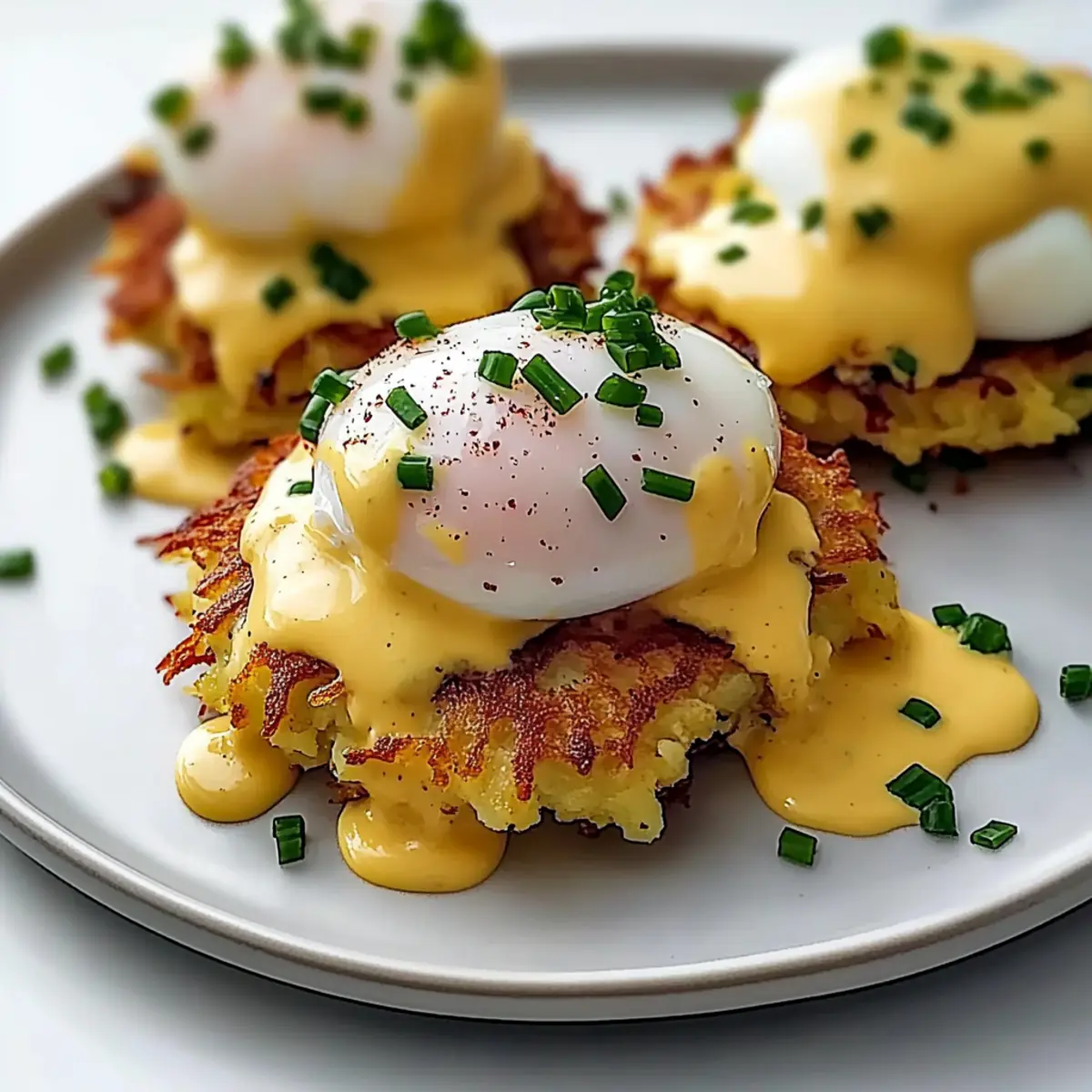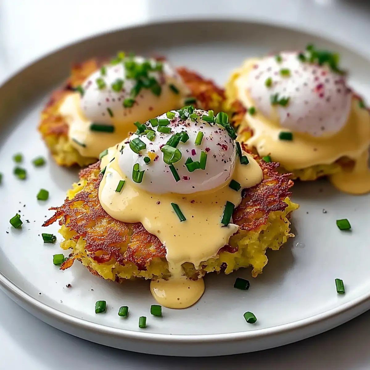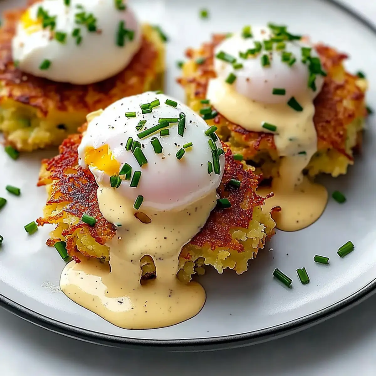 Jump to Recipe Print RecipeAs I watched the crispy latkes sizzle in the pan, the aroma of golden potatoes and onions filled my kitchen, pulling my family in like a cozy blanket. These Easy Latke Eggs Benedict transform breakfast into a mouthwatering adventure! Combining the heartiness of perfectly fried latkes with delicate poached eggs and a drizzle of rich hollandaise, it’s a brunch dish that’s both indulgent and approachable. With a satisfying crunch and a burst of flavors from fresh chives and lemon, this recipe is perfect for impressing guests or simply treating yourself to something special. Plus, it’s easily adaptable for gluten-free diets! Ready to elevate your brunch game? Let’s dive into this delightful combination that’s sure to make your taste buds sing! Why You’ll Crave Latke Eggs Benedict? Crunchy Perfection: The combination of crispy latkes and creamy hollandaise creates a match made in heaven, offering a perfect balance of textures. Customizable Delight: Whether you prefer smoked salmon, crispy bacon, or avocado, this dish allows for endless creativity and adaptation. Time-Saving Option: You can prepare the latke batter in advance, making this a quick dish for any brunch gathering. Gourmet Experience: Enjoy a restaurant-quality meal at home and impress your guests with this indulgent yet approachable recipe. Gluten-Free Friendly: With simple substitutions, you can easily adapt this recipe to be gluten-free, ensuring everyone can join in on the fun! Latke Eggs Benedict Ingredients For the Latkes • Russet Potatoes – These provide the structure and crispiness for the latkes; use firm russets for the best texture. • Yellow Onion – Adds delicious flavor; can be swapped with shallots for a milder taste. • Eggs – Essential for binding the mixture; fresher eggs yield better results for poaching. • Matzo Meal or All-Purpose Flour – Binds the ingredients together; for a gluten-free option, use matzo meal or a gluten-free flour blend. • Kosher Salt & Ground Black Pepper – Season the latkes perfectly; adjust to taste for the best flavor. • Vegetable Oil – Critical for frying; make sure it’s hot enough to achieve that desired crispiness. For Toppings • Smoked Salmon – Adds a rich, delightful flavor; can be replaced with crispy bacon or avocado for a different spin. • Chives & Finely Diced Red Onion – Fresh garnishes enhance both flavor and presentation. • Lemon – Brings brightness to the hollandaise; extra wedges are perfect for serving alongside the dish. Prepare these ingredients, and you’ll be well on your way to crafting a fabulous Latke Eggs Benedict that is sure to impress and delight! Step‑by‑Step Instructions for Easy Latke Eggs Benedict Step 1: Prep Potatoes Start by grating 2 large russet potatoes and half a yellow onion using a box grater or food processor. Immediately soak the grated mixture in a large bowl of salted water for 20–30 minutes. This helps remove excess starch, allowing for crispier latkes. Stir occasionally to ensure everything is submerged. Step 2: Drain and Dry Once the potatoes have soaked, place a clean kitchen towel or cheesecloth over a colander and pour the mixture in to drain thoroughly. Squeeze the towel tightly to extract as much moisture as possible. The drier your mixture, the crispier your latkes will be, so take your time with this step. Step 3: Mix Ingredients In a mixing bowl, combine the drained potato-onion mixture with 1 beaten egg, 1/4 cup matzo meal or all-purpose flour, and season generously with kosher salt and freshly ground black pepper. Mix everything until well incorporated and you achieve a cohesive mixture. This will ensure the latkes hold together during frying. Step 4: Fry Latkes Heat about 1/4 inch of vegetable oil in a large skillet over medium-high heat until shimmering, around 350°F. Using 3-4 tablespoons for each latke, carefully drop the potato mixture into the hot oil. Fry the latkes for 6–10 minutes on each side until they turn golden brown and crispy. Adjust the heat as necessary to prevent burning. Step 5: Poach Eggs While the latkes are frying, bring a pot of water to a gentle simmer and add a splash of vinegar. Create a whirlpool in the simmering water using a spoon, and carefully drop in each egg (one at a time). Poach the eggs for about 4½ to 5 minutes until the whites are set, yet the yolks remain beautifully runny. Step 6: Make Hollandaise In a blender, combine 3 egg yolks, the juice of half a lemon, and a pinch of salt. Blend until slightly thickened, then gradually drizzle in 1/2 cup of melted butter while the blender runs to create a smooth, creamy hollandaise sauce. If the sauce thickens too much, whisk in a tablespoon of warm water to achieve the right consistency. Step 7: Assemble To plate your Easy Latke Eggs Benedict, start with a crispy latke as the base. Top it with a slice of smoked salmon (if using), gently place a poached egg on top, and generously drizzle with warm hollandaise sauce. Garnish with finely chopped chives and a sprinkle of diced red onion for a fresh finish. Latke Eggs Benedict Variations & Substitutions Feel free to put your own spin on this delightful recipe and make it truly yours! Dairy-Free: Replace the butter in the hollandaise with a dairy-free alternative or use a vegan hollandaise recipe for a lighter, plant-based twist. Gluten-Free: Use certified gluten-free flour instead of all-purpose flour or stick with matzo meal to keep your latkes crispy and delicious. Spicy Kick: Add a pinch of cayenne pepper or some diced jalapeño to the latke mixture for a little heat that’ll elevate your breakfast game. Herb Infusion: Toss in finely chopped fresh herbs like dill or parsley into your latke mixture for a flavor boost that’s bright and refreshing. Smoky Flavor: Try adding smoked paprika to the latke batter for an extra depth of flavor that pairs exquisitely with the smoked salmon. Texture Twist: For added crunch, fold in