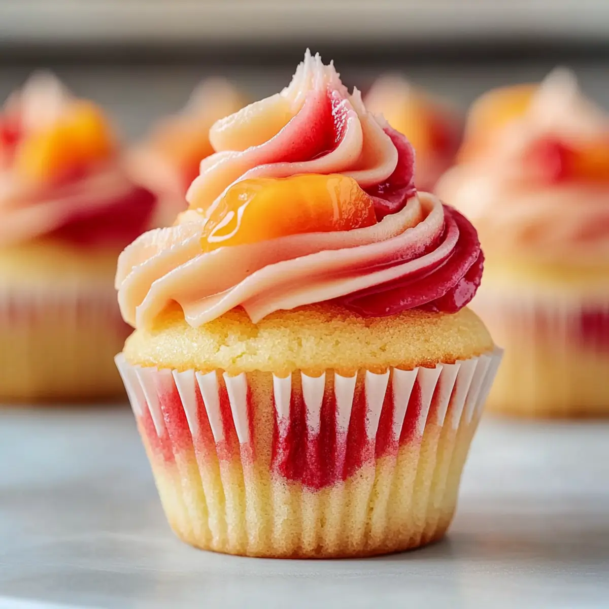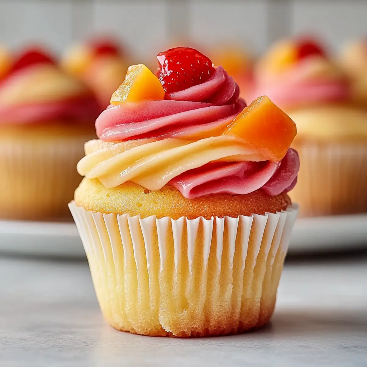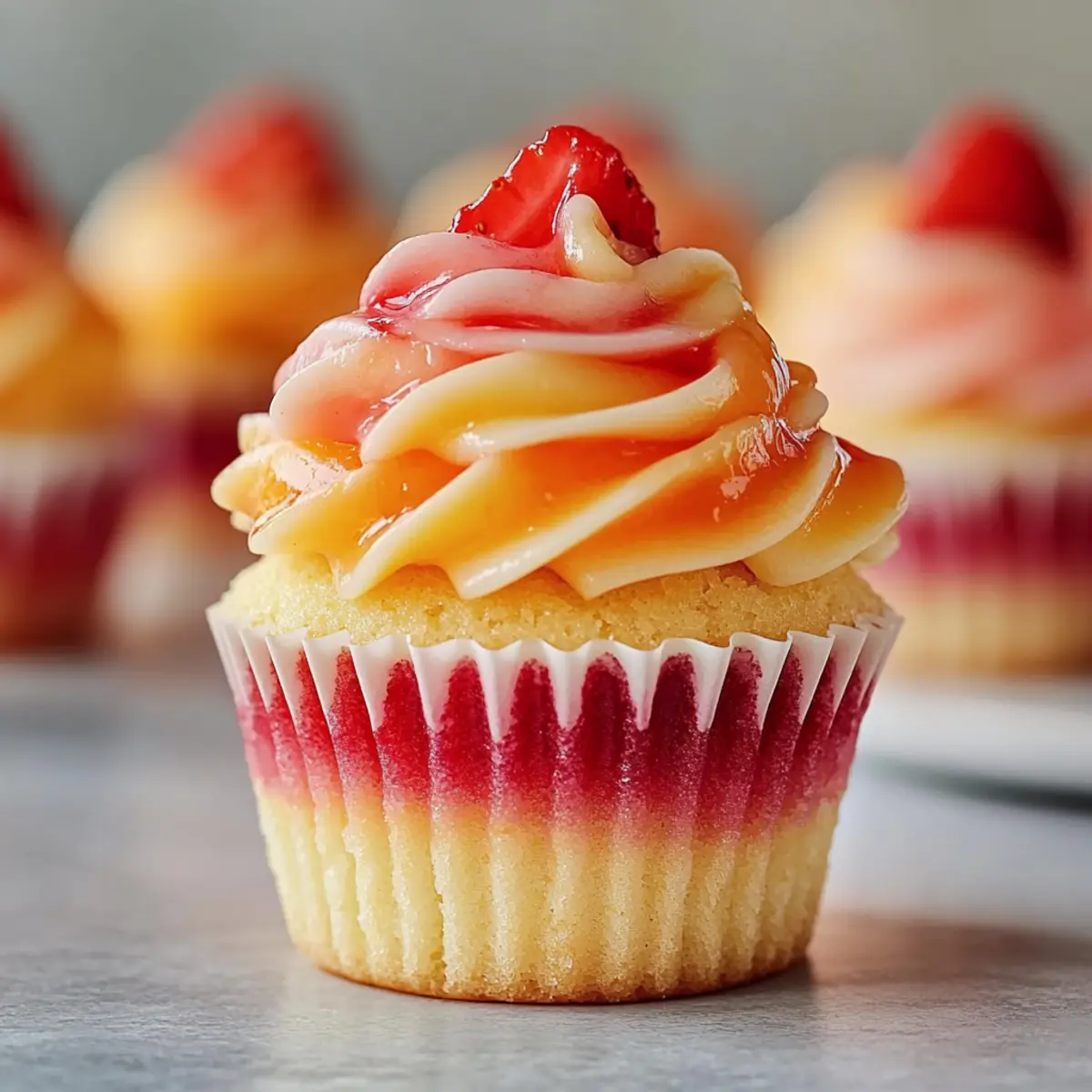 Jump to Recipe Print RecipeAs I stood in my kitchen, the sweet scent of ripe mango paired with strawberries wafted through the air, instantly transporting me to a sun-soaked beach. That’s when I knew it was time to whip up a batch of Mango Strawberry Sunset Cupcakes! This delightful recipe combines tropical flavors and a pop of color, making it the perfect quick dessert for any occasion. These cupcakes feature a light, fluffy texture with a luscious surprise of strawberry jam at the center, ensuring every bite is a treat. Plus, they’re incredibly simple to whip up, making them an ideal choice when you need a crowd-pleaser that’s both visually stunning and irresistibly delicious. So, are you ready to take a delicious dip into these tropical delights? Why Are These Cupcakes So Special? Tropical Flavors: The combination of mango and strawberry brings a refreshing burst of sunshine to your palate, reminiscent of a vacation getaway. Quick and Easy: You don’t need to be a baking expert to create these beauties—just mix, bake, and enjoy! Perfect for Any Occasion: Whether it’s a birthday party or a casual family gathering, these cupcakes are bound to impress. Versatile Ingredients: Easily swap in different fruits or jams to customize flavors, like trying Mango Muffins Passion for a delightful twist. Visually Appealing: With their stunning sunset frosting and pops of fruit, they’re sure to be the star of your dessert table! Enjoy these cupcakes as a sweet escape from fast food—your taste buds will thank you! Mango Strawberry Sunset Cupcake Ingredients • Get ready to create something delightful! For the Cupcake Base All-Purpose Flour – Provides structure and texture. Can be substituted with gluten-free flour blend. Baking Powder – Leavening agent that helps cupcakes rise. Ensure it’s fresh for best results. Salt – Enhances flavor and balances sweetness. A pinch can also intensify other flavors. Butter (softened) – Adds richness and tender texture. Use unsalted for better control over sweetness. Granulated Sugar – Contributes sweetness and helps with browning. Brown sugar can be used for a deeper flavor. Eggs – Binds ingredients together and adds moisture. For a vegan option, use flaxseed meal mixed with water. Vanilla Extract – Provides a warm, sweet flavor. Can be replaced with almond extract for a different note. Milk – Moistens the batter and balances the consistency. Non-dairy milk alternatives work well too. Mango Purée – Lends a tropical flavor and moisture. Can substitute with peach or nectarine purée. For the Jam Filling Strawberry Jam – Provides a sweet burst of flavor in the center. Homemade jam can offer a fresher taste. For the Frosting Powdered Sugar – Base for frosting, provides smooth sweetness. For a healthier option, a sugar substitute can be explored. Heavy Cream – Ensures a rich and creamy frosting texture. Can replace with coconut cream for a dairy-free option. These delightful Mango Strawberry Sunset Cupcakes are just a few steps away—let’s get baking! Step‑by‑Step Instructions for Mango Strawberry Sunset Cupcakes Step 1: Preheat Oven Begin by preheating your oven to 350°F (175°C). While the oven warms up, line your muffin tin with vibrant cupcake liners, adding a cheerful touch that makes these Mango Strawberry Sunset Cupcakes even more appealing. Step 2: Prepare Dry Ingredients In a medium bowl, whisk together 1 ½ cups of all-purpose flour, 2 teaspoons of baking powder, and a pinch of salt. This blends the dry ingredients evenly, ensuring your cupcakes rise beautifully and maintain a light texture. Set aside and admire the flour’s fluffy consistency as we move to the next step. Step 3: Cream Butter and Sugar In a large mixing bowl, beat ½ cup of softened butter with 1 cup of granulated sugar for about 3-5 minutes until the mixture appears light and fluffy. The sugar will dissolve, and the butter will become pale in color, a sign that it’s perfectly creamed and ready to take on the wet ingredients. Step 4: Combine Wet Ingredients Add in 2 large eggs, 1 teaspoon of vanilla extract, ½ cup of milk, and 1 cup of mango purée to the creamed butter and sugar. Mix these ingredients thoroughly until combined, creating a luscious batter that permeates your kitchen with a delightful tropical aroma. Step 5: Mix Ingredients Gradually incorporate the dry mixture into the wet batter. Stir gently until just combined, being careful not to overmix, as that can lead to dense cupcakes. The batter should be slightly thick yet smooth, ready to rise into fluffy Mango Strawberry Sunset Cupcakes. Step 6: Fill Liners Using a spoon or a small ice cream scoop, fill each cupcake liner about three-quarters full with the batter. Ensure even distribution among the liners for uniform baking, so each cupcake has that signature light and airy texture we crave. Step 7: Bake Place the muffin tin in the preheated oven and bake for 18-20 minutes. You’ll know they’re done when a toothpick inserted into the center comes out clean, and they showcase a beautiful golden top. Once baked, let them cool for about 10 minutes in the tin before transferring them to a wire rack. Step 8: Add Strawberry Jam Once the cupcakes have cooled completely, use a small knife or a cupcake corer to carefully create a hole in the center of each cupcake. Fill each hole with a dollop of strawberry jam, adding that sweet surprise to every bite of your Mango Strawberry Sunset Cupcakes. Step 9: Make Frosting In a mixing bowl, beat ½ cup of softened butter until creamy, then gradually add 2 cups of powdered sugar and 2 tablespoons of heavy cream. Mix until the frosting is fluffy and smooth. If desired, divide the frosting into two bowls and color one with mango purée and another with strawberry purée for a beautiful sunset effect. Step 10: Frost Cupcakes Using a piping bag fitted with a star tip, frost the top of each cupcake in a swirl pattern to create the sunset look. Once