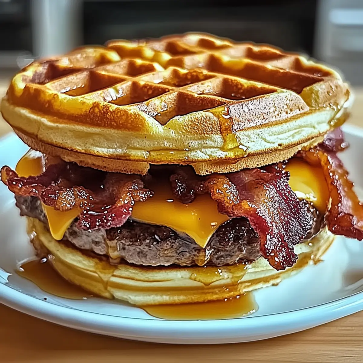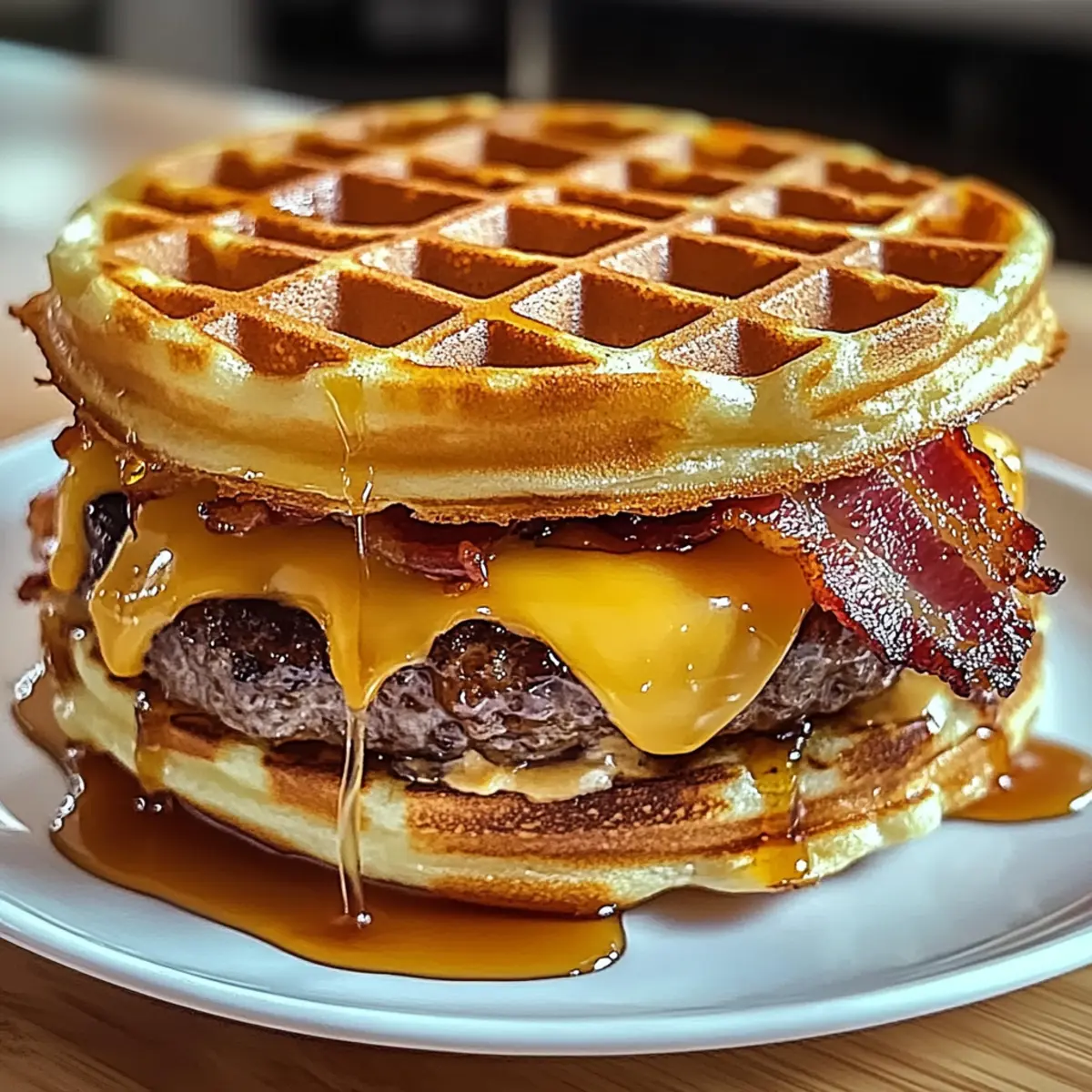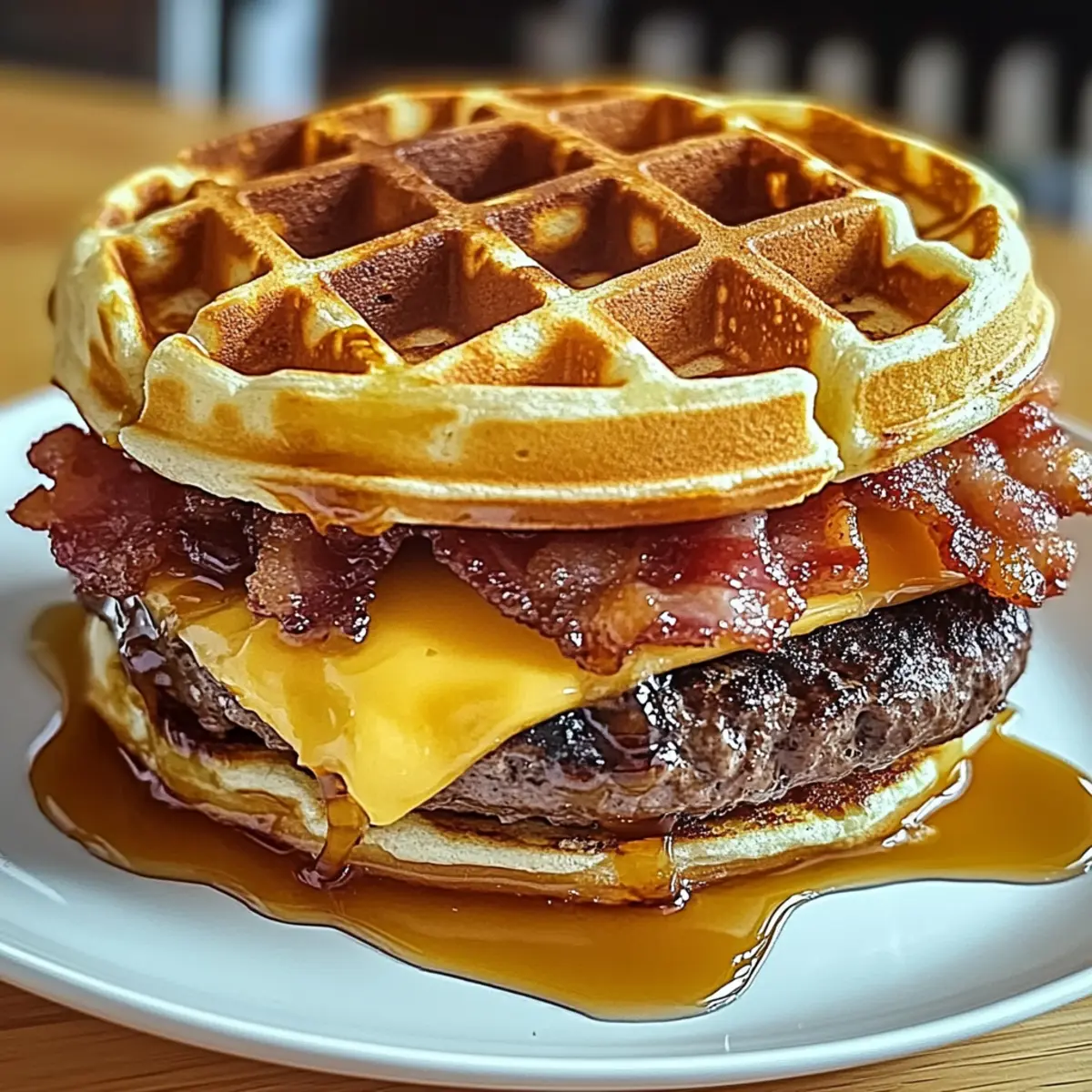 Jump to Recipe Print RecipeThere’s something uniquely comforting about combining breakfast favorites into an unexpected delight. Enter the Maple Bacon Waffle Burger, a high-protein crowd-pleaser that takes your taste buds on a sweet and savory journey. With crispy waffles cradling juicy beef patties and crunchy bacon, this dish not only satisfies cravings but also offers the flexibility to customize it to your family’s tastes. Whether you’re whipping this up for a fun brunch or surprising everyone with an unforgettable weeknight dinner, you’ll appreciate how simple it is to prepare, keeping you out of the fast-food rut. Ready to dive into a new breakfast sensation? Let’s get cooking! Why is the Maple Bacon Waffle Burger a Must-Try? Unforgettable Blend: This dish uniquely marries the sweetness of waffles with the heartiness of a burger, creating an unexpected yet delightful flavor combination. Protein Power: Packed with juicy beef and crispy bacon, it’s a high-protein meal that keeps you energized throughout the day. Endless Customization: With options like BBQ sauce or pepper jack cheese, you can easily personalize the recipe to suit your family’s taste preferences. Quick and Easy: Ready in under 30 minutes, dinner has never been simpler or more enjoyable, making it perfect for busy weeknights. Crowd-Pleaser: Whether for brunch or dinner, it’s a showstopper that will impress family and friends alike—try pairing it with some crispy hash browns for a complete meal. Don’t miss out on other delicious options like our Bacon Brown Sugar or Hamburger Mac Cheese for more family-friendly delights! Maple Bacon Waffle Burger Ingredients For the Burger • Ground Beef – A juicy protein source for your burger; swap for lean ground turkey or chicken for a lighter option. • Frozen Waffles – Acts as the unique bun, lending sweetness; homemade waffles work too if cooled and crispy. • Bacon – Adds that irresistible smoky flavor and crunch; turkey bacon is a healthier alternative. • Cheese (Cheddar, American, or Swiss) – Melts beautifully to complement the burger; choose a type that you love for the best flavor. • Maple Syrup – Infuses sweetness that balances the savory flavors; try sugar-free syrup for a lighter choice. • Garlic Powder – Enhances the beef flavor with a savory kick. • Onion Powder – Adds depth to the beef’s taste. • Salt and Pepper – Essential seasonings to elevate all flavors. Step‑by‑Step Instructions for Maple Bacon Waffle Burger Step 1: Prepare Patties In a mixing bowl, combine one pound of ground beef with garlic powder, onion powder, salt, and pepper. Use your hands to gently mix the ingredients until just combined, being careful not to overwork the meat. Form the mixture into two patties, making them slightly larger than your frozen waffles to accommodate shrinkage during cooking. Step 2: Cook Bacon Heat a skillet over medium heat and add the bacon strips. Cook for 6-8 minutes, turning occasionally, until the bacon is crispy and golden brown. Once cooked, transfer the strips to a paper towel-lined plate to drain excess grease, reserving about 2 tablespoons of the bacon fat in the skillet for added flavor when cooking the patties. Step 3: Cook Patties In the same skillet with the reserved bacon fat, place the formed beef patties. Cook each patty for 4-5 minutes on one side until browned, then flip and continue cooking for another 4-5 minutes or until they reach your desired doneness. Top each patty with a slice of cheese during the last minute of cooking to allow it to melt perfectly. Step 4: Toast Waffles While the patties are cooking, toast the frozen waffles in a toaster or a preheated oven until they are golden brown and crispy, which should take about 3-5 minutes. Once toasted, brush the warm waffles lightly with maple syrup for a deliciously sweet touch that complements the Maple Bacon Waffle Burger beautifully. Step 5: Assemble To assemble your Maple Bacon Waffle Burger, place one waffle on a plate as the base. Add the cheese-topped beef patty, followed by a couple of crispy bacon strips. Drizzle more maple syrup on top for extra sweetness, and finish with another waffle as the cap. Serve your delightful creation immediately, enjoying the perfect combination of flavors and textures! What to Serve with Maple Bacon Waffle Burger? Elevate your meal with delightful sides that complement the sweet and savory nature of this unique burger creation. Crispy Hash Browns: Golden and crunchy, hash browns add a delightful texture that perfectly balances the burger’s softness. Sweet Potato Fries: Their natural sweetness echoes the waffles, creating a harmonious contrast that enhances every bite of your burger. Fresh Arugula Salad: Light and peppery, arugula adds a refreshing touch that cuts through the richness of the burger, keeping your meal vibrant. Maple-Glazed Carrots: These tender, caramelized veggies harmonize the flavors of maple without overpowering the plate, maintaining that sweet-savory interplay. Fruit Salad: Bright, fresh fruits like berries or melon offer a refreshing sweetness, making for a light contrast to the hearty burger. Milkshake: A creamy vanilla or chocolate milkshake pairs wonderfully with this dish, providing a nostalgic diner experience that’s truly indulgent. Expert Tips for Maple Bacon Waffle Burger Waffle Factor: Ensure waffles are fully toasted and crisp to prevent them from getting soggy while assembling your Maple Bacon Waffle Burger. Perfect Patties: Shape beef patties larger than the waffles, as they will shrink during cooking. This way, every bite is satisfying! Cheese Choices: Opt for melty cheeses like American or Swiss for an ideal gooey texture atop your burger. Avoid hard cheeses that won’t melt well. Meal Prep Magic: For busy days, cook the bacon and form the patties ahead of time. Just reheat them before serving, keeping your evenings stress-free! Syrup Smarts: Brush the waffles with ma