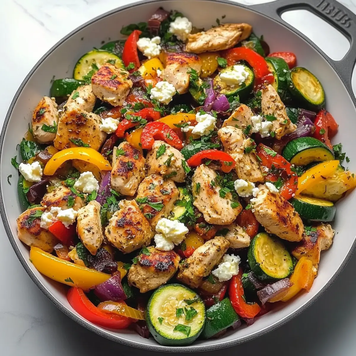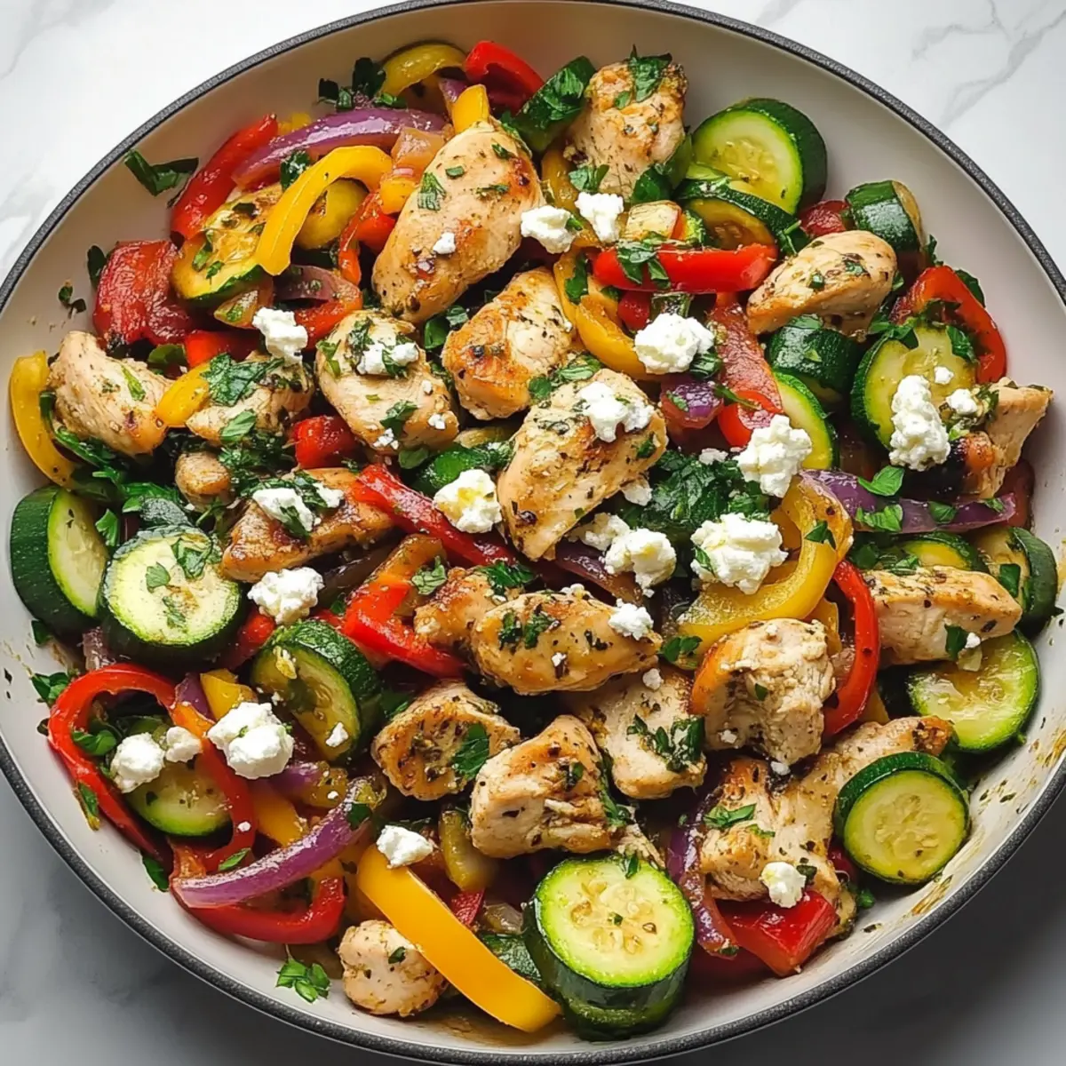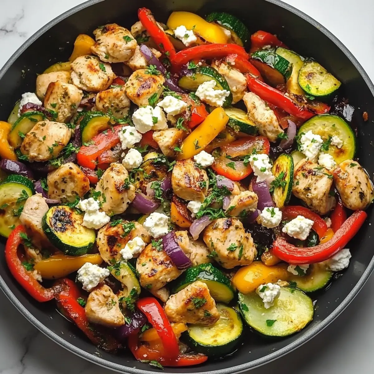 Jump to Recipe Print RecipeThe vibrant sizzle of a skillet can transport me straight to a sun-soaked terrace in the Mediterranean, where the air is filled with the aroma of fresh herbs and roasted vegetables. This Quick & Healthy Mediterranean Chicken Stir Fry encapsulates that essence, marrying tender chicken with an array of colorful veggies for a delightful weeknight meal. With the bonus of being ready in just 30 minutes, this recipe grants you the satisfaction of a gourmet dinner without the fuss. It’s not only a feast for the eyes but also a low-carb option packed with nutrients, making it a fantastic choice for anyone aiming to eat healthier without sacrificing flavor. Have you ever experienced the joy of a homemade dish that whisks you away to a different place? Let’s dive into the flavors that will elevate your dinner routine! Why is Mediterranean Chicken Stir Fry a Must-Try? Simplicity: This dish comes together in just 30 minutes, making it a breeze for busy weeknights. Fresh Ingredients: The vibrant blend of colorful vegetables, from zucchini to cherry tomatoes, ensures each bite is packed with nutrients. Healthy Option: Embrace a low-carb lifestyle without sacrificing taste; swap rice for cauliflower rice, and enjoy guilt-free indulgence. Versatility: Feel free to mix and match your favorite veggies or even experiment with proteins, like shrimp or tofu. Crowd-Pleaser: Perfect for family dinners or entertaining friends, it’s a dish that will leave everyone satisfied and coming for seconds! For an extra delicious pairing, try it alongside some Pesto Chicken Broccoli. Mediterranean Chicken Stir Fry Ingredients For the Stir Fry • Chicken breasts – Lean protein source; cut into bite-sized pieces for even cooking. • Extra virgin olive oil – Adds healthy fats and flavor; use for cooking and finishing. • Zucchini – Adds texture and nutrition; slice into half-moons as it cooks quickly. • Red bell peppers – Adds sweetness and vibrant color; diced into chunks. • Red onion – Adds sharpness and depth; sliced into strips for a slight crunch. • Cherry tomatoes – Contributes juiciness and a burst of flavor; halved for easy incorporation. • Kalamata olives – Provides a briny depth for authentic Mediterranean taste; pitted and halved. • Garlic – Enhances overall flavor; minced for quick and even distribution. • Sun-dried tomatoes – Deepens flavor profile; chop into smaller pieces for a concentrated taste. For Seasoning • Dried oregano, basil, thyme – Creates that authentic Mediterranean flavor; use in moderation for aromatic depth. • Lemon juice – Adds brightness and acidity; stir in at the end for a fresh finish. • Feta cheese – Contributes creaminess and saltiness; crumble on top before serving. • Fresh parsley – Optional garnish for added color and a hint of freshness. This Mediterranean Chicken Stir Fry is not just a meal; it’s a vibrant journey for your taste buds! Enjoy the delightful flavors and healthful ingredients that come together effortlessly. Step‑by‑Step Instructions for Mediterranean Chicken Stir Fry Step 1: Prep Your Ingredients Begin by prepping all your ingredients to ensure a smooth cooking process for the Mediterranean Chicken Stir Fry. Chop the chicken breasts into bite-sized pieces for even cooking, slice the zucchini into half-moons, and dice the red bell peppers. Also, halve the cherry tomatoes and slice the red onion into strips. Mince the garlic and chop the sun-dried tomatoes, setting everything aside in separate bowls. Step 2: Sear the Chicken In a large skillet, heat 2 tablespoons of extra virgin olive oil over medium-high heat. Once the oil is shimmering, add the chicken pieces in a single layer, ensuring not to overcrowd the pan. Sear the chicken for about 5-7 minutes, or until it’s golden brown and reaches an internal temperature of 165°F. Stir occasionally for even cooking, then remove the chicken and set it aside in a bowl. Step 3: Sauté the Veggies In the same skillet, add an additional tablespoon of olive oil if necessary and lower the heat slightly. Add the sliced red onion and minced garlic first, sautéing for 1-2 minutes until fragrant. Next, toss in the zucchini and diced red bell peppers, cooking for another 3-4 minutes until they are tender yet crisp. This colorful combination will form the vibrant base for your Mediterranean Chicken Stir Fry. Step 4: Combine Ingredients Return the cooked chicken to the skillet, then add the halved cherry tomatoes, pitted Kalamata olives, and chopped sun-dried tomatoes. Gently toss everything together to combine the flavors and heat the mixture for 3-4 minutes. The tomatoes should soften slightly and the chicken will reheat, ensuring every bite is infused with the Mediterranean essence. Step 5: Season and Finish Season the stir fry with a sprinkle of dried oregano, basil, and thyme, stirring well to evenly distribute the herbs. Remove the skillet from heat and drizzle fresh lemon juice over the dish; this will brighten up the flavors. Finally, crumble feta cheese on top, stirring gently until just combined, and let it rest for a minute before serving. Your delicious Mediterranean Chicken Stir Fry is now ready to be enjoyed! Mediterranean Chicken Stir Fry Variations Feel free to get creative with this Mediterranean Chicken Stir Fry and discover delicious twists that suit your taste! Leafy Greens: Add 2 cups of fresh spinach or 1 cup of frozen spinach at the end. This boosts nutrition and adds vibrant color to your dish. Tangy Twist: Swap fresh cherry tomatoes for sun-dried tomatoes, and toss in marinated artichoke hearts for a delightful tang that brightens the flavors. Low-Carb Love: For a lower-carb option, serve your stir fry over cauliflower rice instead of the traditional grains. It’s a satisfying base that absorbs all those tasty juices. Veggie Variety: Incorporate extra vegetables like mushrooms, bell peppers, or eggplant for additional bulk, 