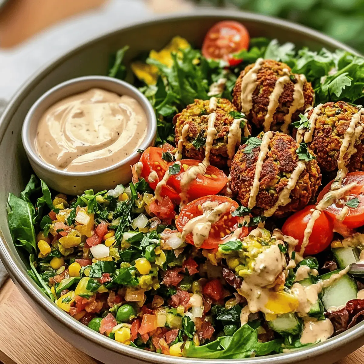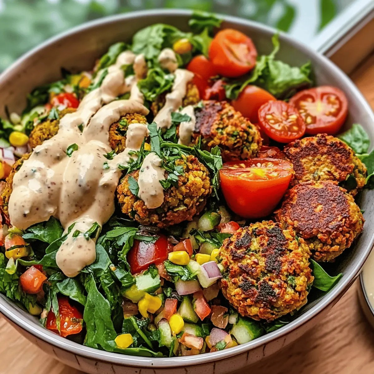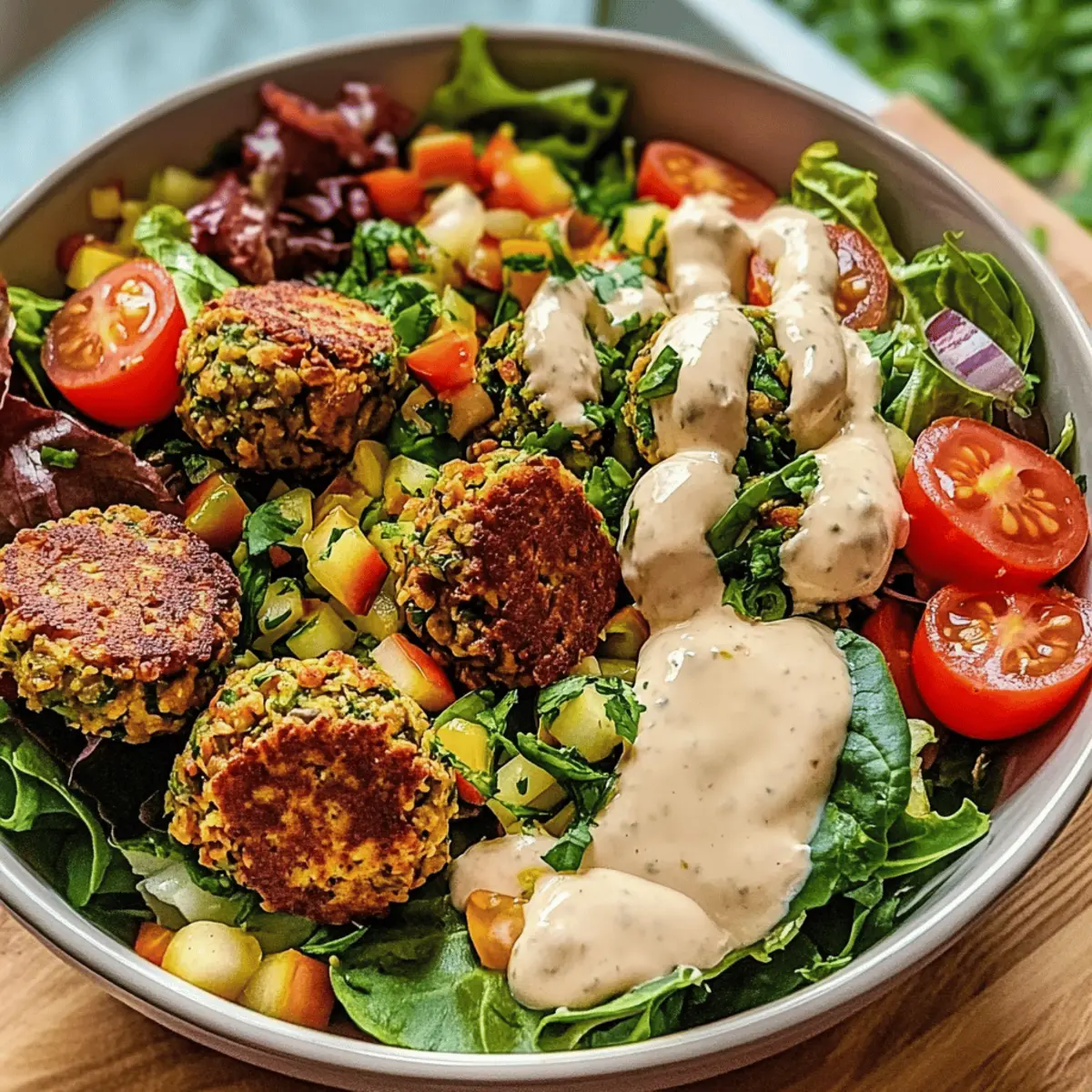 Once your baked falafels are ready, carefully place them atop the bed of mixed greens and cherry tomatoes. Drizzle a luscious tahini sauce generously over the top to enhance flavors and add creaminess. Serve immediately, allowing everyone to enjoy the vibrant colors and delicious taste of your Mediterranean Falafel Bowl!
