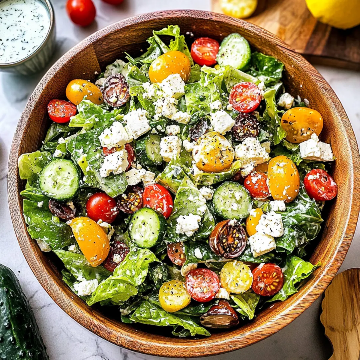 Preparing your Mediterranean Salad in advance is a fantastic way to save time during busy weeknights or gatherings! You can chop the vegetables—like romaine lettuce, cherry tomatoes, cucumber, red onion, and prepare Kalamata olives—up to 24 hours ahead of time. Just store them in airtight containers in the refrigerator to maintain their freshness and crunch. The creamy dressing can be made up to one week in advance; simply mix and refrigerate it—this allows the flavors to meld beautifully. When you’re ready to serve, simply combine the salad components, drizzle with the dressing, and add croutons just before serving to keep everything crisp. Enjoy a quick, flavorful meal with minimal stress!
