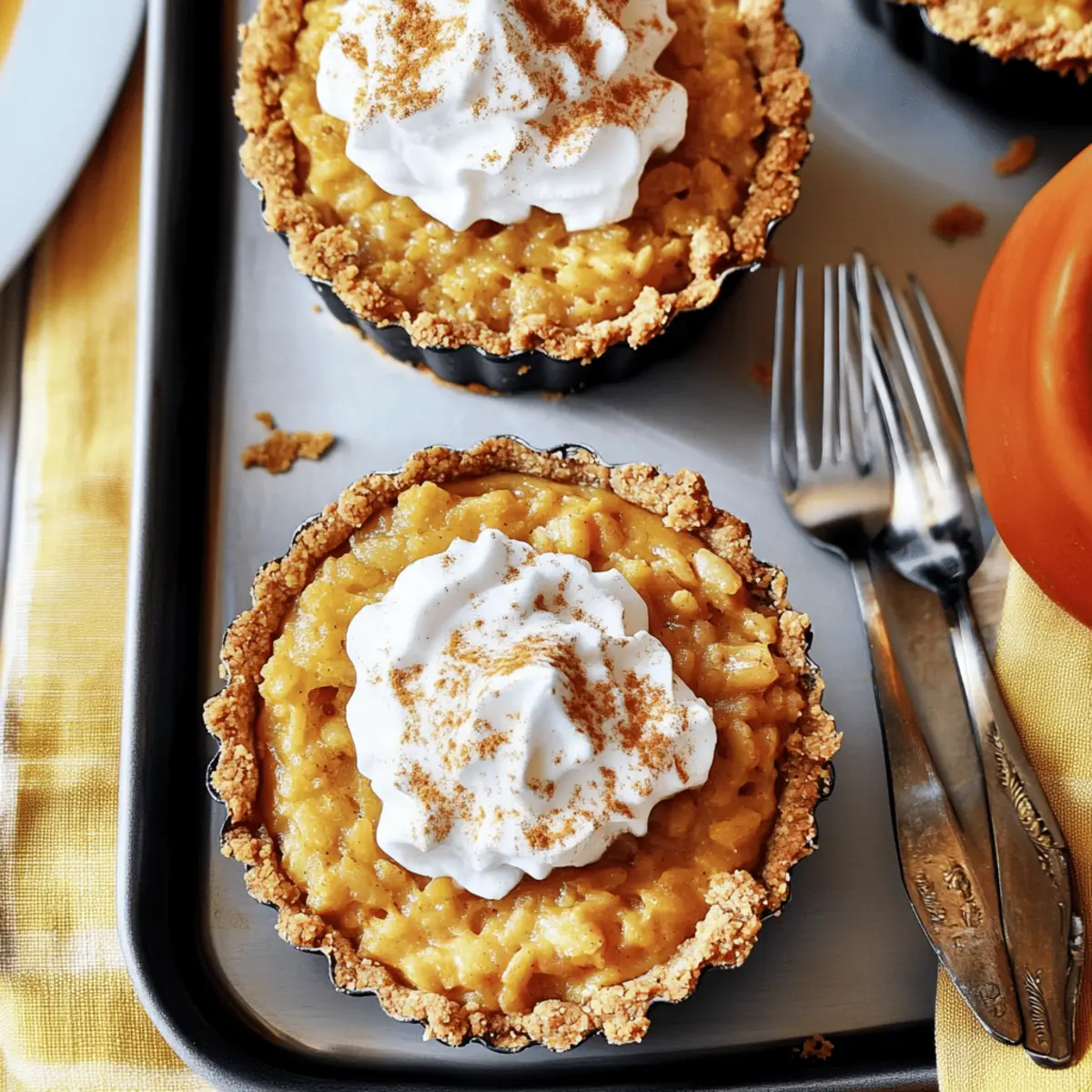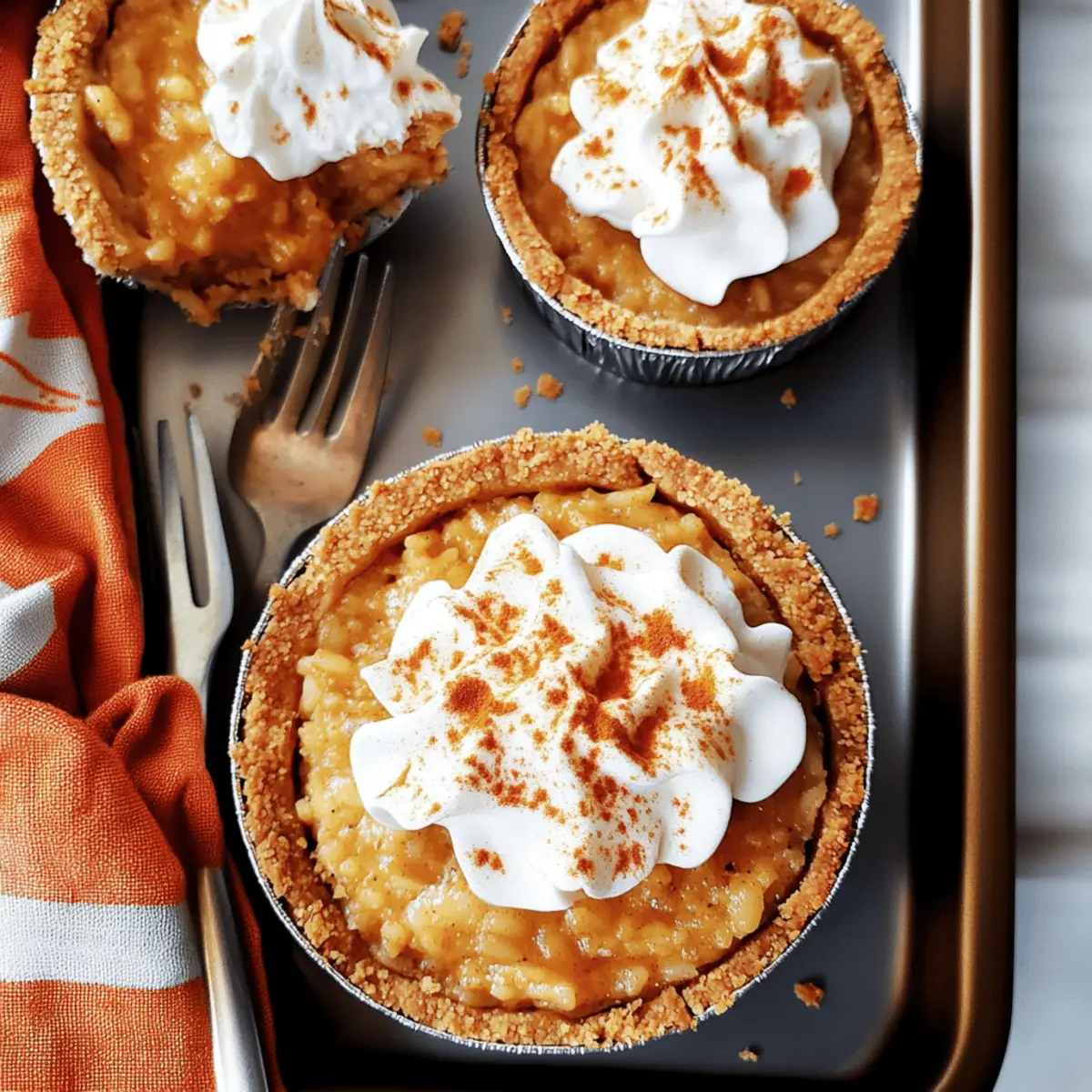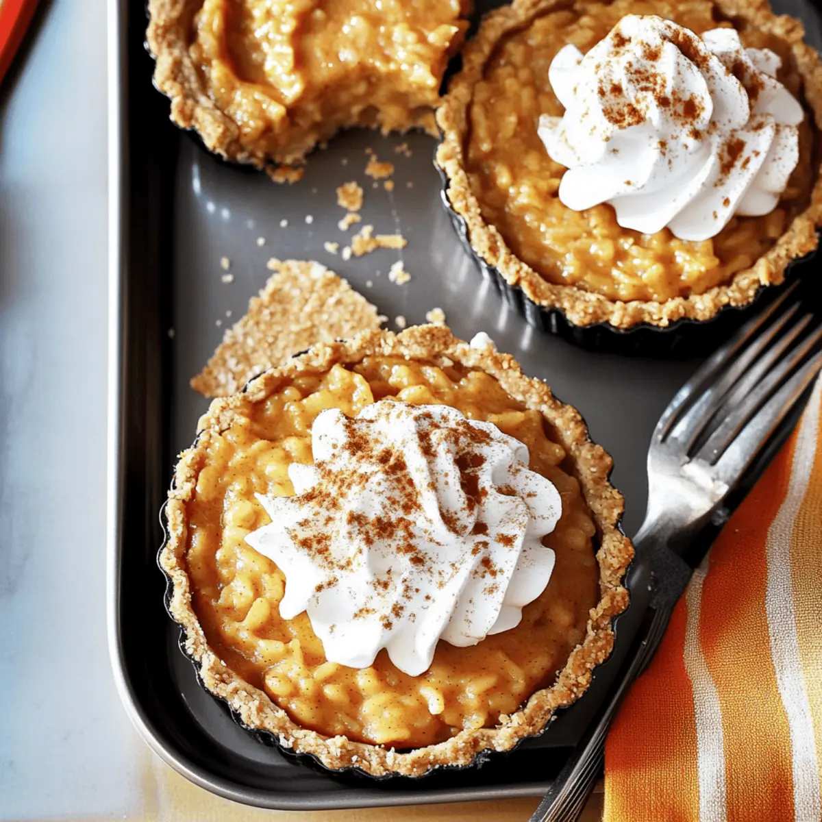 Jump to Recipe Print RecipeThe moment the first scent of cinnamon and pumpkin hits the air, I’m transported to those crisp fall afternoons filled with laughter and good company. Today, I’m thrilled to share my recipe for Mini Arroz Con Leche Pumpkin Pies—an irresistible mash-up that beautifully blends the comforting essence of traditional pumpkin pie with the creamy delight of arroz con leche. These charming mini pies not only bring a unique twist to classic desserts but are also a quick and easy solution for your autumn gatherings, ensuring you spend less time in the kitchen and more time enjoying special moments with loved ones. So, ready to impress your guests with these delightful treats? Let’s dive in! Why You’ll Love Mini Arroz Con Leche Pumpkin Pies Irresistible Combination: These delightful mini pies merge the beloved flavors of pumpkin pie and creamy arroz con leche, creating a unique dessert that is sure to impress. Easy to Prepare: With simple steps and minimal fuss, making these treats will quickly become a favorite in your autumn baking repertoire. Crowd-Pleaser: Whether it’s for a family gathering or a cozy get-together, the warm spiced filling and buttery crust will keep everyone coming back for more! Adaptable Enjoyment: Feel free to experiment with variations like using coconut milk for a tropical twist, reminiscent of flavors from other cherished dishes like Pumpkin Cream Cheese or Peanut Butter Pies. Elegant Presentation: The mini format not only looks adorable but also makes portion control a breeze. Serve them chilled and topped with whipped cream for a seasonal treat that looks as fabulous as it tastes! Mini Arroz Con Leche Pumpkin Pies Ingredients • The perfect blend awaits! For the Crust Graham Cracker Crumbs – Provides a sweet and crunchy crust; substitute with crushed cookies or gluten-free graham crackers for a gluten-free option. Granulated Sugar – Adds sweetness to the crust; could substitute with brown sugar for a deeper flavor. Salt – Enhances flavor; no substitutions needed. Unsalted Butter (melted) – Binds the crust ingredients; can use coconut oil for a dairy-free version. For the Filling Arborio Rice – Gives a creamy texture to the rice pudding filling; other rice types (like jasmine) may not work as well. Water – Used to cook the rice. Cinnamon Sticks – Infuses warming spice into the rice; ground cinnamon could be a substitute, but flavor varies slightly. Whole Milk – Creates a creamy base; alternatives include almond milk or oat milk for a dairy-free option. Canned Pumpkin Purée – Provides flavor and color; fresh pumpkin purée could also be used. Light Brown Sugar – Adds sweetness and a hint of molasses flavor; white sugar may substitute if necessary. Ground Cinnamon – Enhances flavor; no substitutions needed. Pumpkin Pie Spice – Blends spices for warming flavor; a mix of cinnamon, nutmeg, and ginger could replace it. Salt – Balances sweetness; no substitutions needed. Eggs (beaten) – Adds richness and structure; vegetable substitutes like flaxseed might work but can alter texture. Unsalted Butter – Enriches the filling; margarine could be a substitute. Vanilla Extract – Adds depth of flavor; alcohol-free vanilla can be used instead. For the Topping Heavy Cream – For the topping, contributes to a luscious texture; dairy-free cream options are available for a substitute. Powdered Sugar – Sweetens the topping; granulated sugar can be used, but it may not dissolve as smoothly. Ground Cinnamon (for garnish) – Adds a final touch of flavor and decoration to the mini arroz con leche pumpkin pies. Step‑by‑Step Instructions for Mini Arroz Con Leche Pumpkin Pies Step 1: Preheat the Oven Begin by preheating your oven to 350°F (175°C). While the oven warms up, grab your tart pans and lightly grease them with cooking spray. This ensures that your Mini Arroz Con Leche Pumpkin Pies will release easily once baked, providing a delightful, hassle-free treat for your autumn gatherings. Step 2: Prepare the Crust In a mixing bowl, combine the graham cracker crumbs, granulated sugar, and salt. Pour in the melted unsalted butter and mix until well combined. Press this mixture firmly into the bottom and up the sides of your prepared tart pans. Bake for 8-10 minutes, or until the crust turns a lovely golden brown, allowing that buttery aroma to fill your kitchen. Step 3: Cook the Rice In a medium saucepan, combine water, a pinch of salt, and the cinnamon sticks. Bring this mixture to a boil, then add the arborio rice. Cover and reduce the heat to low, letting it simmer for about 20 minutes or until the rice is tender and has absorbed most of the water. Remove the cinnamon sticks once the rice is done to infuse a subtle cinnamon flavor. Step 4: Make the Filling In another pot, mix together the whole milk, pumpkin purée, light brown sugar, ground cinnamon, pumpkin pie spice, and a dash of salt. Add the cooked rice (minus the cinnamon sticks) and stir well. Cook this mixture over medium heat for about 15-20 minutes, stirring occasionally until it thickens to a creamy, luscious consistency, perfect for filling your pies. Step 5: Add Eggs and Butter Once your filling has thickened, remove it from the heat and stir in the remaining milk and beaten eggs. Keep stirring constantly for an additional 4 minutes as it cooks gently, ensuring the eggs combine beautifully without scrambling. Lastly, stir in the unsalted butter and vanilla extract, enriching the filling with a deeper flavor, just right for your Mini Arroz Con Leche Pumpkin Pies. Step 6: Fill the Tart Crusts Carefully distribute the creamy pumpkin filling evenly among the baked tart crusts. Smooth the tops with a spatula for a polished look. Once filled, cover the tart pans with plastic wrap or foil and place them in the refrigerator. Allow them to chill for at least 3-4 hours, or overnight if time permits, which is key for achieving the perfect texture. Step 7: Prep