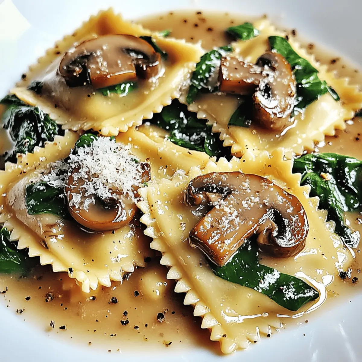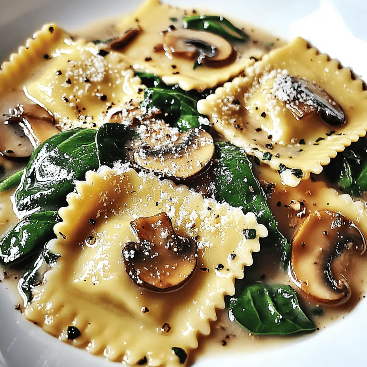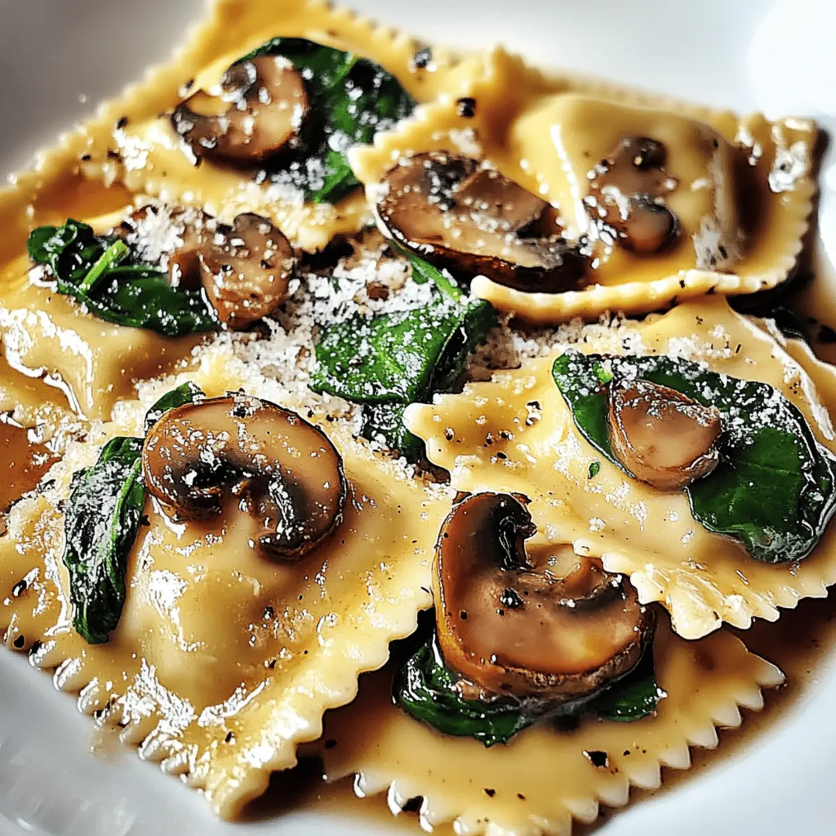 Jump to Recipe Print RecipeAs the scent of sautéed garlic danced through my kitchen, I felt an exciting blend of nostalgia and anticipation. There’s something utterly enchanting about making homemade Mushroom Ravioli with Spinach – a dish that elevates a simple weeknight dinner into an elegant culinary escape. Packed with earthy mushroom flavors and the bright, fresh touch of spinach, this recipe not only offers comfort food at its finest but also impresses guests for special occasions with minimal effort. Plus, it’s versatile enough to cater to any palate; whether you’re serving it with a light salad or pairing it with quality wine, it’s sure to leave everyone craving more. Are you ready to dive into a plate full of delightful flavors? Why is Mushroom Ravioli so special? Comforting Flavors: The blend of sautéed mushrooms and vibrant spinach creates a delightful taste that wraps you in warmth with every bite. Impressive Presentation: This dish looks as elegant as it tastes, making it perfect for dinner parties or cozy nights in. Quick and Easy: With just a few simple steps, you can have a gourmet meal ready in no time! Versatile Options: Feel free to mix in your favorite proteins or veggies for a personalized touch. From Honey Pepper Chicken to Salmon Shrimp Garlic, the combinations are endless! Healthy Indulgence: Packed with nutrients while still being rich in flavor, this dish is a wholesome choice for any occasion. Get ready to impress yourself and your loved ones! Mushroom Ravioli with Spinach Ingredients • Dive into deliciousness with these essential ingredients for Mushroom Ravioli with Spinach! For the Ravioli Ravioli – Use store-bought for convenience or homemade for a unique touch. For the Filling Mushrooms – Opt for varieties like cremini or shiitake to enhance the earthy flavor. Spinach – Fresh spinach shines here, but frozen can work—just ensure it’s well-drained. Garlic – Freshly minced garlic infuses the dish with its irresistible aroma and depth. For Cooking Olive Oil – This healthy fat is perfect for sautéing, but feel free to swap it with butter for a richer taste. Salt & Black Pepper – Essential seasonings that elevate every flavor in the dish. For the Finishing Touch Parmesan Cheese – Adds a creamy, savory note; pecorino can be a delightful substitute for a sharper taste. Step‑by‑Step Instructions for Mushroom Ravioli with Spinach Step 1: Prepare the Filling In a large skillet, heat 2 tablespoons of olive oil over medium heat. Add 2 cloves of minced garlic and sauté until fragrant, about 1 minute. Next, incorporate 8 ounces of chopped mushrooms and cook for 5–7 minutes, stirring occasionally, until they soften and begin to brown. Finally, stir in 4 cups of fresh spinach and cook until wilted, approximately 2 minutes. Step 2: Cook the Ravioli While preparing the filling, bring a large pot of salted water to a rolling boil. Carefully add the ravioli, ensuring they have plenty of space to float freely. Cook for about 3–4 minutes or until they rise to the surface, which indicates they are done. Gently drain the ravioli and set aside, reserving a small amount of the pasta water for later. Step 3: Combine Ingredients In the skillet with the sautéed mushroom and spinach mixture, lower the heat to medium-low. Add the cooked ravioli to the skillet, gently folding them into the mixture without breaking them. If the mixture seems dry, add a splash of the reserved pasta water to achieve a silky texture. Stir to combine all the flavors, allowing the ravioli to warm through for about 1-2 minutes. Step 4: Finish the Dish Once everything is combined and warmed, sprinkle freshly grated Parmesan cheese over the ravioli and sautéed vegetables. Season the dish with salt and freshly cracked black pepper to taste. Allow the cheese to melt slightly, then remove the skillet from heat. Serve the Mushroom Ravioli with Spinach hot, garnished with additional Parmesan if desired. What to Serve with Mushroom Ravioli with Spinach When planning a meal around this delightful dish, consider these perfectly paired accompaniments that enhance the flavors. Garlic Bread: This crispy, buttery delight adds a rich, savory crunch that perfectly balances the creamy ravioli. It’s a classic side that never disappoints! Charred Asparagus: The smoky flavor of grilled asparagus introduces a fresh, vibrant brightness that contrasts beautifully with the earthy notes of the mushrooms. Arugula Salad: A peppery arugula salad with a lemon vinaigrette offers a light, refreshing bite that cuts through the richness of the ravioli, making it feel less heavy. Creamy Polenta: This comforting side adds a creamy texture that complements the tender ravioli, creating a luxurious dining experience that transforms your table. Pine Nut Crustini: Toasted bread topped with a sprinkle of pine nuts and spreadable cheese brings in a rustic element and a satisfying crunch, perfect for nibbling before the main event. Pair with a delightful Pinot Grigio: This crisp white wine enhances the flavors of the dish while providing a refreshing sip to cleanse your palate between bites. Chocolate Mousse: End your meal on a sweet note with a rich chocolate mousse, combining indulgence with a light and airy texture that contrasts with the hearty ravioli. Mushroom Ravioli with Spinach: Customization Ideas Feel free to play with ingredients and flavors to make this Mushroom Ravioli with Spinach truly your own! Vegetable Swap: Replace mushrooms with butternut squash for a sweet, autumn-inspired twist. It adds a creamy texture that balances beautifully with the spinach. Protein Boost: Add grilled chicken or sautéed shrimp for a protein-packed version that turns this dish into a heartier meal. It’s a lovely way to elevate the comfort factor! Dairy-Free: Use nutritional yeast instead of Parmesan for a cheesy flavor without dairy. This gives you a vegan-friendly option that doesn’t skimp on taste. Herbaceous 