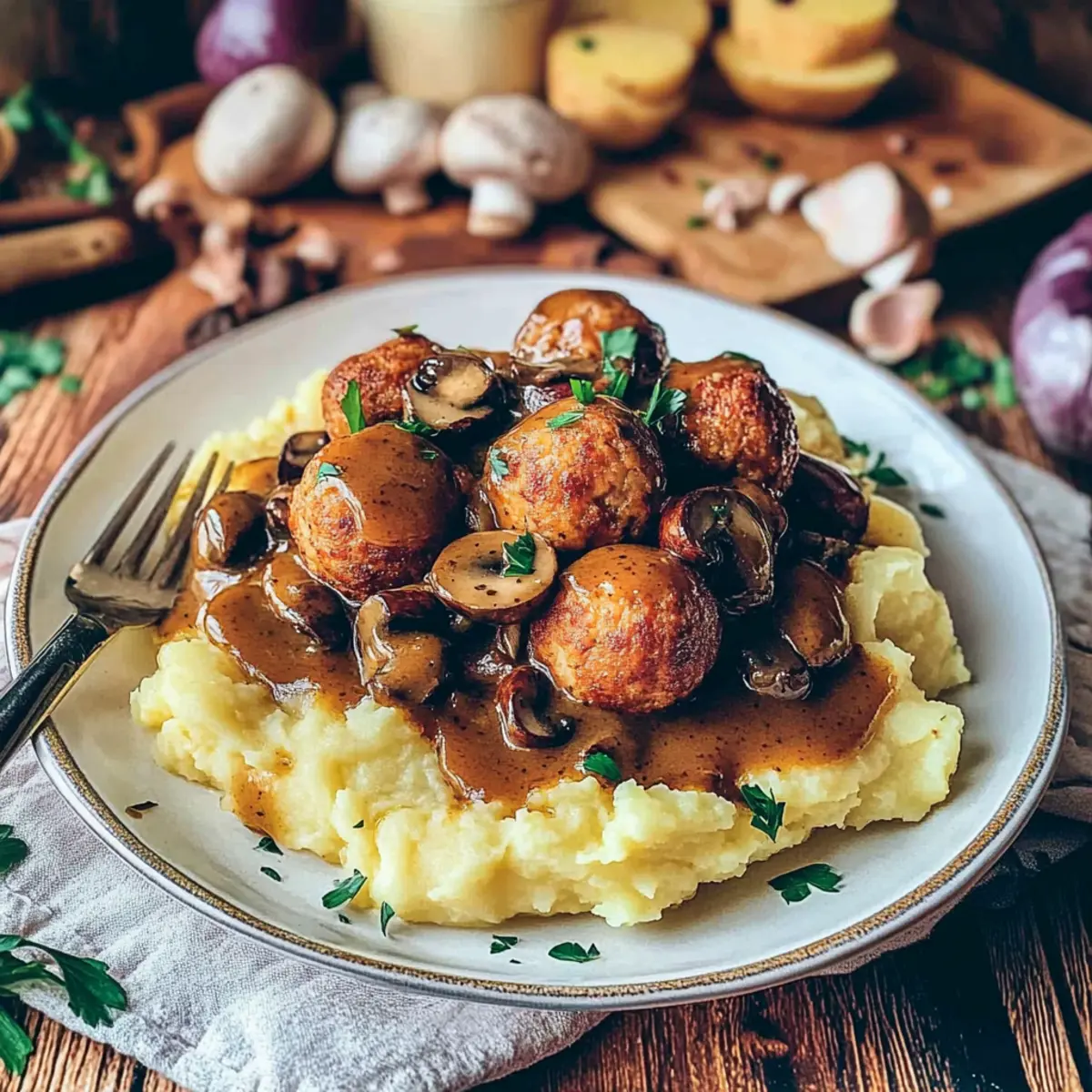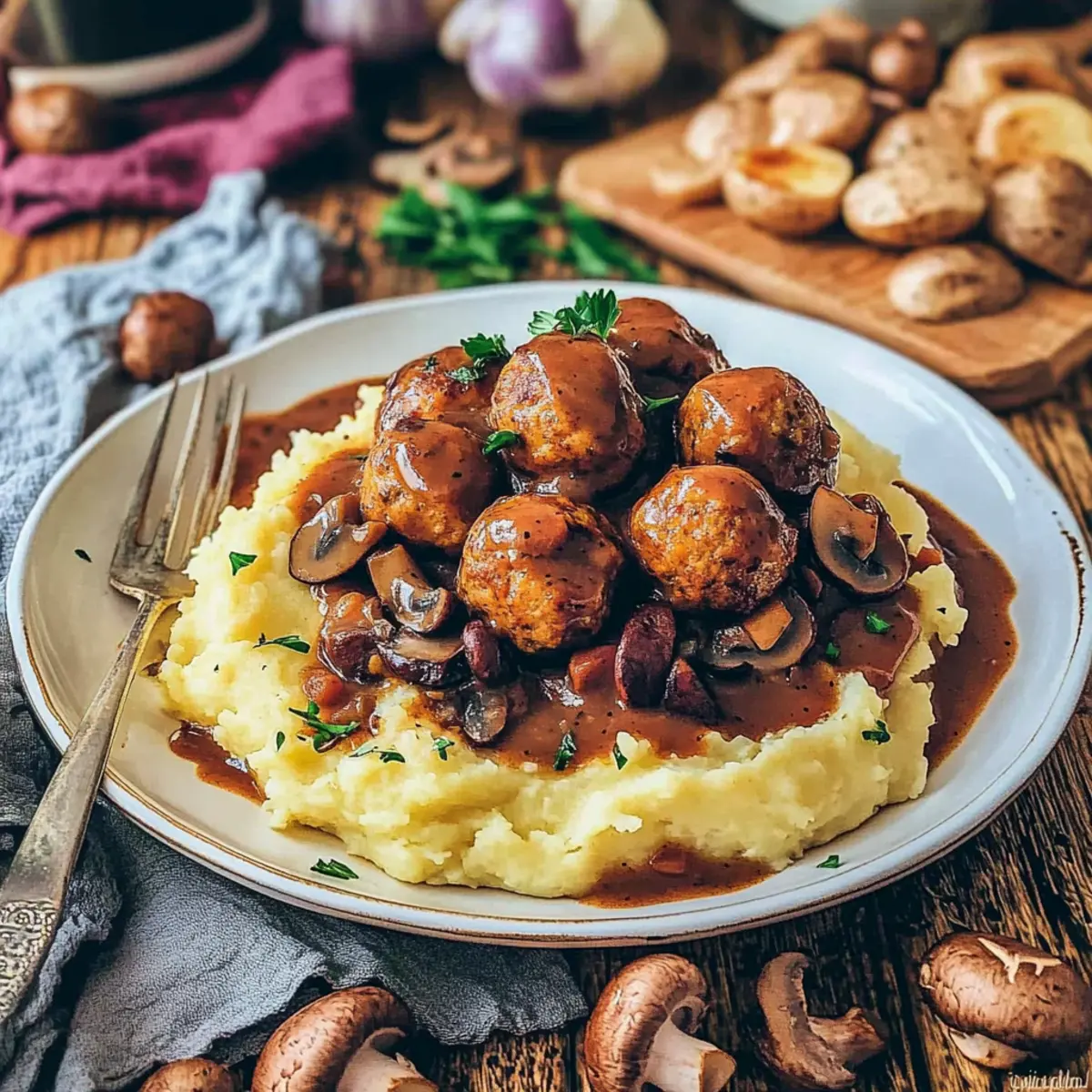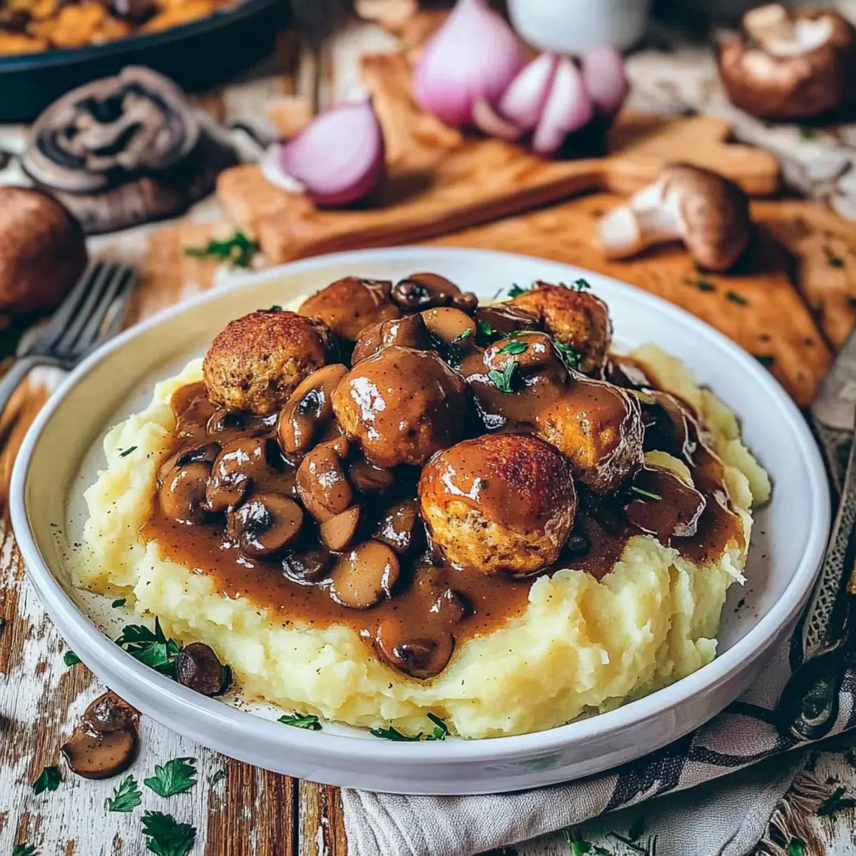 Jump to Recipe Print Recipe“Can we make meatballs without meat?” I overheard my friend excitedly ask while prepping for Thanksgiving. It’s a question that ignites curiosity and opens the door to a world of flavors. Enter my Vegan No-Meat Balls with Mushroom Gravy & Mashed Potatoes—a satisfying blend of earthy chickpeas and savory mushrooms that will charm both plant-based enthusiasts and meat lovers alike. You’ll appreciate this quick and easy recipe as it not only packs a nutritious punch but also transforms those holiday meals into delightful comfort food suitable for everyone at the table. Imagine serving a dish that’s both hearty and guilt-free, a true crowd-pleaser that’s effortlessly elegant for any occasion. Ready to wow your guests with this plant-based delight? Let’s dive into the details! Can meatless meatballs taste amazing? Delicious, these Vegan No-Meat Balls are bursting with rich flavors that even non-vegans will rave about! Quick and easy, prepare this meal in under an hour, perfect for weeknight dinners or festive gatherings like Thanksgiving. Versatile, swap out chickpeas for your favorite beans or customize the gravy with herbs to suit your palate. Hearty texture, enjoy the satisfying bite that mimics traditional meatballs, making it a perfect companion for creamy mashed potatoes. Crowd-pleaser, impress guests with a dish that embodies comfort and nutrition, proving that plant-based meals can be both indulgent and healthy! Pair these with a vibrant side salad or some steamed vegetables for a complete meal that’s sure to be a hit! No-Meat Balls with Vegan Gravy Ingredients Discover the delightful ingredients that make up these irresistible No-Meat Balls with Vegan Gravy & Mashed Potatoes! For the No-Meat Balls Chickpeas – Your main protein source and binder; substitute with kidney beans, black beans, or white beans for flavor variety. Panko Breadcrumbs – Essential for structure and texture; opt for gluten-free breadcrumbs to meet dietary needs. Flaxseed Egg – An optional binding agent to enhance texture; can be omitted if desired. Oil or Vegan Butter – Adds moisture for frying or baking; both options work wonderfully for a rich flavor. Onion – A key flavor component; swap for shallots if you prefer a milder touch. Garlic – Elevates the flavor profile; feel free to increase the amount for a bolder taste. Soy Sauce – Infuses umami goodness; use tamari to keep it gluten-free. Tomato Paste – Adds a hint of sweetness and depth; interchange with salsa for a different twist. Mustard – For a great tang; choose between Dijon or yellow mustard based on your preference. Salt and Pepper – Core seasonings that bring everything together; adjust according to taste. Potatoes – The foundation for your mashed potatoes; sweet potatoes can be a delightful alternative. Plant-Based Milk – Creates a creamy consistency in mashed potatoes; any variety works, like almond or oat. For the Gravy Mushrooms – The heart of the gravy that boosts flavor; feel free to swap with other vegetables like zucchini or bell peppers. Flour or Cornstarch – Serves as a thickening agent; use cornstarch for a gluten-free option. Vegetable Broth – The flavorful base for your gravy; homemade stock will elevate the richness. Coconut Milk – An optional ingredient for added creaminess; skip if coconut flavor isn’t for you. Thyme – An optional herb to enhance the gravy’s flavor; fresh or dried both work beautifully. With these wholesome ingredients, you’re on your way to creating a wonderful dish that will satisfy everyone at your table this holiday season or any day of the week! Step‑by‑Step Instructions for No-Meat Balls with Vegan Gravy & Mashed Potatoes Step 1: Preheat and Prepare Begin by preheating your oven to 400°F (180°C). While it warms up, prepare a flaxseed egg if using, allowing it to sit for about 5 minutes to thicken. This step is crucial for binding your Vegan No-Meat Balls, ensuring they hold their shape when baking. Step 2: Sauté the Aromatics In a skillet over medium heat, add a tablespoon of oil and sauté the chopped onions for 2-3 minutes until they are lightly browned and fragrant. The onions should become translucent and golden, helping to lay a flavorful foundation for the no-meat balls. Add minced garlic at this point, cooking for an additional minute. Step 3: Blend the Mixture Transfer the sautéed onions, drained chickpeas, and panko breadcrumbs into a food processor. Along with them, toss in your seasonings and the flaxseed egg, if using. Blend the mixture until combined, which should take around 30 seconds. You want a thick, textured consistency that holds together well for shaping into balls. Step 4: Form the No-Meat Balls Using wet hands to avoid sticking, scoop out portions of the mixture and roll them into balls, about the size of golf balls. You should aim for around 15 balls in total. Place these formed no-meat balls on a baking sheet lined with parchment paper, brushing them lightly with oil for a golden finish during baking. Step 5: Bake to Perfection Slide your baking sheet into the preheated oven and bake the no-meat balls for 20-30 minutes, turning them halfway through. They should emerge golden brown and firm on the outside while remaining tender inside. Keep an eye on them as they bake, ensuring they don’t overcook. Step 6: Prepare the Mashed Potatoes While the no-meat balls are baking, bring a pot of salted water to a boil. Add quartered potatoes and cook until fork-tender, which takes about 15-20 minutes. Once cooked, drain the potatoes, then mash them together with vegan butter and your choice of plant-based milk until smooth and creamy. Step 7: Sauté the Gravy Base In a separate skillet, heat a tablespoon of oil over medium heat, then add sliced mushrooms and the remaining onions. Sauté for about 5-7 minutes, until the mushrooms are caramelized and the onions are soft. Stir in minced garlic and cook for an ad
