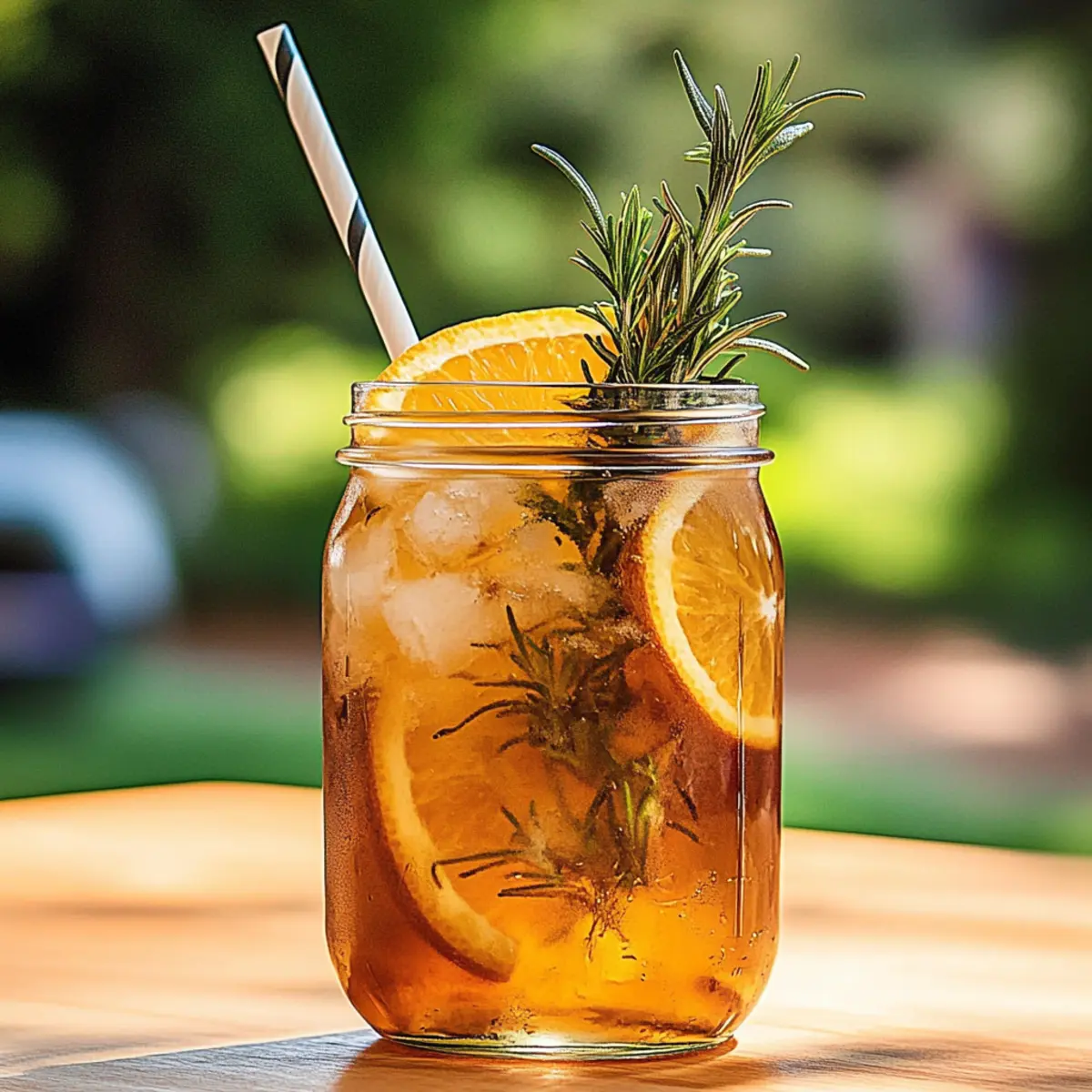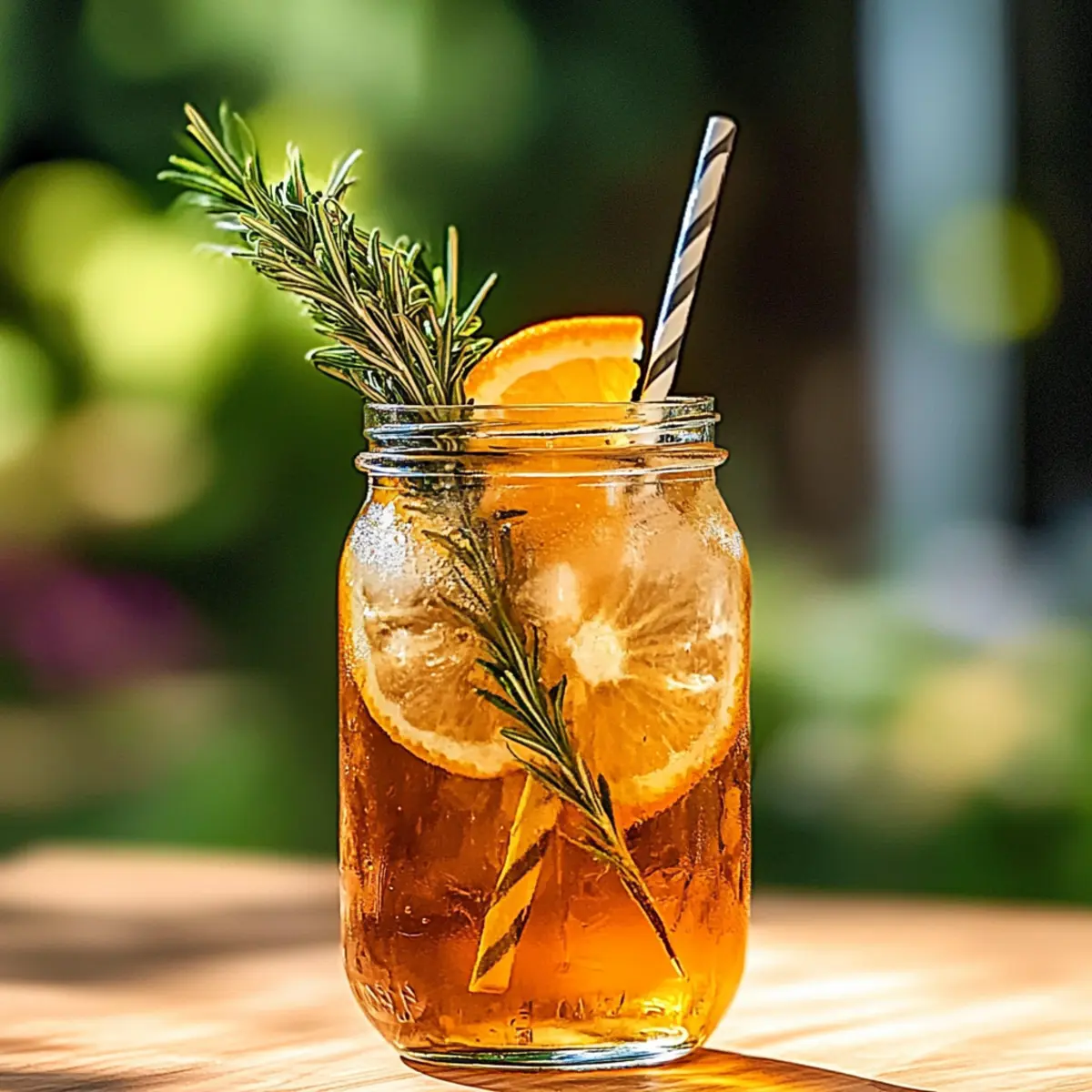 Jump to Recipe Print RecipeAs I sat on my porch, savoring the gentle rustle of summer leaves, the idea of a refreshing drink danced in my mind. My Orange Rosemary Iced Tea brings that vision to life with its perfect balance of citrus sweetness and herbal warmth. This delightful concoction not only quenches your thirst but also infuses your moments with a vibrant burst of flavor. The bright notes of freshly squeezed oranges mingle beautifully with earthy rosemary and a touch of ginger, elevating a simple iced tea into a sun-kissed experience. Beyond its refreshing taste, this drink is a breeze to prepare, allowing you to spend less time in the kitchen and more time enjoying the warmth of your backyard with friends and family. Curious how this blend can transform your summer afternoons? Let’s dive in! How can iced tea be so refreshing? Bursting with flavor, this Orange Rosemary Iced Tea takes your summer sip to a whole new level! Simple and quick, it requires minimal effort, letting you enjoy the sunny days with loved ones. Herbal notes of rosemary combined with citrusy orange create a drink that’s not only delicious but also visually stunning. Perfect for any occasion, serve it at backyard BBQs or leisurely brunches. For a delicious snack pairing, consider making some Brown Sugar Carrots for added sweetness! Orange Rosemary Iced Tea Ingredients • Dive into making a refreshing drink! For the Brew Water – Acts as the base for brewing tea, essential for releasing the vibrant flavors. Black Tea Bags – Provides robust flavor; opt for Assam or Ceylon for a bold experience. For the Flavor Fresh Orange – The star of this drink; both juice and zest are used for a sweet citrus touch. Fresh Rosemary – Infuses an earthy tone; look for bright green sprigs for maximum flavor. Fresh Ginger – Adds a spicy kick; slice thinly to release its fragrant essence. Sugar – Balances the drink; adjust to your taste, or substitute with honey for natural sweetness. To Serve Ice Cubes – Essential for chilling your drink; fill your glass generously! Optional Garnish – Add orange slices and rosemary sprigs for a beautiful, flavorful touch. Enjoy the refreshing taste of this Orange Rosemary Iced Tea as you unwind in the summer sun! Step‑by‑Step Instructions for Orange Rosemary Iced Tea Step 1: Boil the Water Begin by bringing 4 cups of water to a rolling boil in a medium-sized pot over high heat. Keep an eye on it, as you want it bubbling furiously. Once boiling, remove the pot from heat to prevent over-boiling while preparing the next steps. Step 2: Add the Ingredients Immediately add 3 black tea bags, 3 sprigs of fresh rosemary, the zest of 1 orange, and 5 thin slices of fresh ginger to the hot water. Stir gently, allowing the ingredients to infuse their flavors. This mix creates the base for your refreshing Orange Rosemary Iced Tea, packed with vibrant aromas. Step 3: Steep and Remove Tea Bags Let the mixture steep for about 5-7 minutes. The longer it steeps, the bolder the flavors will become. Once you achieve a rich amber color, carefully remove the tea bags to prevent bitterness, leaving the other ingredients to continue infusing beautifully. Step 4: Sweeten the Tea While the tea is still warm, add sugar to taste, stirring until fully dissolved. This step is crucial for balancing the bitterness of the tea and enhancing the vibrant flavors of the Orange Rosemary Iced Tea. Allow the tea to cool slightly for the next step. Step 5: Strain the Infusion Using a fine mesh strainer, pour the tea into a large pitcher, removing the rosemary sprigs, orange zest, and ginger slices. This leaves you with a smooth infusion brimming with flavor. Stir in the freshly squeezed juice of 2 oranges for an extra citrusy kick. Step 6: Chill the Tea Allow the tea to reach room temperature before placing it in the refrigerator. This cooling process can take about 15-20 minutes to intensify the flavors. Chill until fully cold, ideally for at least 1-2 hours, providing a refreshing drink for those warm summer days. Step 7: Serve with Style To serve your delightful Orange Rosemary Iced Tea, fill glasses with ice cubes and pour the chilled tea over the top. For an added touch, garnish each glass with fresh orange slices and a sprig of rosemary, creating a visually stunning and flavorful presentation that is sure to impress. Make Ahead Options These refreshing Orange Rosemary Iced Tea preparations are perfect for busy home cooks looking to save time! You can brew the tea mixture (excluding the orange juice) up to 24 hours in advance; simply follow the steeping instructions and let it cool before refrigerating. The infusion will develop even richer flavors overnight, enhancing your iced tea experience. When you’re ready to serve, strain and stir in the freshly squeezed orange juice before pouring over ice. To maintain its vibrant taste, be sure to refrigerate the brewed tea in an airtight container. With these make-ahead tips, you can enjoy a delicious, refreshing drink whenever the summer sun shines! Orange Rosemary Iced Tea Variations Feel free to get creative and tailor this delicious drink to your taste! Caffeine-Free: Substitute black tea with green tea or herbal tea for a delightful caffeine-free refreshment. Try a blend of chamomile and mint for a calming twist that’s perfect for evenings. Minty Fresh: Swap rosemary for fresh mint leaves to create a refreshing Mint Orange Iced Tea. This variation offers an invigorating taste that pairs remarkably well with summer salads. Spicy Kick: Add a pinch of cayenne pepper or sliced jalapeño for a spicy version that wakes up your senses! Just a little can transform your iced tea into a uniquely flavorful thrill. Sweet Alternatives: Replace granulated sugar with honey or agave syrup for a more natural sweetness. This not only complements the orange beautiful but also adds an elegant touch to your drink. Herb Duet: Experiment with other herbs like basil or thyme alongside