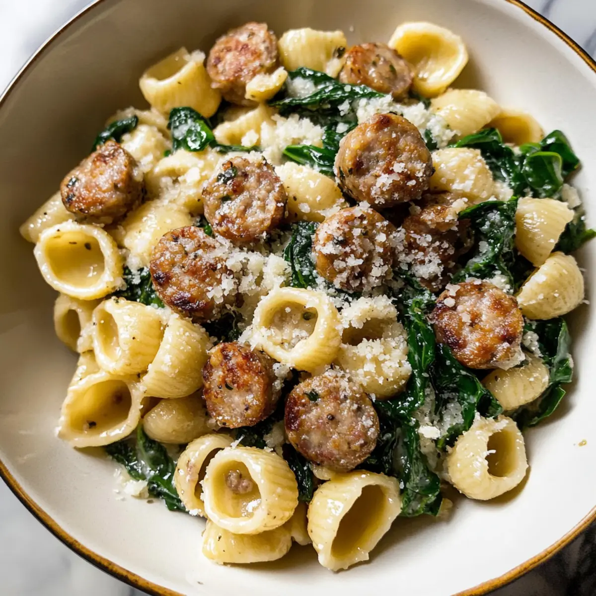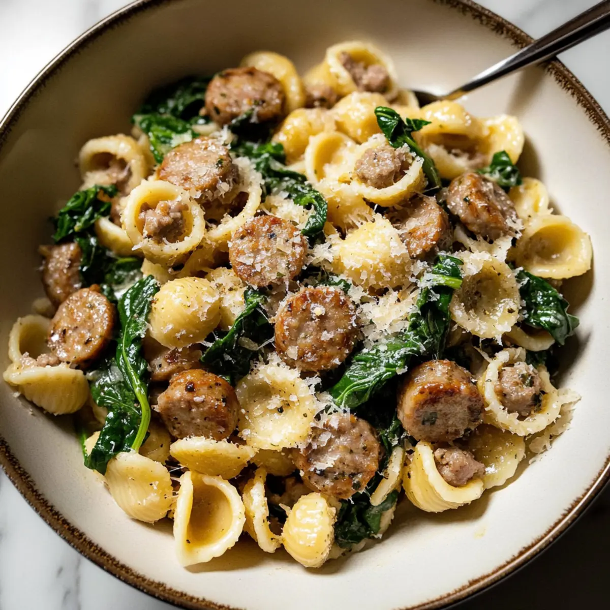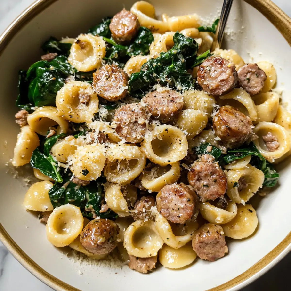 Jump to Recipe Print RecipeIn the hustle and bustle of everyday life, cooking a delightful meal can sometimes feel like a race against time. That’s why I’m excited to share my Orecchiette with Sausage and Spinach recipe with you! It’s a quick and easy dish that comes together in just 30 minutes, making it perfect for those busy weeknights when you still want to enjoy a comforting, homemade dinner. The heartiness of savory sausage paired with fresh spinach and a splash of white wine creates a satisfying meal that feels indulgent yet effortless. Trust me, your taste buds will dance with joy at the first bite! Are you ready to whip up this Italian joy in your kitchen? What makes this dish a must-try? Quick and Easy: In just 30 minutes, you can create a delightful Italian meal that delights the senses. Flavorful Comfort: The rich taste of savory sausage, fresh spinach, and a hint of white wine will have everyone at the table excited for dinner. Versatile Ingredients: Swap in ground turkey for a lighter version, or add your favorite vegetables like bell peppers for an extra boost. Fancy Yet Simple: Serve this dish with garlic bread or a light salad, and you have a gourmet experience that could easily come from a restaurant! Crowd-Pleasing Dinner: Perfect for family meals or dinner parties, this recipe ensures smiles all around without keeping you in the kitchen for hours. Try pairing it with **Spicy Honey Pepper chicken or finish the night with a simple *Tater Tot Sausage* breakfast casserole for the weekend! Orecchiette with Sausage and Spinach Ingredients For the Pasta Base • Orecchiette Pasta – The star of the dish; feel free to swap with any short pasta like fusilli or penne. For the Sausage Mix • Italian Sausage – This provides hearty flavor; ground turkey sausage can be used for a lighter option. • Onion – Adds sweetness and depth; yellow or white onions work best, but shallots are a good alternative. • Garlic – Enhances the aroma; adjust the amount based on your taste preference. For the Sauce • Dijon Mustard – Adds tanginess to the sauce; yellow mustard can be used in a pinch. • Dry White Wine – Essential for depth; chicken broth works as a non-alcoholic substitute. For the Greens • Fresh Spinach – Offers vibrant color and freshness; can be substituted with Swiss chard or kale. • Fresh Basil – Optional for an aromatic flavor boost; dried basil can stand in if needed. Seasoning • Salt & Pepper – Essential seasonings to bring the dish to life; adjust to your taste. For Garnishing • Freshly Grated Parmesan Cheese – Adds richness; feel free to use Pecorino Romano if preferred. This Orecchiette with Sausage and Spinach dish is not just a quick meal; it embodies the essence of comforting Italian cuisine in every bite! Step‑by‑Step Instructions for Orecchiette with Sausage and Spinach Step 1: Boil the Pasta Begin by bringing a large pot of salted water to a rolling boil over high heat. Add the orecchiette pasta and cook according to package instructions, usually about 10–12 minutes, until it reaches an al dente texture. Stir occasionally to prevent sticking, and keep an eye on it, as you’ll want the pasta to hold its shape beautifully when added to the sauce. Step 2: Brown the Sausage and Onions While the pasta cooks, heat a large skillet over medium-high heat. Add the Italian sausage and chopped onion to the pan, using a wooden spoon to break up the sausage into smaller pieces. Cook for 8–10 minutes, stirring frequently until the sausage is browned and fully cooked, with the onions softened and translucent. Drain any excess fat to keep your dish from becoming greasy. Step 3: Sauté Garlic and Add Mustard Reduce the heat to medium and add the minced garlic and Dijon mustard to the skillet. Stir them in well, cooking for about 30 seconds, until the garlic is fragrant and starts to turn golden. This step is crucial for enhancing the flavor of your Orecchiette with Sausage and Spinach, as it brings a warm aroma that fills your kitchen with enticing scents. Step 4: Simmer with White Wine Pour in the dry white wine, allowing it to deglaze the pan and mix with the sausage and onion. Let it simmer for 1–2 minutes, stirring occasionally, until the wine has reduced by half. You’ll know it’s ready when a lovely aroma wafts through the air and the mixture looks slightly thickened. This reduction will enrich the sauce, making every bite of your dish taste divine. Step 5: Add Spinach and Basil Next, incorporate the fresh spinach and, if you have it, the basil into the skillet. Toss them together gently for about 2–3 minutes until the spinach wilts beautifully and adds vibrant color to the dish. The greens will cook down, becoming tender and infusing the sauce with their fresh flavor, taking your Orecchiette with Sausage and Spinach to new heights. Step 6: Combine Pasta and Sauce Once the pasta is ready, drain it well and add it to the skillet with the sausage and spinach mixture. Toss everything together thoroughly to ensure that the pasta is evenly coated in the flavorful sauce. Season with salt and pepper to your liking, balancing the flavors carefully. Your Orecchiette with Sausage and Spinach is almost ready to be served! Step 7: Serve and Garnish Finally, plate the Orecchiette with Sausage and Spinach while it’s hot. Optionally, sprinkle freshly grated Parmesan cheese on top for a delightful creamy finish. If you prefer, you can also use Pecorino Romano for a different flavor twist. Serve immediately and enjoy the comforting goodness of this quick Italian meal, perfect for sharing with loved ones. How to Store and Freeze Orecchiette with Sausage and Spinach Fridge: Store leftovers in an airtight container for up to 3 days. Make sure to let it cool completely before sealing to prevent condensation. Freezer: For longer storage, freeze in a freezer-safe container for up to 2 months. Portion out servings to make thawing easier later. Rehe