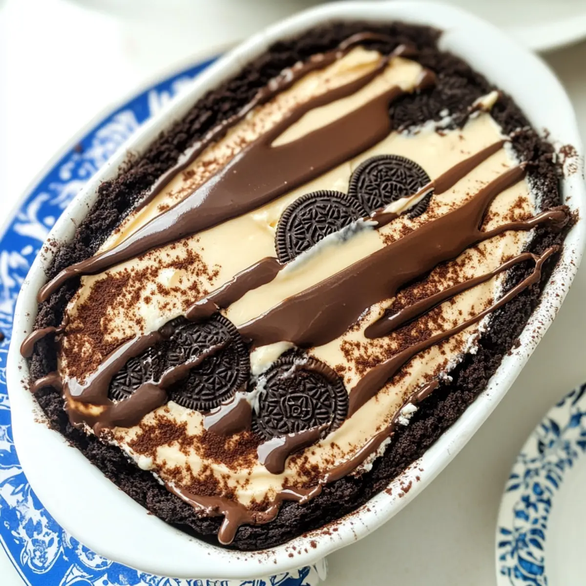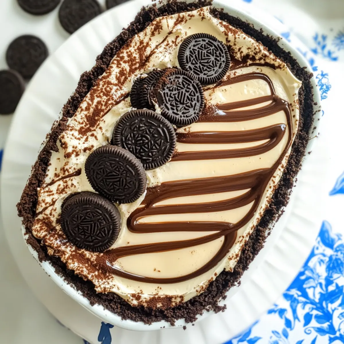Jump to Recipe Print RecipeAt a recent gathering, I overheard someone say, “This dessert is a revelation!” Little did they know, that revelation was my effortless Oreo Tiramisu. This no-bake marvel puts a delightful twist on the classic Italian favorite, blending luscious layers of creamy mascarpone with coffee-soaked Oreo cookies for a sweet symphony that’s hard to resist. Perfect for busy chefs, it takes minimal prep time while still stealing the spotlight at any dessert table. Plus, it’s an indulgent treat that satisfies both cookie lovers and dessert aficionados alike. Curious about how to whip up this crowd-pleaser that’s as simple as it is stunning? Let’s dive into the world of Oreo Tiramisu! Why is Oreo Tiramisu a Must-Try? Indulgent Flavor: Every bite of this Oreo Tiramisu blends the classic flavors of tiramisu with the delightful crunch of Oreos, creating a uniquely satisfying dessert. No-Bake Ease: Skip the fuss of baking! This recipe calls for simple assembly, perfect for busy home cooks. Versatile Delight: Whether it’s a casual get-together or an elegant dinner party, this dessert will charm your guests—pair it with a robust coffee for an elevated experience. Crowd-Pleasing Appeal: With its familiar flavors, even the pickiest eaters will be asking for seconds. For more cookie-inspired treats, don’t miss our delicious Cookies Cream Oreo and Oreo Cake Pops. Oreo Tiramisu Ingredients For the Filling Oreo cookies – A key ingredient, providing the base layer and indulgent flavor. Can substitute with traditional ladyfingers for a classic tiramisu. Heavy cream – Adds richness and lightness. Ensure it’s cold for optimal whipping. Granulated sugar – Sweetens the dessert beautifully. Can be reduced for a less sweet result. Vanilla extract – Enhances the flavor depth. For the best taste, use pure vanilla extract. Mascarpone cheese – The primary filling component, offering rich creaminess. Cream cheese can be substituted, but flavors will vary slightly. For Soaking Brewed coffee – Soaks the Oreos, imparting a delightful coffee flavor. Espresso can be used for a stronger coffee kick. For the Ganache Dark chocolate – Creates a luxurious ganache topping. Substitute milk chocolate for a sweeter flavor. Heavy cream – Used with dark chocolate to make a smooth ganache. Ensure both are heated carefully to avoid burning. For Decoration White chocolate – Drizzled on top for a beautiful finish. Can be replaced with melted chocolate chips if desired. Oil – Helps achieve a smooth texture when mixing with white chocolate. Vegetable or canola oil works well. Dive into making your Oreo Tiramisu, where every layer tells a delicious story! Step‑by‑Step Instructions for Oreo Tiramisu Step 1: Whip the Cream In a large mixing bowl, combine 1 cup of heavy cream and 1/2 cup of granulated sugar. Using an electric mixer, beat on medium-high until stiff peaks form, approximately 3-5 minutes. The cream should be thick enough to hold its shape. Once ready, set this luscious whipped cream aside. Step 2: Mix the Filling In another bowl, blend 1 cup of mascarpone cheese and 1 teaspoon of vanilla extract until smooth and creamy, about 1-2 minutes. This will create a rich base for your filling. Afterward, gently fold in the whipped cream in thirds, ensuring you maintain its airy texture while combining the ingredients thoroughly for a delightful Oreo Tiramisu flavor. Step 3: Add Crushed Oreos If desired, fold in 1 cup of crushed Oreo cookies into the mascarpone mixture to enhance the cookie flavor. Gently blend using a spatula, ensuring the cookie crumbs are evenly distributed throughout the filling without deflating the whipped cream. This step adds an extra crunchy texture and an indulgent twist to your Oreo Tiramisu. Step 4: Prepare Coffee for Dipping Brew a strong cup of coffee or espresso (about 1-1.5 cups) and let it cool to room temperature. Pour the coffee into a shallow dish that can fit the cookies comfortably. The coffee should be cool enough to dip the Oreos without losing their shape completely. This step infuses your Oreo Tiramisu with a classic coffee essence. Step 5: Dip the Oreos Take each Oreo and dip it briefly into the cooled coffee, ensuring each side is soaked but not soggy, about 1-2 seconds per side. Arrange the dipped Oreos in a single layer at the bottom of your oval dish, creating a marvelous foundation for the Oreo Tiramisu. Make sure they are close together to avoid gaps for the filling. Step 6: Layer with Mascarpone Filling Spread half of the mascarpone mixture evenly over the layer of dipped Oreos, using a spatula to smooth it out. Make sure it covers the cookies completely for a rich, creamy layer. This will be the first delectable layer of your Oreo Tiramisu, so take care to achieve an even spread for the perfect presentation. Step 7: Add More Dipped Oreos Now, repeat the process of dipping more Oreos in the coffee and layer them on top of the mascarpone filling. Ensure the cookies are tightly packed, as they will add structure to the next layer of filling. This double-layer of cookies gives the Oreo Tiramisu a delightful depth, infusing each bite with that classic cookie flavor. Step 8: Spread Remaining Filling Once the second layer of dipped Oreos is assembled, pour the remaining mascarpone mixture over the top, smoothing it out to create an even layer. This final coating of creaminess is a blissful top for your construction, ensuring your Oreo Tiramisu is beautifully layered and ready for chilling. Step 9: Chill the Dessert Cover the dish with plastic wrap, making sure it’s sealed tightly. Refrigerate the assembled Oreo Tiramisu for at least 6 hours, or ideally overnight. Chilling allows the flavors to meld beautifully and the layers to set, ensuring a decadent dessert to delight your guests once served. Step 10: Make the Chocolate Ganache In a microwave-safe bowl, combine 4 ounces of dark chocolate with 1/2 cup of heavy cream. Heat in 15-