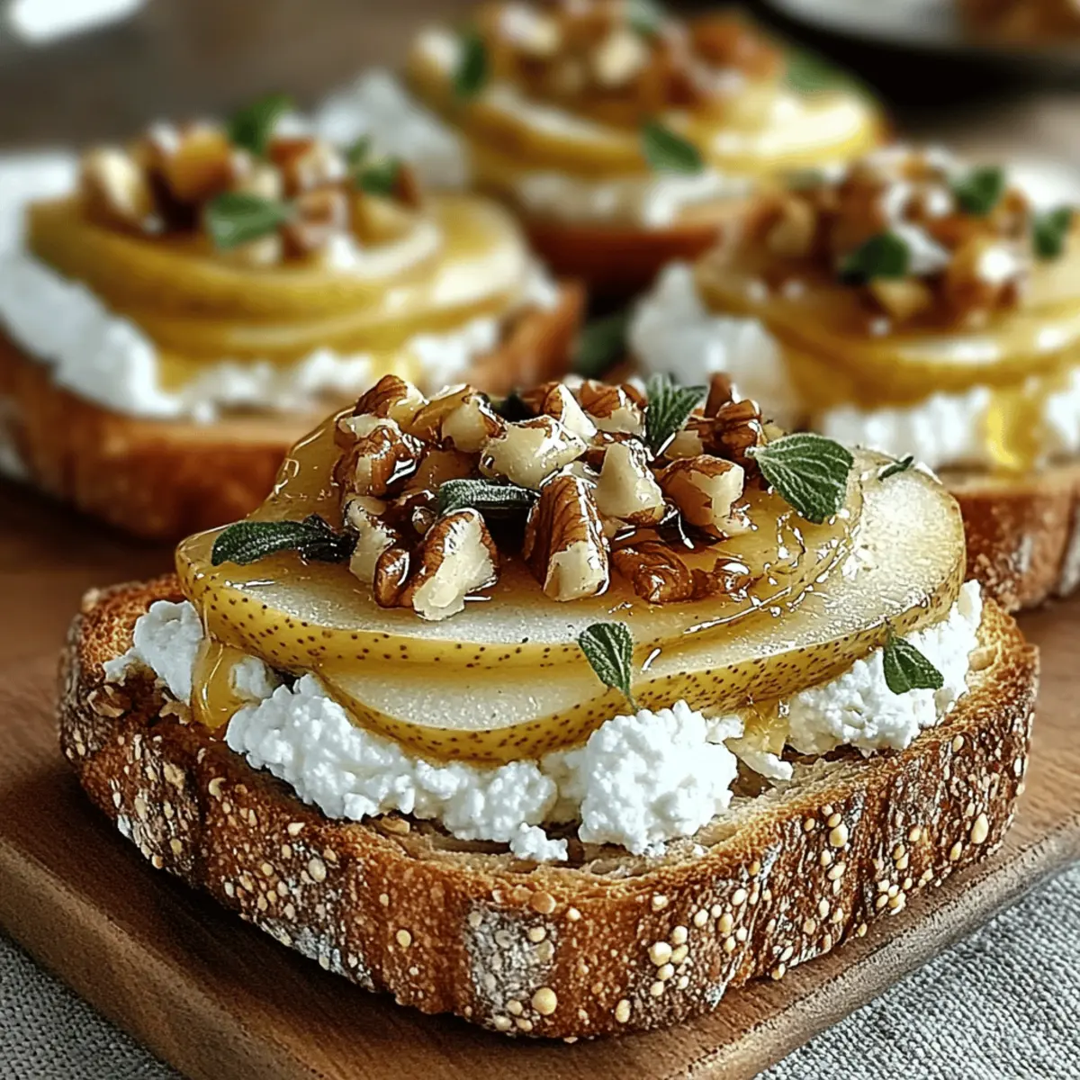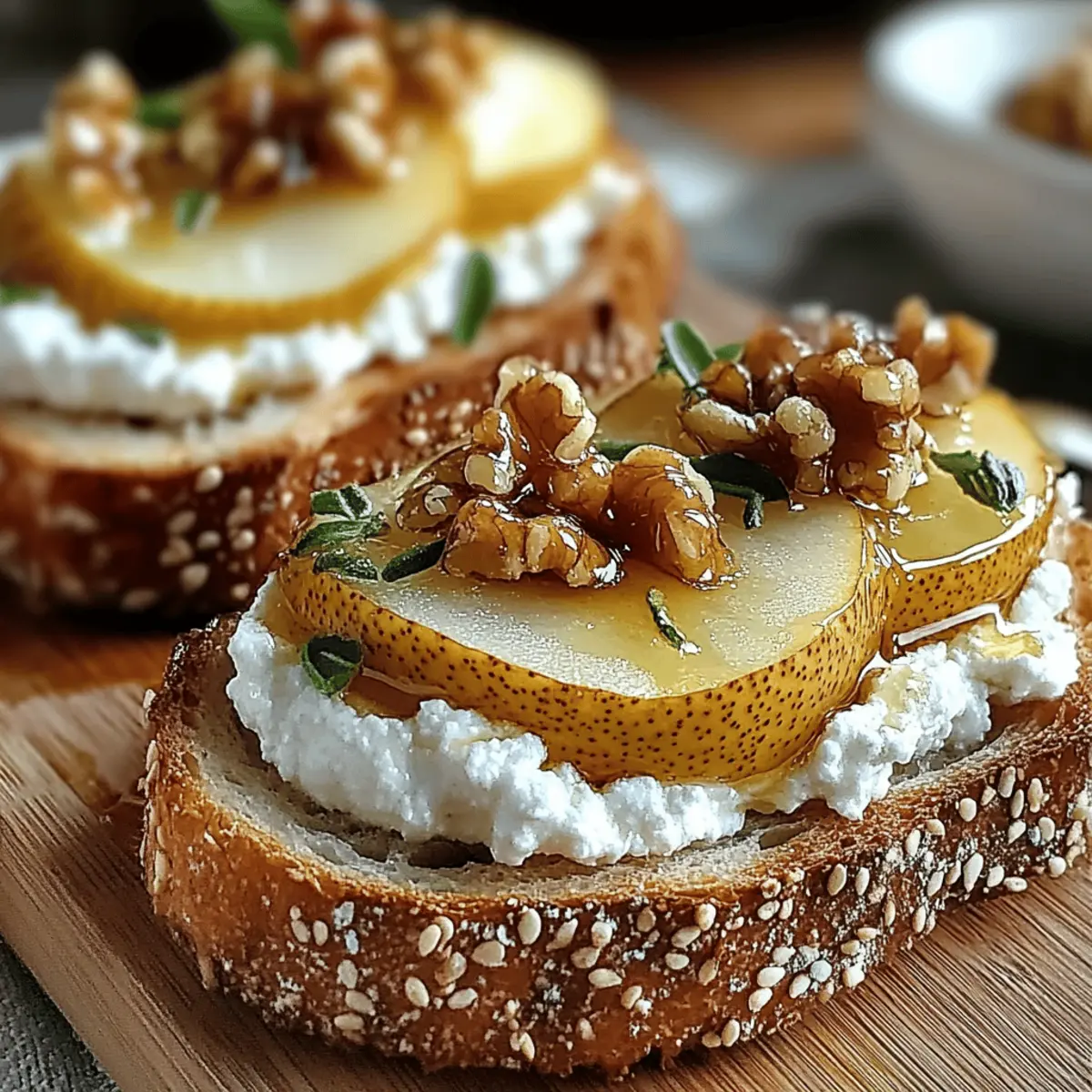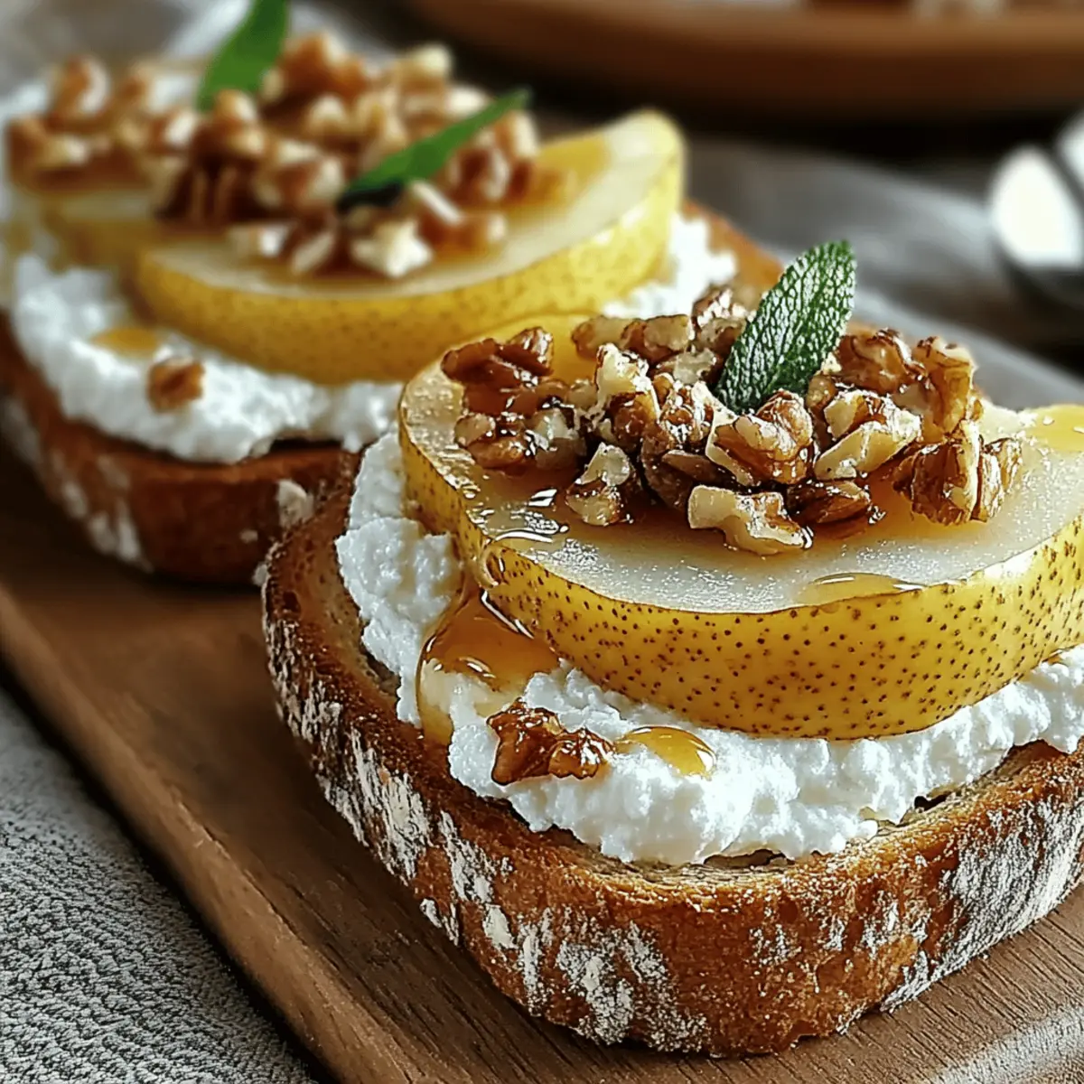 Jump to Recipe Print RecipeAs I stood by the kitchen counter, the fragrant aroma of ripe pears filled the air, instantly transporting me to a sunlit afternoon in a quaint Italian café. This is the magic that happens when you whip up a batch of Pear & Honey Ricotta Toast—a delightful blend of creamy ricotta, juicy pears, and a touch of sweet honey. Not only is this healthy breakfast treat a feast for the eyes, but it also offers a grown-up twist that will impress anyone at your brunch table. In just 20 minutes, you can create a dish that’s not only quick to prepare, but also incredibly adaptable for gluten-free diets. Curious about how to elevate your mornings with this vibrant toast? Let’s dive into the deliciousness! Why is Pear & Honey Toast Irresistible? Simplicity at its finest: With just a handful of ingredients, this recipe is as easy as it gets—perfect for both novice cooks and seasoned chefs. Freshness shines through: The ripe pears combined with creamy ricotta create a heavenly blend that bursts with flavor in every bite. Versatile delight: Customize it with different fruits or cheeses depending on what you have on hand, making it suitable for any occasion. Check out options like our Pumpkin Ricotta Stuffed for more variations! Crowd-pleaser appeal: Serve this toast at brunch parties or family gatherings, and watch as guests rave about its delicious taste and beautiful presentation. Nutritious indulgence: Not only is it a treat for the taste buds, but it also packs essential nutrients, making it a healthy choice for breakfast or a light snack. Pear & Honey Ricotta Toast Ingredients For the Toast • Ripe Pears – Choose sweet varieties like Bartlett or Anjou for maximum flavor. • Fresh Ricotta Cheese – Fresh ricotta enhances creaminess; it’s the star of the Pear & Honey Ricotta Toast. • Honey – A natural sweetener packed with antioxidants; local varieties offer unique notes. • Olive Oil – Use high-quality extra virgin olive oil for richness; it elevates the toast’s flavor. • Crusty Bread (e.g., sourdough, ciabatta) – Opt for hearty options to avoid sogginess; they provide the perfect base. Optional Toppings • Chopped Walnuts – Add a nutty crunch and healthy omega-3 fatty acids to your toast. • Fresh Mint Leaves – These leaves provide a refreshing lift and beautiful garnish for your dish. Step‑by‑Step Instructions for Pear & Honey Ricotta Toast Step 1: Prepare the Ricotta Spread In a mixing bowl, combine 1 cup of fresh ricotta cheese with 2 tablespoons of honey, 1 teaspoon of vanilla extract, 1 teaspoon of lemon juice, and a pinch of salt. Use a spatula or whisk to blend these ingredients together until the mixture is smooth and creamy. This delicious ricotta spread will serve as the base for your Pear & Honey Ricotta Toast. Step 2: Toast the Bread Heat a skillet or grill pan over medium heat. While it heats, brush both sides of your bread slices (like sourdough or ciabatta) with high-quality extra virgin olive oil. Toast each slice in the skillet for 2-3 minutes, or until golden brown and crispy. The visual cue here is a nice, golden crust that ensures the toast holds the toppings beautifully. Step 3: Assemble the Toast Once your bread is toasted, generously spread the creamy ricotta mixture on each slice. Make sure to reach the edges for the best flavor experience. Next, artfully layer thinly sliced ripe pears on top of the ricotta. The contrasting colors of the creamy white ricotta and vibrant pear slices make for a visually stunning Pear & Honey Ricotta Toast. Step 4: Finish Off To elevate your toast further, sprinkle a handful of chopped walnuts over the pear slices for a delightful crunch. Drizzle additional honey on top for extra sweetness and a glossy finish. If you’re feeling adventurous, add a few fresh mint leaves as a vibrant garnish that also adds a refreshing flavor contrast. Serve immediately and enjoy each delicious bite! Make Ahead Options These Pear & Honey Ricotta Toasts are ideal for busy home cooks looking to save time during the week! You can prepare the ricotta mixture up to 2 days in advance; simply combine 1 cup of ricotta with honey, vanilla, lemon juice, and salt, then refrigerate it in an airtight container to maintain freshness. Additionally, you can slice your pears up to 24 hours ahead of time—just soak them in a little lemon juice to prevent browning. When you’re ready to enjoy, toast the bread as per the recipe, assemble the layers with the chilled ricotta and pear, and finish with walnuts and honey for that delightful taste. Enjoy the convenience of effortless brunching! Expert Tips for Pear & Honey Ricotta Toast Choose the Right Pears: Use fully ripe pears for optimal sweetness and flavor. They should yield slightly when gently squeezed to ensure deliciousness in your Pear & Honey Ricotta Toast. Perfectly Toasted Bread: Toast the bread until it’s golden and crispy. Avoid under-toasting to prevent a soggy base that could detract from the dish’s texture. Don’t Skip the Fresh Ricotta: Fresh ricotta makes a world of difference in flavor and creaminess. Avoid using pre-packaged varieties to elevate your toast experience. Experiment with Toppings: Don’t hesitate to get creative! Feel free to swap walnuts for almonds or try different fruits to customize your Pear & Honey Ricotta Toast according to seasonal availability. Serve Immediately: For the best texture and flavor, serve your toast right after assembly. If needed, keep the ricotta mixture in the fridge for up to 2 days for easy preparation later. Storage Tips for Pear & Honey Ricotta Toast Room Temperature: For the best taste and texture, enjoy the Pear & Honey Ricotta Toast immediately after making it; it’s at its freshest when served warm. Fridge: If you have leftover ricotta mixture, store it in an airtight container in the fridge for up to 2 days. Rewhip it before using to regain its creamy texture. Freezer: We recommend against freezi