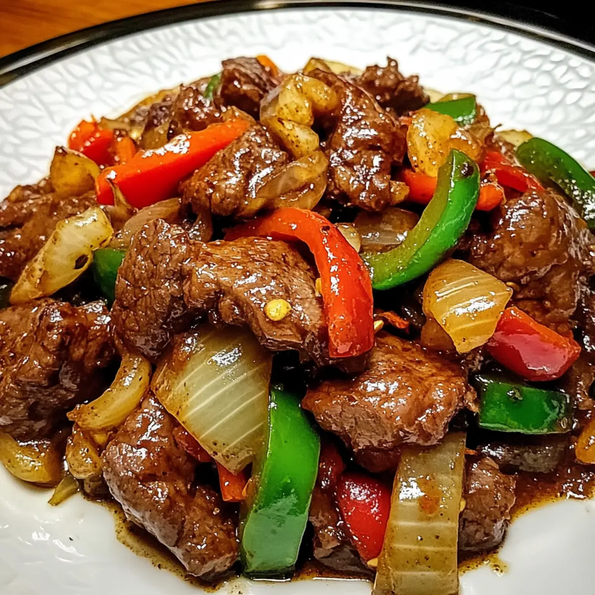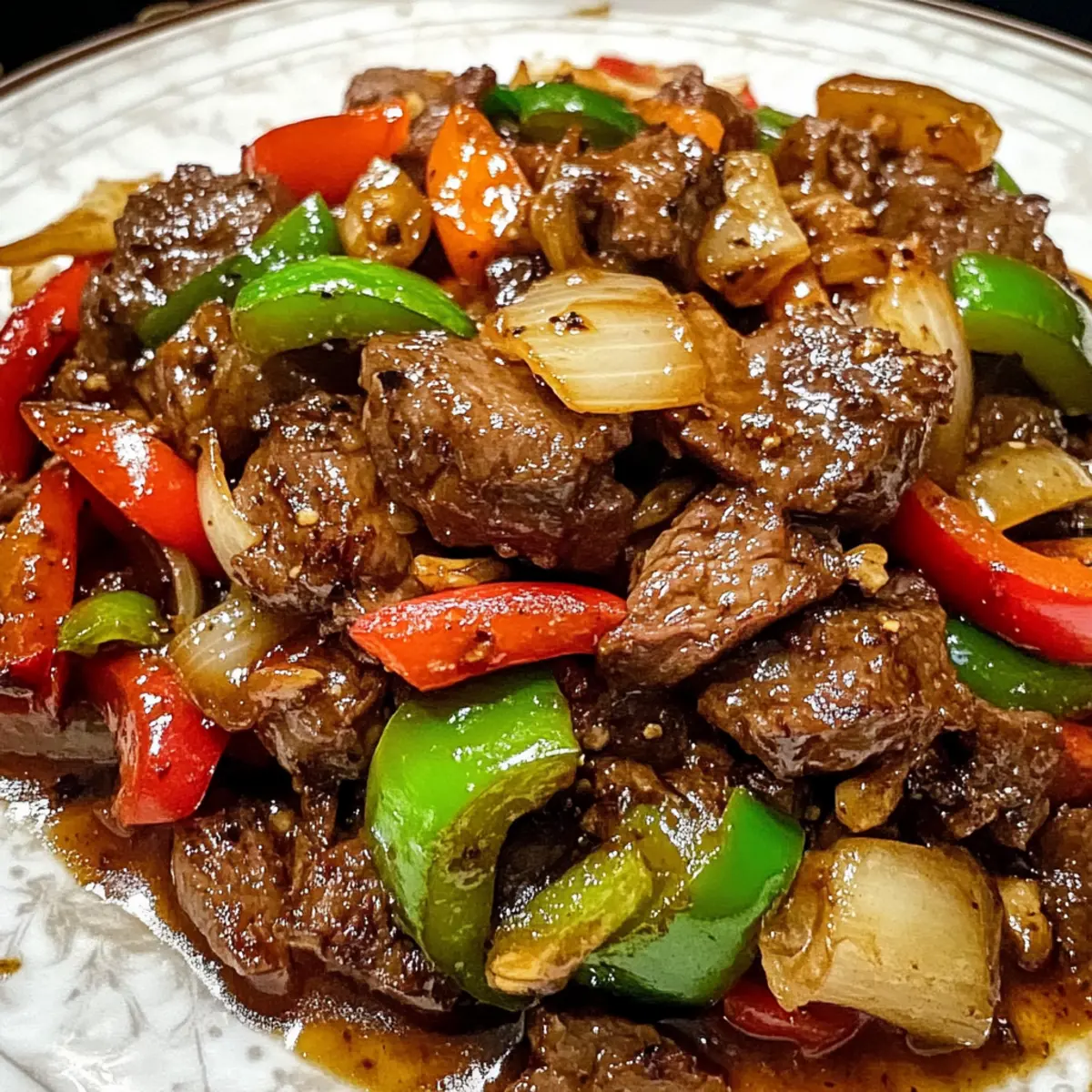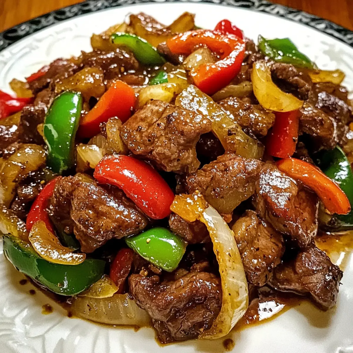 Jump to Recipe Print RecipeThere’s something truly magical about the way fragrant garlic and ginger dance with vibrant bell peppers in the pan. As I sizzle these ingredients together, the longing for a comforting yet protein-packed meal comes to life with my recipe for Pepper Steak with Bell Peppers and Onion. This dish is not just about tender slices of beef; it’s a colorful feast for the eyes and a nourishing hug for the soul. Perfect for your busy weeknights or those occasions where you want to impress guests, this pepper steak delivers in both flavor and ease. Plus, it’s highly customizable—swap in your favorite veggies or even choose a lighter protein. Are you ready to jump into this savory adventure? Let’s cook together! Why is this pepper steak a winner? Simplicity, this savory dish requires minimal prep and cooking time, making it perfect for busy weeknights. Flavorful, the combination of tender steak, vibrant bell peppers, and aromatic spices creates a mouthwatering experience you’ll crave. Customizable, tailor this recipe to your taste by adding your favorite veggies or swapping meats like chicken or shrimp. Nutrient-dense, packed with protein and vitamins, it’s a healthy choice for all. Crowd-pleasing, it’s a guaranteed hit at family gatherings or dinner parties—everyone will leave asking for seconds! Pepper Steak with Bell Peppers and Onion Ingredients For the Steak Beef Steak – Tender cuts like sirloin, flank, or ribeye are ideal for a rich flavor and protein content. Substitution: Chicken or tofu can create a lighter version. Soy Sauce – Provides umami and salt, transforming the marinade for flavorful beef. Substitution: Tamari for gluten-free option. Oyster Sauce – Adds depth and richness to the dish. Substitution: Hoisin sauce can give a sweeter taste. Cornstarch – Helps thicken the sauce, giving it a velvety finish. Substitution: Arrowroot powder works well too. For the Vegetables Bell Peppers – A colorful mix of red, green, and yellow enhances both taste and nutrition. Substitution: Zucchini can be used for a different texture. Onion – Balances the dish with sweetness and depth. Substitution: Shallots provide a milder flavor. Garlic – Elevates the overall aroma of the dish. Tip: Garlic powder is an alternative if fresh isn’t available. Ginger – Fresh ginger adds a spicy kick and aromatic quality. Substitution: Ground ginger for convenience, though fresh is preferred. For Cooking Vegetable Oil – Essential for sautéing, creating a golden sear on the beef. Substitution: Canola or peanut oil can be used instead. Beef Broth or Water – Enhances the sauce’s flavor and consistency. Tip: Vegetable broth is a great option for a vegetarian version. Salt and Pepper – Key seasonings to enhance the flavors according to your taste. Cook up a beautiful Pepper Steak with Bell Peppers and Onion, where each ingredient works in harmony to create a dish that’s not only satisfying but also visually stunning! Step‑by‑Step Instructions for Pepper Steak with Bell Peppers and Onion Step 1: Marinate the Beef In a mixing bowl, whisk together soy sauce, oyster sauce, and cornstarch until smooth. Add your sliced beef to the mixture, ensuring each piece is fully coated. Let it marinate for at least 15 minutes; for a more intense flavor, consider marinating for 30 minutes. This step enhances the seasoning of your Pepper Steak with Bell Peppers and Onion and ensures tenderness. Step 2: Prep Vegetables While the beef marinates, prepare your vegetables. Slice the bell peppers into strips and the onion into thin wedges. Mince the garlic and grate the ginger, creating a fragrant base for your dish. Keeping your vegetables uniform in size will ensure they cook evenly, bringing color and texture to your Pepper Steak with Bell Peppers and Onion. Step 3: Sear Beef Heat a large skillet or wok over high heat and add a splash of vegetable oil. Once the oil shimmers, add the marinated beef in a single layer, allowing it to sear undisturbed for 1-2 minutes on each side until browned. This quick cooking method locks in flavors and gives your beef that delicious, caramelized touch. Remove the beef and set it aside on a plate. Step 4: Cook Vegetables In the same skillet, add a little more oil if needed, and toss in the sliced bell peppers and onion. Sauté for 3-4 minutes until they are tender yet still crisp, maintaining their vibrant colors. Stir occasionally to ensure even cooking without overcooking. This step builds the deliciousness of your Pepper Steak with Bell Peppers and Onion. Step 5: Combine Ingredients Add the minced garlic and grated ginger to the sautéed vegetables, stirring for about 1 minute until aromatic. Return the browned beef to the skillet and pour in your beef broth or water. Cook for an additional 2-3 minutes, allowing the sauce to thicken and coat all ingredients, creating a mouthwatering, cohesive dish. Step 6: Season and Serve Final touch: season your Pepper Steak with Bell Peppers and Onion with salt and pepper to taste, balancing flavors to your preference. Once everything is well combined and heated through, serve hot over a bed of rice or noodles, garnished with sesame seeds or green onions for a refreshing finish. Expert Tips for Pepper Steak Slice Against the Grain: Ensure tenderness by slicing the beef against the grain; this technique breaks down fibers for a more enjoyable bite. Marinating Matters: For the best flavor, allow the beef to marinate for at least 30 minutes; this step enriches your Pepper Steak with Bell Peppers and Onion. Crisp Vegetables: Sauté bell peppers and onions only until they are tender but still crisp to maintain their vibrant colors and nutrients. Adjust Sauces: Modify the amount of soy sauce and oyster sauce based on your sodium preferences; taste as you go. Serve Fresh: Enjoy this dish immediately after cooking. Overcooking the vegetables can lead to a loss in color and crunch, diminishing the overall ap