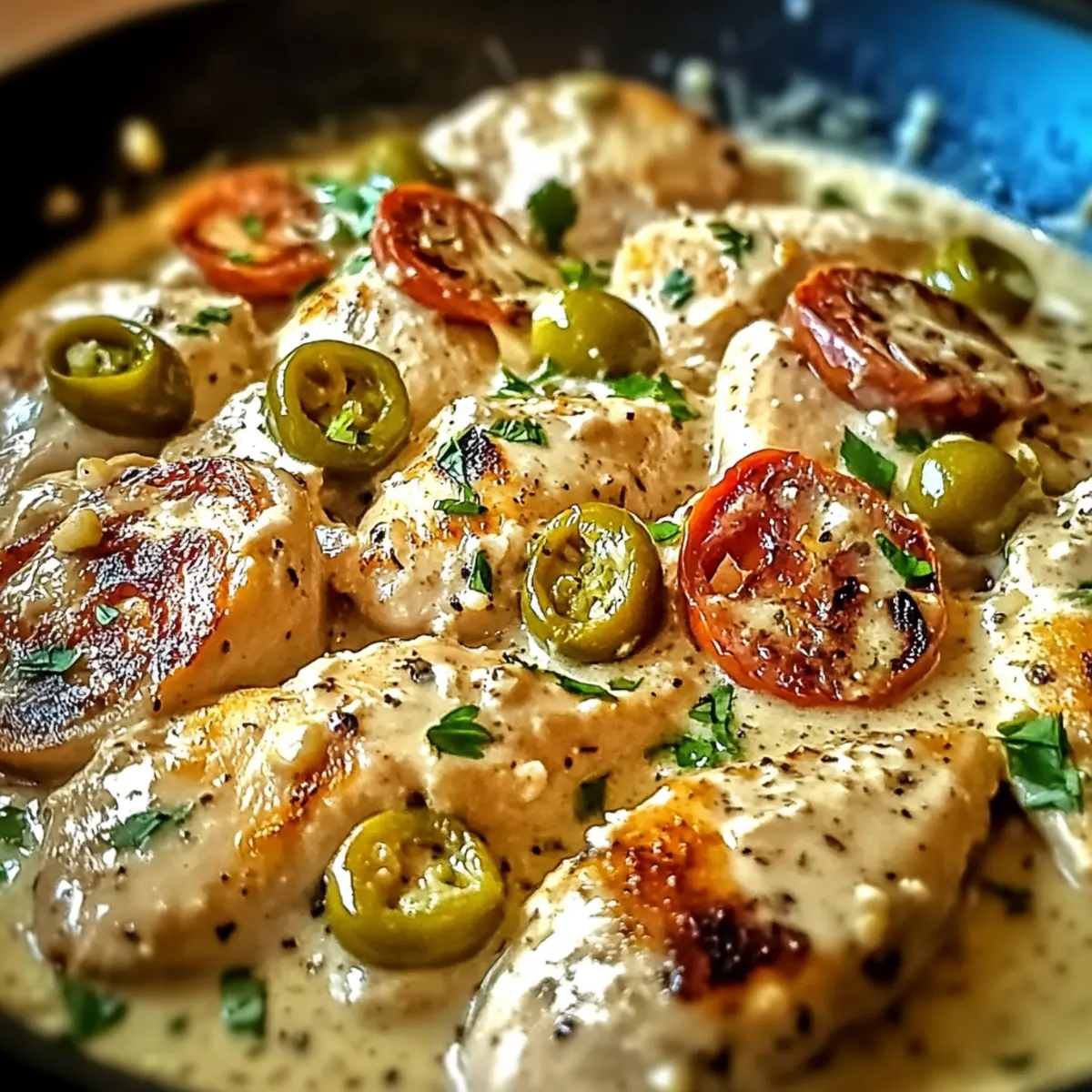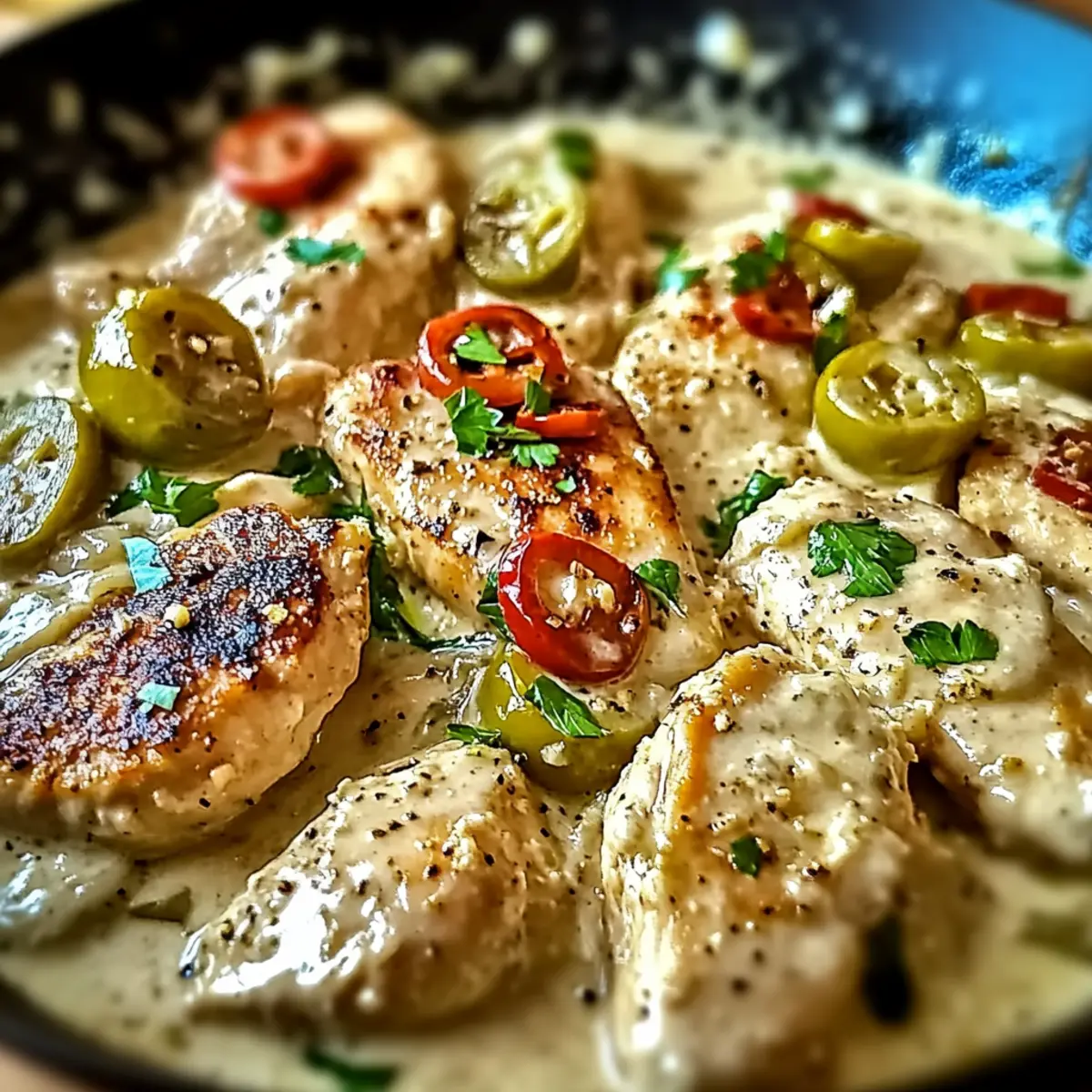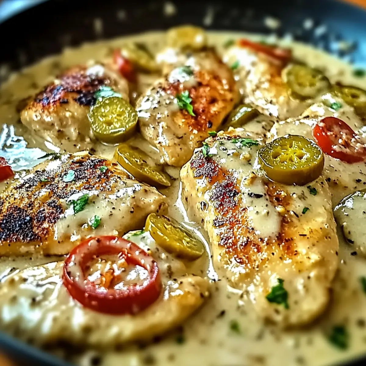 Jump to Recipe Print RecipeAs I stood in my kitchen one evening, the familiar sizzle of garlic met my ears, stirring memories of cozy Italian dinners shared with family. Enter the Creamy Pepperoncini Chicken Skillet—a dish that effortlessly combines mouthwatering flavors and simple preparation, perfect for those busy weeknights. This delightful meal whiskers you away to the heart of Italy, with zesty pepperoncini and a velvety Parmesan sauce wrapping around tender chicken. Not only does it deliver comfort and warmth, but it also comes together in just 30 minutes, freeing up your evening for more family moments. Imagine your loved ones gathered around the table, savoring each bite of this creamy chicken skillet while sharing stories and laughter. Curious to uncover how this Italian-inspired dish can become your new go-to? Let’s dive in! Why is this Chicken Skillet a Must-Try? Quick and Easy: This Creamy Pepperoncini Chicken Skillet is a fantastic option for busy weeknights, transforming a handful of ingredients into a delectable dish in just 30 minutes. Flavorful Fusion: The zesty pepperoncini and creamy Parmesan sauce create a delightful harmony that elevates simple chicken into a gourmet experience. Versatile Options: Whether you prefer light chicken breasts or juicy thighs, this recipe is flexible, allowing for various protein and dairy-free swaps to suit your dietary needs. Crowd-Pleasing Comfort: Perfect for family dinners, it combines rich flavors and textures that are sure to impress, making it a dish everyone will love. Perfect Pairings: Serve it alongside a crisp green salad or warm garlic bread for a complete meal that is both satisfying and nourishing! Pepperoncini Chicken Skillet Ingredients For the Chicken Chicken – Thin strips are perfect for quick cooking; chicken thighs can be used for extra tenderness. Sea Salt – Essential for enhancing flavor; adjust based on your salt preference, especially if using unsalted butter. Ground Pepper – Freshly ground provides depth; feel free to add more for a spicy kick! For the Sauce Butter – Ideal for sautéing; substitute with olive oil for a lighter option. White Onion – Adds a sweet base to the dish; yellow onions are a good alternative. Garlic – Fresh garlic gives the best aroma and taste; minced or crushed works best. Chicken Stock – Adds moisture and flavor; opt for vegetable broth for a vegetarian take. Roasted Red Pepper – Imparts sweetness and color; fresh bell peppers can also enhance the sauce. Heavy Cream – Creates that rich and creamy texture; coconut cream is a great dairy-free option. Parmesan Cheese – For that creamy, cheesy flavor; freshly grated offers better melting. For the Seasoning Italian Seasoning – A blend of herbs that adds depth; fresh herbs can elevate the flavors even more. Pepperoncini Peppers – Adds a zesty kick; adjust the amount to match your spice preferences. Step‑by‑Step Instructions for Creamy Pepperoncini Chicken Skillet Step 1: Prepare Chicken Begin by slicing the chicken into thin strips, ensuring even cooking. Season the chicken with sea salt and freshly ground pepper, allowing the flavors to infuse. This creates a flavorful base for your Creamy Pepperoncini Chicken Skillet. Step 2: Cook Chicken In a large skillet, melt butter over medium-high heat until bubbling. Add the seasoned chicken strips and cook for about 8 minutes, flipping occasionally, until they are golden brown and cooked through. Once done, remove the chicken from the skillet and set aside to keep warm. Step 3: Sauté Aromatics Using the same skillet, reduce the heat to medium and add diced white onion. Sauté for about 5 minutes, or until the onion becomes translucent and fragrant. Next, stir in minced garlic and cook for an additional 1-2 minutes until it releases its aromatic scent, enhancing your Pepperoncini Chicken Skillet. Step 4: Build Sauce Base Pour in the chicken stock and add roasted red peppers to the skillet. Bring the mixture to a gentle simmer for about 5 minutes, allowing the flavors to meld and concentrate. This saucy base will provide moistness and depth to your dish. Step 5: Make Creamy Sauce With the heat turned off, whisk in the heavy cream and Parmesan cheese until the sauce is thick and creamy. Ensure that the mixture is smooth and well-combined, as this is what brings the Pepperoncini Chicken Skillet to life. Step 6: Season Sauce Return the skillet to medium heat and sprinkle in the Italian seasoning along with the pepperoncini peppers. Stir everything together, allowing the spices to become fragrant and evenly distributed throughout the sauce for a truly delightful flavor profile. Step 7: Combine Chicken Add the cooked chicken back into the skillet. Continue to simmer everything together for an additional 5-7 minutes, or until the chicken is heated through, reaching an internal temperature of 165°F. This step ensures that the chicken absorbs the delicious sauce flavors. Step 8: Serve Once the Creamy Pepperoncini Chicken Skillet is ready, plate the dish hot. Serve it over rice, pasta, or steamed vegetables for a comforting meal that’s sure to impress your family and friends. Make Ahead Options These Creamy Pepperoncini Chicken Skillet ingredients can be prepped ahead to save you precious time on busy weeknights! You can cut the chicken into strips and season it up to 24 hours in advance; simply keep it in an airtight container in the fridge. Additionally, the sauce base (onions, garlic, chicken stock, and roasted red peppers) can be sautéed and combined, then refrigerated for up to 3 days. When you’re ready to finish cooking, just reheat the sauce in a skillet, whisk in the heavy cream and Parmesan, then add the prepped chicken, simmering until cooked through. This smart meal prep ensures your Creamy Pepperoncini Chicken Skillet will still be just as delicious and comforting! Variations & Substitutions for Pepperoncini Chicken Skillet Feel free to sprinkle your own creat