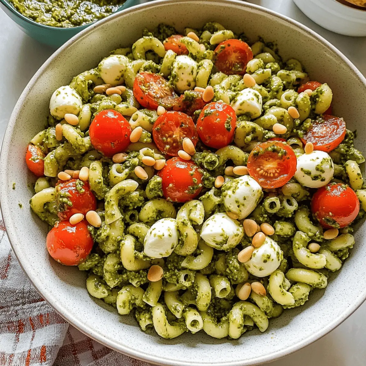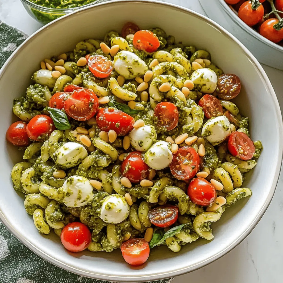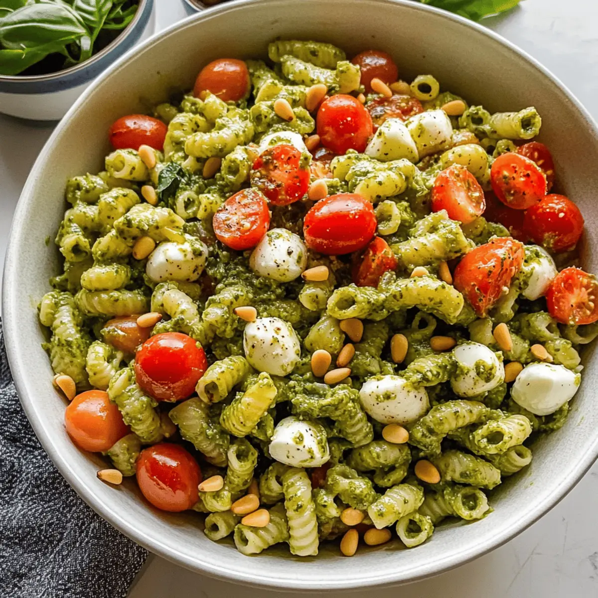 Jump to Recipe Print RecipeThe aroma of fresh basil mingles with sunny afternoons as I prepare to whip up a batch of my favorite Pesto Pasta Salad. With vibrant colors from juicy cherry tomatoes and creamy mozzarella, it’s hard not to feel a sense of joy when making this dish. This quick and easy recipe is perfect for anyone seeking a delicious meal without spending hours in the kitchen. Plus, it’s a make-ahead masterpiece that shinesBrightly at potlucks or summer picnics! The delightful crunch of toasted pine nuts adds a surprising layer of texture, making it a crowd-pleaser that both vegetarians and meat lovers adore. I can’t help but wonder, how will you customize your Pesto Pasta Salad to make it your own? Why is Pesto Pasta Salad a Must-Try? Vibrant Flavors: The fresh basil pesto, combined with juicy cherry tomatoes and creamy mozzarella, creates an explosion of taste in every bite. Quick & Easy: With simple steps, you can prepare this dish in just about 30 minutes, making it ideal for busy weeknights or last-minute gatherings. Make-Ahead Marvel: Prepping it in advance means you can enjoy a hassle-free meal ready to impress your guests—perfect for summer picnics or potlucks! Crowd-Pleasing Appeal: Whether vegetarian or not, everyone loves this pasta salad. Pair it with refreshing drinks like lemonade for a standout summer feast. Texture Delight: The crunchy toasted pine nuts offer a delightful contrast to the other ingredients, making each mouthful an adventure! Don’t miss out on trying a refreshing Watermelon Cucumber Salad as a side. Pesto Pasta Salad Ingredients • The perfect blend for your salad! For the Salad Basil Pesto – A rich, aromatic base that brings that fresh garden flavor; you can use store-bought for convenience or make your own for a personal touch. Cavatappi (or rotini) – This pasta shape holds onto the pesto beautifully; feel free to swap it with gluten-free pasta if desired. Kosher Salt – Essential for seasoning the pasta while cooking for an enhanced taste. Cherry or Grape Tomatoes – Their juicy sweetness adds bursts of flavor; simply halve them for easy mixing. Fresh Mozzarella Balls – Creamy and delightful, they complement the pesto perfectly; consider using mozzarella pearls for simplicity. Toasted Pine Nuts – These nutty nuggets add crunch; if you’re looking for a substitute, walnuts work well too or omit for a nut-free salad. Fresh Basil Leaves – Use these not just for garnish but for an extra layer of herbal freshness. Enjoy this Pesto Pasta Salad either fresh or chilled, and watch it become a staple at your gatherings! Step‑by‑Step Instructions for Pesto Pasta Salad Step 1: Make the Pesto Start by preparing the basil pesto using a food processor. Combine fresh basil, garlic, pine nuts, and parmesan cheese. Gradually drizzle in olive oil while blending until a smooth consistency forms. If you prefer store-bought pesto, choose one that is fresh and aromatic. Scrape down the sides and blend again to mix thoroughly, ensuring your Pesto Pasta Salad has a vibrant flavor. Step 2: Cook the Pasta Bring a large pot of salted water to a rolling boil. Add cavatappi or rotini and cook according to package instructions, usually around 8-10 minutes, until pasta is al dente. Once cooked, drain the pasta in a colander and rinse briefly under cold water to stop the cooking process. Allow it to cool for 5-10 minutes, ensuring it’s ready to absorb the flavors of the pesto. Step 3: Assemble the Salad In a spacious mixing bowl, combine the cooled pasta with the freshly made basil pesto. Gently fold in the halved cherry or grape tomatoes and mozzarella balls to maintain their shape. Sprinkling the toasted pine nuts at this stage adds a delightful crunch. Stir everything together until all ingredients are well coated in the rich pesto, bringing your Pesto Pasta Salad to life. Step 4: Serve Transfer the beautifully mixed Pesto Pasta Salad to a serving bowl. For an added touch, garnish with slivered fresh basil leaves to enhance visual appeal and freshness. You can serve it immediately or cover the bowl with plastic wrap and chill in the refrigerator for up to 24 hours. This allows the flavors to meld beautifully, making each bite even more delicious! Pesto Pasta Salad Variations Feel free to let your creativity shine as you customize this delightful Pesto Pasta Salad recipe! Pasta Shape Swap: Try using farfalle or penne for a fun twist on the classic. Different shapes can add a playful touch to your salad presentation. Vegan Delight: Replace mozzarella with avocado or a sprinkle of nutritional yeast for a creamy, dairy-free alternative that still tastes amazing. Protein Boost: Add grilled chicken, chickpeas, or even shrimp! These additions not only enhance flavor but also make this salad satisfying enough for a main course. Roasted Veggies: Toss in roasted bell peppers or zucchini for extra flavor and texture. The sweetness of the roasted veggies complements the pesto beautifully. Nut-Free Option: If you’re avoiding nuts, simply omit the pine nuts or substitute with crispy sunflower seeds for a satisfying crunch without the allergens. Spice it Up: Add a pinch of red pepper flakes or diced jalapeños for an unexpected burst of heat. This will delight those who enjoy a little spice! Sun-Dried Tomato Twist: Swap traditional basil pesto with sun-dried tomato pesto for a tangy alternative that’s just as delicious. It adds vibrant color and a unique flavor profile. Consider pairing your salad with a refreshing Tomato Salad Refreshing or complementing it with a light Olive Garden Pasta for a full meal experience. Enjoy mixing and matching to find your perfect flavor combination! Expert Tips for Pesto Pasta Salad Perfect Pesto: Use fresh basil for the best flavor. If using store-bought, look for high-quality options with minimal additives for your Pesto Pasta Salad. Cooling Pasta: To prevent a sticky mess, drain and rinse the pasta under cold water im