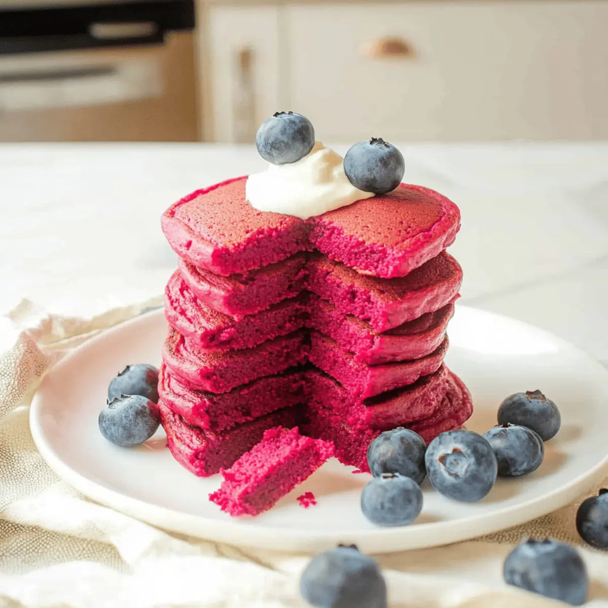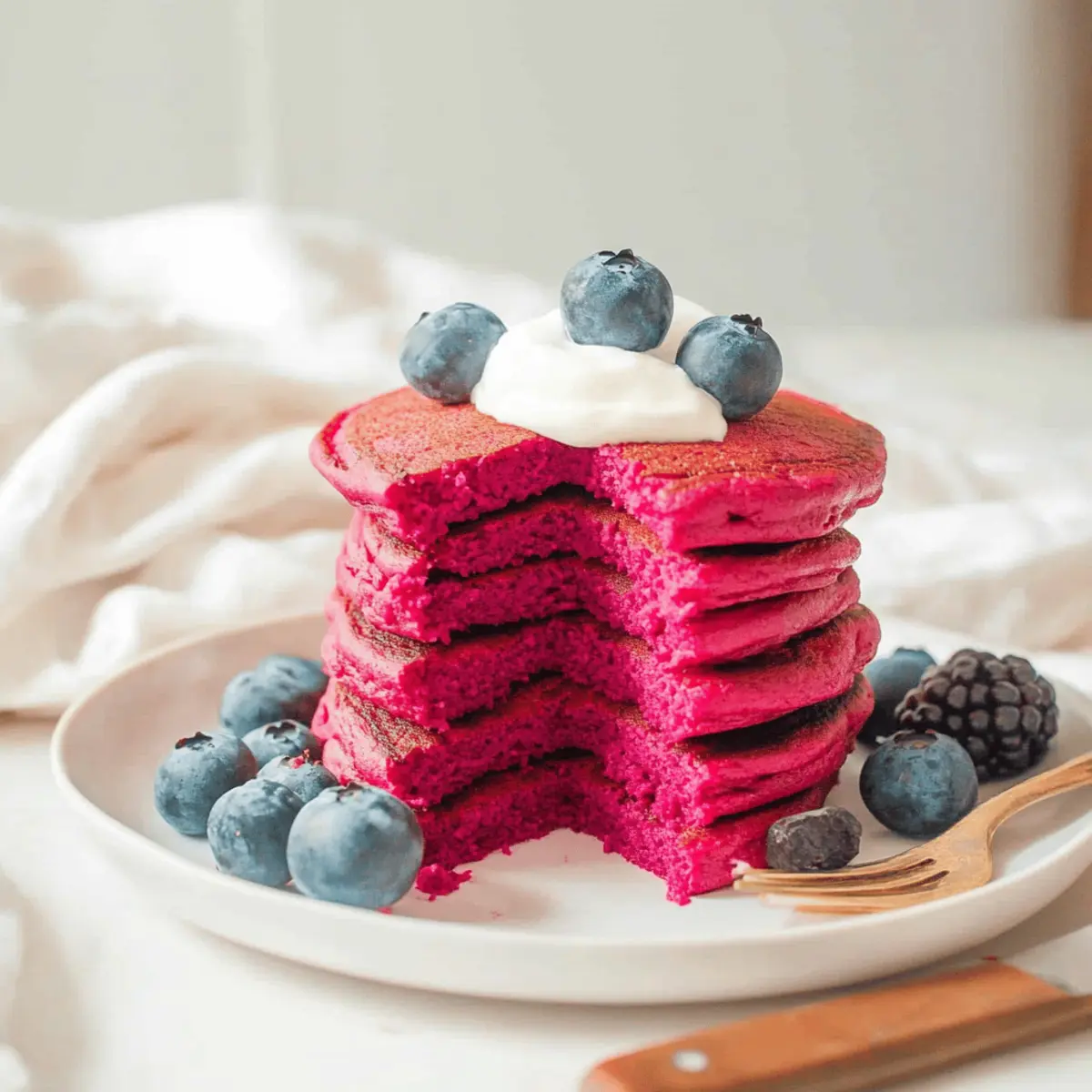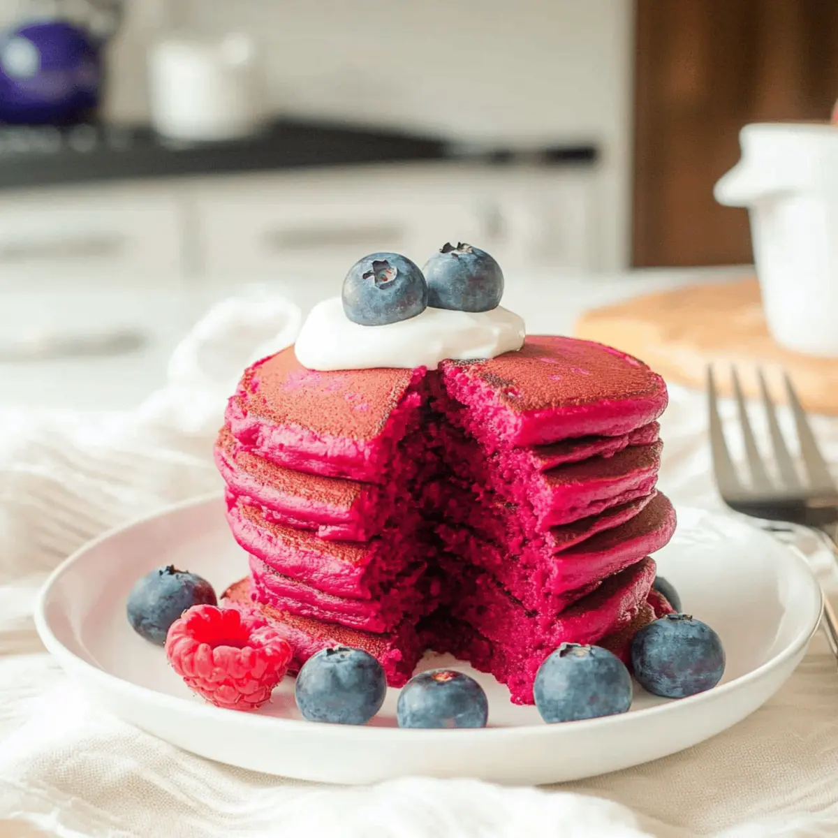 Jump to Recipe Print RecipeThe moment I first saw a stack of Pink Beet Pancakes glistening on the breakfast table, I was captivated. These pancakes not only boast a stunning ruby hue that’s sure to please the eyes and the tummy, but they also make sneaking in veggies a delightful experience for kids and adults alike. Trust me, this gluten-free, kid-friendly recipe is a lifesaver on chaotic mornings—quickly blended in just one step! They’re fluffy, subtly sweet, and surprisingly nutritious, transforming the traditional pancake experience into something vibrant and healthful. Whether you’re looking for a fun way to brighten up your breakfast routine or simply wanting to serve up something wholesome, these pancakes have you covered. Curious about how to whip up these beautiful breakfast beauties? Let’s dive into the recipe! Why Choose Pink Beet Pancakes? Visually Stunning: The vibrant color of these pancakes instantly adds a cheerful touch to your breakfast table. Health Boost: Packed with nutrient-rich beets, they provide essential vitamins while being gluten-free. Kid-Approved Flavor: Amazingly, kids love the subtle sweetness and unique taste—no more pancake battles at breakfast! Quick Prep: Whipped up in a blender, they save you precious time on busy mornings. Plus, consider serving them alongside Cinnamon Buttermilk Pancakes or with a side of Hazelnut Chocolate Pancake for a delightful pancake feast! Pink Beet Pancakes Ingredients For the Batter Rolled Oats – Provide structure and fiber; use certified gluten-free oats for a gluten-free option. Baking Powder – Responsible for leavening, making pancakes fluffy. Fine Salt – Enhances the flavor of other ingredients. Large Eggs – Binds the ingredients and adds richness. Plain Greek Yogurt – Contributes moisture and protein; substitute with unsweetened applesauce for a dairy-free option. Pure Vanilla Extract – Adds depth of flavor. Cooked Beets (peeled) – Introduces color and nutrients; you can start with a small amount if you’re new to beets, adjusting to taste. Unsweetened Applesauce – Provides natural sweetness and moisture; can be replaced with mashed ripe banana. Maple Syrup – Additional sweetness; adjust based on preference. Neutral Oil – Used for cooking to prevent sticking. Enjoy whipping up these Pink Beet Pancakes for a breakfast that’s as fun to make as it is to eat! Step‑by‑Step Instructions for Pink Beet Pancakes Step 1: Prepare Oat Flour Start by blending rolled oats with baking powder and fine salt in a high-speed blender. This should take about 30 seconds until it resembles a fine flour. Make sure there are no larger oat pieces left; this will create a light structure for your Pink Beet Pancakes. Once blended, set this oat flour mixture aside for later use. Step 2: Blend Wet Ingredients In the same blender, combine large eggs, plain Greek yogurt, pure vanilla extract, cooked beets, unsweetened applesauce, and maple syrup. Blend for about 1-2 minutes until the mixture is completely smooth and homogenous. The vibrant color of the cooked beets should shine through beautifully in your mixture, suggesting a delightful flavor is on its way. Step 3: Combine Mixtures Next, add the oat flour mixture back into the blended wet ingredients. Blend on low speed until it’s fully incorporated, about 30 seconds. The batter will be thick and pourable; check that there are no dry pockets remaining. This combination is what gives your Pink Beet Pancakes their lovely texture and fluffy finish. Step 4: Cook Pancakes Heat a non-stick skillet over medium-low heat and add a small amount of neutral oil to coat the pan evenly. Once the oil is shimmering but not smoking, spoon about 1/4 cup of the batter onto the skillet for each pancake. Cook for 2-3 minutes until bubbles form on the surface; then flip them and cook for another 2-3 minutes until golden brown. Step 5: Serve Remove the pancakes from the skillet and serve warm. Stack them high and consider topping them with fresh berries, a drizzle of maple syrup, or a dollop of Greek yogurt for extra flavor. For easy breakfasts throughout the week, store any leftovers in an airtight container in the fridge for up to five days or freeze them for longer enjoyment. What to Serve with Pink Beet Pancakes? Nothing complements these vibrant pancakes quite like adding a few delightful sides to your breakfast spread. Fresh Berries: Juicy strawberries, blueberries, or raspberries bring a natural sweetness and a pop of color that enhances the eye-catching pancakes. Their tangy flavors create a refreshing bite alongside the earthy beets. Maple Syrup Drizzle: A warm drizzle of authentic maple syrup adds a rich sweetness that ties together all the flavors on the plate. The syrup seeps into the pancakes, making each bite a comforting experience. Greek Yogurt Parfait: Layer creamy Greek yogurt with fruit and granola for a nourishing, textural contrast. The yogurt’s slight tang balances the sweetness, creating a lovely harmony on your breakfast table. Nut Butter Spread: A smear of almond or peanut butter introduces a nutty flavor that complements the earthy notes of the beets while adding healthy fats for lasting energy. This combination is not only tasty but satiates mid-morning cravings. Smoothie Bowl: Pair with a light fruit smoothie bowl topped with seeds and nuts. The refreshing nature and cool texture make for a beautifully nutritious breakfast, enhancing the pancake experience. Chai Latte or Herbal Tea: Complement your meal with a warm cup of chai latte or a soothing herbal tea. The spices and warmth of the drink contrast with the fluffy pancakes, creating a blissful morning experience. Make Ahead Options These Pink Beet Pancakes are perfect for meal prep enthusiasts! You can prepare the batter up to 24 hours in advance by blending all the wet ingredients along with the oat flour mixture and storing it in an airtight container in the refrigerator. This not only saves you 