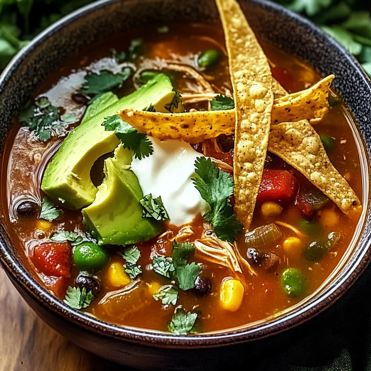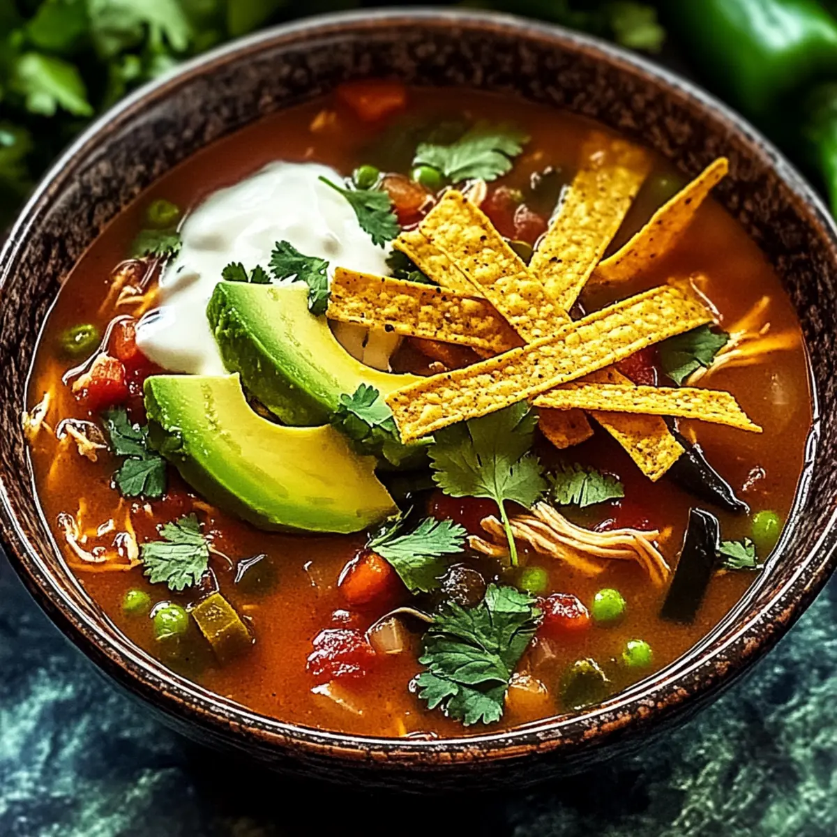 Jump to Recipe Print RecipeAs autumn leaves start to dance in the breeze, I find myself craving something warm and cozy to enjoy with loved ones. Enter the Hearty Poblano Chicken Tortilla Soup, a dish that wraps you in a smoky hug with every spoonful. What sets this recipe apart is its incredible versatility; it’s not just gluten-free and scrumptious, but also customizable to suit your taste buds—whether you prefer a touch of spice or a milder version. Perfect for those chilly evenings or a packed lunch, this comforting soup makes cooking feel effortless and satisfying. Ready to warm your soul with a bowl of deliciousness? Let’s dive in! Why Is This Soup So Irresistible? Comforting warmth: This soup wraps you in a cozy embrace, making it perfect for chilly nights with family or friends. Customizable to suit all: With multiple ingredient substitutions, you can easily adjust heat levels and flavors for picky eaters. Gluten-free goodness: Enjoy a hearty dish without worrying about gluten, so everyone can dig in. Flavor-packed profile: Smoky poblanos and zesty lime elevate this soup to a dish you’ll crave again and again. Time-saving options: Use rotisserie chicken to reduce prep time, making weeknight dinners a breeze. And if you’re looking for more comforting recipes, check out this delicious Ground Chicken Soup or our tasty Hot Honey Chicken for more meal inspiration! Poblano Chicken Tortilla Soup Ingredients • Get ready to savor every bite! For the Soup Olive Oil – Sautéing aromatics builds flavor; consider avocado oil as a swap. Onion (1 large, chopped) – Infuses natural sweetness and depth to the broth. Garlic (3 cloves, minced) – Adds aromatic goodness, making every spoonful delightful. Poblano Peppers (2 medium, seeded and chopped) – Provides smoky heat; swap with Anaheim for milder results. Jalapeño Pepper (1, seeded and chopped) – Introduces spiciness; can be omitted for less heat. Ground Cumin (1 teaspoon) – Enhances earthy undertones of the Poblano Chicken Tortilla Soup. Smoked Paprika (1 teaspoon) – Adds rich depth and a smoky aroma that’s heavenly. Chili Powder (1/2 teaspoon) – Delivers warmth and complexity, elevating the flavor profile. Chicken Broth (4 cups) – Forms the soup base; vegetable broth works for a vegetarian option. Cooked Chicken (2 cups, shredded) – Adds protein to the dish; rotisserie chicken is a great time-saver. Diced Tomatoes (1 can, 14.5 oz, undrained) – Contributes moisture and vibrant color to the soup. Black Beans (1 can, 15 oz, drained and rinsed) – Increases fiber and richness, making it heartier. Salt and Pepper – Essential seasonings that enhance all the flavors beautifully. Lime (1, juiced) – Brightens and elevates the overall flavor of the dish. Fresh Cilantro (1/4 cup, chopped) – Adds a fresh, herbal note that brightens the soup. Corn Tortillas (6, cut into strips) – Introduces a crunchy texture; consider baking for extra crispiness. Avocado (1, diced) – Brings creaminess that perfectly balances the soup’s rich flavors. Monterey Jack Cheese (1 cup, shredded) – Melts deliciously on top, enhancing the comfort factor. Sour Cream – An optional creamy garnish that adds a delightful finish. Step‑by‑Step Instructions for Hearty Poblano Chicken Tortilla Soup Step 1: Sauté Aromatics In a large pot, heat 2 tablespoons of olive oil over medium heat. Add 1 chopped onion and 3 minced garlic cloves, sautéing for about 5 minutes until the onion becomes translucent and fragrant. This foundational step builds the flavor base for your Hearty Poblano Chicken Tortilla Soup. Step 2: Cook the Peppers Now, stir in 2 chopped poblano peppers and 1 chopped jalapeño pepper. Cook for another 5 minutes, stirring occasionally, until the peppers soften. You want them tender but still vibrant, adding a pop of color and smoky heat to your comforting soup. Step 3: Toast the Spices Next, sprinkle in 1 teaspoon of ground cumin, 1 teaspoon of smoked paprika, and ½ teaspoon of chili powder. Toast these spices in the pot for about 1 minute, stirring constantly until they release their aromatic fragrance. This toasting brings out the depth of flavor in your Hearty Poblano Chicken Tortilla Soup. Step 4: Add the Broth Pour in 4 cups of chicken broth, stirring to combine with the sautéed ingredients. Increase the heat to bring the soup to a gentle simmer; allow it to simmer for about 5 minutes. This will meld all those lovely flavors together, giving you a rich base. Step 5: Incorporate Chicken and Beans Add 2 cups of shredded cooked chicken, 1 can of diced tomatoes (undrained), and 1 can of drained and rinsed black beans to the pot. Season with salt and pepper to taste, then lower the heat and let the soup simmer for 20 minutes. During this time, the beans will add heartiness to your Poblano Chicken Tortilla Soup. Step 6: Bake Tortilla Strips While the soup simmers, preheat your oven to 375°F (190°C). Cut 6 corn tortillas into strips and spread them across a baking sheet. Bake for approximately 10 minutes, or until golden and crispy. These strips will provide a delightful crunch to your soup when served. Step 7: Finish the Soup Stir in the juice of 1 lime and ¼ cup of chopped fresh cilantro just before serving. Adjust the seasoning if necessary, allowing the fresh ingredients to brighten the flavors of your Hearty Poblano Chicken Tortilla Soup. Step 8: Serve and Garnish Ladle the piping hot soup into bowls, topping each serving with diced avocado, shredded Monterey Jack cheese, and the crispy tortilla strips. You may also add a dollop of sour cream if desired. Dig in and relish the comforting warmth of this delicious dish! How to Store and Freeze Poblano Chicken Tortilla Soup Fridge: Store leftovers in an airtight container for up to 3-4 days. The flavors will deepen, making every bite more delicious! Freezer: Portion your soup into freezer-safe bags or containers and freeze for up to 3 months. Thaw overnight in the frid