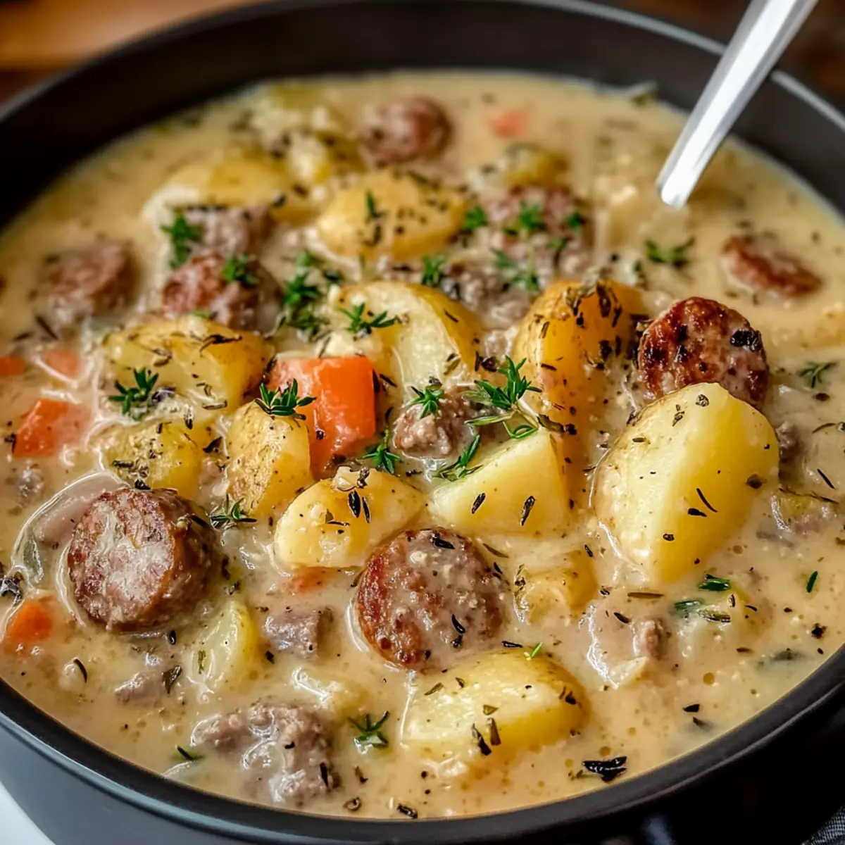 Jump to Recipe Print RecipeAs I stirred the pot, a rich aroma wafted through my kitchen, instantly transporting me to cozy evenings spent with loved ones. This Ultimate Potato and Sausage Chowder is my go-to comfort food—where creamy textures meet the smokiness of sausage in a hearty one-pot meal that can warm the coldest of nights. With minimal prep and maximum flavor, this chowder not only satisfies your hunger but also brings a sense of togetherness around the dinner table. It’s the perfect easy dinner solution for anyone looking to escape the fast-food rut. So, are you ready to dive into a bowl of deliciousness? Why is this chowder a must-try? Comforting Warmth: The Ultimate Potato and Sausage Chowder offers a cozy embrace with every spoonful, featuring a creamy texture perfect for chilly nights. One-Pot Wonder: Say goodbye to complex meals—this hearty dish simplifies your dinner routine by combining all ingredients in one pot for easy cleanup. Flavor Explosion: A blend of smoky sausage, aromatic garlic, and herbs creates a depth of flavor that will have everyone at the table raving. Customizable Goodness: Whether you’re craving a lighter dish or want to sneak in some greens, it’s easy to adapt the recipe to fit your taste. Family Favorite: This chowder is a hit with kids and adults alike, making it an ideal solution for family dinners and gatherings. Try pairing it with a side of Garlic Herb Potato for a complete meal! Potato and Sausage Chowder Ingredients • Here’s everything you need for this creamy chowder! For the Base Olive Oil – Used for sautéing the sausage and veggies; vegetable oil serves as a good substitute. Sausage (pork/turkey/chicken) – Provides a savory and smoky flavor; ground sausage offers a different texture than sliced. Yellow Onion – Adds sweetness and aroma; shallots can be used for a milder taste. Garlic Cloves – Enhances the depth of flavor; fresh cloves give the best taste. Yukon Gold or Russet Potatoes – Creates creaminess in the chowder; sweet potatoes can be a delightful alternative. Chicken Broth – Serves as the flavorful base; vegetable broth can be used for a vegetarian option. For the Creaminess Heavy Cream or Half-and-Half – Ensures the chowder has a velvety texture; substitute with coconut milk for a dairy-free version. For Flavor Dried Thyme – Adds herbal notes; fresh thyme is a wonderful substitute if available. Smoked Paprika – Provides warmth and smokiness; regular paprika can be used but lacks the deep flavor. Salt and Pepper – Essential for seasoning; feel free to adjust according to taste. Optional Add-Ins Corn Kernels – Adds sweetness and texture; use frozen or fresh based on your preference. Shredded Cheddar – Introduces richness and flavor; this is optional but adds extra creaminess. Step‑by‑Step Instructions for Potato and Sausage Chowder Step 1: Sauté the Sausage In a large soup pot, heat 2 tablespoons of olive oil over medium heat. Once the oil is shimmering, add 1 pound of sausage, breaking it apart as it cooks. Sauté for 6 to 7 minutes until the sausage is browned and cooked through, stirring occasionally to ensure even browning. If there’s excess fat, drain it for a lighter chowder. Step 2: Add Aromatics Next, stir in one diced yellow onion along with 3 minced garlic cloves into the pot with the sausage. Sauté the mixture for about 3 to 4 minutes, or until the onion turns translucent and fragrant, combining the savory flavors with the sausage. This will create a delightful aroma in your kitchen. Step 3: Incorporate Potatoes and Spices Add 4 diced Yukon Gold potatoes to the pot along with 1 teaspoon of dried thyme and 1 teaspoon of smoked paprika. Dispose of any remaining bits stuck to the bottom of the pot. Pour in 4 cups of chicken broth, bringing the mixture to a boil. This step enhances the savory base of your Potato and Sausage Chowder while helping the potatoes absorb all that wonderful flavor. Step 4: Simmer for Tenderness Once boiling, reduce the heat to medium-low, allowing the chowder to simmer gently. Cover the pot and let it cook for 15 to 20 minutes, or until the potatoes are fork-tender. Stir occasionally to ensure even cooking, while the scents mingle and deepen. This simmering step is crucial for achieving that perfect, hearty texture. Step 5: Creamy Finish After the potatoes are tender, pour in 1 cup of heavy cream or half-and-half to add richness and a velvety texture to your chowder. Stir gently and let it simmer for an additional 5 minutes. Keep an eye on it to prevent boiling, as you want to preserve the creaminess and achieve the perfect consistency for your Potato and Sausage Chowder. Step 6: Add Optional Ingredients If desired, stir in 1 cup of corn kernels or 1 cup of shredded cheddar cheese for an extra layer of flavor and texture. Allow these additions to heat through for about 2 minutes, enhancing the overall richness of the chowder. Adjust seasoning with salt and pepper to taste, ensuring every spoonful is full of warmth and comfort. Step 7: Serve and Enjoy Ladle the chowder into bowls, garnishing each serving with fresh parsley or chives if desired. Pair it with crusty bread or a side salad for a complete meal. Dive into your homemade Potato and Sausage Chowder, soaking up the cozy warmth and delightful flavors that make it a true family favorite. Make Ahead Options Preparing the Ultimate Potato and Sausage Chowder ahead of time is a game-changer for busy weeknights! You can chop the vegetables and even cook the sausage up to 24 hours in advance; simply store them in an airtight container in the refrigerator to maintain freshness. If you prefer to take it a step further, you can make the entire chowder and refrigerate it for up to 3 days—the flavors will deepen and meld beautifully. When you’re ready to serve, gently reheat the chowder on the stove and stir in the heavy cream or half-and-half before serving. This ensures a creamy, delicious result withou