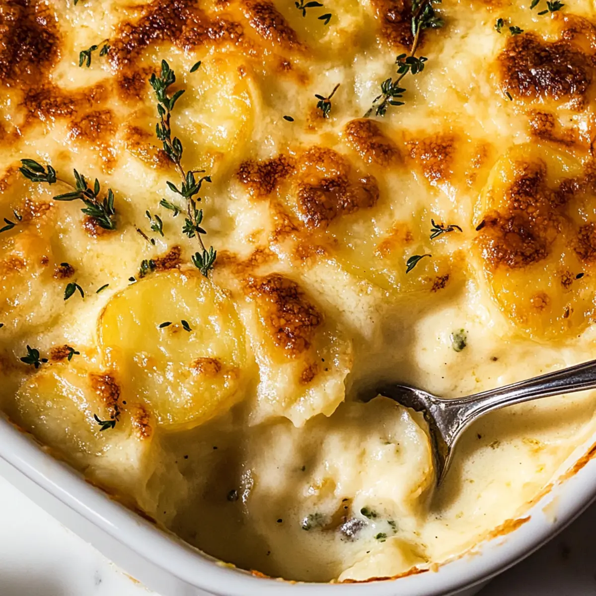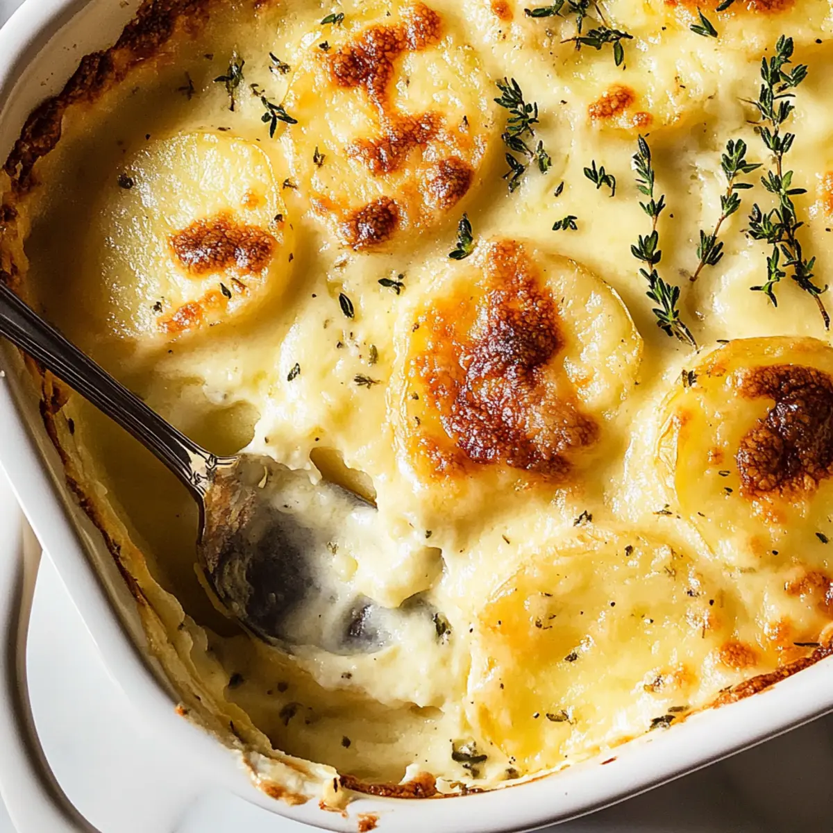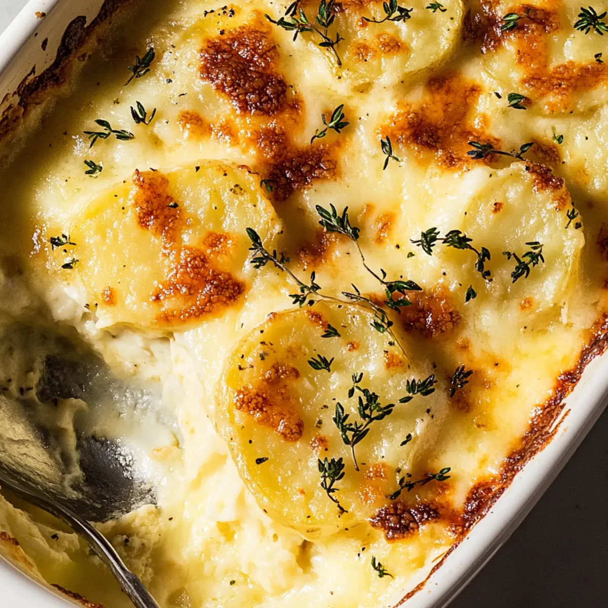 Jump to Recipe Print RecipeAs I stood in my kitchen, the comforting aroma of melting cheese began to fill the air, transporting me to a cozy French bistro. It was the perfect moment to unveil my Creamy Potatoes Au Gratin, a dish that’s not only easy to whip up but also brings a touch of elegance to any table. With layers of tender Yukon Gold potatoes blanketed in a rich, creamy sauce infused with garlic and thyme, this recipe is a true crowd-pleaser. Whether it’s for a festive gathering or a quiet family dinner, the warmth and heartiness of Potatoes Au Gratin elevate the simplest of occasions. Plus, it’s a fabulous make-ahead option, allowing you to savor the moment with your loved ones instead of slaving away in the kitchen. Curious about how to create this comforting masterpiece? Let’s dive right into the recipe! Why Is Potatoes Au Gratin a Must-Try? Comforting Elegance: This classic dish combines rich, creamy textures with savory layers of cheese, creating an indulgent experience that’s sure to impress. Time-Saving Option: Make-ahead friendly, you can prepare it a day in advance, allowing you more time to enjoy your company. Versatile Pairing: Perfect alongside a roast beef or chicken dish, these potatoes make any meal feel gourmet. Simple Ingredients: Easily accessible ingredients like Yukon Gold potatoes and Gruyère cheese make this recipe both affordable and delicious. Flavorful Infusion: The addition of garlic and thyme elevates the dish beyond ordinary cheesy potatoes, making it a standout side. Explore even more delightful pairings with this Garlic Shrimp Potatoes for a unique twist! Potatoes Au Gratin Ingredients • Uncover the secrets to this creamy delight! For the Creamy Sauce Shallot – Adds aromatic flavor; can substitute with onion if unavailable. Garlic – Enhances the overall savoriness; use fresh for best results. Heavy Cream – Provides the richness and creaminess; light cream can be used for a lighter option. Whole Milk – Balances the richness of the cream; 2% milk is a lower-fat alternative. Thyme Sprigs – Offers earthy herb notes; dried thyme can be used, but fresh is preferred for flavor. Unsalted Butter – Used for greasing the baking dish; olive oil can be a non-dairy substitute. For the Potatoes Yukon Gold Potatoes – Forms the base of the dish; waxy potatoes hold their shape. Russet potatoes can be used but will change the texture. Kosher Salt – Enhances all flavors; sea salt is a great alternative. For the Cheesy Topping Gruyère – Adds a nutty, creamy flavor; Emmental or a mix of Swiss cheese can substitute. Parmesan – Provides a salty, savory top layer; Pecorino Romano can be used for a stronger flavor. Embrace the magic of Potatoes Au Gratin with these simple ingredients, and get ready to create an unforgettable dish! Step‑by‑Step Instructions for Potatoes Au Gratin Step 1: Infuse the Cream Begin by combining 1 finely chopped shallot, 2 cloves of minced garlic, 4 sprigs of fresh thyme, 2 cups of heavy cream, and 1 cup of whole milk in a saucepan. Heat mixture over medium-low heat, allowing it to simmer gently for about 30 minutes. Stir occasionally and watch for the cream to thicken slightly and the aromatics to infuse beautifully, filling your kitchen with a comforting scent. Step 2: Prepare the Potatoes While the cream infuses, peel and thinly slice 2 to 3 Yukon Gold potatoes (around 2 pounds) to about 1/8 inch thick. Utilize a mandoline for even slices, if available, to ensure consistent cooking later. Once sliced, keep the potatoes at room temperature to avoid browning and to maintain their fresh appearance until ready to combine with the cream sauce. Step 3: Combine and Cook the Potatoes Once infused, strain the cream mixture back into the saucepan, discarding the solids. Add the sliced potatoes and 1 teaspoon of kosher salt to the warm cream. Cook over medium heat for about 4 to 5 minutes until the potatoes are tender but not fully cooked; they should be easily pierced with a fork. This step ensures the potatoes absorb that rich flavor before layering. Step 4: Layer the Ingredients Preheat your oven to 350°F (175°C). Grease a 9×13 inch baking dish with unsalted butter, then begin layering the dish. Start with a layer of potatoes, followed by a spoonful of the creamy mixture, a sprinkle of 1 cup of Gruyère cheese, and some fresh thyme. Repeat this layering process until you’ve used all the ingredients, finishing with a top layer of cream and cheese. Step 5: Bake the Gratin Once layered, place the baking dish in the preheated oven and bake uncovered for 40 to 50 minutes. Keep an eye on it until the surface becomes golden brown and bubbling delightfully. The edges should look crispy, while the center remains creamy, promising a beautifully rich flavor with each bite of your luxurious Potatoes Au Gratin. Step 6: Let it Rest After baking, remove the Potatoes Au Gratin from the oven and allow it to rest for about 5 to 10 minutes before serving. This resting time allows the dish to set slightly, creating a perfect consistency for serving. As you cut into this decadent creation, enjoy the rich aroma and the beautiful layers that make every bite a comforting indulgence. What to Serve with Creamy Potatoes Au Gratin? Elevate your dining experience by pairing this comforting dish with complementary flavors and textures that create a harmonious meal. Herb-Roasted Chicken: Juicy and flavorful, herb-roasted chicken provides a savory contrast to the rich creaminess of the gratin, balancing flavors beautifully. Grilled Lemon Asparagus: Bright and crisp, the citrus notes and fresh crunch of asparagus cut through the richness, adding a refreshing element to your plate. Beef Wellington: This classic elegant dish pairs well, creating a sophisticated dining experience, with the tender beef complementing the creamy layers of the gratin. Garlic Butter Shrimp: For seafood lovers, the succulent garlic shrimp offers a flavorful bite that en