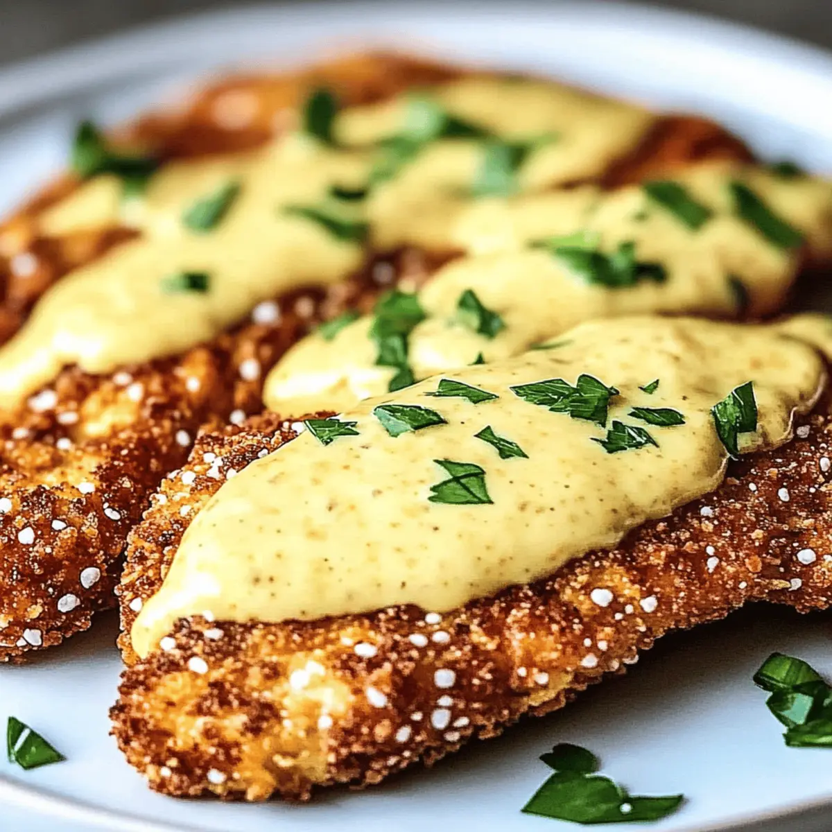 Rich, Creamy Sauce: The mustard-cheddar drizzle delivers a perfect tang, complementing the crispy coating and adding depth to the dish.