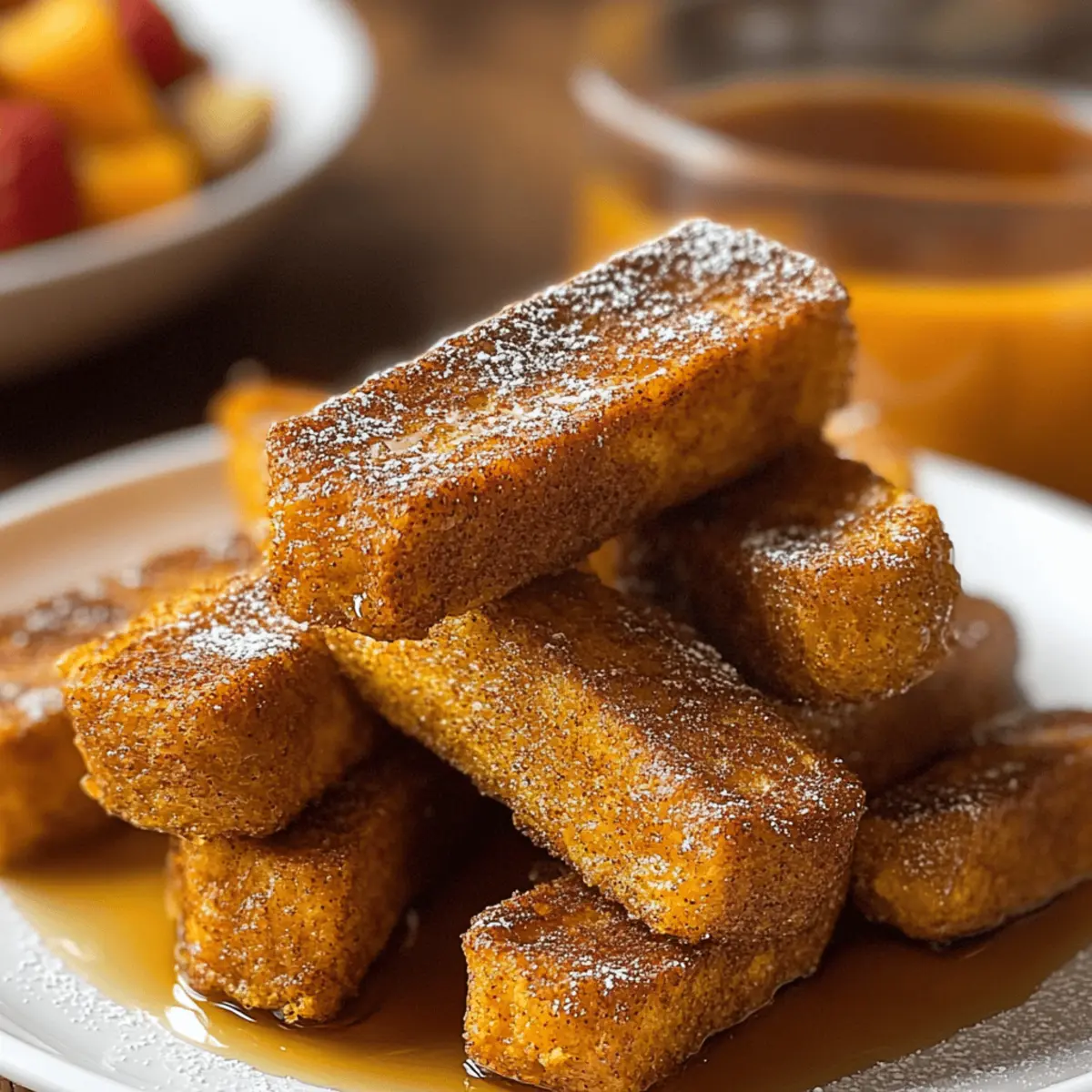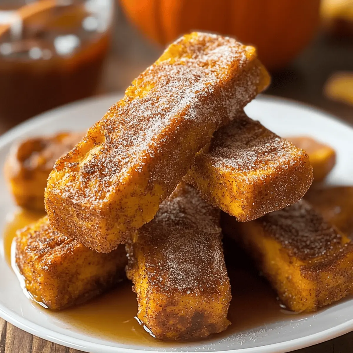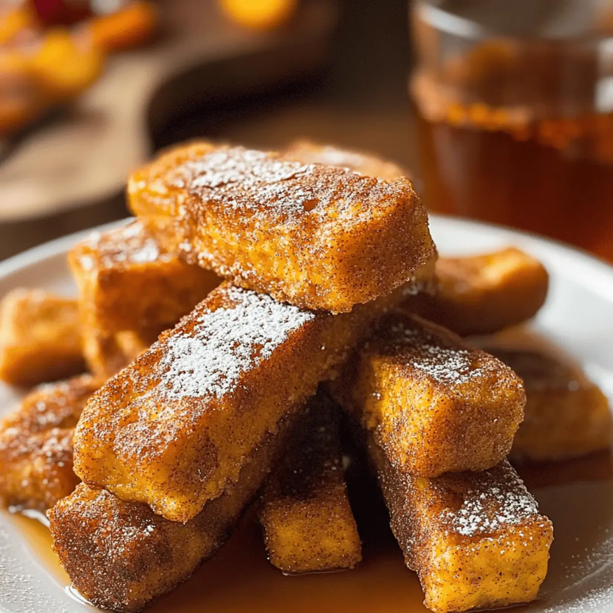 Jump to Recipe Print RecipeAs the first leaves begin to turn, my kitchen transforms into a haven infused with the sweet and spicy essences of fall. One of my absolute favorites during this time is the Quick and Easy Pumpkin French Toast Sticks. These delightful morsels are crispy on the outside, yet tender and custard-like within, coated with a generous sprinkle of cinnamon sugar—perfect for dunking into warm maple syrup. Not only are these French toast sticks a breeze to whip up in just 15 minutes, but they also make for a family-friendly breakfast that keeps little hands and tummies happy. Whether you’re savoring the moment solo or gathering around the table with loved ones, these Pumpkin French Toast Sticks are sure to bring a smile to your morning. Ready to flip your breakfast game? Let’s dive right in! Why You’ll Crave Pumpkin French Toast Sticks? Crispy Delight: These Pumpkin French Toast Sticks are incredibly crispy on the outside while remaining soft and custardy inside, creating a delightful bite. Fall Favorite: Packed with cozy autumn flavors, they perfectly capture the essence of the season, making breakfast feel special. Family-Friendly: Quick to prepare in just 15 minutes, these sticks are a hit with both kids and adults—perfect for busy mornings! Versatile Option: Enjoy them plain or dunked in syrup, or try serving with a side of fresh fruit or yogurt for a complete breakfast experience. Easy to Customize: Feel free to experiment with different breads or add-in options like chocolate chips for a twist, ensuring everyone at the table finds their favorite version! If you’re looking for a delightful seasonal treat, these Pumpkin Cream Cheese or Pumpkin Ricotta Stuffed recipes are also sure to please. Pumpkin French Toast Sticks Ingredients • Perfect ingredients for your fall feast! For the Batter French Bread or Brioche – A drier texture helps achieve crispness; substitute with challah or sourdough if needed. Eggs – Provides structure and richness; using large eggs will yield the best results. Milk – Adds moisture and creaminess; any milk (dairy or non-dairy) can be used for this recipe. Pumpkin Puree – Infuses warm flavor and moisture; opt for canned or homemade puree, but steer clear of pumpkin pie filling. Vanilla Extract – Enhances the overall flavor profile; pure vanilla extract is recommended for the best taste. Cinnamon – Offers a cozy spice flavor; feel free to add more for a spicier kick if that’s your style. Pumpkin Pie Spice – Creates a delightful blend of warming spices that play nicely with pumpkin; substitute with a mix of nutmeg and ginger if needed. Sugar – Sweetens your cinnamon sugar topping; alternative sweeteners can be used if preferred. For Cinnamon Sugar Topping Cinnamon – Used in the cinnamon sugar; adds an extra touch of sweet spice to the finished sticks. Sugar – Combined with cinnamon for the topping to create a delightful, crunchy finish. Step‑by‑Step Instructions for Pumpkin French Toast Sticks Step 1: Preheat the Skillet Begin by preheating a large non-stick skillet over medium heat. Add a small pat of butter, allowing it to melt and coat the pan evenly. You’ll know it’s ready when the butter starts to bubble gently, indicating a perfect surface for the Pumpkin French Toast Sticks. Step 2: Prepare the Batter In a sizable baking dish, whisk together the eggs, milk, pumpkin puree, vanilla extract, cinnamon, and pumpkin pie spice until smooth and well combined. The mixture should be creamy and evenly blended, offering rich autumn flavors that will envelop your French toast sticks. Step 3: Coat the Bread Take your French bread or brioche and cut it into thick sticks, about 1-2 inches wide. Dip each stick into the egg mixture, ensuring both sides are generously coated. Allow any excess batter to drip off before placing them in the skillet to achieve that crisp texture. Step 4: Cook the Sticks Place the dipped bread sticks into the heated skillet in a single layer, ensuring not to overcrowd the pan. Cook for about 2 minutes on each side, or until they turn a golden brown. Flip them gently with a spatula, revealing a beautifully crisp exterior with a custard-like center. Step 5: Mix the Cinnamon Sugar While the Pumpkin French Toast Sticks are cooking, prepare the cinnamon sugar topping. In a separate dish, combine sugar and cinnamon, blending them together thoroughly. This fragrant mixture will add a sweet finish to your perfectly cooked sticks once they are ready. Step 6: Roll in Cinnamon Sugar Once the sticks are golden and cooked through, remove them from the skillet and immediately roll them in the cinnamon sugar mixture. The warmth from the sticks will help the sugar adhere, creating a delightful, crunchy coating that enhances the delectable flavor of the Pumpkin French Toast Sticks. Step 7: Serve and Enjoy Serve the warm Pumpkin French Toast Sticks immediately, accompanied by a drizzle of warm maple syrup or buttery pecan syrup. Consider adding a side of fresh fruit or yogurt for a balanced breakfast experience that everyone in the family will love! Expert Tips for Pumpkin French Toast Sticks Use Stale Bread: Using stale bread helps achieve the ideal crispy texture; if fresh, dry it in the oven at 350°F for 10 minutes. Watch the Heat: Maintain a medium heat on your skillet to avoid soggy or burnt French toast sticks; adjust as necessary. Chill the Batter: For a richer flavor, prepare the batter the night before and refrigerate, then dip the bread just before cooking. Store Properly: Keep leftovers in an airtight container in the fridge for 3-4 days or freeze for 1-2 months to enjoy your Pumpkin French Toast Sticks later. Mix and Match: Experiment with different types of bread or add-ins like chocolate chips to customize this recipe and satisfy everyone’s taste! How to Store and Freeze Pumpkin French Toast Sticks Fridge: Store any leftover Pumpkin French Toast Sticks in an airtight container for up to 3