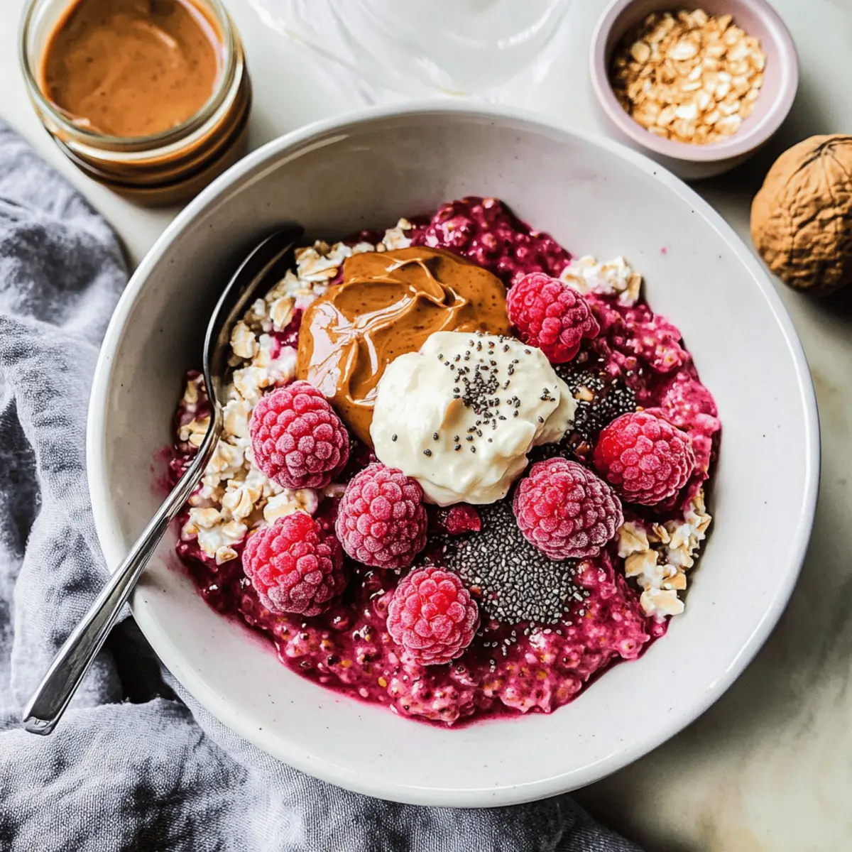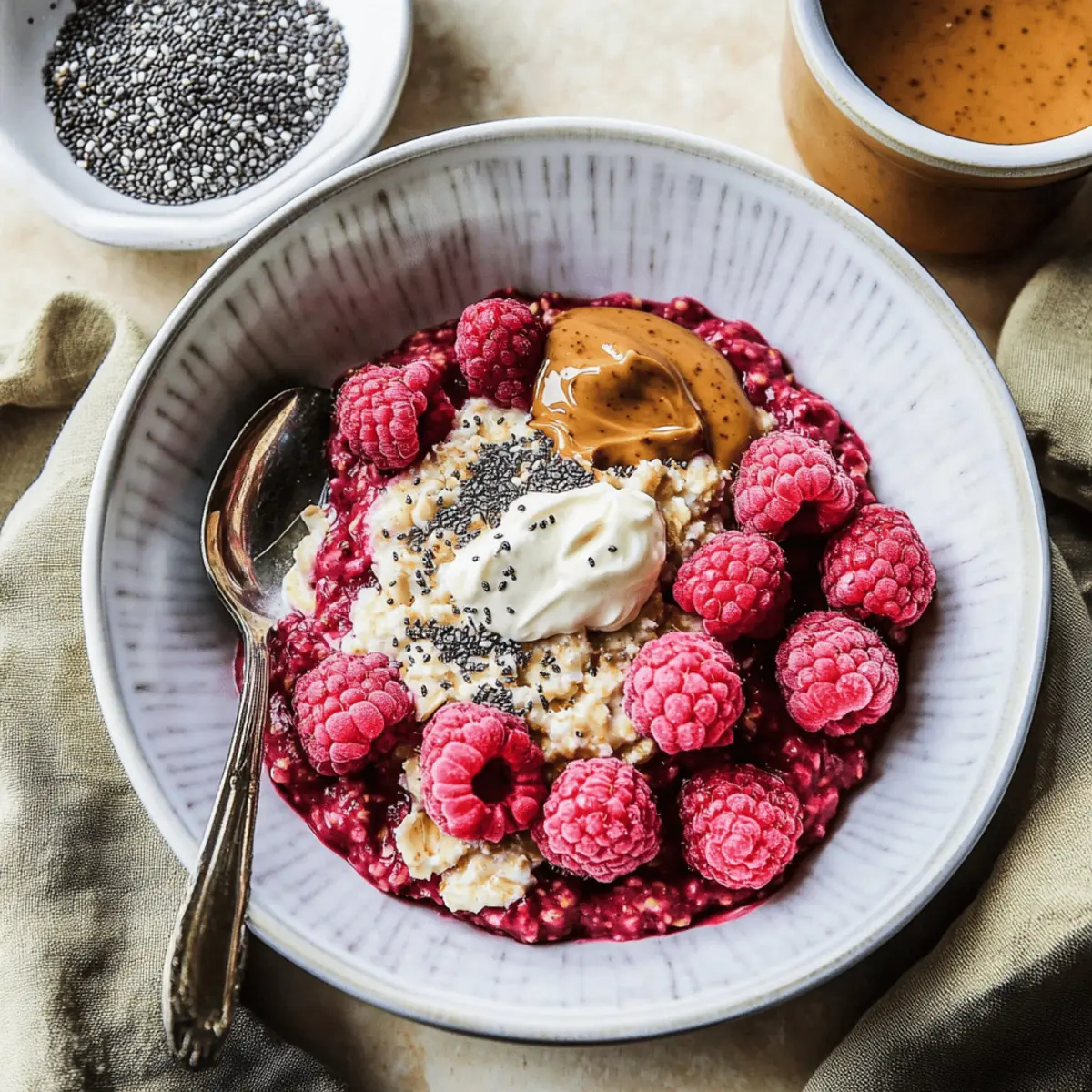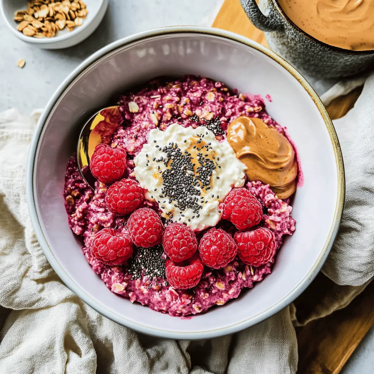 Jump to Recipe Print RecipeAs the sun rises and paints the kitchen with a golden glow, I can almost smell the comforting aroma of my creamy raspberry steel cut oatmeal simmering on the stove. This wholesome breakfast dish marries the nutty richness of steel cut oats with the delightful tartness of frozen raspberries, creating a morning experience that’s truly satisfying. Not only does it deliver a robust flavor and texture, but it’s also perfect for meal prep—ready to heat for those bustling mornings. Whether you’re looking to nourish your body with a healthy and hearty option or simply want a quick and filling breakfast that leaves you energized, this raspberry oatmeal is just what you need. Curious how to make it a regular part of your morning routine? Let’s dive into the delicious details! Why is Raspberry Oatmeal a Must-Try? Comforting, Creamy Texture: This oatmeal offers a rich, velvety finish that makes breakfast feel like a treat. Nutrient-Packed Ingredients: Steel cut oats and chia seeds provide fiber and healthy fats, keeping you full longer. Versatile and Customizable: Switch up the frozen raspberries with other fruits like blueberries or peaches for a new twist every time! Easy Meal Prep: Make a big batch ahead of time for quick mornings; it reheats beautifully! Vegan and Gluten-Free: With simple swaps, this dish fits a variety of dietary needs—just check out my tips for plant-based options. Add a scoop of nut butter or a dollop of yogurt for extra goodness, or enjoy it alongside my other favorites like Raspberry Cinnamon Rolls for a delightful brunch! Raspberry Oatmeal Ingredients • A delicious foundation for your meal prep! For the Oatmeal Steel Cut Oats – Base of the recipe, providing structure and fiber; substitute with rolled oats if needed and adjust cooking time. Chia Seeds – Boosts nutrition with omega-3s and fiber; can be swapped with flax seeds for a different nutrient profile. Ground Cinnamon – Adds warmth and flavor; feel free to omit or use nutmeg if you want a twist. Salt – Essential for balancing flavors; don’t skip this step! Unsweetened Milk of Choice – Adds creaminess; almond milk works wonderfully, but any non-dairy milk will do for a vegan option. Vanilla Extract – Enhances flavor depth; substitute with almond extract for a unique taste. Frozen Raspberries – Main fruit component, sweetening the dish; feel free to use other berries for variety. Optional Toppings Nut Butter – For extra creaminess and healthy fats; almond or peanut butter are excellent choices. Greek Yogurt – Adds a protein boost and creaminess; use dairy-free yogurt for a vegan option. Seeds/Nuts – Sprinkle for texture; try pumpkin seeds or walnuts for added crunch. Fresh Fruit – Top with banana slices or more berries for a fresh touch. Maple Syrup or Honey – Sweeten to taste; keep it simple or go for a drizzle of your favorite syrup. With these ingredients, you’re set to whip up a cozy bowl of raspberry oatmeal that’s not only delicious but also keeps you fueled throughout the day! Step‑by‑Step Instructions for Creamy Raspberry Steel Cut Oatmeal Step 1: Mix the Dry Ingredients In a large pot, combine 1 cup of steel cut oats, 2 tablespoons of chia seeds, 1 teaspoon of ground cinnamon, and a pinch of salt. Stir these dry ingredients together well to ensure an even distribution. This blend will provide a flavorful and nutritious base for your creamy raspberry steel cut oatmeal. Step 2: Add the Liquid and Flavor Pour in 4 cups of your unsweetened milk of choice, such as almond milk, along with 1 teaspoon of vanilla extract. Place the pot on the stove over medium-high heat and bring the mixture to a gentle boil. Keep an eye on it as the milk heats up; you’ll see small bubbles forming along the edges. Step 3: Incorporate the Raspberries Once boiling, stir in 1 cup of frozen raspberries, allowing them to meld with the mixture. Reduce the heat to low, which helps prevent it from sticking to the bottom of the pot. Continue to stir occasionally for about 15 minutes, ensuring the berries break down and infuse the oatmeal with their vibrant flavor. Step 4: Cook Until Creamy Let the oatmeal simmer on low heat for an additional 10-15 minutes, stirring regularly. You’ll know it’s ready when the oats are tender, and the mixture has thickened to a creamy consistency, creating a wonderful pink hue from the raspberries. Adjust the heat as necessary to maintain a gentle simmer without boiling over. Step 5: Serve and Enjoy Ladle the creamy raspberry oatmeal into bowls while it’s hot. Top with your favorite options like a scoop of nut butter, a dollop of yogurt, and a drizzle of maple syrup, if you desire. Stir these delightful toppings into the oatmeal to enhance its creaminess, making this dish even more indulgent for your breakfast experience. Raspberry Oatmeal Variations Feel free to get creative with this recipe and discover delightful twists that suit your taste buds! Rolled Oats: Swap steel cut oats for rolled oats, adjusting the cooking time to 5-7 minutes for a quicker, softer texture. Non-Dairy Twist: Use oat milk or coconut milk instead of almond milk for a different creamy flavor that complements the raspberries beautifully. Nut Butter Swaps: Try peanut, cashew, or sunflower seed butter for varying nutty flavors that add richness to your oatmeal experience. Spice It Up: Use pumpkin pie spice or ginger instead of cinnamon for an autumn-inspired flavor that warms the soul. Berry Medley: Replace raspberries with a mix of blueberries and strawberries for a colorful, berry-packed breakfast that’s bursting with flavors. Heat It Up: Add a dash of cayenne pepper or a sprinkle of red pepper flakes to give your oatmeal a surprising kick and an exciting twist. Creamy Vegan Alternative: Substitute regular yogurt with a dairy-free coconut yogurt for an even creamier finish that aligns with vegan preferences. Zesty Lemon: Incorporate a teaspoon of lemon zest