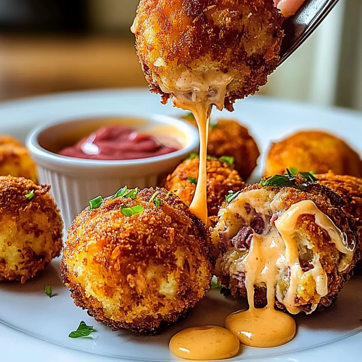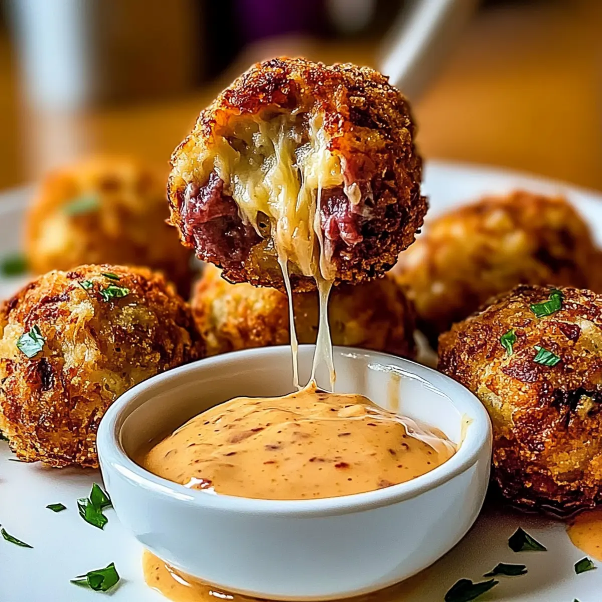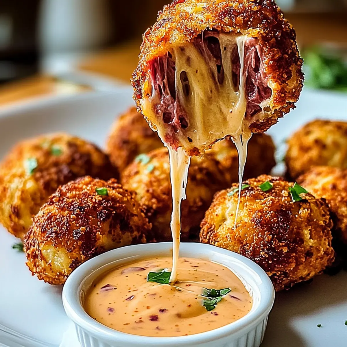 Jump to Recipe Print Recipe“Hey, did you get the recipe for those Reuben Balls?” I overheard at the last gathering, and I couldn’t help but smile. These crispy Easy Reuben Balls with Spicy Thousand Island Dip are sure to be the star of your next party! With their delightful crunch on the outside and rich, melty filling inside, these tasty bites pack all the flavor of a classic Reuben sandwich into one irresistible morsel. They’re not just easy to make but also perfect as a crowd-pleaser or game day snack. Plus, you can whip them up quickly—ideal for unexpected guests or last-minute gatherings. Who wouldn’t want to explore each delicious bite paired with a zesty dip? Join me in creating this comforting dish that will keep everyone coming back for more! Why Are Reuben Balls So Irresistible? Crispy Exterior: Each bite offers a delightful crunch that perfectly contrasts the melty filling. Comfort Food Delight: These Reuben Balls encapsulate all the flavors of a classic sandwich in a smaller, snackable form. Quick Preparation: With simple steps, you can have these scrumptious snacks ready in no time, making them perfect for unexpected gatherings or game days. Versatile Pairing: Serve them alongside your favorite dips, slaws, or even with a warm bowl of tomato soup for a unique meal experience. Enhance your appetizer spread by trying these with Baked Turkey Meatballs as well! Crowd-Pleaser: Their flavor and ease of preparation make them an absolute hit at any party, ensuring everyone is talking about them! Gluten-Free Options: Tailor the recipe to suit dietary needs by using gluten-free breadcrumbs and flour, allowing everyone to enjoy! Reuben Balls Ingredients For the Filling Corned Beef – Adds savory flavor and hearty texture; substitute with pastrami for a smoky twist. Sauerkraut – Provides tanginess and moisture; ensure it’s well-drained to avoid sogginess. Swiss Cheese – Offers creaminess and meltiness; Gruyère or provolone can be used as alternatives. Cream Cheese – Adds richness to the filling. Dijon Mustard – Provides a sharp tang; substitute with yellow mustard for a milder taste. Garlic Powder – Enhances flavor depth; fresh garlic can also be used if preferred. Onion Powder – Adds savory flavor; fresh onions can be replaced but will add extra moisture. Salt & Pepper – Essential for seasoning to taste. For Coating All-Purpose Flour – Coats the balls for dredging; gluten-free flour can be substituted for a gluten-free version. Eggs (beaten) – Helps the breadcrumbs adhere to the balls. Panko Breadcrumbs – Creates a crispy exterior; regular breadcrumbs or crushed rye chips can be used for different textures. For Frying Vegetable Oil – Needed for frying, essential for achieving that crispy outer layer. For the Dipping Sauce Mayonnaise – Base for the dipping sauce. Ketchup – Adds sweetness and tang to the dip. Sweet Pickle Relish – Contributes sweetness and texture to the dip. Hot Sauce – Adds spiciness; adjust according to preference. Smoked Paprika – Provides a hint of smokiness in the dip. Worcestershire Sauce – Enhances umami flavor. Minced Onion – Extra flavor for the dip; season with salt and pepper to taste. These Reuben Balls are sure to be a hit, whether it’s for a cozy gathering or a spirited game night. Enjoy the delightful crunch and mouthwatering flavor that will keep everyone coming back for more! Step‑by‑Step Instructions for Crispy Reuben Balls with Spicy Thousand Island Dip Step 1: Prepare the Filling In a large mixing bowl, combine chopped corned beef, well-drained sauerkraut, shredded Swiss cheese, cream cheese, Dijon mustard, garlic powder, onion powder, and a pinch of salt and pepper. Use a fork or spatula to mix everything together until fully combined, showcasing a rich blend of colors and textures. Then, cover the bowl with plastic wrap and refrigerate for 30-45 minutes to firm up the mixture for easier shaping. Step 2: Form the Balls Once the filling is chilled, use a cookie scoop or your hands to shape the mixture into balls, about 1 to 1.5 inches in diameter. This will create your delightful Reuben Balls, brimming with flavor. Arrange them on a parchment-lined baking sheet or plate, making it easy to prepare for the dredging process that follows. Step 3: Set Up Dredging Station Prepare your dredging station by placing all-purpose flour in one shallow bowl, beaten eggs in another, and panko breadcrumbs in a third. This setup will allow for easy coating of your Reuben Balls. The key here is organization, as it will streamline the process and reduce mess when dipping the balls in each component. Step 4: Coat the Balls Take each shaped ball and roll it first in the flour, ensuring it’s coated evenly to help the egg adhere. Next, dip it into the beaten eggs, allowing the excess to drip off, and finally coat it with panko breadcrumbs for a crispy exterior. For an extra crunch, repeat the egg and panko steps. Now your Reuben Balls are prepped for frying! Step 5: Heat the Oil In a deep, heavy pot or deep fryer, heat 2 inches of vegetable oil to 350°F (175°C). To test if the oil is ready, drop in a small piece of breadcrumb—if it sizzles and bubbles, you’re good to go. This high temperature is essential for achieving that golden-brown, crispy finish on your Reuben Balls. Step 6: Fry the Balls Carefully drop the breaded balls into the hot oil in batches, avoiding overcrowding. Fry them for 2-3 minutes, turning occasionally, until they are golden brown and crispy all around. Keep an eye on them to avoid burning, as they’ll cook quickly. Once perfectly browned, use a slotted spoon to remove the balls, allowing excess oil to drain off. Step 7: Drain and Cool Transfer the fried Reuben Balls to a plate lined with paper towels to absorb any remaining oil. This step is crucial for keeping them crispy. Let them cool for a few minutes as you prepare to whip up the accompanying spicy Thousand Island dip that will e