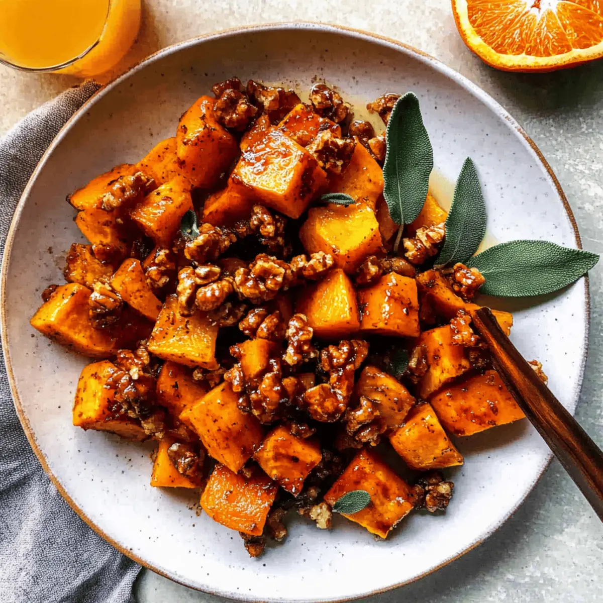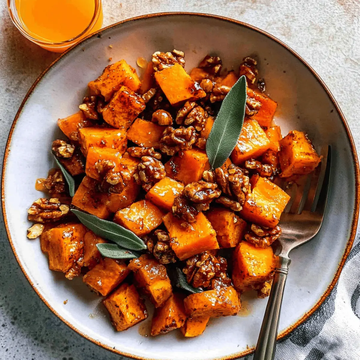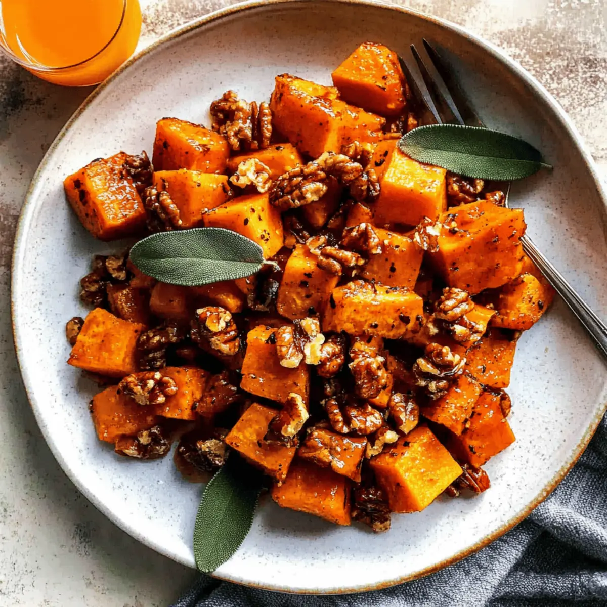Jump to Recipe Print RecipeAs I stood over the roasting butternut squash, the sweet aroma began to fill my kitchen, instantly reminding me of the cozy gatherings of fall. This Roasted Butternut Squash with Candied Walnuts is not just any side dish; it’s a warm hug on a plate, perfect for elevating family dinners or impressing guests during the holidays. With its delightful caramelization and a touch of smoky paprika, this gluten-free and vegetarian recipe offers both comfort and an elegant flair. Plus, it comes together quickly, making it an ideal choice for busy weeknights or special occasions. Are you ready to create a dish that will leave everyone asking for seconds? Let’s dive in! Why is this butternut squash irresistible? Flavor Explosion: This dish offers a rich blend of sweet, savory, and earthy flavors, thanks to the caramelized squash and maple-candied walnuts. Simple Preparation: With just a handful of ingredients and minimal steps, you can whip up a memorable side dish that looks as good as it tastes. Crowd-Pleaser: Whether for a holiday gathering or a cozy weeknight dinner, this recipe will have everyone coming back for more, truly making it a show-stopping centerpiece. Versatile Options: Feel free to experiment by swapping walnuts for pecans or adding a pinch of cayenne for a spicy edge. For more vibrant accompaniments, check out my Roasted Carrot Salad! Make-Ahead Friendly: Prep a day in advance to enjoy a delightful hassle-free cooking experience, freeing you up to focus on your beloved guests. Roasted Butternut Squash with Candied Walnuts Ingredients For the Squash Butternut Squash – Provides natural sweetness and a creamy texture when roasted; using pre-cubed squash saves time. Olive Oil – Essential for roasting to achieve beautifully caramelized exterior. Smoked Paprika – Adds a smoky depth and savory warmth, enhancing the roasted squash flavor. Cinnamon – Enhances the natural sweetness and adds a warm element to the dish. Kosher Salt – Balances flavors, amplifying the sweetness of the squash. Ground Ginger – Offers a spicy touch, complementing the other warm spices. For the Candied Walnuts Walnuts – Contributes a crunchy texture and rich flavor; a perfect addition for a delightful contrast to the squash. Maple Syrup – Provides sweetness and a glossy finish to the walnuts, making them irresistible. Fresh Orange Juice – Adds brightness and a zesty kick, perfectly balancing the sweetness. Fresh Sage – Delivers an aromatic, herbaceous note; rosemary can be a great substitute if you have it on hand. Apple Cider Vinegar – Balances the sweetness with a hint of acidity, enhancing overall flavor. Enjoy creating this Roasted Butternut Squash with Candied Walnuts—it’s bound to become a beloved staple at your dinner table! Step‑by‑Step Instructions for Roasted Butternut Squash with Candied Walnuts Step 1: Preheat the Oven Begin by preheating your oven to 425°F (220°C). This high temperature is essential for achieving the perfect caramelization on your butternut squash. While the oven heats, gather your ingredients and prep your workspace so that you can whisk through the steps seamlessly. Step 2: Prepare the Squash On a rimmed baking sheet, toss the pre-cubed butternut squash with a generous drizzle of olive oil. Add in smoked paprika, 1/4 teaspoon of cinnamon, ground ginger, and kosher salt, ensuring that each cube is evenly coated. This flavorful mixture sets the stage for a sweet and savory roasted delight as you spread the squash out in a single layer. Step 3: Roast the Squash Place the baking sheet in the preheated oven and roast the squash for approximately 35 minutes. Be sure to flip the cubes halfway through, around the 17-minute mark, to achieve even caramelization. The squash is done when it’s beautifully tender and has developed a rich, golden-brown exterior, filling your kitchen with inviting aromas. Step 4: Toast the Walnuts While the squash is roasting, heat a dry non-stick skillet over medium heat. Add the walnuts and toast them for about 5 minutes, stirring frequently until they become fragrant and slightly golden. Keep a close eye on them to prevent burning; the goal is to enhance their natural flavors for this Roasted Butternut Squash with Candied Walnuts. Step 5: Prepare the Candied Glaze In a small bowl, mix together maple syrup, fresh orange juice, chopped sage, apple cider vinegar, and the remaining cinnamon. Once the walnuts are toasted, pour this delightful mixture into the skillet with the walnuts. Cook for 1 to 2 minutes, stirring constantly, until the glaze thickens and coats the walnuts in a shiny layer of sweetness. Step 6: Combine and Serve After the squash has finished roasting, transfer it to a serving platter. Then, sprinkle the candied walnuts generously over the top, allowing their rich glaze to drip down onto the warm squash. The vibrant colors and textures make for an enticing presentation, perfect for sharing this irresistible Roasted Butternut Squash with Candied Walnuts with friends and family. What to Serve with Roasted Butternut Squash with Candied Walnuts Roasted butternut squash with candied walnuts will transport your taste buds to a cozy autumn evening, evoking sweet memories and warm gatherings. Creamy Risotto: This dish’s rich creaminess balances the sweet bite of the squash, creating a delightful contrast that delights the palate. Garlic Mashed Potatoes: The buttery, garlicky notes of mashed potatoes pair beautifully, offering comfort while enhancing the warmth of the squash. Cranberry Sauce: Bright and tart, a dollop of cranberry sauce cuts through the richness, adding a refreshing kick that’s perfect for holiday meals. Steamed Green Beans: Crisp, tender green beans add a lovely crunch, bringing a fresh element to the table that even the kids will love. Stuffed Acorn Squash: For the adventurous, serving this dish with stuffed acorn squash amplifies the seasonal flavors, making your dinner f