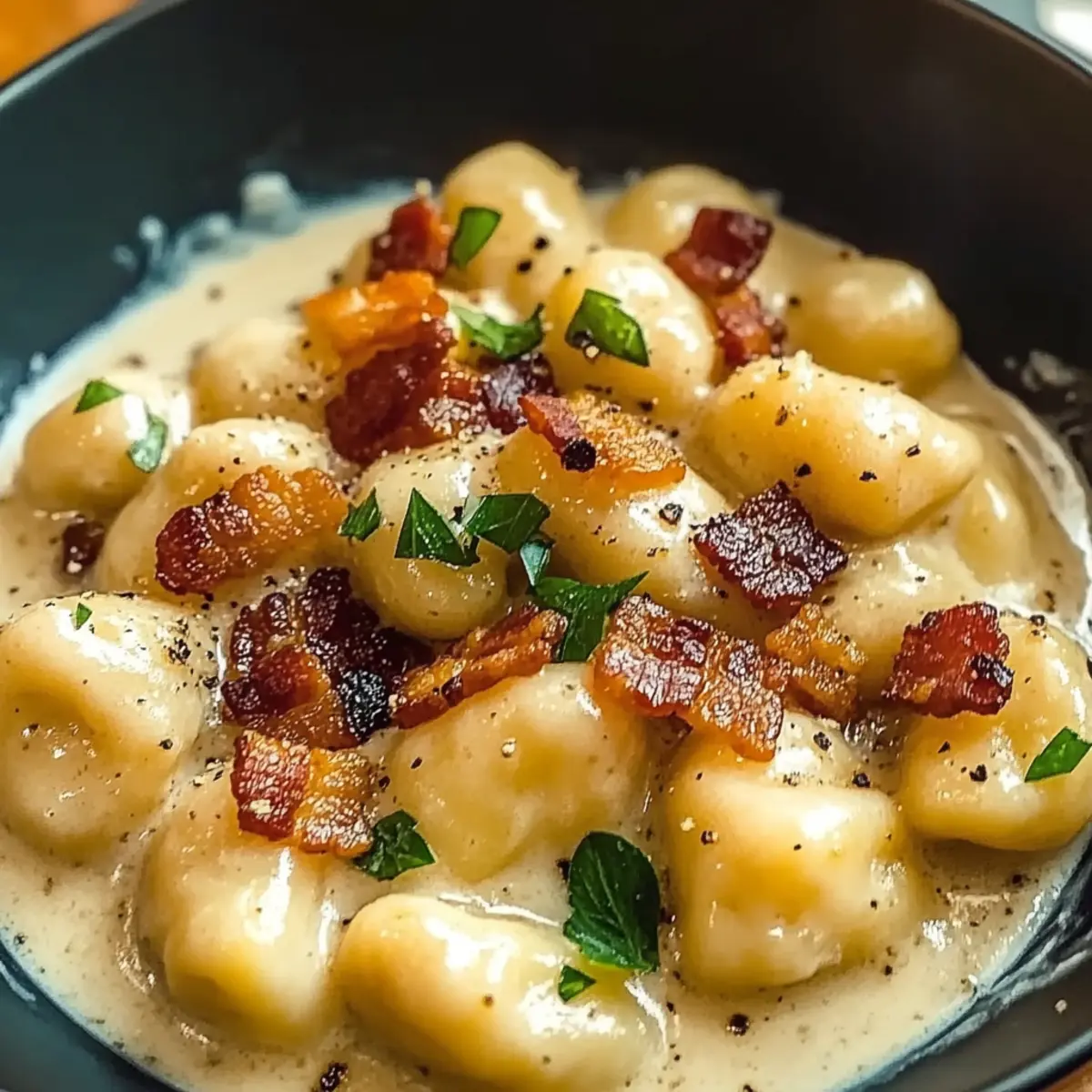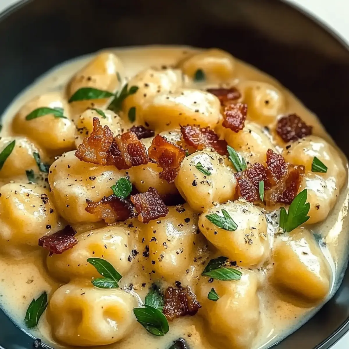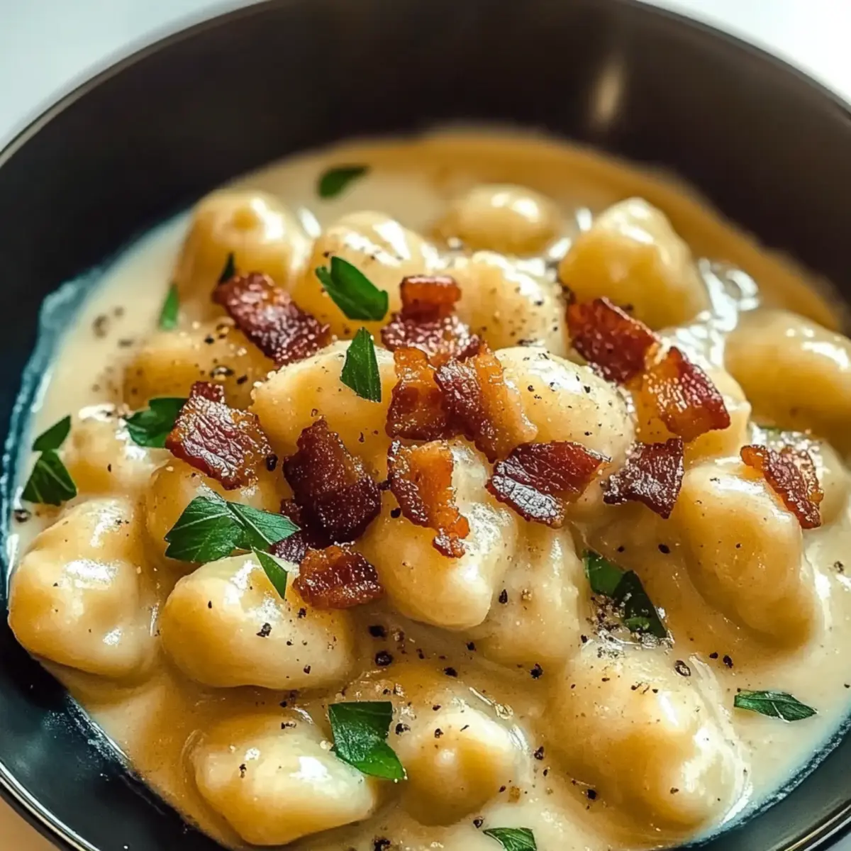 Jump to Recipe Print RecipeAs the aroma of roasted garlic fills the kitchen, you might find yourself swept away to a cozy Italian trattoria, where every dish tells a story. That’s exactly the experience you can create with my Roasted Garlic Cream Sauce with Gnocchi—a comforting one-pan meal that feels fancy yet is incredibly simple to whip up. Perfect for a busy weeknight or when you have friends over, this creamy delight comes together with minimal cleanup and offers plenty of room for customization. Whether you’re looking to jazz it up with crispy bacon, or keep it plant-based with vegan twists, this dish is a canvas for your culinary creativity. Are you ready to dive into a bowl of warmth and flavor that you’ll want to make again and again? Why is this recipe a must-try? Comforting and Cozy: This Roasted Garlic Cream Sauce with Gnocchi is like a warm hug in a bowl—perfect for those chilly nights when all you want is something deliciously satisfying. Customizable Delights: Tailor the dish! Whether you add crispy bacon, sautéed spinach, or keep it vegan with tempeh, the options are endless. One-Pan Wonder: You’ll love the ease of preparing a gourmet meal with minimal cleanup, making it a go-to for busy evenings. Rich, Creamy Flavor: The luscious sauce, infused with sweet roasted garlic, offers a depth of flavor that elevates your home cooking game. Diet-Friendly Options: With suggestions for various dietary preferences, everyone can enjoy their bowl of goodness, be it with Pumpkin Cream Cheese or a comforting Cheddar Garlic Herb side! Roasted Garlic Cream Sauce Ingredients For the Sauce • Garlic – A key player, bringing a sweet and deep flavor; roast it for that irresistible taste. • Unsalted Butter – Adds richness and smoothness to the sauce; opt for vegan butter for a plant-based alternative. • Heavy Cream – Ensures a luscious, creamy consistency; consider coconut cream for a lighter, dairy-free version. • Chicken Broth – Forms the savory base; swap for vegetable broth if keeping it vegetarian. • Salt – Enhances all the flavors; adjust according to taste. For the Gnocchi • Gnocchi – The delicious vessel for the sauce; whether store-bought or freshly made, they’ll soak up the flavors beautifully. For the Topping • Bacon – A delicious crispy crunch; replace with crispy tempeh for a vegetarian twist. • Fresh Parsley – Adds brightness and freshness; feel free to switch it with basil for a different aroma. • Parmesan Cheese – For an umami boost; nutritional yeast works wonders in vegan variations. This Roasted Garlic Cream Sauce with Gnocchi brings comfort right to your dining table, ready to be made your own! Step‑by‑Step Instructions for Roasted Garlic Cream Sauce with Gnocchi Step 1: Preheat Oven Start by preheating your oven to 400°F (200°C). While the oven heats up, gather your ingredients. This initial step is crucial as it sets the right temperature for roasting the garlic, ensuring it becomes sweet and caramelized, which is essential for your Roasted Garlic Cream Sauce with Gnocchi. Step 2: Roast Garlic Take a head of garlic, slice off the top to expose the cloves, and drizzle it with olive oil and a sprinkle of salt. Wrap the garlic tightly in aluminum foil and place it in the oven. Roast for about 50 minutes, until the cloves are soft and fragrant, signaling that they’re ready to infuse your sauce with a rich depth of flavor. Step 3: Cook Bacon While the garlic roasts, heat a skillet over medium heat and add your chopped bacon. Cook until it’s crispy, about 6-8 minutes, stirring occasionally to ensure even cooking. Once crispy, transfer the bacon to a paper towel-lined plate to absorb excess grease, leaving the flavorful drippings in the pan for the next step. Step 4: Prepare Sauce Base In the same skillet with the bacon drippings, add unsalted butter and let it melt over medium heat. Once melted, add your finely diced shallot and sauté for about 2 minutes until translucent. This aromatic base will enhance your Roasted Garlic Cream Sauce, providing a lovely depth to the flavors. Step 5: Combine Ingredients Once the garlic is roasted and slightly cooled, squeeze the cloves into the skillet, discarding the skins. Pour in the chicken broth and heavy cream, stirring to combine. Season with salt and pepper, then bring the mixture to a gentle simmer for 5-7 minutes, allowing the flavors to meld beautifully into your sauce. Step 6: Cook Gnocchi Add your gnocchi directly into the simmering sauce, making sure they’re well-coated. Cook for about 8 minutes until the gnocchi are tender and start to float to the top. This indicates they are ready to absorb all that delicious flavor from the roasted garlic cream sauce, bringing your dish together. Step 7: Finish Sauce As soon as the gnocchi are cooked, reduce the heat to low and stir in the fresh parsley and grated Parmesan. Mix until the cheese is completely melted and incorporated into the sauce. Finally, fold in the crispy bacon bits, allowing them to distribute evenly throughout the gnocchi. Your Roasted Garlic Cream Sauce with Gnocchi is now ready to be served! What to Serve with Creamy Roasted Garlic Gnocchi Elevate your meal experience with delightful pairings that enhance the rich flavors of roasted garlic and creamy goodness. Garlic Bread: Perfect for sopping up the luscious sauce, warm, buttery garlic bread adds comforting crunch. Simple Green Salad: A fresh mix of greens dressed lightly with lemon vinaigrette balances the creaminess beautifully, offering a refreshing crunch. Sautéed Spinach: This simple side can be made in minutes; its light, earthy flavor complements the richness of the gnocchi. Roasted Vegetables: Seasoned root vegetables caramelized in the oven add a sweet, earthy counterpoint to your creamy dish, bringing out the roasted garlic’s depth. Crispy Polenta Fries: The crunchy exterior and soft interior of polenta fries create a lovely textural contrast
