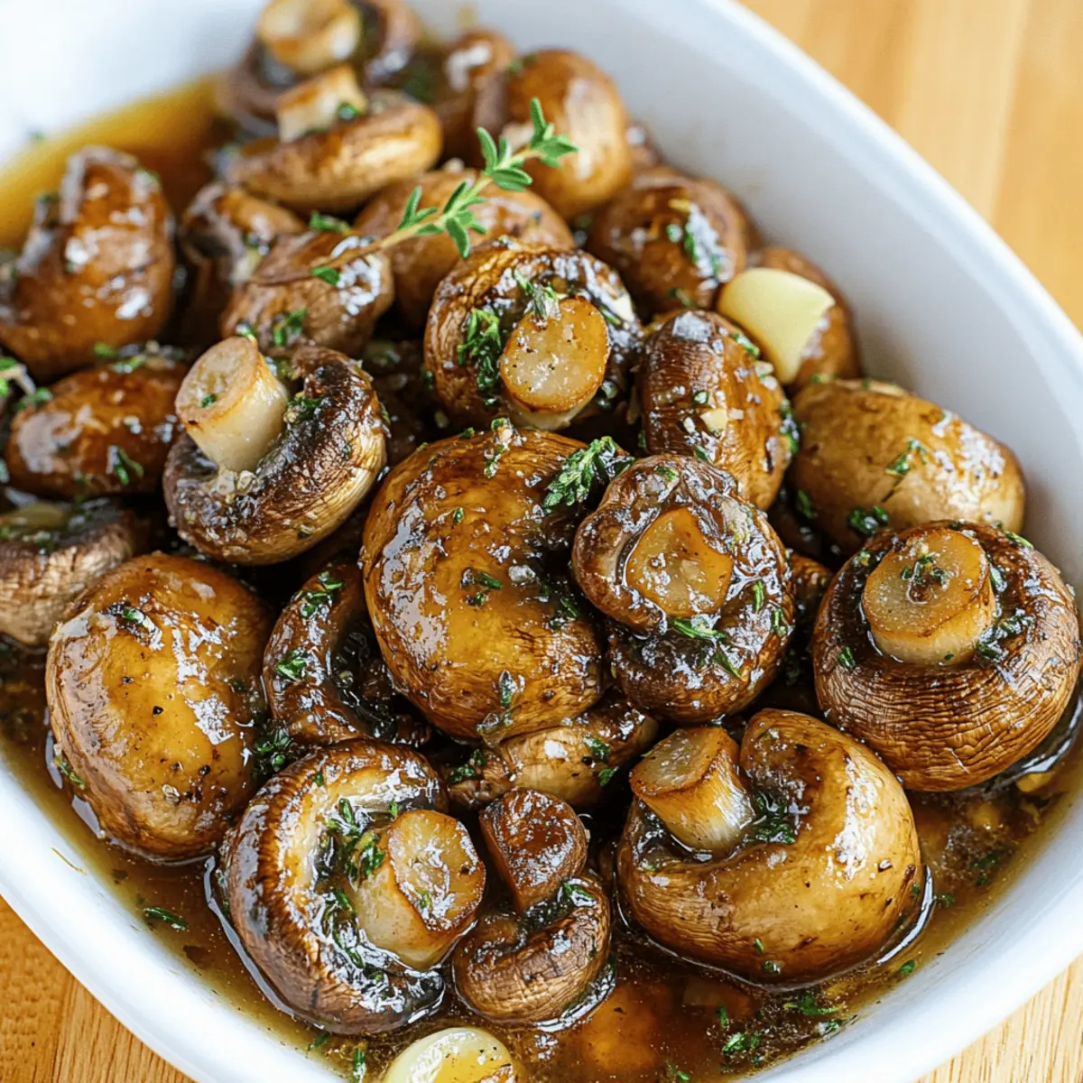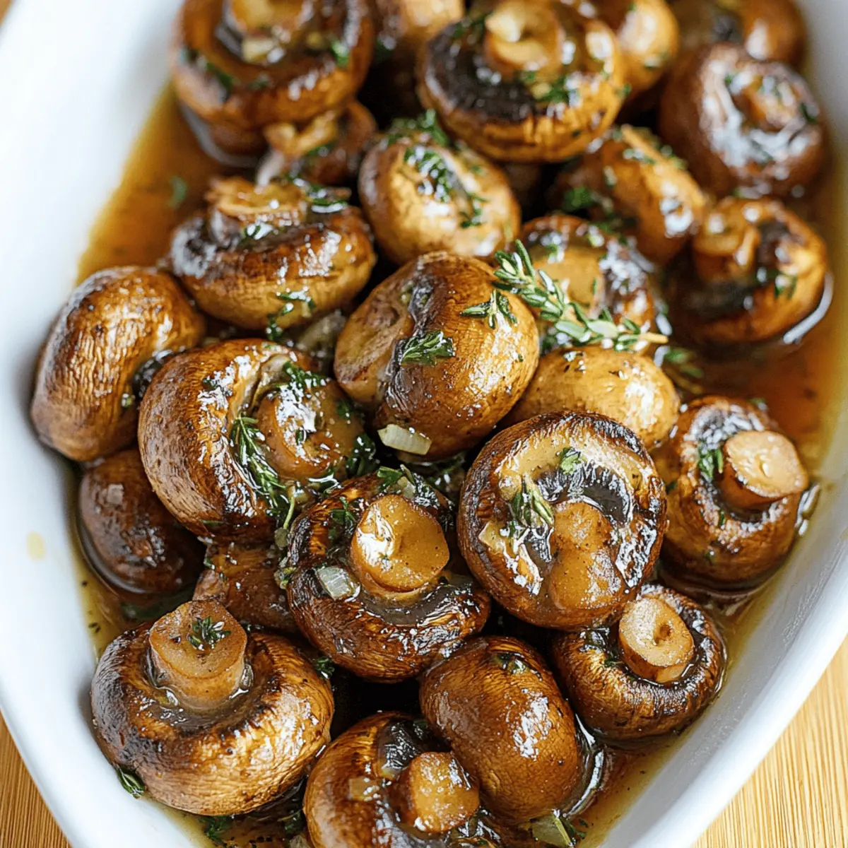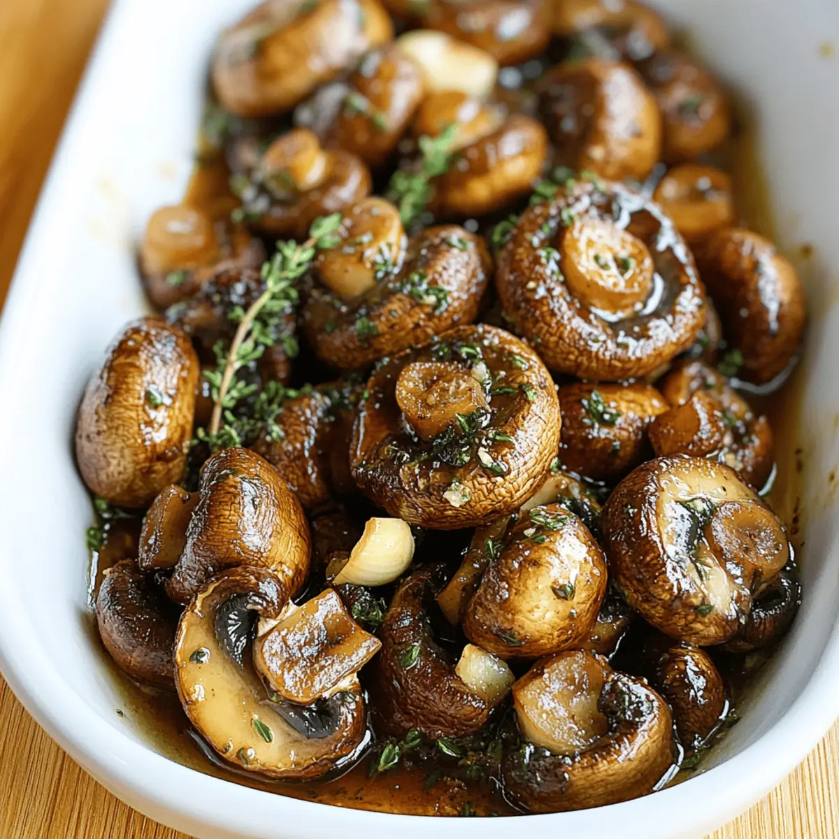 Jump to Recipe Print RecipeThe aroma of sizzling garlic and thyme wafted through my kitchen like a warm embrace, instantly shifting my mood into culinary bliss. Today, I’m excited to share one of my all-time favorites: Roasted Mushrooms in Browned Butter, Garlic, and Thyme Sauce. This dish is not only a quick and easy side to whip up, but it also elevates any meal—from an elegant dinner party to a cozy weeknight gathering. Each mushroom is enveloped in a nutty, rich sauce that makes for an irresistible companion to almost any main dish. With just a handful of ingredients and minimal prep time, this vegetarian and gluten-free delight is perfect for anyone longing for homemade goodness without the hassle. Curious about how to master this delectable recipe? Let’s get roasting! Why Are Roasted Mushrooms Irresistible? Flavor Explosion: The combination of browned butter, garlic, and thyme creates an unforgettable savory experience that complements any meal. Quick and Easy: With minimal prep and cooking time, this recipe is perfect for anyone who craves homemade comfort without the fuss. Versatile Side Dish: Pair these mushrooms with roasted chicken or beef, or serve them as a star in a vegetarian spread alongside grains for a memorable dish. Vegetarian and Gluten-Free: Enjoy delicious flavors without compromising dietary needs, making it suitable for a variety of guests. Crowd-Pleaser: Whether it’s a holiday gathering or a casual dinner, these roasted mushrooms will impress your guests and have them asking for seconds! Don’t miss out on the heavenly taste—this recipe pairs beautifully with dishes like Garlic Shrimp Over Mashed Potatoes or even Cheddar Garlic Herb Potato Soup. Get ready to savor every bite! Roasted Mushrooms in Browned Butter Ingredients • Here’s everything you need to create your own Roasted Mushrooms in Browned Butter, Garlic, and Thyme Sauce. For the Mushrooms • Mushrooms – 1 pound (button, cremini, or other) – The heart of the dish, packed with umami flavor, just make sure to clean them well! • Oil – 1 tablespoon – This helps coat the mushrooms for even roasting; olive oil works wonderfully as a substitute. • Salt & Pepper – To taste – Enhances the overall flavor profile; adjust according to your preference. For the Sauce • Butter – 1/4 cup – Provides a rich base for the browned butter sauce; using unsalted allows you to control the sodium. • Garlic – 2 cloves, chopped – Infuses the dish with savory depth; opt for fresh garlic to bring the best flavor. • Thyme – 1 teaspoon, chopped – Adds an aromatic touch; fresh rosemary or sage can be lovely alternatives. • Lemon Juice – 1 tablespoon – Brightens the richness of the sauce; freshly squeezed is ideal for the best taste. Step‑by‑Step Instructions for Roasted Mushrooms in a Browned Butter, Garlic and Thyme Sauce Step 1: Preheat the Oven Begin by preheating your oven to 400°F (200°C). This temperature is essential for achieving perfectly roasted mushrooms. While the oven heats, grab a baking sheet and line it with parchment paper for easy cleanup. The parchment will help prevent the mushrooms from sticking as they roast to golden perfection. Step 2: Prepare the Mushrooms Clean one pound of mushrooms thoroughly under running water, wiping any dirt away. Pat them dry with a paper towel to ensure they roast beautifully. In a large bowl, toss the cleaned mushrooms with one tablespoon of oil, salt, and pepper, ensuring each mushroom is well-coated—this will enhance flavor and help achieve a lovely brown color during roasting. Step 3: Roast the Mushrooms Spread the seasoned mushrooms in a single layer across the prepared baking sheet. Place them in the preheated oven and let them roast for about 20 minutes. Stir the mushrooms halfway through cooking until they are deeply caramelized and tender, giving them that rich, savory flavor characteristic of Roasted Mushrooms in a Browned Butter, Garlic and Thyme Sauce. Step 4: Brown the Butter While the mushrooms roast, melt one-fourth cup of unsalted butter in a skillet over medium heat. As the butter melts, watch closely for it to turn a light hazelnut brown—this process typically takes about 5-6 minutes. The butter will begin to foam and develop a nutty aroma, signaling that it’s time to add the next ingredients. Step 5: Add Garlic and Herbs Remove the skillet from heat as soon as the butter reaches that beautiful brown hue. Quickly stir in two chopped garlic cloves, one teaspoon of fresh thyme, and one tablespoon of freshly squeezed lemon juice. Mix well, allowing the residual heat to bring out the aromatic flavors without burning the garlic—this step enhances the sauce that will coat your roasted mushrooms. Step 6: Combine and Serve Once the mushrooms are perfectly roasted, carefully transfer them to the skillet with the browned butter sauce. Gently toss the mushrooms in the sauce, ensuring each piece is well-coated. Taste and adjust the seasoning with additional salt and pepper if needed. Serve the Roasted Mushrooms in a Browned Butter, Garlic and Thyme Sauce immediately for the best texture and flavor experience. What to Serve with Roasted Mushrooms in Browned Butter, Garlic, and Thyme Sauce Create a meal that tantalizes the senses with delightful companions for your savory roasted mushrooms. Creamy Polenta: Silky, soft, and subtly flavored, it provides a perfect base for soaking up the rich sauce from the mushrooms. Herbed Quinoa: Light and fluffy, this nutritious grain adds a wonderful nuttiness that complements the earthiness of the mushrooms. Grilled Asparagus: Crisp-tender and slightly charred, this vegetable adds freshness and a pop of color to your plate. Lemon Herb Rice: The bright citrus notes uplift the dish, harmonizing with the lemon juice in the mushroom sauce for a cohesive flavor experience. Garlic Parmesan Bread: This warm, crusty bread is ideal for mopping up any leftover sauce, ensuring you savor 