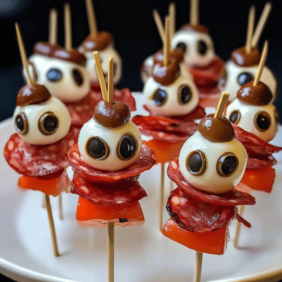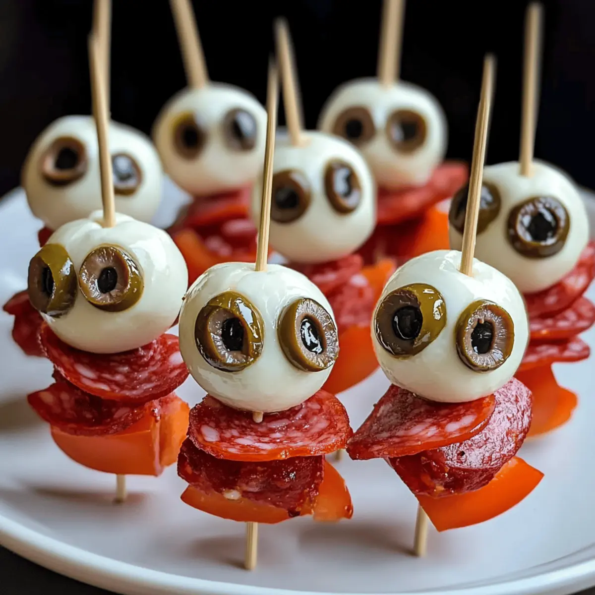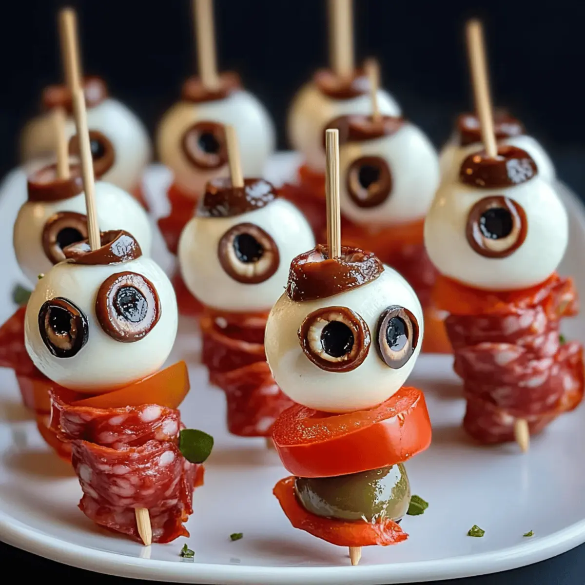 These Creepy Skewered Salami Eyeballs are a playful and delicious Halloween treat, combining mozzarella, pepperoni, and olives for a spooky appetizer.