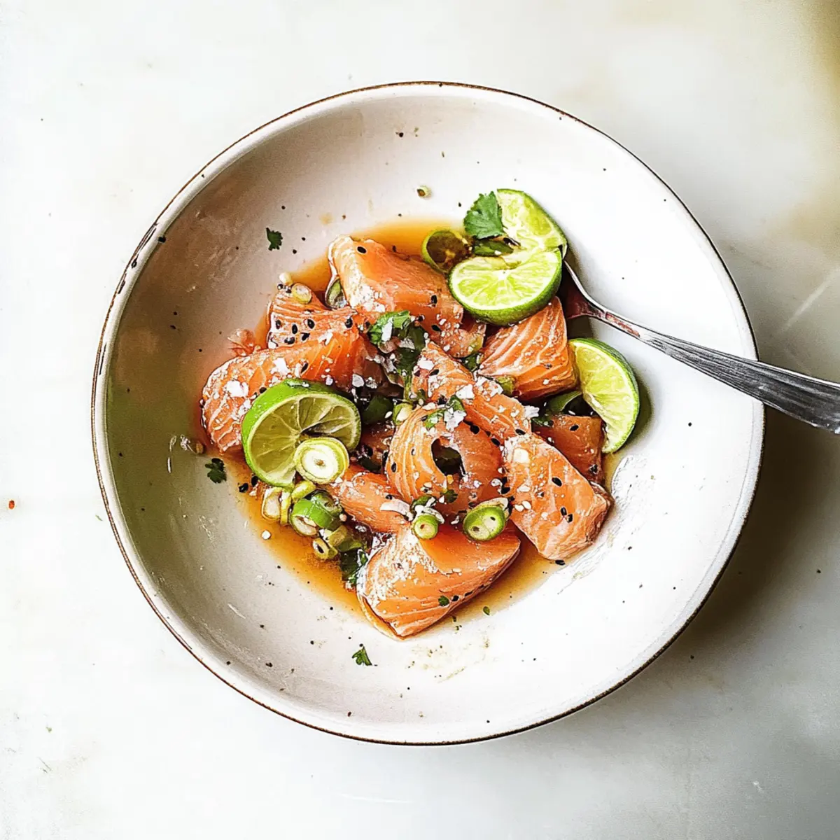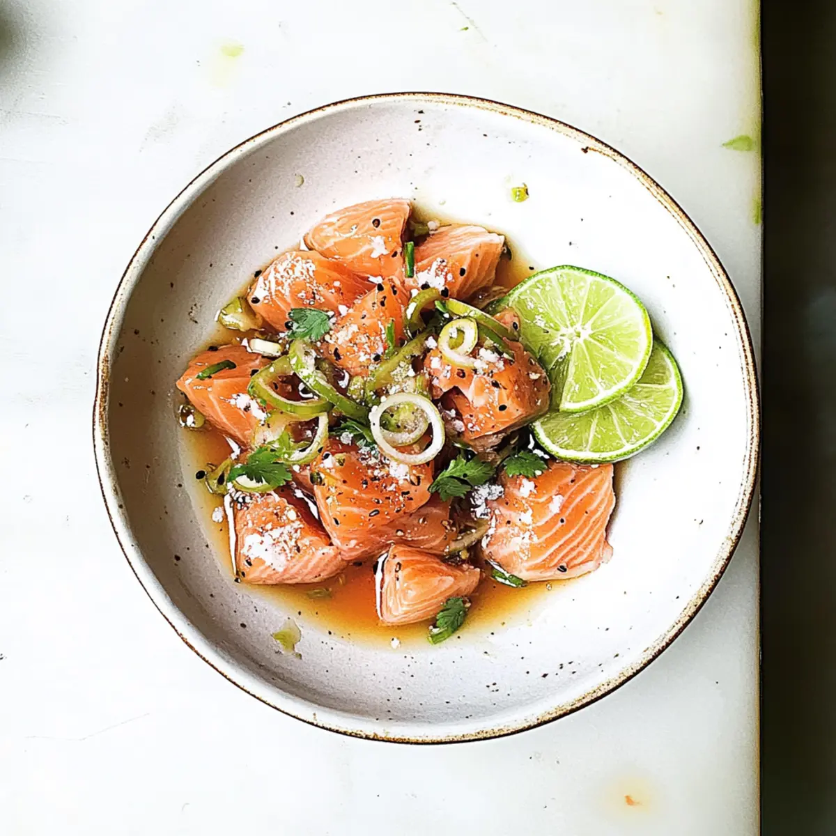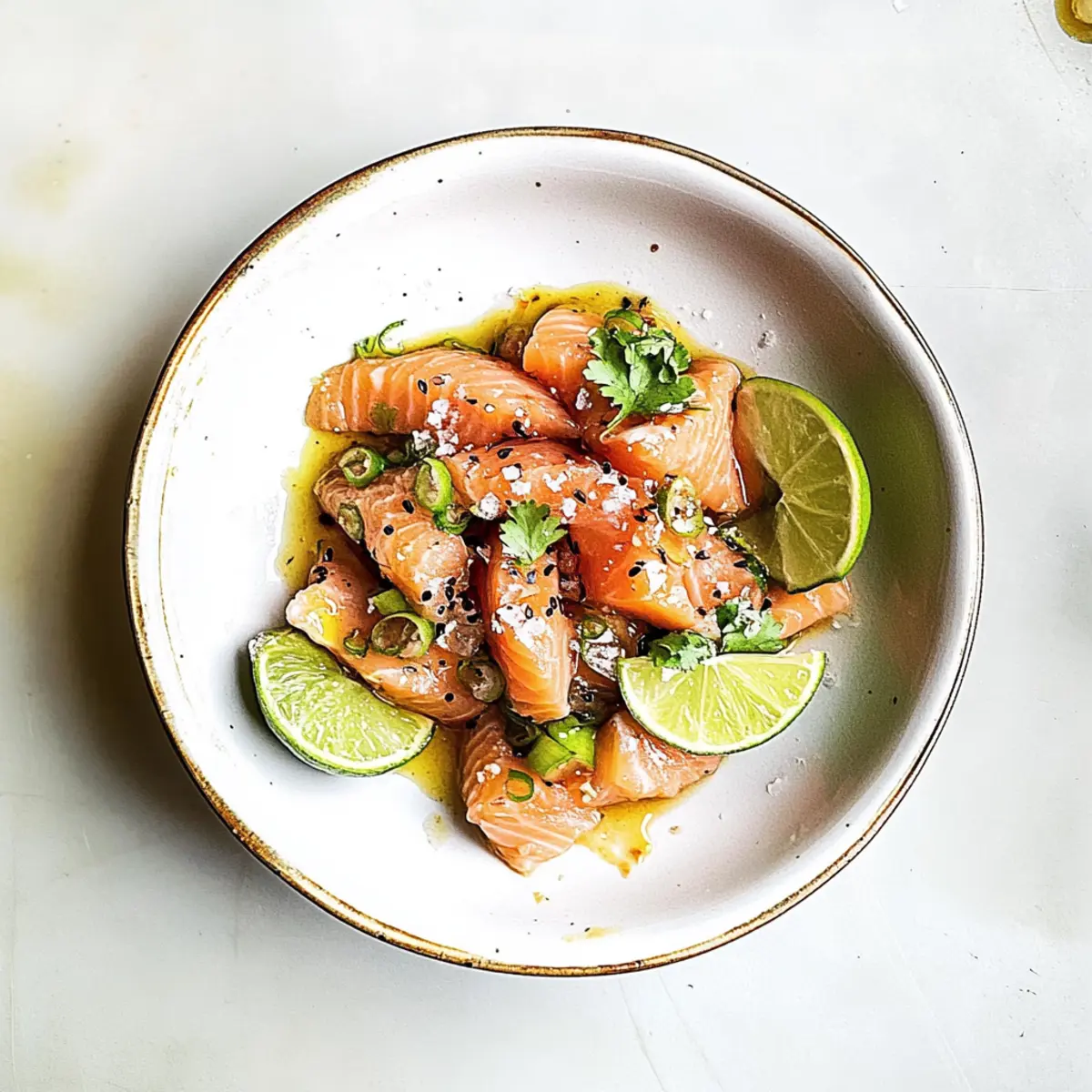 Jump to Recipe Print RecipeAs I stood in my kitchen, the faint aroma of garlic and ginger filled the air, instantly whisking me away to Japan’s bustling street markets. That’s when the idea struck—why not create my own stunning Salmon Crudo with Soy Sesame Dressing? This dish is a celebration of fresh, sushi-grade salmon, elegantly paired with a zesty dressing that harmonizes bright citrus flavors with the warmth of sesame and ginger. Best of all, it comes together in just 10 minutes, making it a quick recipe that’s perfect for impressing both family and friends. With no cooking involved, you’ll find joy in every slice, whether served as an appetizer or a light meal. Ready to discover how easy it is to elevate your dining experience? Let’s dive in! Why is Salmon Crudo a Must-Try? Quick Preparation: This Salmon Crudo is on your table in just 10 minutes—perfect for those busy evenings! Fresh Ingredients: With sushi-grade salmon and vibrant toppings, each bite bursts with freshness that outshines any fast food. No Cooking Required: Enjoy the simplicity of putting together a gourmet dish without turning on the stove. Flavor Explosion: The zesty soy sesame dressing, combined with garlic and ginger, creates an irresistible flavor combination you won’t forget. Versatile Serving: Perfect as an appetizer or a light meal, this dish is sure to impress your guests. Pair it with a refreshing cucumber salad for a complete experience! Healthy and Delicious: Not only is this dish a crowd-pleaser, but it also brings healthy fats and protein to your meal. You might fall in love with making other delightful seafood recipes like Honey Garlic Salmon Bites after trying this! Salmon Crudo with Soy Sesame Dressing Ingredients • Gather everything you need for a fresh and vibrant dish! For the Crudo Sushi-Grade Salmon – Choose high-quality salmon for the best flavor and safety. Shallot – Adds a lovely mild sweetness; can be swapped with red onion if desired. Lime – Essential for brightness; always opt for fresh lime juice. Flaky Salt – Enhances the dish’s flavors; kosher salt also works well. Freshly Grated Black Pepper – Freshly ground pepper gives the best spice and aroma. Chopped Cilantro Leaves – Offers a fresh herbaceous touch, but can be omitted for a simpler flavor. For the Soy Sesame Dressing Garlic Clove – Minced for a punch of flavor; don’t skip this! Grated Ginger – Fresh ginger adds warmth and depth to the dressing. Olive Oil – Helps emulsify the dressing; avocado oil can be a great alternative. Toasted Sesame Oil – Adds a rich, nutty flavor that’s crucial for authentic taste. Low Sodium Soy Sauce – Keeps the sodium level in check; tamari is a gluten-free option. Mirin – Infuses sweetness; if unavailable, mix rice vinegar with a pinch of sugar. Sriracha – For a spicy kick; adjust the amount according to your heat preference. Elevate your moments with this Salmon Crudo with Soy Sesame Dressing recipe, where freshness and flavor meet in a delightful harmony! Step‑by‑Step Instructions for Salmon Crudo with Soy Sesame Dressing Step 1: Prepare the Dressing In a medium bowl, combine 1 minced garlic clove, 1 tablespoon of freshly grated ginger, 2 tablespoons of olive oil, and 1 tablespoon each of toasted sesame oil and low sodium soy sauce. Add 1 tablespoon of mirin and a drizzle of sriracha for heat. Whisk together until well blended and emulsified, about 1–2 minutes. Set aside to let the flavors meld while you prepare the salmon. Step 2: Plate the Salmon Select sushi-grade salmon and slice it thinly into even pieces, ideally about ¼ inch thick for the best texture. On a large serving plate, arrange the salmon slices in an attractive overlapping pattern, ensuring all the beautiful pink flesh is visible. The salmon should glisten when arranged correctly, showing off its freshness and quality—a crucial element in this Salmon Crudo. Step 3: Top with Shallots Take a shallot and slice it very thinly, aiming for paper-thin layers that release mild sweetness. Scatter the shallot slices evenly over the salmon, allowing them to intermingle with the fish’s richness. The translucent shallots will add a lovely visual appeal and flavor contrast, making the dish not only delicious but also stunning to behold. Step 4: Dress the Dish Using a small spoon or a drizzle bottle, carefully pour the prepared soy sesame dressing over the arranged salmon. Aim to cover each piece lightly, allowing the dressing to pool slightly around the salmon on the plate. This dressing will enhance the vibrant colors and add an enticing sheen, promising a burst of flavor in every bite of your Salmon Crudo. Step 5: Finish & Serve Cut a fresh lime in half and squeeze its juice generously over the entire dish, adding brightness to the rich flavors. Finish off with a light sprinkling of flaky salt and freshly grated black pepper for a delightful crunch. Garnish with chopped cilantro leaves, which will provide a fresh herbaceous note, leading to a vibrant and refreshing presentation, perfect for serving immediately to impress your guests. What to Serve with Salmon Crudo with Soy Sesame Dressing Elevate your dining experience with delightful pairings that accentuate this fresh and zesty dish. Crispy Rice Crackers: Light, crunchy crackers complement the tender salmon, adding a satisfying texture that enhances each bite. They’re perfect for scooping and make a fun appetizer! Refreshing Cucumber Salad: A simple salad with thinly sliced cucumbers, lime dressing, and a sprinkle of sesame seeds offers a crisp contrast to the richness of the salmon, keeping your palate refreshed. Avocado Toast: Creamy avocado on toasted bread adds a luxurious dimension, harmonizing beautifully with the flavors of the salmon crudo and offering a hearty base. Chilled White Wine: A glass of dry Riesling or Sauvignon Blanc can elevate the meal, with their crisp acidity enhancing the overall freshness of the dish. Miso