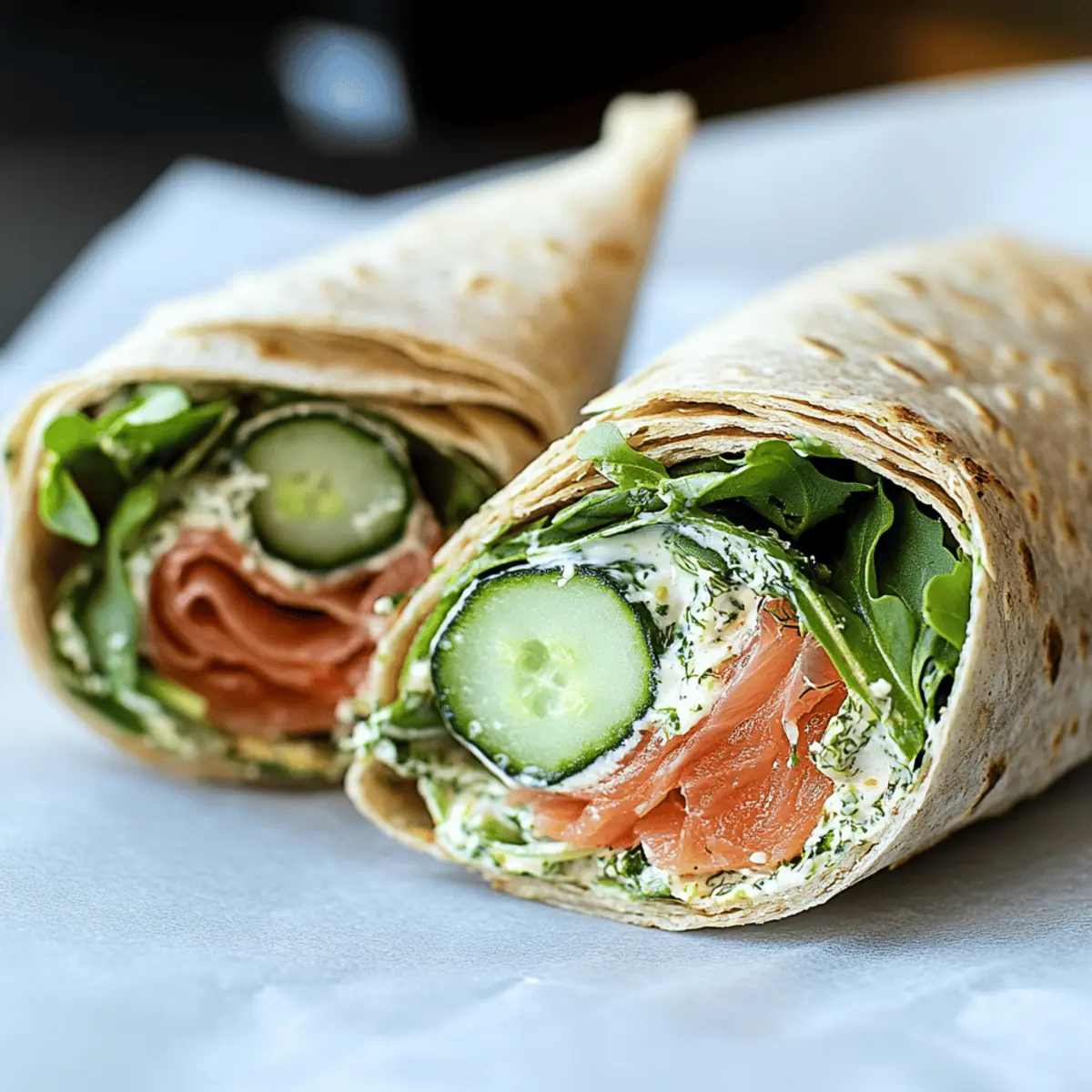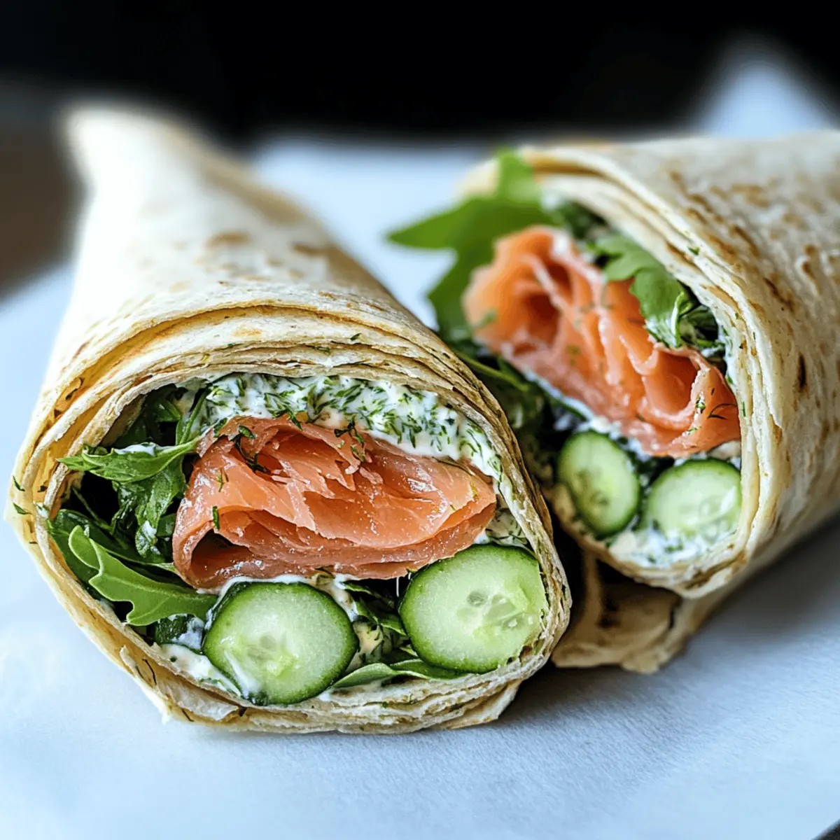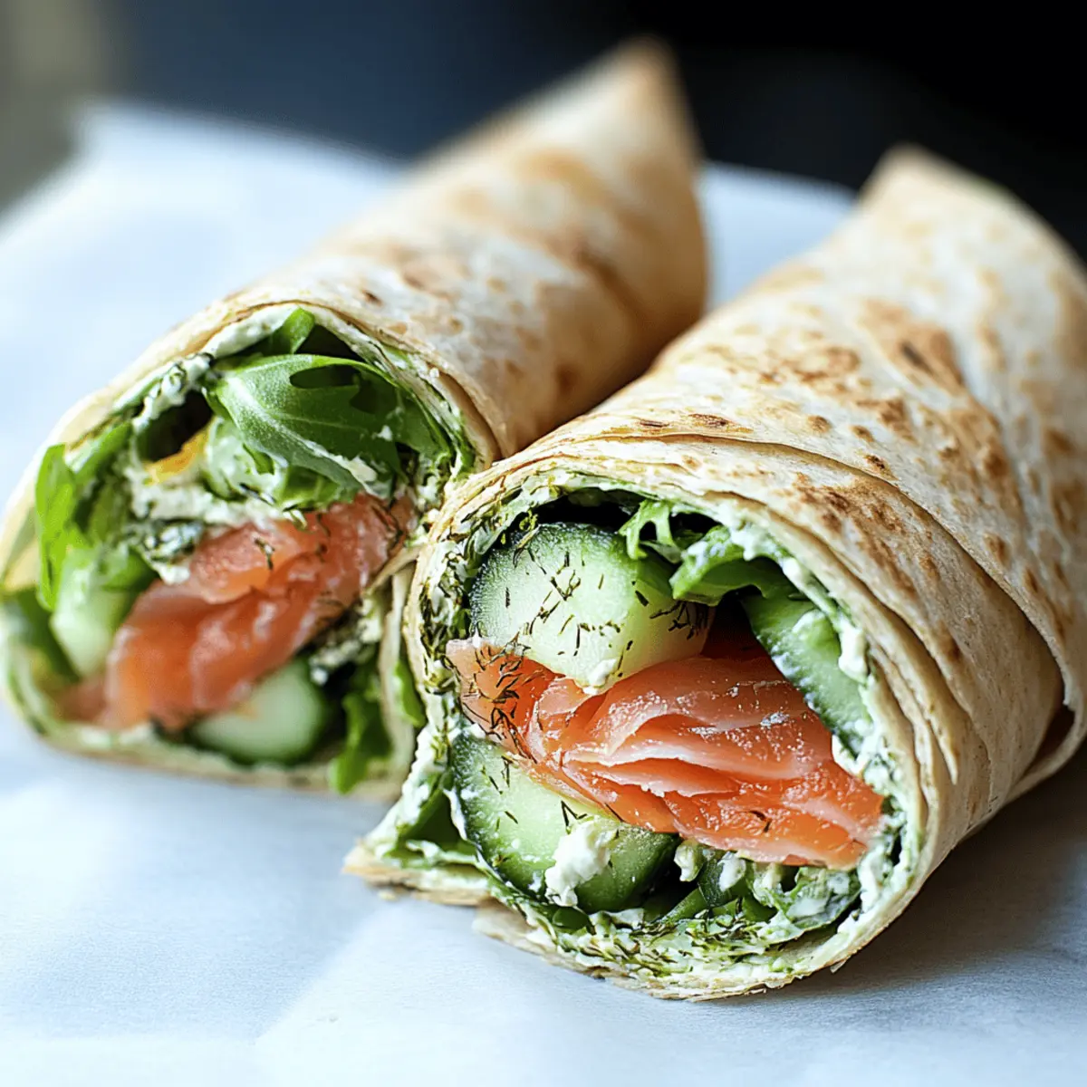 Jump to Recipe Print RecipeWhile scrolling through my favorite recipe sites, I stumbled upon something that changed my lunchtime game: the Salmon Wrap. Just the thought of smoky, tender salmon paired with tangy lemon-dill cream cheese and fresh veggies brings a smile to my face. This healthy Salmon Wrap not only tastes gourmet but is also a breeze to prepare, making it the perfect quick lunch solution for busy days. It’s light enough to keep you feeling energized, yet indulgent enough to treat yourself. So, whether you’re at work or enjoying a picnic, this wrap will impress your taste buds and leave you craving more. Curious how to bring this delightful wrap to your table? Let’s get started! Why is this Salmon Wrap a must-try? Simplicity at Its Best: This wrap comes together in just minutes, making it a perfect choice for lunch on-the-go. Rich, Flavorful Experience: The combination of smoked salmon and zingy lemon-dill cream cheese creates a taste that feels indulgent while being healthy. Versatile Ingredients: Customize it with your favorite greens or proteins; swap in avocados or bell peppers for an extra twist! Crowd-Pleasing Appeal: Whether made for yourself or guests, it’s a delightful dish that’s sure to impress. For more salmon inspirations, check out my Honey Garlic Salmon or Honey Pineapple Salmon. Easy to Prepare Ahead: These wraps can be made in advance and stored for up to a day, keeping your meal prep efficient! Salmon Wrap Ingredients • Create a delightful Salmon Wrap in no time with these fresh and healthy ingredients! For the Wrap Whole Wheat Lavash – Serves as a hearty and nutritious base; feel free to substitute with whole grain tortillas for a different flavor. Smoked Salmon – Offers a rich, savory taste, essential for your Salmon Wrap; can be swapped with cooked salmon or tuna for variety. For the Cream Cheese Spread Lemon-Dill Cream Cheese – Adds creaminess and brightness; if unavailable, mix plain cream cheese with lemon juice and dill for a homemade alternative. For the Freshness Arugula – Provides a peppery taste and a boost of nutrients; you can also opt for spinach or mixed greens instead. Alfalfa Sprouts – Contributes crunch and freshness; optional, but try replacing with shredded lettuce or cucumber for a delightful texture. Persian Cucumber – Delivers a cool and sweet crunch; feel free to use regular cucumber or shredded carrots if preferred. Step‑by‑Step Instructions for Salmon Wrap Step 1: Prepare the Cream Cheese Spread In a medium bowl, combine 8 ounces of softened lemon-dill cream cheese with the juice of half a lemon and a tablespoon of fresh dill. Use a handheld mixer or a spatula to blend until the mixture is smooth and creamy. This delicious spread will add a zesty flavor to your Salmon Wrap, enhancing each bite with its vibrant taste. Step 2: Assemble the Wrap Lay a piece of whole wheat lavash flat on a clean surface or cutting board. Generously spread about half of the lemon-dill cream cheese mixture across the lavash, leaving about one inch around the edges. Next, layer on 4 ounces of smoked salmon evenly, followed by a handful of arugula, a sprinkle of alfalfa sprouts, and thin slices of Persian cucumber for an extra crunch. Step 3: Roll the Wrap Starting from one end of the lavash, carefully roll it up tightly while tucking in the sides as you go. This method ensures that your filling remains secure within the wrap. Continue rolling until you reach the opposite end, creating a snug Salmon Wrap that’s ready to be sliced. Step 4: Slice & Serve Using a sharp knife, cut the wrap in half diagonally to create two manageable pieces. The radiant colors should be visible, showcasing the fresh ingredients inside. Serve immediately or wrap each piece in foil for a delicious meal on-the-go, perfect for a quick lunch during a busy day. Step 5: Optional Touches If desired, you can enhance your Salmon Wrap further by adding slices of avocado or a drizzle of hot sauce for a bit more flavor. Feel free to get creative with your ingredients or customize the recipe to your liking, as this Salmon Wrap is versatile and always a delight! What to Serve with Healthy Salmon Wrap with Lemon-Dill Cream Cheese A perfect meal pairing can elevate your Salmon Wrap experience to new heights! Creamy Mashed Potatoes: These fluffy potatoes offer a comforting contrast to the crisp textures and tangy flavors of the wrap. Crispy Sweet Potato Fries: A hint of sweetness and crunch pairs beautifully with the savory smokiness of the salmon. Quinoa Salad: A light, protein-packed side with fresh veggies adds a wholesome touch, complementing the wrap’s vibrant tastes. Fresh Fruit Salad: A refreshing mix of seasonal fruits balances out the richness of the cream cheese and salmon. Roasted Asparagus: Tender, charred spears bring a lovely earthiness and are a wonderful contrast to the wrap’s creamy elements. Chilled White Wine: A chilled Sauvignon Blanc enhances the dining experience, offering refreshing acidity against the wrap’s savory flavors. Iced Green Tea: This subtly sweet beverage not only refreshes but also adds a light herbal note that complements the meal. Chocolate-Dipped Strawberries: For dessert, these indulgent treats provide a sweet finish that meshes perfectly with the wrap’s savory flavors. Greek Yogurt Dip: A tangy dip serves as a lovely accompaniment for veggie sticks, enhancing that fresh crunch you’re craving. Zucchini Noodles: Light, spiralized noodles drizzled with olive oil add an unexpected and delightful texture alongside the wrap. Expert Tips for the Best Salmon Wrap Soften Cream Cheese: Ensure your cream cheese is at room temperature for easy spreading. Cold cream cheese can make the assembly challenging. Tight Rolling: Roll the wrap tightly to prevent the filling from falling out. A snug wrap keeps everything intact until the last bite! Customize Wisely: While it’s tempting to add many ingredients, stick with the essentials