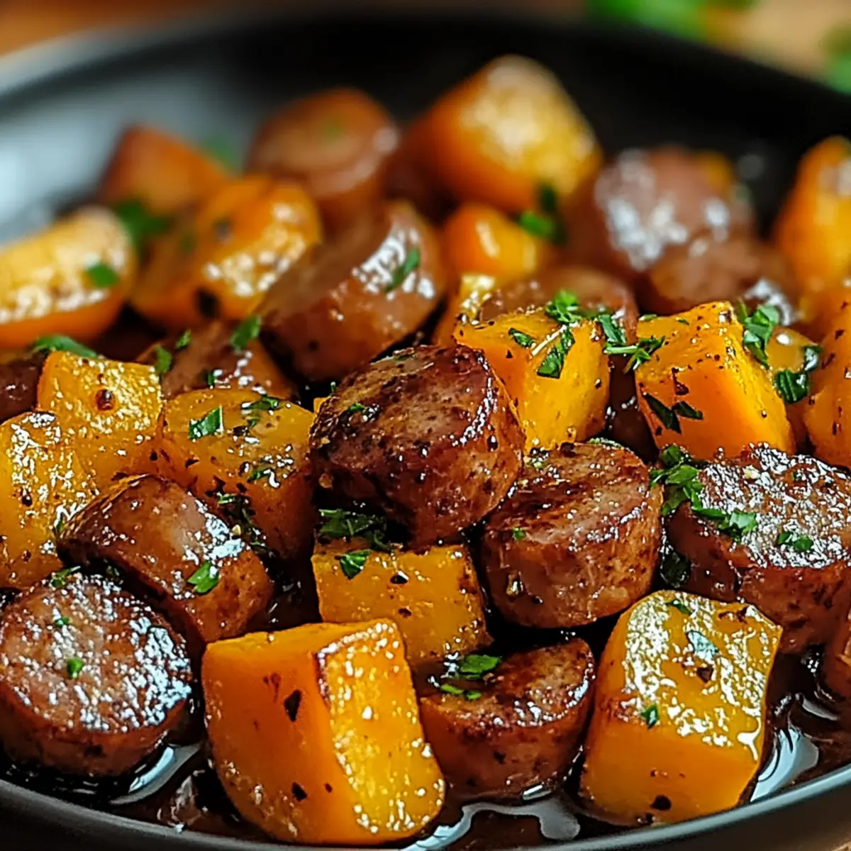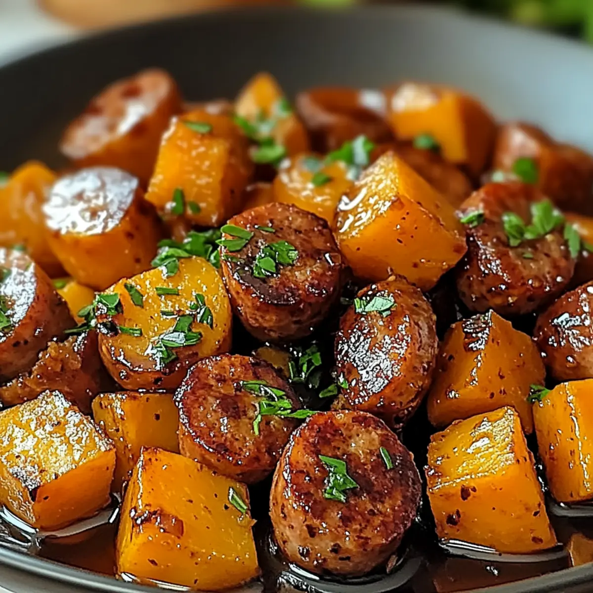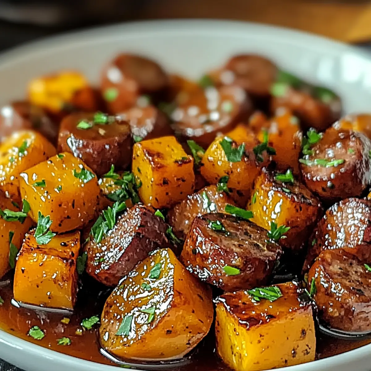 Jump to Recipe Print Recipe“Did you ever think a weeknight dinner could be this satisfying?” That’s what I found myself musing as I savored each bite of my Quick Sausage and Sweet Potatoes with Honey Garlic Sauce. In just 30 minutes, this delicious dish transforms simple ingredients into a meal that’s both comforting and vibrant. The combination of savory sausage and sweet, tender sweet potatoes, all enveloped in a sticky, aromatic glaze, is not just a feast for the palate; it’s also adaptable! Whether you’re looking for a quick meal or a gluten-free or vegan option, this recipe has you covered. Perfect for those busy nights when you crave something homemade yet effortless, it’s sure to be a hit with family and friends alike. Ready to discover how to effortlessly whip up this culinary gem? Let’s dive in! Why is this recipe a weeknight winner? Simplicity is key: With just a few ingredients and 30 minutes, you can create something truly special. Flavor-packed honey garlic sauce elevates the dish, making every bite a delightful experience. Adaptable to your preferences, you can customize the sausage and even substitute sweet potatoes with other veggies, like butternut squash or carrots. Crowd-pleaser alert! Perfect for family dinners or sharing with friends. Plus, it pairs beautifully with fresh salads or creamy mashed potatoes, like these Tater Tot Sausage or Cheesy Sausage Muffins for additional family favorites. You’ll find yourself returning to this recipe time and time again! Sausage and Sweet Potatoes Ingredients • Get ready to dive into a flavor journey! For the Dish Sausage – Full of savory protein; can substitute with chicken sausage or plant-based options for dietary needs. Sweet Potatoes – Adds natural sweetness and fiber; ensure they are peeled and cubed for even cooking. Honey – Provides sweetness and a rich flavor profile; swap with maple syrup for a vegan option. Garlic – Infuses wonderful aroma and flavor; fresh garlic cloves are best for optimal taste. Soy Sauce – Contributes depth and umami; use tamari for a gluten-free version. Olive Oil – Ideal for sautéing, enhancing flavor; can replace with any neutral oil. Paprika – Delivers smokiness and color; adjust as per your desired spice level. Salt and Pepper – Essential for seasoning and balancing flavors. Fresh Parsley – Used for garnish, imparting color and freshness to the dish. This vibrant combination makes for an irresistibly delicious meal featuring Sausage and Sweet Potatoes that your loved ones will ask for again and again! Step‑by‑Step Instructions for Sausage and Sweet Potatoes Step 1: Prepare Ingredients Start by peeling the sweet potatoes and cutting them into uniform 1-inch cubes to ensure even cooking. Mince the garlic cloves finely so they release their flavor during cooking. You’ll want to have everything ready before you start, making the cooking process of your Sausage and Sweet Potatoes smooth and hassle-free. Step 2: Cook Sausage In a large skillet, heat 2 tablespoons of olive oil over medium heat until it shimmers. Add the sausage, breaking it into pieces if necessary, and let it cook for 5-7 minutes. Stir occasionally until the sausage is nicely browned and crispy on the edges, imparting a delicious savory aroma that will make your kitchen smell irresistible. Step 3: Add Sweet Potatoes Once the sausage is golden and cooked through, add the cubed sweet potatoes to the skillet. Stir everything together and let them cook for an additional 5 minutes. You’ll notice the sweet potatoes starting to soften and get a slight golden hue, creating a beautiful contrast with the sausage while enhancing their natural sweetness. Step 4: Make the Sauce In a separate bowl, whisk together the honey, minced garlic, soy sauce, paprika, salt, and pepper until well combined. Pour this flavorful mixture over the sausage and sweet potato in the skillet, ensuring everything is evenly coated. The vibrant colors and aromas will tantalize your senses as the glaze begins to bubble and foreshadows the delicious dish to come. Step 5: Simmer Cover the skillet with a lid and reduce the heat to low. Allow the mixture to simmer for about 10 minutes, stirring occasionally, until the sweet potatoes are fork-tender. Keep an eye on it; the sauce should thicken slightly and cling beautifully to the sausage and sweet potatoes, creating a wonderful sticky glaze. Step 6: Serve Once the sweet potatoes are tender, remove the skillet from heat. Garnish your delightful Sausage and Sweet Potatoes with freshly chopped parsley for a pop of color and fresh flavor. Serve hot, and relish the combination of savory sausage and sweet, caramelized sweet potatoes enveloped in a luscious honey garlic sauce. How to Store and Freeze Sausage and Sweet Potatoes Fridge: Store leftovers in an airtight container for up to 3 days. Reheat gently on the stovetop or in the microwave, adding a splash of water for moisture. Freezer: For longer storage, freeze your Sausage and Sweet Potatoes in a sealed, freezer-safe container for up to 3 months. Thaw overnight in the fridge before reheating. Reheating: When ready to enjoy, reheat your dish in a skillet over low heat, stirring occasionally, until warmed through. Add a bit of water or broth to keep the sauce from drying out. Meal Prep: Pre-chop sweet potatoes and store them in the fridge for up to 3 days to streamline your cooking process when making Sausage and Sweet Potatoes. Sausage and Sweet Potatoes: Delicious Variations! Looking to personalize your Sausage and Sweet Potatoes with Honey Garlic Sauce? Here are some delightful twists and swaps to inspire your cooking! Sausage Swap: Use chicken sausage or turkey sausage for a leaner option that still packs a punch of flavor. Vegan Option: Replace honey with maple syrup for a completely plant-based dish that satisfies both sweet and savory cravings. Choose Your Sweet Potatoes: Try butternut squash or even carrots for a different t