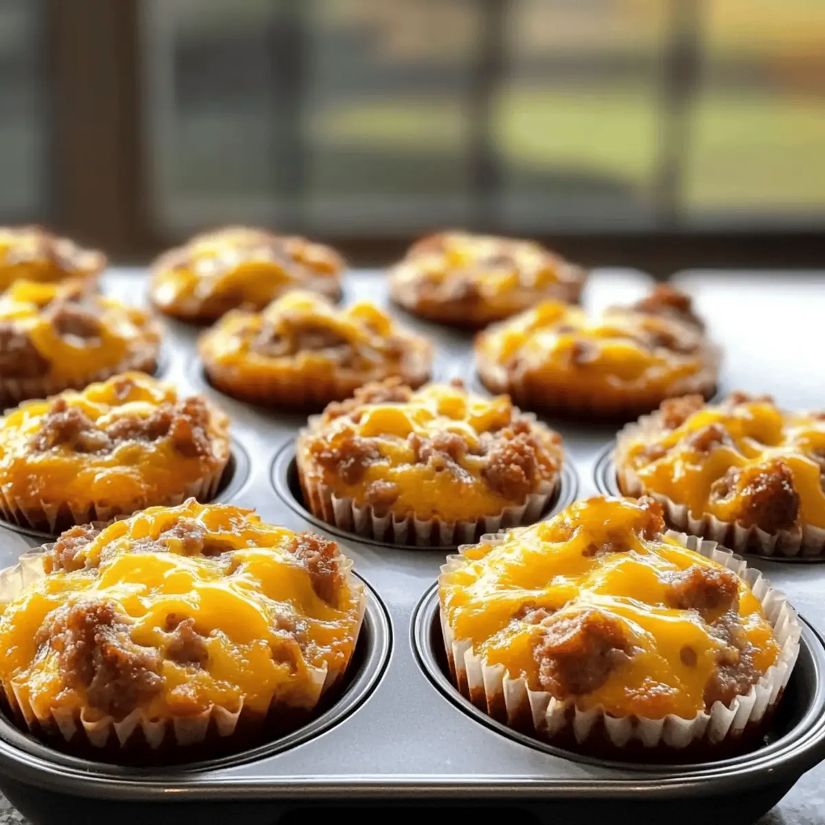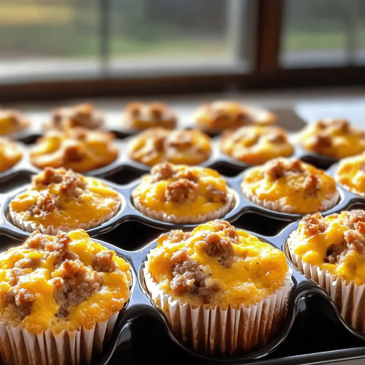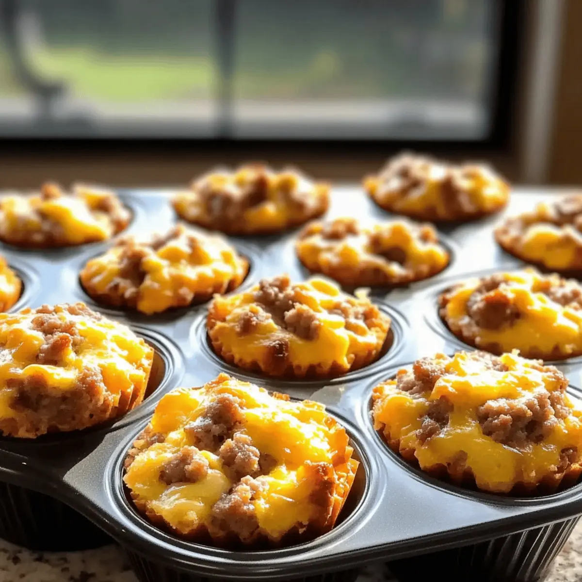 Jump to Recipe Print RecipeNothing beats the comforting aroma of fresh muffins wafting through the kitchen, especially when they’re packed with savory goodness. The moment those High-Protein Sausage, Egg, and Cheese Muffins come out of the oven, you can’t help but feel a sense of triumph—as if you’ve cracked the morning meal code! Not only are these delightful muffins perfect for those busy mornings, but they’re also a great way to sneak in a hearty dose of protein while keeping things low-carb. With just 35 minutes of prep, you’ll have flavorful, customizable bites that cater to your cravings and dietary needs. Plus, they make an excellent grab-and-go snack for whenever hunger strikes. Curious how to whip up this tasty breakfast staple? Let’s dive into the deliciousness! Why are these muffins a game-changer? Convenience at Its Best: These muffins are a perfect make-ahead option for busy mornings, allowing you to enjoy a nutritious breakfast on the go. Protein-Packed Goodness: With high-quality sausage and eggs, each muffin fuels your day, making them ideal for those following a low-carb or keto lifestyle. Customizable Delight: Feel free to experiment with different cheeses and vegetables to suit your taste buds—think spinach for a nutrient boost or pepper jack for a spicy kick! Crowd-Pleasing Snack: Whether you’re meal prepping for yourself or entertaining guests, these muffins are sure to impress. Pair with fresh fruit or a light salad for a balanced meal or snack. Quick to Make: In just 35 minutes, you can have these delightful treats baked and cooling on your countertop, ready to fuel your morning adventures! Dive deeper into customization with a recipe for Mango Muffins Passion for a fruity twist or try the comforting flavors in Apple Cinnamon Muffins for a warm breakfast experience! Sausage, Egg, and Cheese Muffin Ingredients For the Muffins • Cooking Spray – Prevents muffins from sticking to the tin; use generously or opt for muffin liners. • Sausage – Provides savory flavor and protein; substitute with turkey or plant-based sausage for lighter options. • Eggs – Binds the ingredients and adds richness; for a lighter version, swap whole eggs for egg whites (2 egg whites = 1 whole egg). • Cheese – Adds creaminess and rich flavor; try different cheeses like cheddar, mozzarella, or pepper jack for variety. • Vegetables (optional) – Enhances nutrition and taste; consider adding spinach, bell peppers, or mushrooms for extra goodness. These Sausage, Egg, and Cheese Muffins are not only a delicious way to start your day but also highly adaptable to fit your preferences! Step‑by‑Step Instructions for Sausage, Egg, and Cheese Muffins Step 1: Preheat the Oven Begin by preheating your oven to 350°F (175°C). This ensures a perfectly cooked muffin with a golden crust. While the oven warms up, gather all your ingredients and equip yourself with a muffin tin and cooking spray to prevent sticking. Step 2: Cook the Sausage In a skillet over medium heat, add your sausage and cook it until browned, stirring frequently for about 5-7 minutes. Drain the excess fat once the sausage is fully cooked, allowing it to cool slightly while you prepare the egg mixture. The sausage should be crumbly and well-browned to infuse the muffins with flavor. Step 3: Whisk the Eggs and Cheese In a large mixing bowl, crack in the eggs and whisk them until well combined. Add your choice of cheese to the eggs, whisking until smooth. This mixture should look creamy and luscious, setting a delicious base for your Sausage, Egg, and Cheese Muffins. Step 4: Mix in the Sausage Once the sausage has cooled a bit, fold it into the egg and cheese mixture. Ensure even distribution by mixing gently. The aroma of the sausage mingling with eggs and cheese indicates that they are ready to come together, forming the heart of your muffins. Step 5: Fill the Muffin Tin Spray your muffin tin generously with cooking spray to prevent sticking. Carefully pour the sausage mixture into each muffin cup, filling them about three-quarters full. This allows room for the muffins to rise while baking. Ensure an even distribution so each muffin will have a delightful flavor. Step 6: Bake the Muffins Place the muffin tin in your preheated oven and bake for approximately 20-25 minutes. The muffins are done when they are set in the center and lightly browned on top. You’ll know they’re ready when their golden color calls to you and a toothpick inserted comes out clean. Step 7: Cool and Remove After baking, remove the muffin tin from the oven and let it cool for about 5 minutes on a wire rack. This step allows them to firm up and makes it easier to remove. Once slightly cooled, gently run a knife around the edges to release the muffins, and carefully lift them out. Step 8: Store for Later These Sausage, Egg, and Cheese Muffins can be stored in an airtight container in the fridge for up to a week or frozen for longer freshness. As you prepare for your day ahead, know that a nutritious and protein-packed treat is always within reach, ready to be enjoyed warm or cold! How to Store and Freeze Sausage, Egg, and Cheese Muffins Fridge: Store your muffins in an airtight container for up to 7 days. This keeps them fresh and ready for a quick breakfast or snack throughout the week. Freezer: For longer storage, place the muffins in a freezer-safe bag or container. They can be frozen for up to 3 months, allowing you to prep in advance. Reheating: To enjoy the muffins warm, microwave them for 30-60 seconds or until heated through. They can also be savored cold for a convenient, protein-packed treat. Wrap: If you prefer, individually wrap muffins in plastic wrap or foil before freezing. This prevents freezer burn and helps maintain the delightful flavor of these Sausage, Egg, and Cheese Muffins. Sausage, Egg, and Cheese Muffins Variations Feel free to make these muffins your own with enticing twists and safe swaps that satisfy