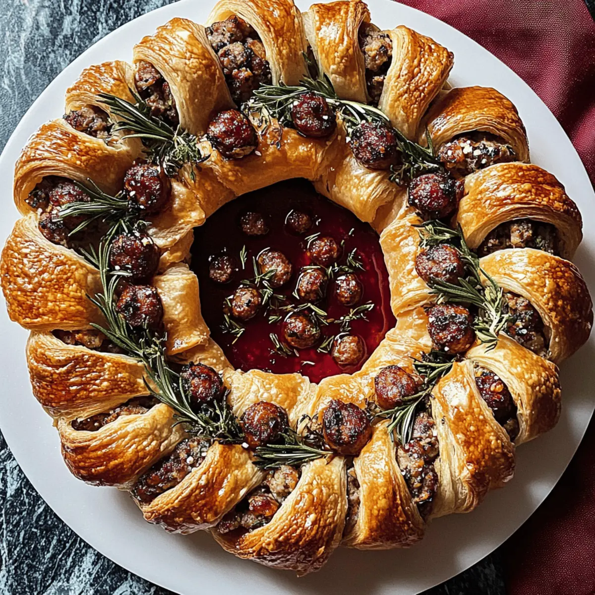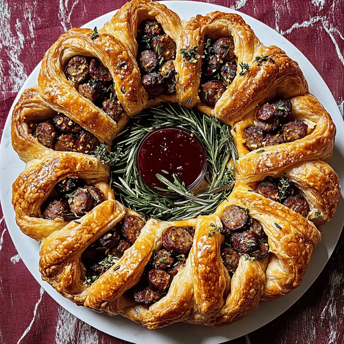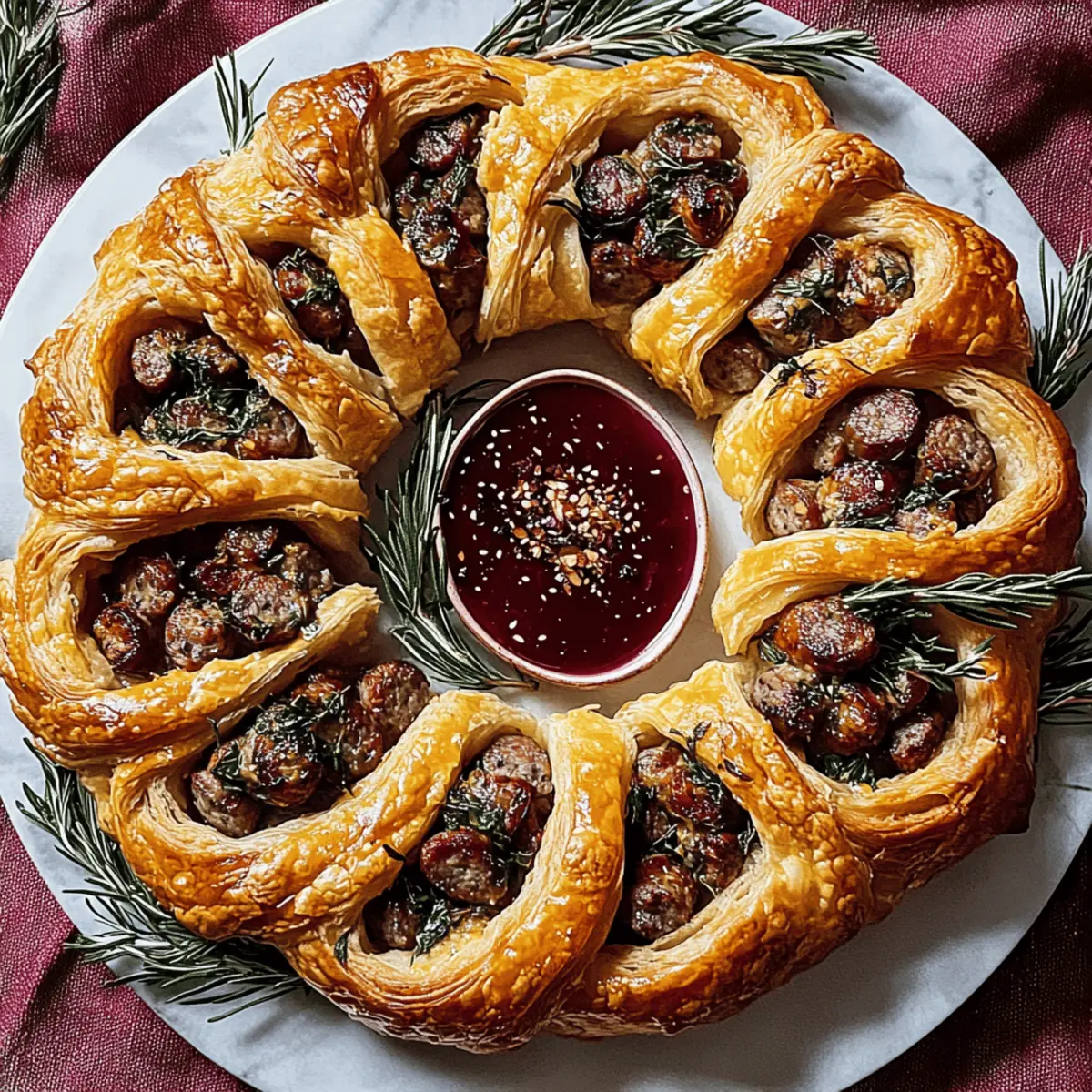 Jump to Recipe Print RecipeAs the holiday season approaches, there’s a unique joy in crafting something beautiful from scratch. Enter the Festive Sausage Wreath, a stunning centerpiece that turns the classic sausage roll into a delightful wreath shape. This easy-to-make recipe offers two fantastic perks: it’s a crowd-pleaser that will have your guests raving, and it combines flaky puff pastry with a zesty, herby sausage filling, ensuring every bite is a warm hug of flavor. Whether you’re hosting a festive gathering or simply looking to elevate your weeknight meal, this dish not only brings people together but also fills your home with enticing aromas. Curious about how to create this showstopper that will steal the spotlight at your next celebration? Why is the Sausage Roll Wreath a Must-try? Showstopper Appeal: This festive sausage wreath turns heads and fills hearts with joy as a brilliant centerpiece for any gathering. Flaky Perfection: The luscious puff pastry envelops a savory filling, creating an irresistible combination with each bite. Easy to Make: With straightforward steps, even novice cooks can master this dish effortlessly, making it perfect for holiday entertaining. Versatile Variations: Swap in different herbs or types of sausage to personalize the flavor, or serve it with array of dips like cranberry chutney for an added twist! Baked Fresh: Prepare ahead and just pop it in the oven before serving, ensuring you enjoy quality time with your loved ones. Sausage Roll Wreath Ingredients For the Filling • Extra-virgin olive oil – Adds richness and prevents sticking during sautéing. • Large yellow onion, finely chopped – Provides sweetness and depth of flavor for the filling. • Kosher salt – Essential for enhancing the overall flavor of the sausage mixture. • Freshly ground black pepper – Adds subtle heat and complexity to the filling. • Chopped fresh rosemary – Infuses the sausage with woodsy, aromatic notes. • Chopped fresh sage – Offers a savory element that complements the sausage beautifully. • Sweet Italian pork sausage, casings removed – The main protein component, delivering robust flavor that creates the heart of the sausage roll wreath. • Chopped fresh parsley – Brightens the filling and adds a pop of freshness. • Worcestershire sauce – Enhances umami richness and depth of flavor. For the Pastry • All-purpose flour – For dusting the work surface and ensuring the pastry rolls out smoothly. • Puff pastry (14-oz. pkg., thawed) – Forms the flaky outer layer of the wreath, providing a buttery texture. For Assembly • Dijon mustard, divided – Introduces tanginess and complements the sausage perfectly. • Large egg, lightly beaten – Used for egg wash to achieve a golden-brown finish on the pastry. • Toasted sesame seeds – Adds a nutty flavor and crunchy texture to the top. • Poppy seeds – Offers visual appeal and a subtle earthiness to the finished dish. For Serving • Cranberry chutney or cranberry sauce – Provides a sweet and tart contrast when dipping to enhance the flavor experience of your sausage roll wreath. Step‑by‑Step Instructions for Sausage Roll Wreath Step 1: Sauté Aromatics In a skillet over medium heat, warm 2 tablespoons of extra-virgin olive oil. Add 1 finely chopped large yellow onion, along with 1 teaspoon of kosher salt and 1/2 teaspoon of freshly ground black pepper. Sauté for about 5–7 minutes until the onions become soft and translucent, filling your kitchen with a savory aroma. Step 2: Prepare Filling Stir in 1 tablespoon each of chopped fresh rosemary and sage, followed by 1 pound of sweet Italian pork sausage (casings removed). Cook over medium heat for 8–10 minutes, breaking the sausage apart as it browns and turns no longer pink. Finish by mixing in 1/4 cup of chopped fresh parsley and a splash of Worcestershire sauce for a rich flavor. Step 3: Roll Pastry On a clean, floured surface, roll out a thawed 14-ounce package of puff pastry into a rectangle about 1/4 inch thick. Ensure the pastry is well-floured to prevent sticking. Aim for an even thickness so that it bakes uniformly and develops those lovely flaky layers, making the sausage roll wreath incredibly irresistible. Step 4: Spread Mustard Using a brush, spread half of 2 tablespoons of Dijon mustard evenly over the surface of the rolled puff pastry. This step adds a delicious tang and helps to complement the savory flavors of the sausage filling in your festive sausage wreath, creating a truly delightful combination. Step 5: Form Wreath Carefully spread the cooked sausage filling evenly over the mustard-brushed pastry. Starting from one long edge, roll the pastry tightly to form a log. Bring the ends together to form a wreath shape, tucking the ends in securely. Place it on a parchment-lined baking sheet, ensuring it holds its shape. Step 6: Chill and Brush Place the assembled sausage roll wreath in the refrigerator for about 15-20 minutes to firm up. Once chilled, take it out and brush the top generously with the lightly beaten egg. This egg wash gives the pastry a beautiful golden-brown finish once baked. Sprinkle toasted sesame seeds and poppy seeds over the top for added texture and visual appeal. Step 7: Bake Preheat your oven to 400°F (200°C). Bake the sausage roll wreath in the oven for about 40 minutes or until it’s puffed, golden brown, and flaky. Keep an eye on it about halfway through baking; you may need to rotate the sheet for even browning, ensuring every inch of your festive dish is perfectly cooked. Step 8: Cool and Serve After baking, allow the sausage roll wreath to cool for 5-10 minutes. This resting time will help set its shape, making it easier to slice. Serve warm with cranberry chutney or cranberry sauce for a delightful sweet contrast, elevating your dining experience with this crowd-pleasing centerpiece. Sausage Roll Wreath Variations & Substitutions Get ready to personalize your sausage r