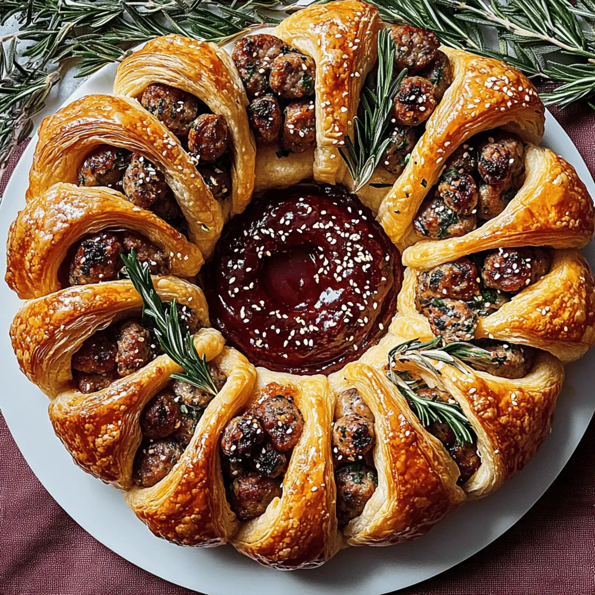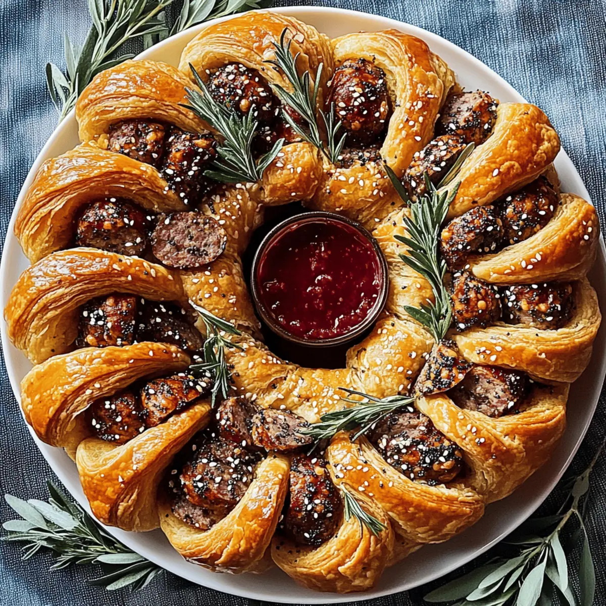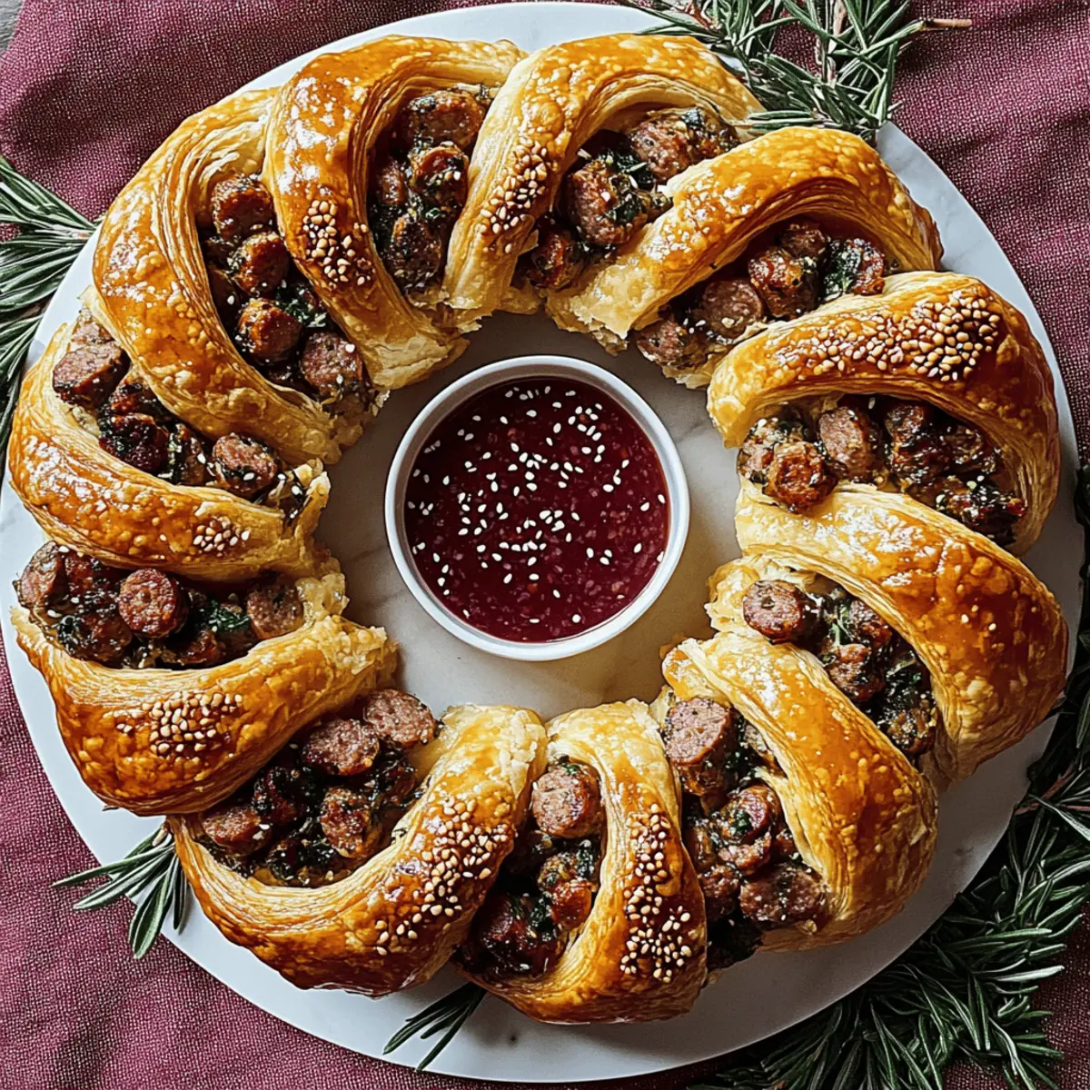 Jump to Recipe Print RecipeAs I stood in the kitchen, the aroma of sizzling sausage mingled with the warmth of freshly baked pastry, I realized I was onto something special. My Holiday Sausage Wreath combines flaky puff pastry with flavorful sweet Italian sausage and herbs, making it the ideal festive centerpiece for any gathering. This delightful dish not only impresses with its stunning presentation but also offers a comforting and satisfying flavor that everyone will adore. Plus, the convenience of using store-bought puff pastry ensures you can whip it up without spending hours in the kitchen. Just imagine pulling this golden wreath from the oven, its savory goodness surrounded by the cozy atmosphere of holiday cheer. Are you ready to elevate your festive feasts and create a showstopper that will have everyone asking for seconds? Why Choose a Sausage Roll Wreath? Showstopper Presentation: The Sausage Roll Wreath isn’t just a dish; it’s a stunning centerpiece that captures attention and sparks conversation. Easy to Make: With store-bought puff pastry, you can skip the hassle of making dough from scratch, making this recipe a breeze. Flavorful Filling: The savory combination of Italian sausage and fresh herbs brings depth to each bite, delighting your taste buds. Versatile Serving Options: Pair it with cranberry chutney or whole-grain mustard for a burst of flavor, perfect for any holiday table. Crowd-Pleasing Delight: It’s a dish designed for sharing, ensuring that friends and family will rave about this festive treat! Sausage Roll Wreath Ingredients • Let’s gather what you need to create this delicious centerpiece! For the Filling Extra-virgin olive oil – Adds richness and prevents sticking; can also use vegetable oil. Large yellow onion, finely chopped – Provides sweetness and depth; sauté until translucent for the best flavor. Kosher salt – Enhances the flavors of the ingredients; sea salt can be a substitute. Freshly ground black pepper – Adds a subtle spiciness; adjust to taste. Chopped fresh rosemary – Infuses a fragrant herbal note; thyme can be used for a different flavor. Chopped fresh sage – Contributes an earthy, aromatic element; use dried sage if fresh is unavailable, in lesser amounts. Sweet Italian pork sausage, casings removed – Primary protein adding flavor and texture; substitute with chicken sausage for a lighter version. Chopped fresh parsley – Adds freshness and a pop of color; can omit if desired. Worcestershire sauce – Brings umami flavor; a splash of soy sauce can substitute. For the Pastry All-purpose flour – For dusting the work surface; can substitute with gluten-free flour if necessary. (14-oz.) pkg. puff pastry, thawed – Creates a flaky outer layer; ensure it’s fully thawed for easy handling. Dijon mustard, divided – Adds tanginess and depth to the sausage mixture; spicy brown mustard can be a substitute. Large egg, lightly beaten – For egg wash, enhances browning; use milk or cream as an alternative for egg wash. For the Finish Toasted sesame seeds – Provides crunchy texture and nutty flavor; omit if allergies are a concern. Poppy seeds – Adds slight nuttiness and visual appeal; can be omitted or replaced with more sesame seeds. Cranberry chutney or cranberry sauce (for serving) – Sweetness and acidity to balance the rich flavors; use homemade or store-bought options. With these ingredients at hand, you’ll be well on your way to crafting a show-stopping Sausage Roll Wreath that’s sure to impress! Step‑by‑Step Instructions for Sausage Roll Wreath Step 1: Sauté Filling In a large skillet, heat 2 tablespoons of extra-virgin olive oil over medium heat. Add 1 finely chopped large yellow onion, sprinkling in a pinch of kosher salt and freshly ground black pepper. Sauté for about 5 minutes, or until the onions turn translucent. Stir in the chopped fresh rosemary, sage, 1 pound of sweet Italian sausage, and a splash of Worcestershire sauce, cooking until the sausage is browned, roughly 8-10 minutes. Step 2: Prepare Pastry On a clean, lightly floured surface, roll out a package of thawed puff pastry into a rectangle about ¼ inch thick. Spread an even layer of Dijon mustard, about 2 tablespoons, over the pastry, ensuring it covers the surface well. This will add a delightful flavor to the Sausage Roll Wreath that marries beautifully with the savory filling. Step 3: Fill Pastry Once the sausage mix is ready, evenly distribute it along the length of the prepared puff pastry, leaving about an inch border. Make sure the mixture’s spread is lump-free and continues consistently, so each bite of your sausage roll wreath is full of flavor. Gently press the filling down to secure it, preparing for the next step. Step 4: Form Wreath Shape Carefully roll the pastry, starting from one long edge, to create a tight log. Once rolled, join the ends together to form a wreath shape, ensuring that the filling is sealed inside. Transfer your wreath to a baking sheet and chill in the refrigerator for about 30 minutes to help it retain its shape while baking. Step 5: Preheat Oven While your wreath chills, preheat the oven to 400°F (200°C). This will ensure that when your Sausage Roll Wreath is ready to go into the oven, it’ll bake evenly, creating that perfect golden-brown color and flaky texture everyone will love. Step 6: Brush and Sprinkle Once chilled, remove the wreath from the refrigerator. Brush the entire surface with the lightly beaten egg to give it that lovely golden sheen when baked. If desired, sprinkle toasted sesame seeds and poppy seeds generously over the top, which will add both flavor and visual appeal to your festive centerpiece. Step 7: Bake Place the prepared Sausage Roll Wreath on a baking sheet lined with parchment paper and bake in the preheated oven for 40 minutes. Keep an eye on it, and look for a beautifully bronzed color; the pastry should puff up and be golden brown when fully cooked, signaling it