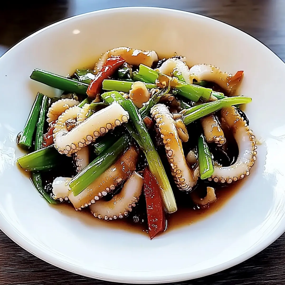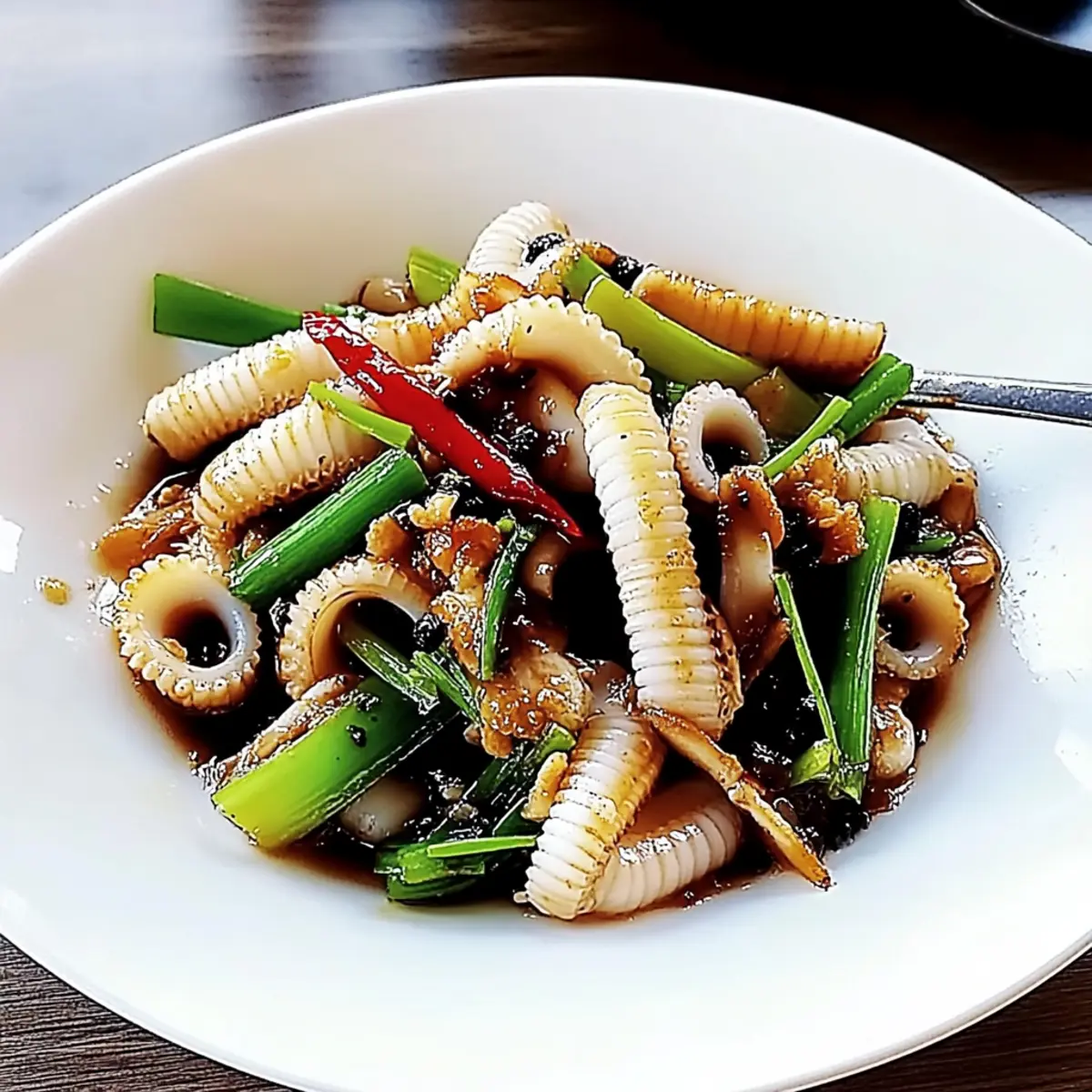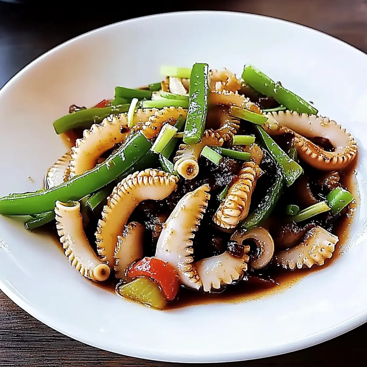 Jump to Recipe Print RecipeThe air was thick with the intoxicating aromas of garlic and ginger sizzling in a hot wok—a moment that instantly transports me to a bustling street market in China. Today, I’m excited to share my recipe for Quick Stir-fried Squid with Black Bean, a dish that captures the essence of homemade Chinese cuisine in just under 30 minutes. Imagine treating yourself to a delightful seafood experience without the hassle of lengthy prep! This dish not only impresses with its rich umami flavors but also brings together tender squid and vibrant vegetables in a glossy, savory sauce—perfect for busy weeknights or last-minute dinner parties. Ready to dive into the process? Let’s cook up some magic in your kitchen! Why is this squid dish a must-try? Quick and Easy: Prepare this flavorful dish in under 30 minutes, making it perfect for busy weeknights or unexpected guests. Flavor Explosion: Savor the aromatic blend of garlic, ginger, and rich black beans that creates a mouthwatering experience. Textural Delight: Enjoy the contrasting textures of tender squid, crisp veggies, and a glossy sauce, making each bite a joy. Versatile Options: Feel free to substitute squid with shrimp or chicken, and add your favorite veggies for a personal touch—flexibility at its best! Impress Guests: Serve this dish over jasmine rice, alongside chilled cucumber salad or garlic noodles for a complete and satisfying meal. Try it today and see why it’s a culinary favorite! Savor This Quick Stir-fried Squid with Black Bean Ingredients For the Main Dish • Squid (300 grams) – Main protein providing a tender and delicate texture; ensure it’s fresh and cleaned. • Peanut Oil (2 tablespoons) – Essential for high-heat stir-frying; can be substituted with vegetable oil. • Green Capsicum (1 cup, sliced) – Adds crunch and color; freshness is key for the best flavor. • Red Chilli (1 piece, sliced) – Provides heat and visual appeal; adjust based on your spice preference. • Dark Soy Sauce (2 tablespoons) – Delivers depth and rich color to the dish; regular soy sauce works too. • Chicken Stock (100 ml) – Adds moisture and flavor; for vegetarian options, substitute with vegetable stock. • Potato Flour (1 tablespoon) – Thickens the sauce; cornstarch can be an effective substitute. • Black Beans (150 grams, rinsed) – Contributes umami; rinsing helps reduce saltiness for better balance. • Garlic (2 cloves, minced) – A key aromatic that builds the dish’s incredible flavor. • Ginger (1 teaspoon, freshly grated) – Provides warmth and spice that enhances the overall taste. For Garnishing • Green Onions (2 stalks, chopped) – Adds freshness; essential for those final garnishing touches. • Sesame Oil (1 teaspoon, optional) – Enhances the flavor profile; you can omit it if allergic. • Dried Tangerine Skin (1 piece, optional) – Offers a fragrant garnish that elevates the presentation. For Sweetness • White Sugar (1 teaspoon) – Balances the dish’s flavors; you can use brown sugar as an alternative. • Shaoxing Wine (2 tablespoons, optional) – A traditional cooking wine adding depth; omit for a non-alcoholic option. Dive into the process of crafting this dazzling Quick Stir-fried Squid with Black Bean and transform your meal into a delightful culinary experience! Step‑by‑Step Instructions for Savor This Quick Stir-fried Squid with Black Bean Step 1: Heat the Oil In a wok or large frying pan, heat 2 tablespoons of peanut oil over high heat until it shimmers, indicating it’s ready for frying. This step sets the stage for a vibrant Quick Stir-fried Squid with Black Bean, allowing you to cook the ingredients quickly and evenly. Step 2: Aromatic Blend Add 2 minced garlic cloves and 1 teaspoon of freshly grated ginger to the sizzling oil. Stir-fry for about 30 seconds until fragrant, being careful not to burn the garlic. This aromatic foundation enhances the dish’s flavor, creating a mouthwatering aroma that fills your kitchen. Step 3: Cook the Squid Incorporate 300 grams of cleaned squid into the wok. Stir-fry for 2–3 minutes until the squid turns opaque and tender, stirring frequently. Keep an eye on the texture: overcooking can make the squid rubbery, so aim for that perfect, luscious tenderness. Step 4: Add Vegetables Next, toss in 1 cup of sliced green capsicum and 1 sliced red chili. Continue to stir-fry for another 2 minutes, allowing the vegetables to become vibrant and slightly softened but still crisp. The colors and textures will brighten your Quick Stir-fried Squid with Black Bean. Step 5: Season the Stir-fry Sprinkle 1 teaspoon of white sugar over the mixture, then pour in 2 tablespoons of dark soy sauce and 100 ml of chicken stock. Stir everything together well, allowing the flavors to meld for about 1 minute. The sauce will start to coat the ingredients with a glossy sheen, enhancing the overall taste. Step 6: Thicken the Sauce Create a slurry by mixing 1 tablespoon of potato flour with a small amount of water until smooth. Add this mixture to the wok, stirring continuously for about 1 minute to thicken the sauce. You’ll notice it become luscious, helping the squid and vegetables shine in this delightful Quick Stir-fried Squid with Black Bean. Step 7: Add Final Touches Toss in 2 chopped green onions and 150 grams of rinsed black beans, quickly mixing them into the dish. Stir everything for another minute, just until the green onions wilt slightly. This step completes the flavor profile while adding freshness and vibrancy to your dish. Step 8: Optional Garnish and Serve If desired, drizzle 1 teaspoon of sesame oil over the top and stir gently to incorporate. Optionally garnish with dried tangerine skin for an aromatic finish. Serve your Quick Stir-fried Squid with Black Bean immediately over fluffy steamed rice, enjoying a dish that’s as beautiful as it is delicious! Savor This Quick Stir-fried Squid Variations Feel free to tweak and 
