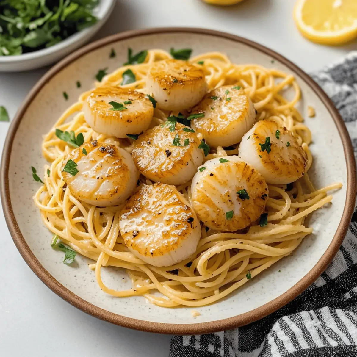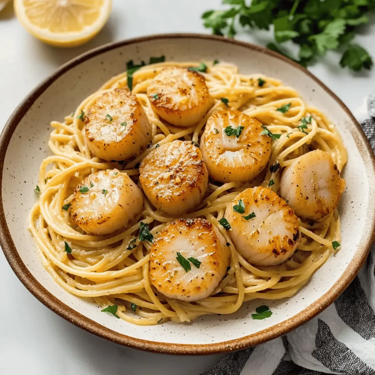 Jump to Recipe Print RecipeAs I stood in my kitchen, the aroma of garlic and butter began to weave through the air, instantly transporting me to my favorite seaside restaurant. This is where my love for cooking Quick Scallops with Pasta ignited, combining simplicity and elegance in one delightful dish. In just 25 minutes, you can transform ordinary ingredients into a dish that feels upscale yet remains family-friendly—a fantastic way to impress guests or treat yourself to a cozy dinner at home. The tender, perfectly seared scallops resting atop silky pasta doused in a rich, garlicky sauce make every bite a celebration of flavors. And the best part? It’s quick to whip up even on the busiest of weeknights! Are you ready to bring a taste of fine dining to your own table? Why Choose Scallops with Pasta? Quick and Easy: This recipe comes together in just 25 minutes, making it perfect for hectic evenings when you crave something special without the fuss. Gourmet Flavors: Enjoy restaurant-quality taste at home with a buttery garlic sauce that elevates the dish and pampers your palate. Versatile Ingredients: Use spaghetti, linguine, or fettuccine as your pasta base, and feel free to swap scallops for shrimp or chicken for your preferred protein. Crowd-Pleaser: Impress your family and friends with this elegant dish that looks stunning on the plate while being simple to prepare! Healthy Option: Each serving is well-balanced at approximately 376 calories, combining protein with carbohydrates for a nutritious meal. Elevate your meal with a side of fresh butter lettuce salad or some garlic bread for a complete dining experience. Don’t forget to explore other delightful pasta recipes like Buffalo Chicken Pasta or Spinach Shrimp Pasta for more inspiration! Scallops with Pasta Ingredients For the Pasta Pasta – Choose spaghetti, linguine, or fettuccine for the best texture, creating a delightful base for your dish. For the Scallops Large Scallops – Opt for large scallops for the best sear and rich flavor; frozen can work in a pinch! Olive Oil – This helps to sear the scallops perfectly without sticking and enhances their flavor. For the Sauce Butter – Adds a rich and luscious quality to the sauce, making the dish undeniably delicious. Shallot – Provides a sweet, aromatic base for the sauce; an onion will work as a substitute if needed. Garlic – A key aromatic that elevates the flavor of the sauce and pairs beautifully with scallops. Fresh Lemon Juice – Brightens up the dish; using fresh juice will enhance the overall flavor. Fresh Parsley – Garnish with this herb for a fresh touch that complements the richness of the dish. Kosher Salt and Black Pepper – Essential for seasoning, enhancing the flavors of all components in this scallops with pasta recipe. Enjoy crafting this Quick Scallops with Pasta, where every ingredient plays an important role in creating a delightful dining experience! Step‑by‑Step Instructions for Scallops with Pasta Step 1: Cook Pasta Bring a large pot of salted water to a rolling boil over high heat. Add your choice of spaghetti, linguine, or fettuccine, and cook according to package instructions until al dente, about 8-10 minutes. Before draining, reserve a cup of the starchy pasta water—this will be crucial for achieving the perfect sauce consistency. Drain the pasta and set aside. Step 2: Prep Scallops While the pasta cooks, take 1 pound of large scallops and gently pat them dry with paper towels to remove excess moisture. This step is key for achieving a beautiful sear. Season both sides with kosher salt and freshly ground black pepper. Setting them aside will allow the seasoning to permeate while you prepare your skillet. Step 3: Sear Scallops In a large skillet, heat 2 tablespoons of olive oil over medium-high heat until shimmering, about 2 minutes. Carefully add the seasoned scallops in a single layer, making sure not to crowd the pan. Sear for 2-3 minutes on each side until they are golden brown and have an internal temperature of at least 115°F. Gently remove them from the skillet and keep warm. Step 4: Make Sauce In the same skillet, reduce the heat to medium and add 2 tablespoons of butter. Once melted, toss in a diced shallot and sauté for 2-3 minutes until it becomes translucent. Next, add 2 minced garlic cloves, stirring constantly for about 30 seconds until fragrant. Pour in a splash of the reserved pasta water to deglaze the pan, scraping up any brown bits. Step 5: Combine With the sauce bubbling gently, add the drained pasta into the skillet, tossing it with the buttery shallot and garlic mixture. If the pasta seems dry, gradually add more reserved pasta water, ensuring everything is well coated. Gently nestle the seared scallops into the pasta, allowing their flavors to meld together for 1-2 minutes over low heat. Step 6: Serve Finish your sumptuous scallops with pasta by drizzling fresh lemon juice over the dish for a bright flavor boost. Garnish with chopped fresh parsley to add a pop of color and a hint of freshness. Serve immediately on warm plates so your guests can enjoy the vibrant presentation and delightful aromas right away. Variations & Substitutions for Scallops with Pasta Feel free to unleash your creativity and adapt this recipe to suit your taste buds and dietary needs! Gluten-Free: Replace regular pasta with gluten-free options like rice or quinoa pasta for a delicious twist. Shrimp Delight: Swap scallops for large shrimp for a flavorful, seafood alternative that still sears beautifully. Chicken Swap: Use pan-seared chicken breast instead of scallops for a heartier dish that’s equally satisfying. Creamy Twist: Add a splash of heavy cream to the sauce for a rich, velvety texture that elevates the dish. Herb Boost: Experiment with fresh herbs such as basil or thyme instead of parsley to add different aromatic notes. Embrace the concept of personalizing this dish to fit your family’s preferences! It’s not just abou