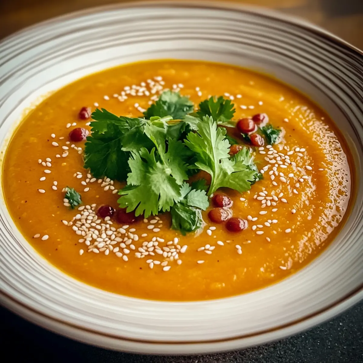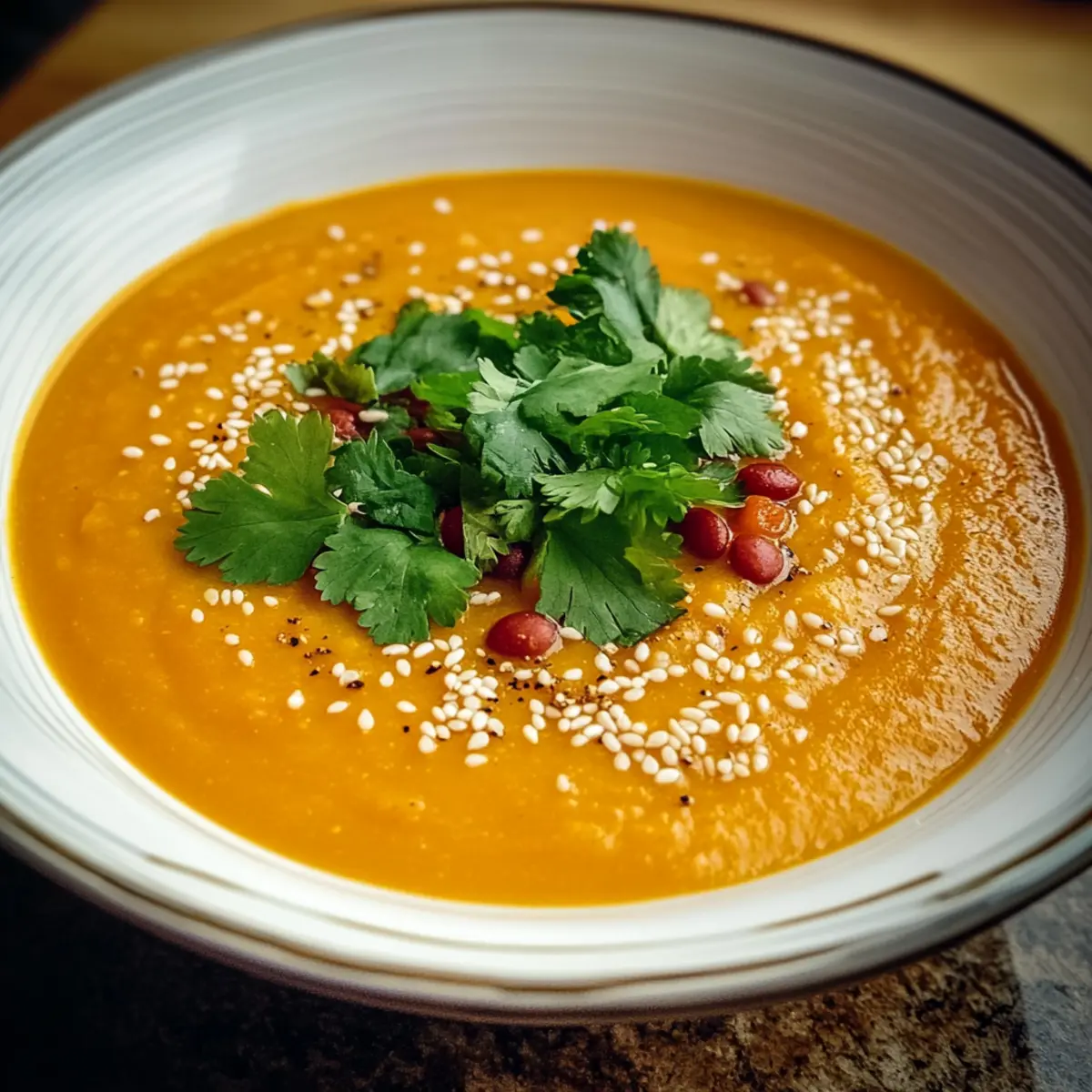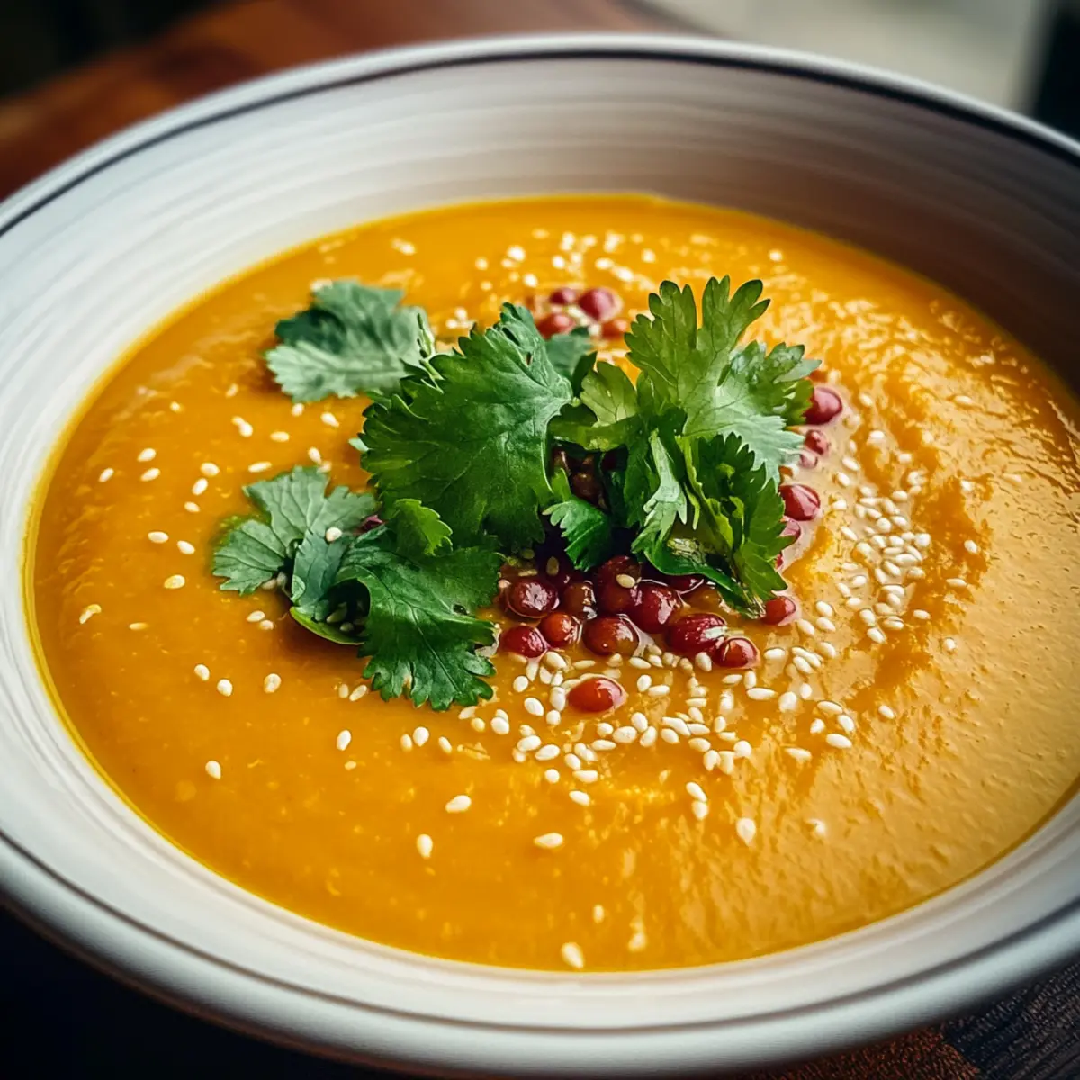 Jump to Recipe Print RecipeAs the evening chill settles in, there’s nothing quite like the aroma of a simmering pot of soup to warm the heart and soul. Today, I’m excited to share my Spicy Sesame Carrot Soup with Red Lentils, a vibrant dish that perfectly balances the sweetness of carrots with the nutty richness of sesame oil. This easy-to-make recipe not only packs a flavorful punch thanks to a hint of heat from crushed red pepper flakes, but it also comes together in just 50 minutes! It’s perfect for a cozy dinner or a light lunch and is both vegan and gluten-free, making it a delightful option for everyone at the table. Who knew that healthy recipes could offer such comfort? Are you ready to take your taste buds on a warm, spicy adventure? Why Is This Sesame Carrot Soup Amazing? Comfort in a Bowl: This Spicy Sesame Carrot Soup is like a warm hug on a cold day. Easy to Prepare: With only 50 minutes of hands-on time, it’s perfect for busy weeknights. Healthful Ingredients: Packed with nutrients from carrots and red lentils, it’s a nutritious powerhouse. Flavor Explosion: The nutty sesame oil and warming spices offer a taste experience that will leave you craving more. Crowd-Pleasing: It’s vegan and gluten-free, making it a delightful dish for everyone, whether served alongside a light salad or some crusty bread inspired by my Crock Pot Soup. Enjoy a comforting bowl without compromise! Sesame Carrot Soup Ingredients • Dive into the flavors of Sesame Carrot Soup with this simple ingredient rundown! For the Soup Sesame Oil – adds a nutty base note and depth to the soup. Onion – provides natural sweetness and aromatic complexity when sautéed until translucent. Garlic – delivers pungent, savory depth that enhances overall flavor without overwhelming it. Fresh Ginger – offers a bright, zesty kick and balances the sweetness of the carrots. Ground Cumin – contributes earthy, slightly smoky notes that harmonize beautifully with other spices. Ground Coriander – infuses a delicate citrusy fragrance that elevates the spice blend. Crushed Red Pepper Flakes – introduces gentle heat; adjust to taste to make it your perfect spicy soup. Red Lentils – provide creaminess and protein; they cook quickly and break down into a silky texture. Carrots – the primary ingredient, offering natural sweetness and vibrant color, softening during simmering. Vegetable Broth – serves as the liquid foundation, ensuring all ingredients are well-seasoned. Soy Sauce or Tamari – adds umami flavor and saltiness; tamari is a gluten-free option for dietary needs. Rice Vinegar – introduces gentle acidity to brighten the soup. Salt and Pepper – essential seasonings to enhance flavor; adjust to taste. For the Garnish Toasted Sesame Seeds – provide a crunchy contrast and amplify the sesame notes. Fresh Cilantro – offers herbal freshness contrasting with the soup’s warmth. Lime Wedges – adds brightness and zesty flavor with a fresh squeeze before serving. Step‑by‑Step Instructions for Spicy Sesame Carrot Soup with Red Lentils Step 1: Sauté the Aromatics In a large pot, heat 2 tablespoons of sesame oil over medium heat. Once shimmering, add one diced onion and sauté for about 5 minutes until it becomes soft and translucent. This foundational step releases the onion’s natural sweetness, creating a fragrant base for your Spicy Sesame Carrot Soup. Step 2: Add the Spices Stir in 4 minced garlic cloves, 1 tablespoon of grated ginger, 1 teaspoon of ground cumin, 1 teaspoon of ground coriander, and ½ teaspoon of crushed red pepper flakes. Cook for an additional 2 minutes while stirring frequently, allowing the spices to mingle and release their aromas. This step enhances the depth of flavor in your comforting soup. Step 3: Incorporate the Lentils and Carrots Next, add 1 cup of rinsed red lentils and 4 sliced carrots to the pot, mixing them well with the onion-spice blend. Stir everything together for about 1-2 minutes, ensuring the lentils and carrots are well-coated with the aromatic mixture. This will enhance the overall flavor of the spicy soup and start to soften the carrots. Step 4: Simmer with Broth Pour in 4 cups of vegetable broth and bring the mixture to a boil. Once boiling, reduce the heat, cover, and let it simmer for 25–30 minutes. Stir occasionally, making sure the red lentils and carrots become tender and break down, turning your Spicy Sesame Carrot Soup into a velvety mixture. Step 5: Blend for Creaminess After simmering, allow the soup to cool slightly before blending. Use an immersion blender to puree the soup until smooth, or carefully transfer it to a standard blender in batches. This step is key to achieving the creamy texture that makes the soup rich and satisfying. Step 6: Final Seasoning Return the soup to the pot if you used a standard blender. Stir in 2 tablespoons of soy sauce (or tamari for a gluten-free option) and 1 tablespoon of rice vinegar. Season with salt and pepper to taste. Reheat gently over low heat, letting the flavors meld together for a couple of minutes as you prepare to serve. Step 7: Serve and Garnish Ladle the hot Spicy Sesame Carrot Soup into bowls, then garnish each serving with a sprinkle of toasted sesame seeds, some fresh cilantro, and a lime wedge on the side. This final touch adds brightness and a beautiful presentation, inviting everyone to enjoy a heartwarming bowl of soup. Make Ahead Options These Spicy Sesame Carrot Soup with Red Lentils are perfect for busy home cooks looking to save time! You can prepare the entire soup base and refrigerate it for up to 3 days for maximum freshness. Simply follow the instructions until blending; then allow the soup to cool, cover it with an airtight lid, and refrigerate. To maintain quality, remember to store the soup in airtight containers to prevent browning and ensure it stays creamy. When you’re ready to enjoy it, gently reheat the soup on the stovetop, stirring in the soy sauce (or ta